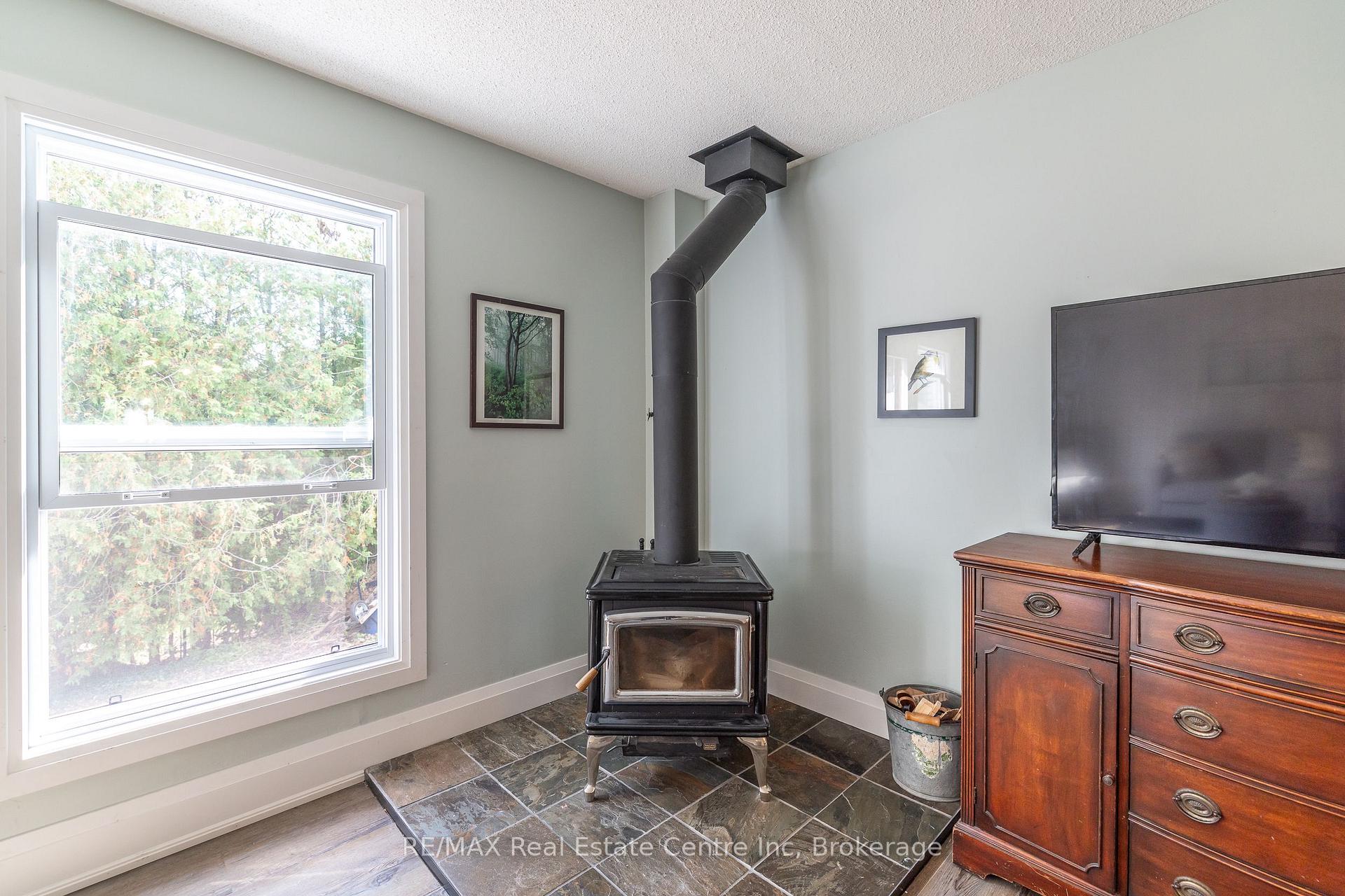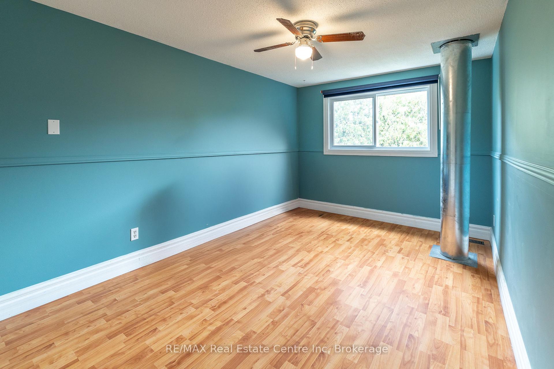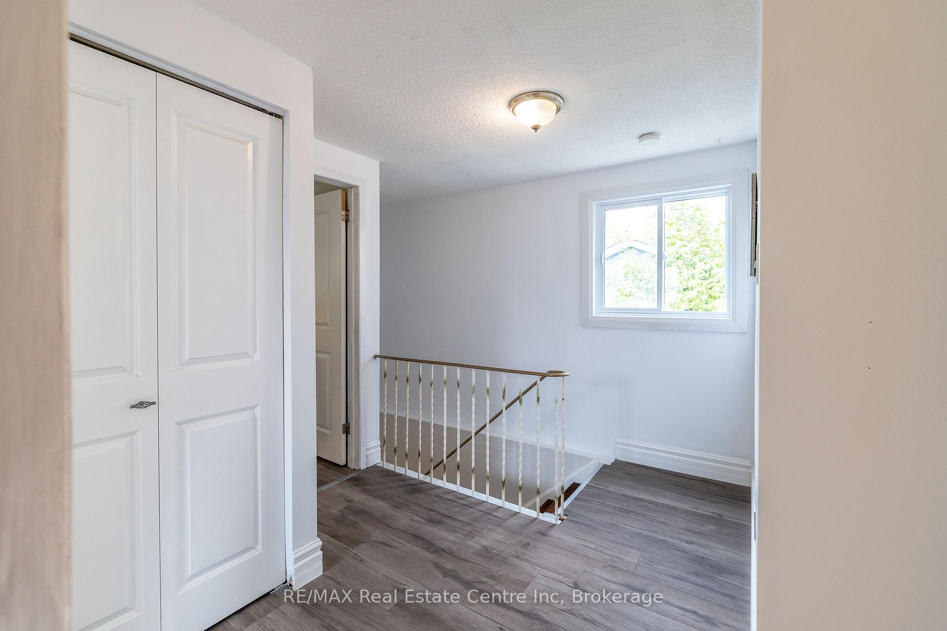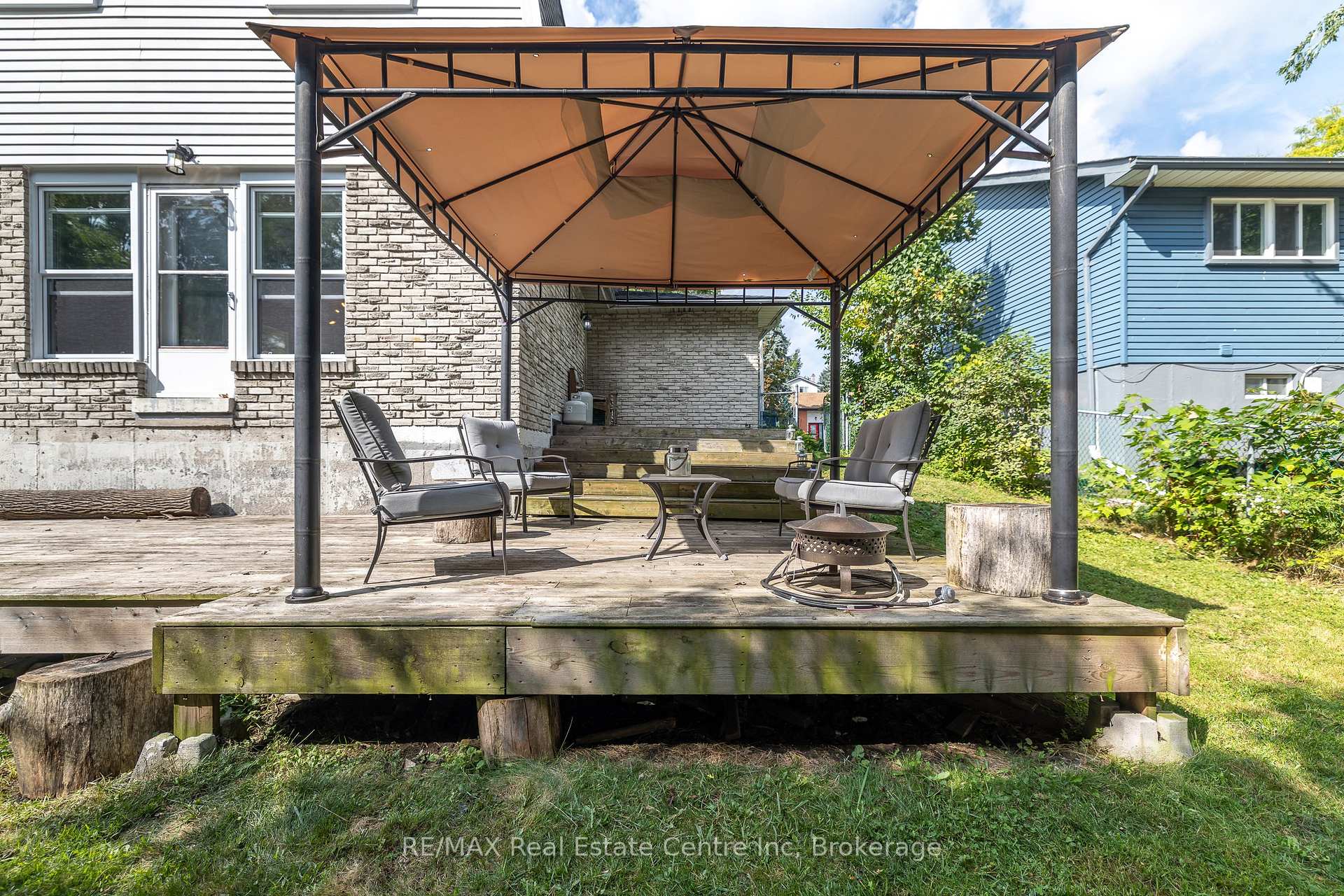 Welcome to 34 Woodridge Crescent! Tucked away in one of Guelphs well-established neighbourhoods, this charming 2-storey home offers 4bedrooms, 3 bathrooms and over 2,225 sq. ft. of living space. Just steps from shopping (Costco, Zehrs), banks, the West End Rec Centre, schools and parks. Quick access to HWY’s 6, 7 & 124 makes commuting much easier. As you step inside you’ll be welcomed by a spacious, fully renovated chefs kitchen, featuring ample custom cabinetry, expansive wood countertops, and a bright breakfast nook, all thoughtfully designed.Oversized windows throughout the home flood the space with natural light. The dining area flows seamlessly into a spacious living room highlighted by a cozy wood-burning fireplace, ideal for family time. A convenient side entrance provides direct access to the walk-up basement and the deck ideal for multi-generational living, teenagers or those in need of added privacy. As you go up the stairs, you’ll find 3 very spacious bedrooms and a full 4-piece bathroom. The primary bedroom is exceptionally large, featuring a deep closet for ample storage. The fully finished basement features a generous Rec room, an additional bedroom/den, a 3-piece bathroom, and a large utility room that includes the laundry area. You’ll enjoy relaxing and entertaining loved ones in the fully fenced backyard, which features a large main deck and a convenient side deck.As a bonus, the hot tub and two storage sheds are also included. List of upgrades: professionally renovated kitchen 2023 with luxury vinyl plank flooring (new insulation, studs, drywall and wiring), new windows by Nordik Windows 2023, shingles Nov 2019 by Platinum Roofing (50 yr transferable warranty), upstairs bath/shower & basement shower by Bath Fitter Feb 2025, new electrical panel Jan 2023, wood stove by Fergus Fireplace 2009 (triple wall pipe, fire rated wood stove tile pad) and SS appliances. One car garage and the driveway that can fit 2 cars complete this cute family home.