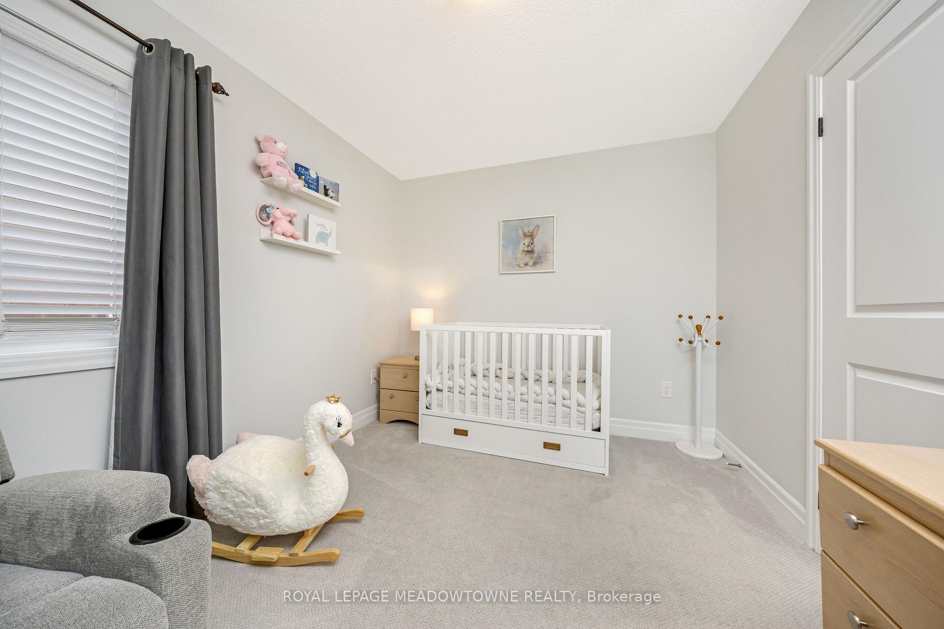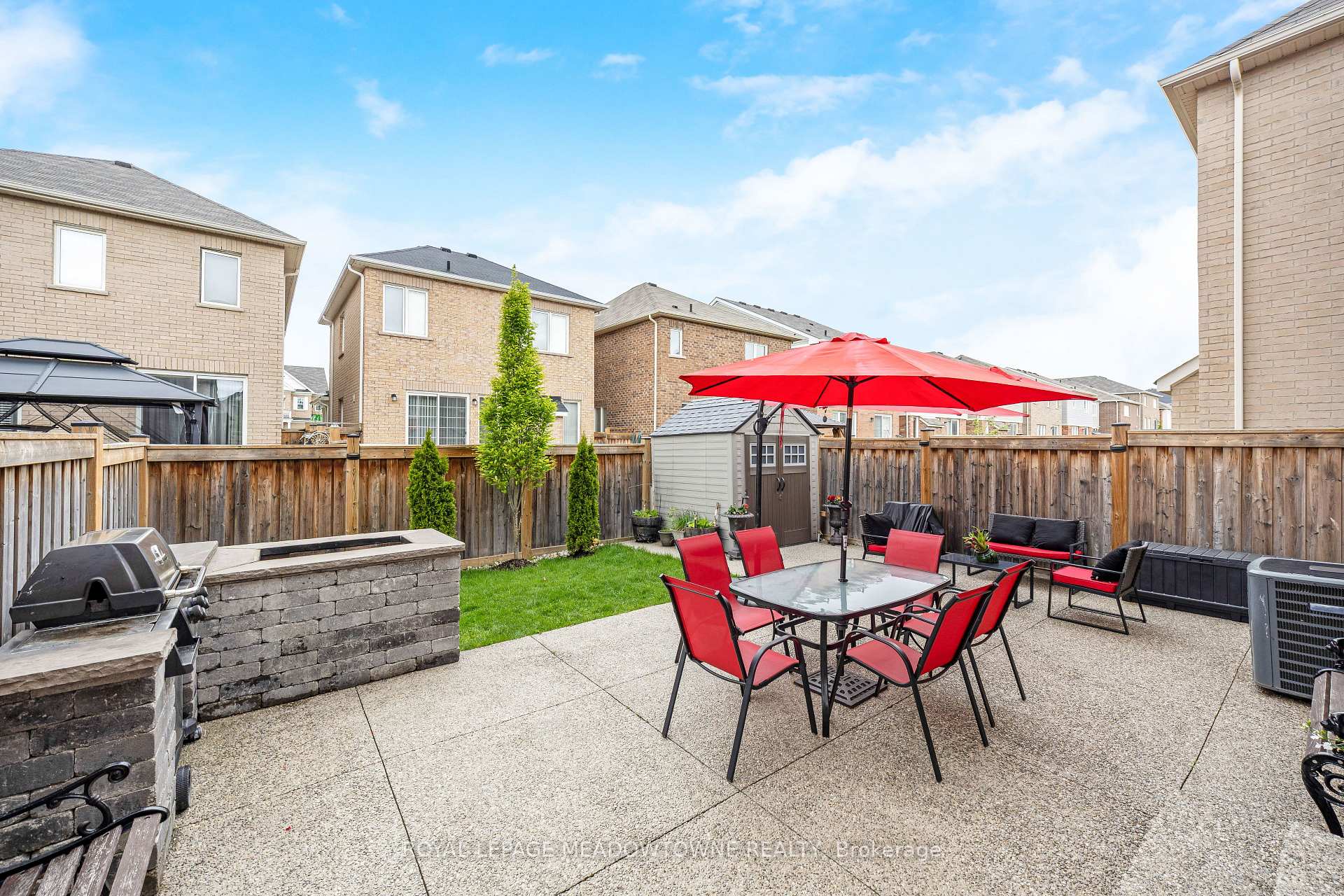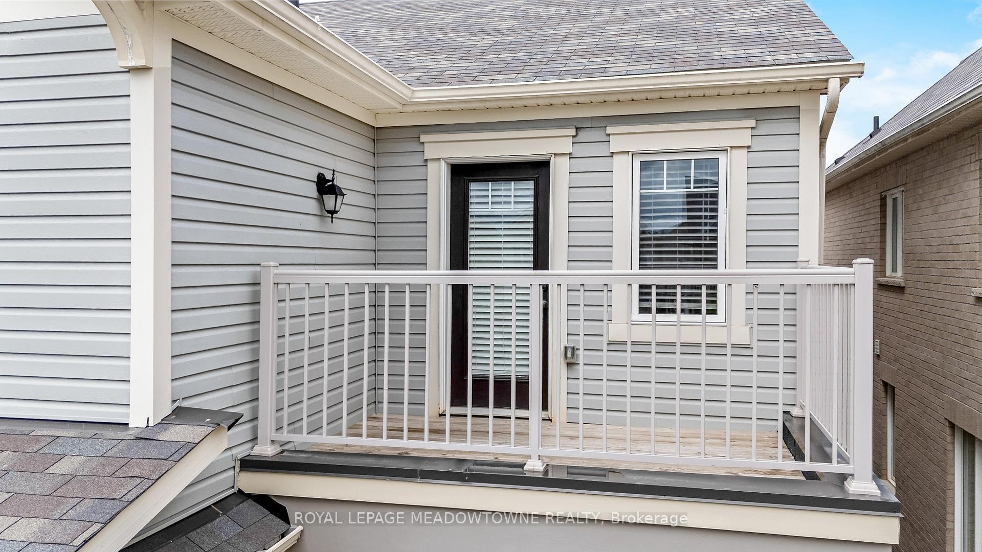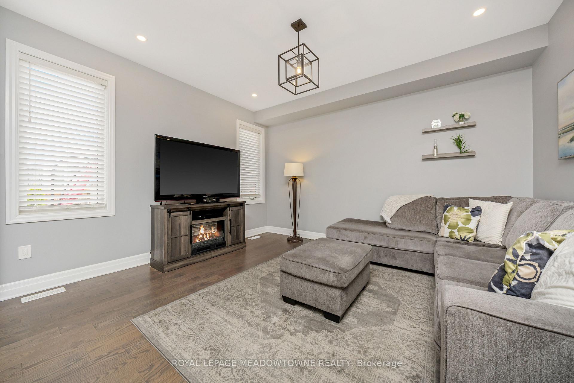 This lovely home is a Mattamy-built Nobleton model offering nearly 1,800 sq ft above grade plus approximately 700 sq ft of finished basement space, set on a quiet, low-traffic crescent in Milton where kids can ride bikes and walk to local schools. Aggregate concrete walkway and extended side patio lead to a backyard designed for gathering, featuring an integrated BBQ, fire pit cooking area, and low-maintenance vinyl shed. Main floor with 9 ft ceilings and spacious front entry. Open layout connects kitchen, dining, and family room. Kitchen includes centre island with built-in microwave, upgraded countertops and backsplash, pot lights, and gas stove. Breakfast bar overlooks main living space. Hardwood stairs with iron pickets from main to second floor. Upstairs laundry for added convenience. Primary bedroom with walk-in closet and ensuite featuring glass shower. Secondary bedroom with private balcony for added privacy. Finished basement features fireplace and built-in bar area, ideal for movie nights, home office, or entertaining. A well-designed home combining layout, functionality, and outdoor living in a family-friendly setting.