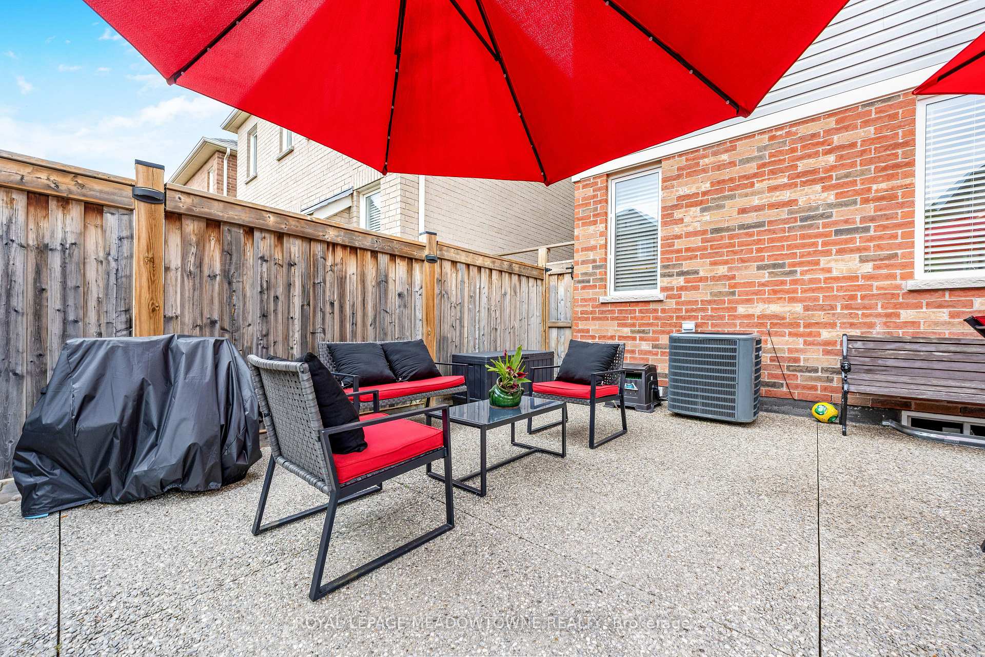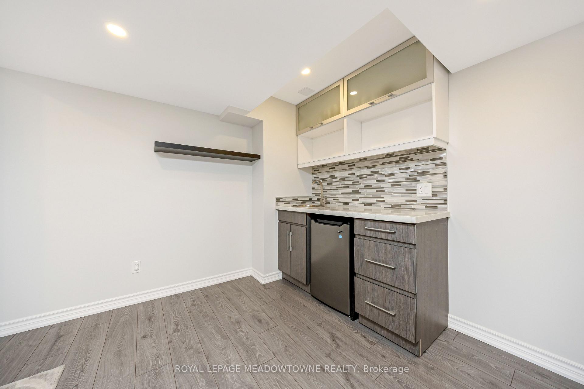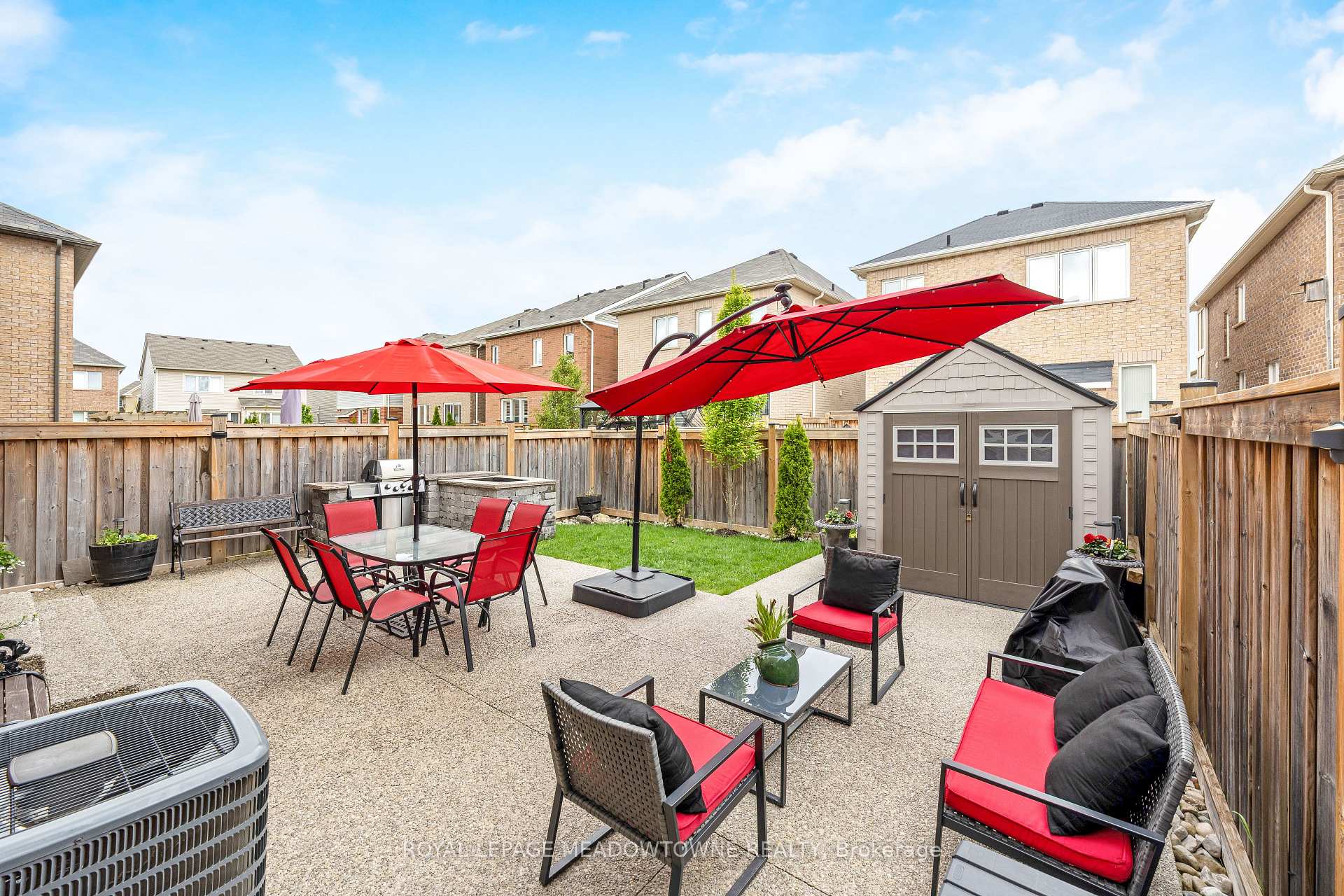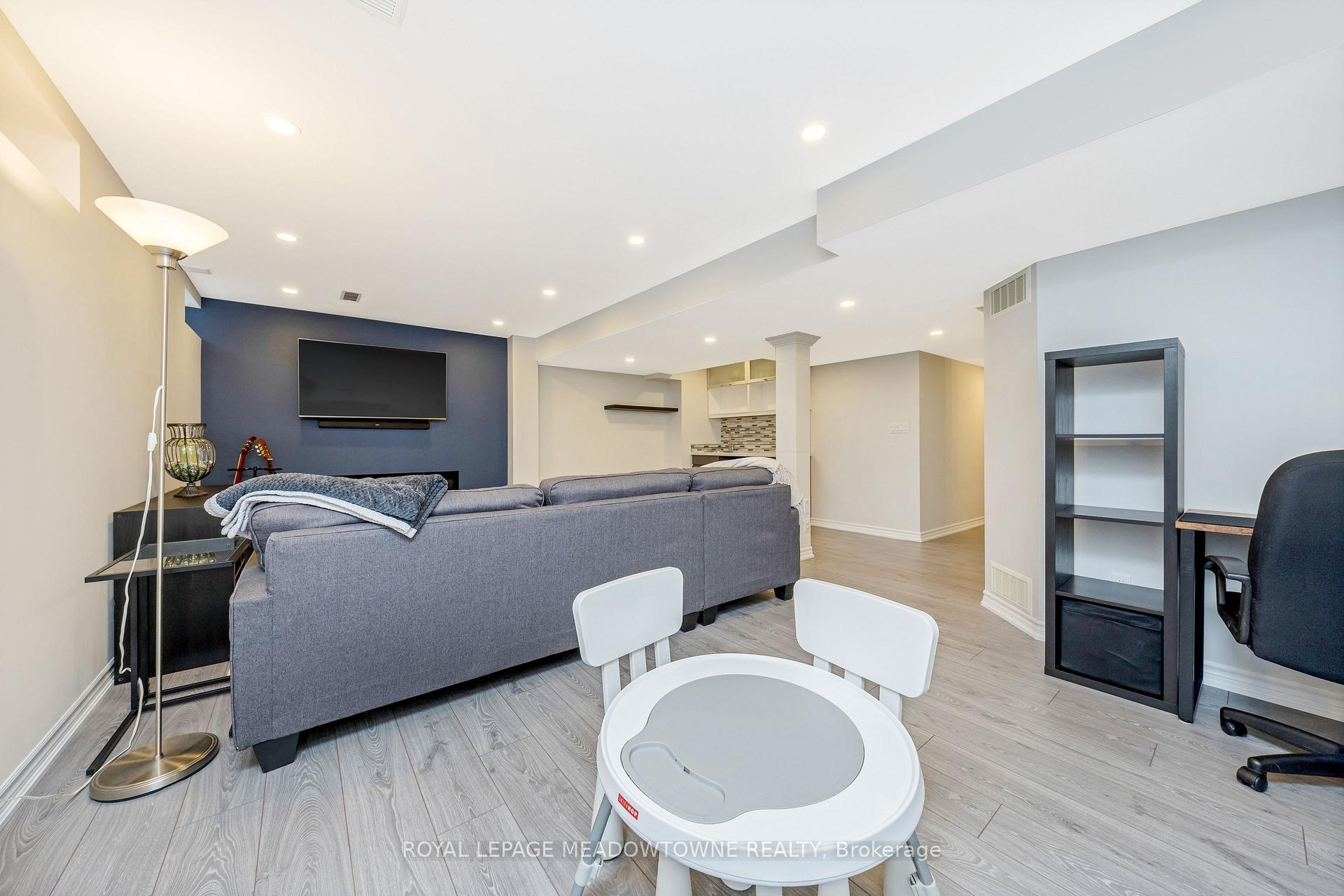 This lovely home is a Mattamy-built Nobleton model offering nearly 1,800 sq ft above grade plus approximately 700 sq ft of finished basement space, set on a quiet, low-traffic crescent in Milton where kids can ride bikes and walk to local schools. Aggregate concrete walkway and extended side patio lead to a backyard designed for gathering, featuring an integrated BBQ, fire pit cooking area, and low-maintenance vinyl shed. Main floor with 9 ft ceilings and spacious front entry. Open layout connects kitchen, dining, and family room. Kitchen includes centre island with built-in microwave, upgraded countertops and backsplash, pot lights, and gas stove. Breakfast bar overlooks main living space. Hardwood stairs with iron pickets from main to second floor. Upstairs laundry for added convenience. Primary bedroom with walk-in closet and ensuite featuring glass shower. Secondary bedroom with private balcony for added privacy. Finished basement features fireplace and built-in bar area, ideal for movie nights, home office, or entertaining. A well-designed home combining layout, functionality, and outdoor living in a family-friendly setting.