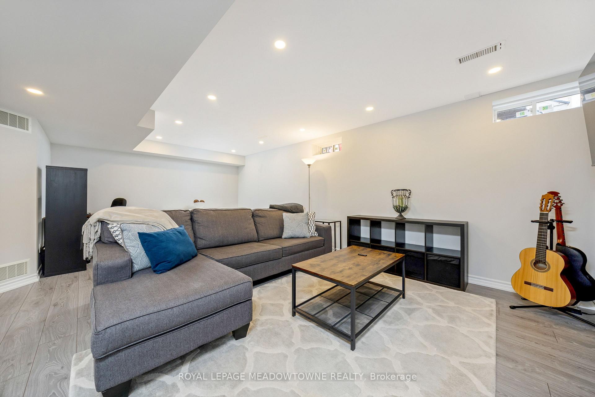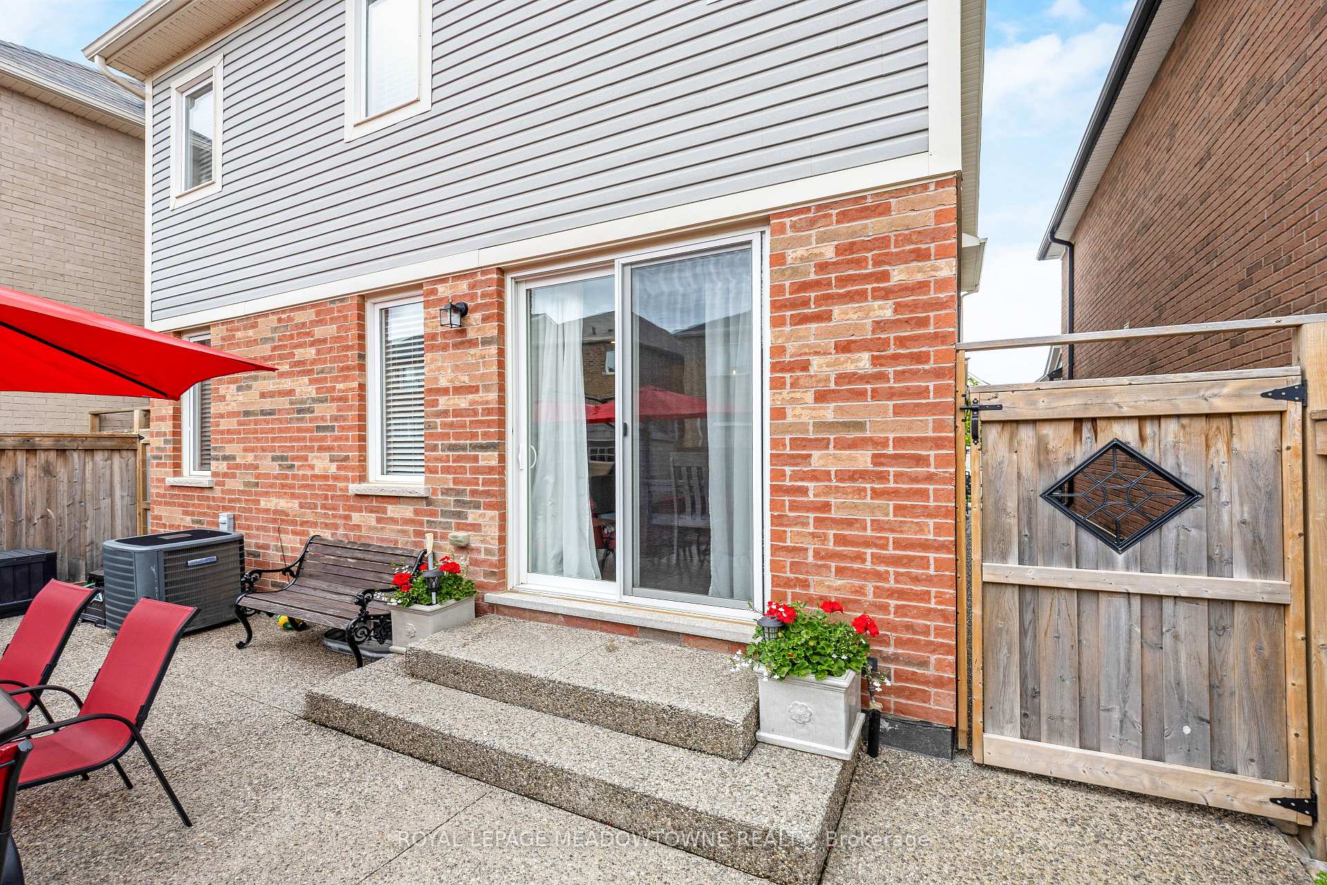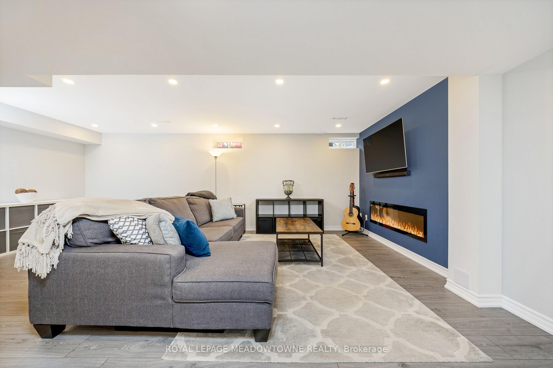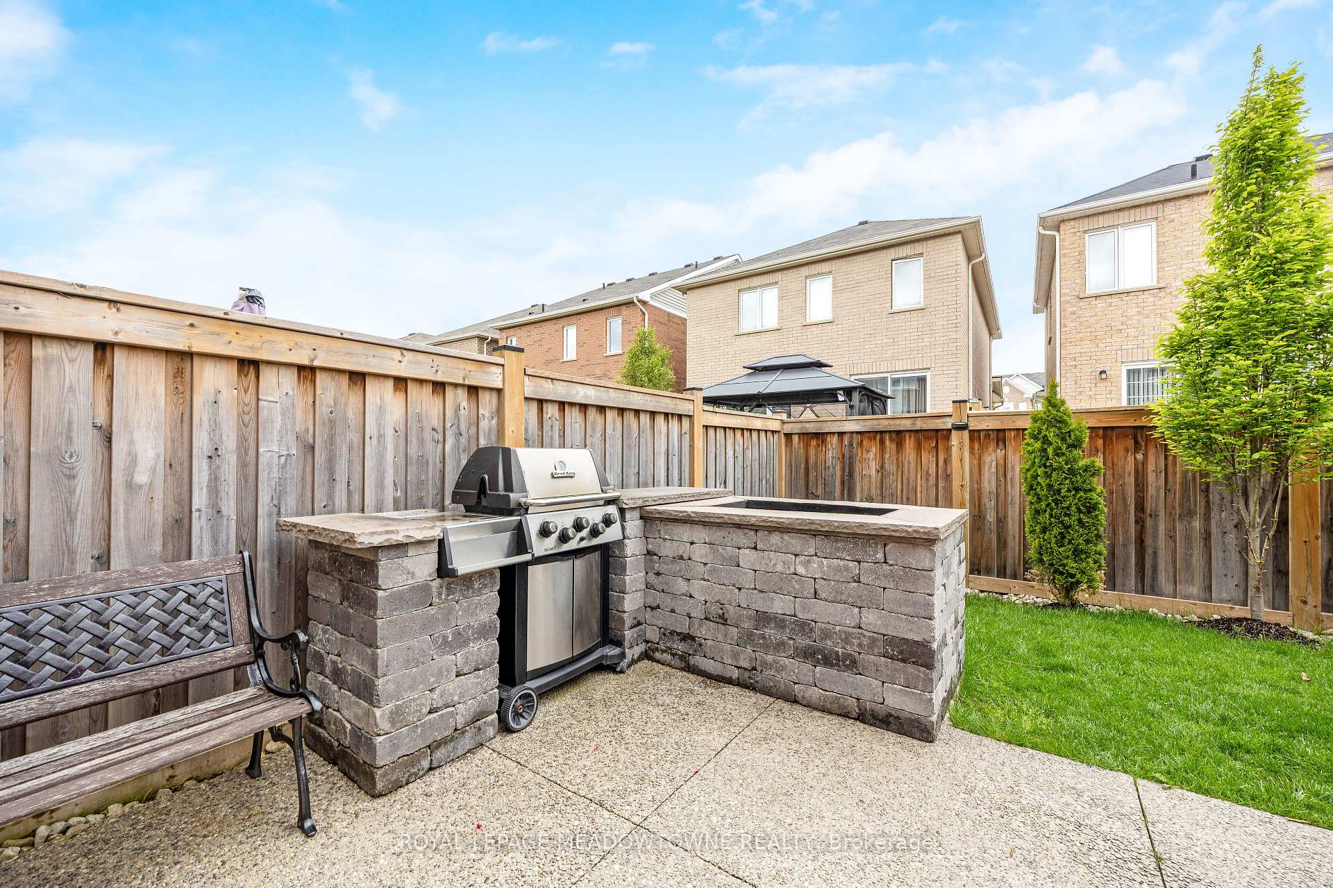 This lovely home is a Mattamy-built Nobleton model offering nearly 1,800 sq ft above grade plus approximately 700 sq ft of finished basement space, set on a quiet, low-traffic crescent in Milton where kids can ride bikes and walk to local schools. Aggregate concrete walkway and extended side patio lead to a backyard designed for gathering, featuring an integrated BBQ, fire pit cooking area, and low-maintenance vinyl shed. Main floor with 9 ft ceilings and spacious front entry. Open layout connects kitchen, dining, and family room. Kitchen includes centre island with built-in microwave, upgraded countertops and backsplash, pot lights, and gas stove. Breakfast bar overlooks main living space. Hardwood stairs with iron pickets from main to second floor. Upstairs laundry for added convenience. Primary bedroom with walk-in closet and ensuite featuring glass shower. Secondary bedroom with private balcony for added privacy. Finished basement features fireplace and built-in bar area, ideal for movie nights, home office, or entertaining. A well-designed home combining layout, functionality, and outdoor living in a family-friendly setting.