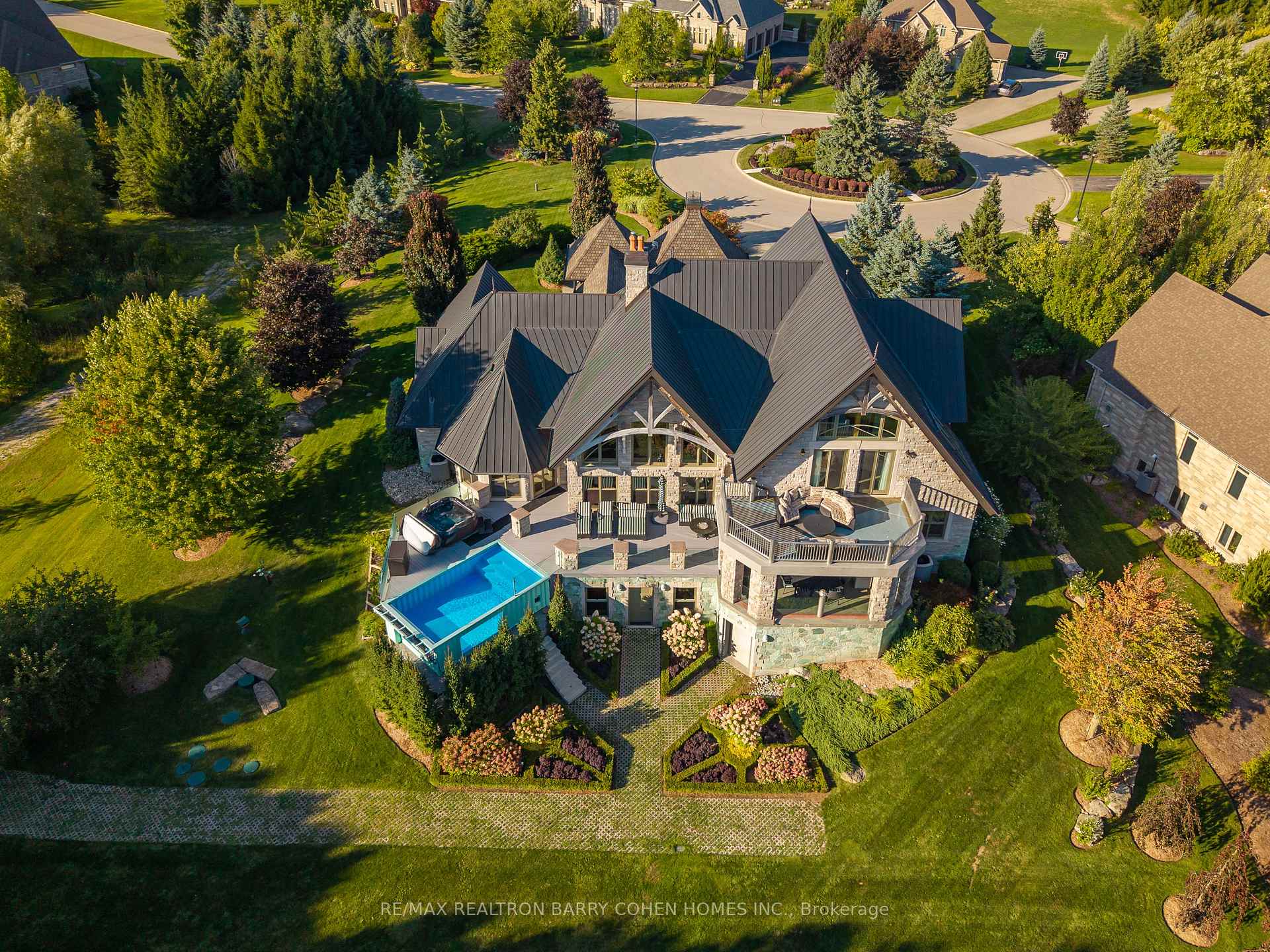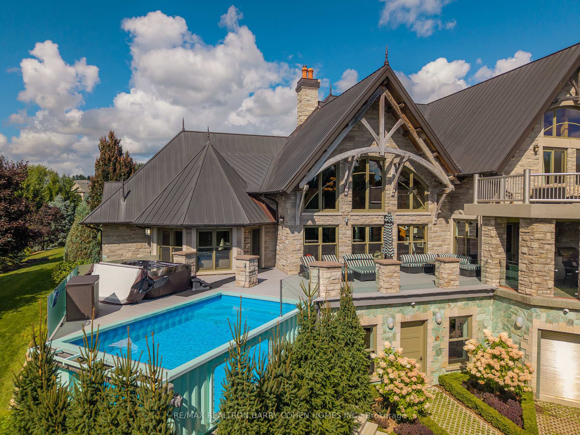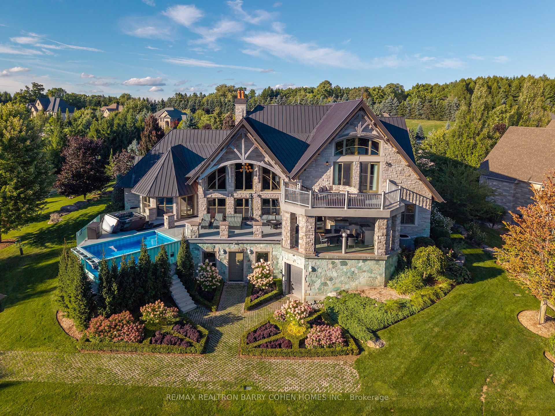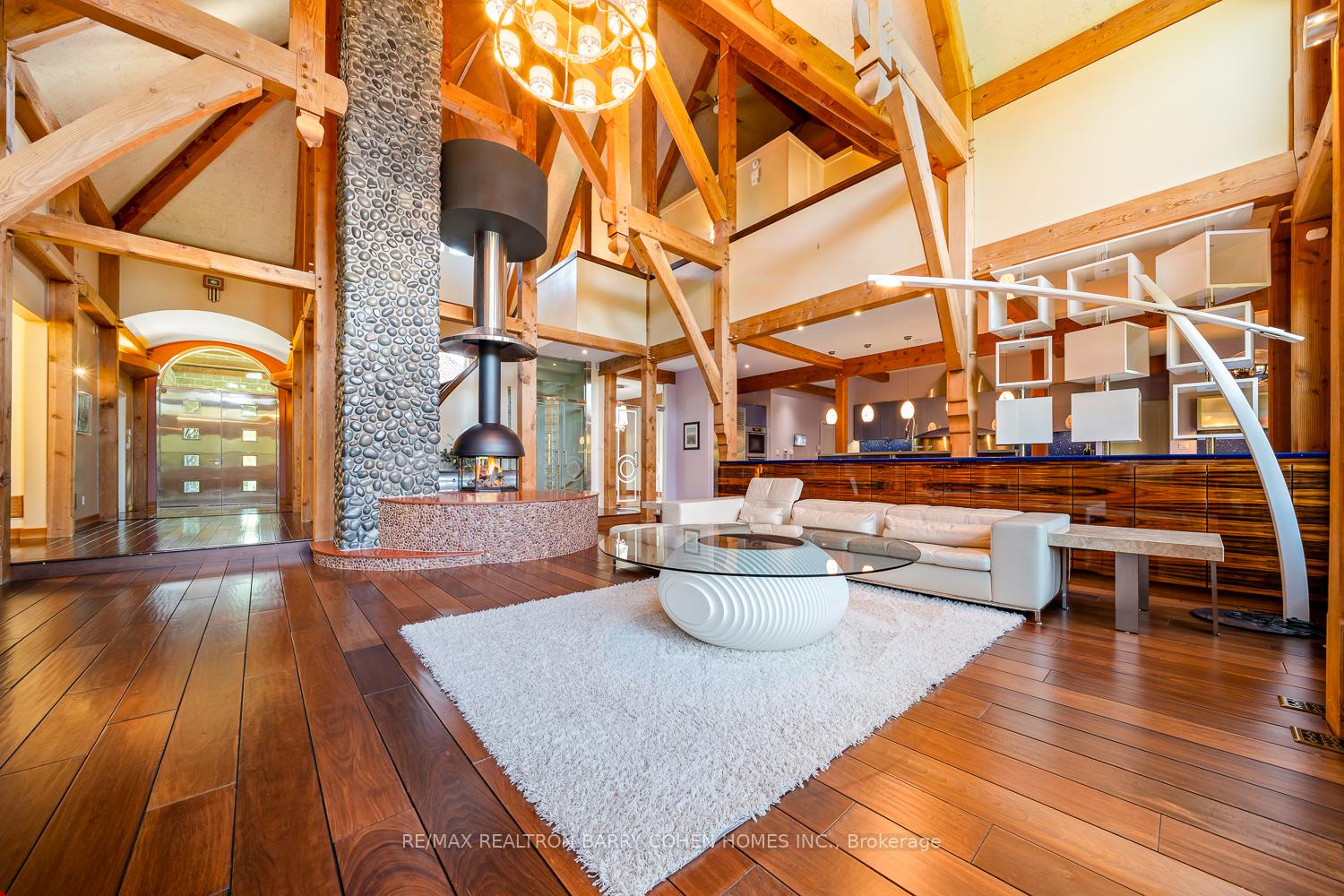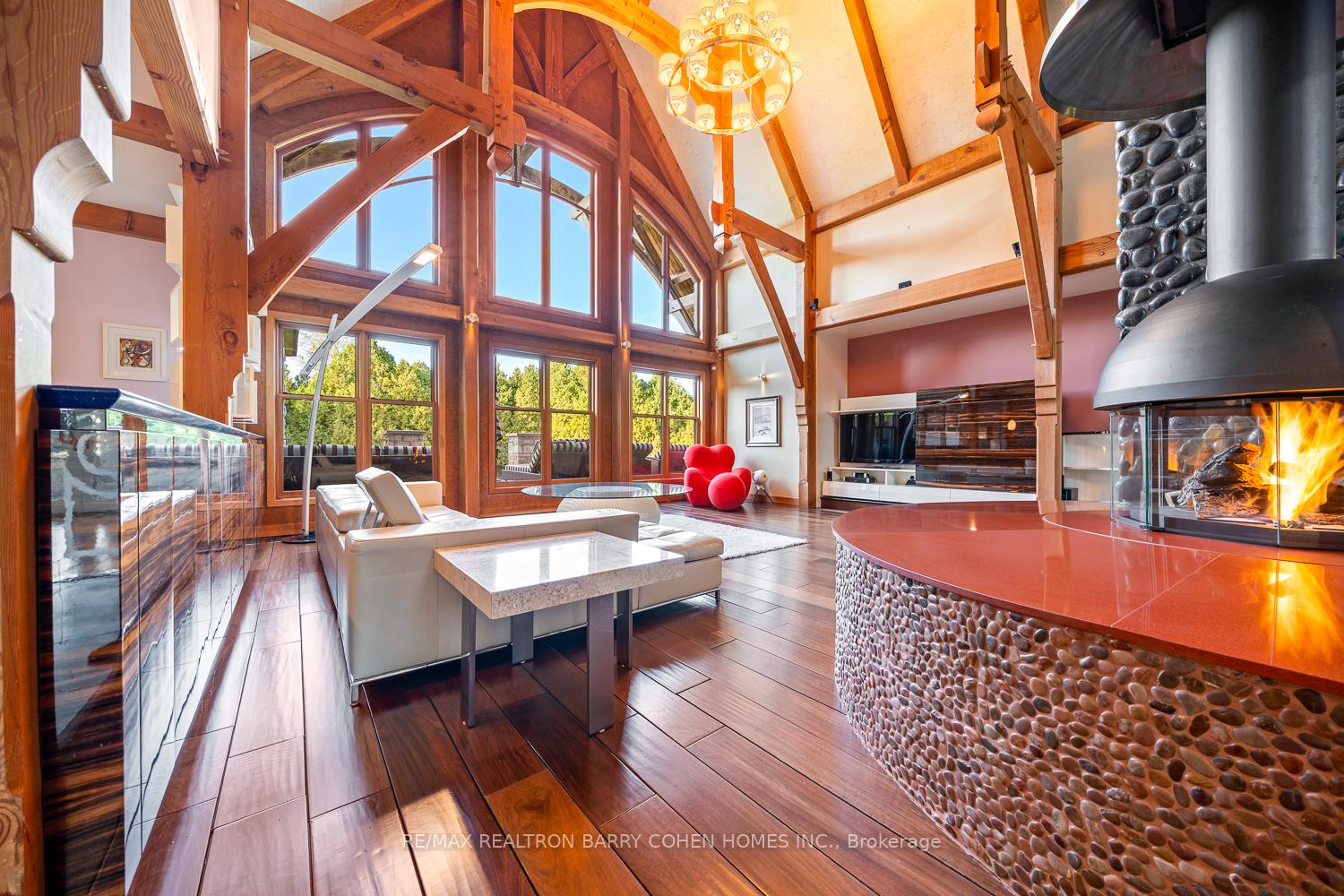 This One-Of-A-Kind Residence Was Custom Built By The Owners To Showcase Their Unique Vision, Blending The Chic Allure Of High-End Chalet Design With The Timeless Strength Of Canadian Timber Frame Craftsmanship. A Striking Copper Roof Crowns The Home, While A Dramatic Great Room With Soaring 35-Foot West-Facing Windows And A Circular Gas Fireplace Sets The Tone For Inspired Living. Overlooking This Impressive Space Is A Designer Snaidero Kitchen With Seating For 10, Walkout To The Wraparound Deck, And An Infinity Pool Bordered By Glass Walls. The Main Floor Is Anchored By A Private Office Or Dining Room, And A Bauhaus-Inspired Powder Room With Tile Detailing. The Primary Suite Serves As A True Sanctuary, Featuring Cathedral-Like Beamed Ceilings, Bespoke Poliform His-And-Hers Walk-In Closets, A Luxurious Spa-Like 5-Piece Ensuite. Upstairs, Two Expansive Bedroom Suites With 25-Foot Ceilings Each Enjoy Private Walk-In Closets And Share A Large 6-Piece Ensuite With Loft Areas. The Walk-Out Lower Level Offers A Family Room, Acoustic Music Studio, Private Hair Salon, And Powder Room, Along With Additional Bedrooms For Family Or Guests. Designed With Both Scale And Intimacy In Mind, This Home Balances Contemporary Elegance With Natural Warmth An Irreplaceable Retreat Surrounded By Unmatched Privacy.