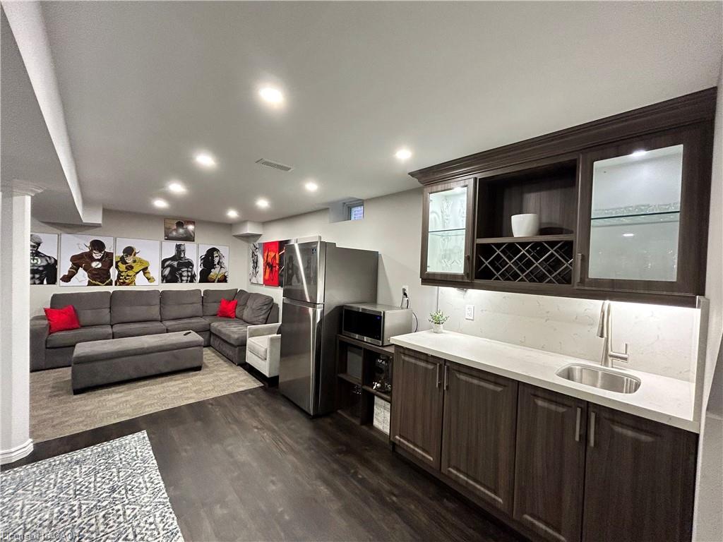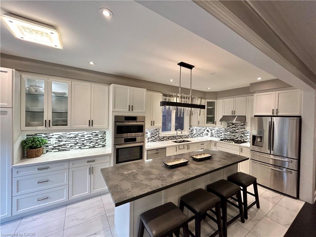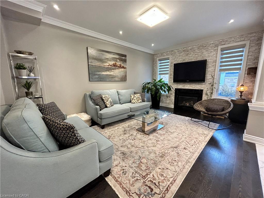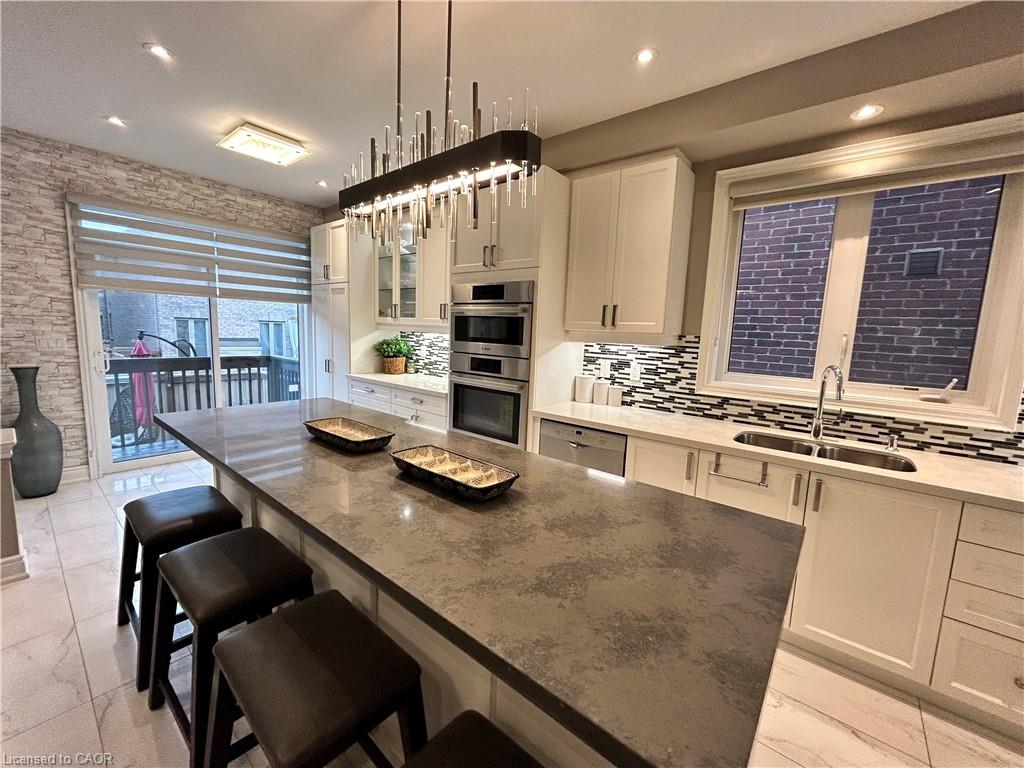 Nestled between the James Snow Parkway and Trudeau Drive, this tastefully upgraded link-detached home is ideally located close to schools, parks, shopping, groceries, and major highways—perfect for a growing family. Offering 4 bedrooms and 3.5 bathrooms, the home features a finished open-concept basement with a spacious great room, wet bar, office/den, pot lights, and a 3-piece bath. The extended chef’s kitchen showcases stainless steel appliances, Caesarstone countertops, a large eat-in island, custom soft-close cabinetry, tiled backsplash, and a walkout to a deck overlooking a paver-stone backyard with an 8′ x 10′ garden shed. The main floor includes a family room with gas fireplace and a separate living and dining area, enhanced by modern lighting, upgraded handrails with wrought iron pickets, crown mouldings, high baseboards, California shutters, and zebra blinds. Upper-level laundry offers upgraded appliances and linen storage. Hardwood floors throughout, with matching laminate in the basement. Exterior pot lights and fence lighting on timers. Parking for three cars and EV plug-in in the attached garage.