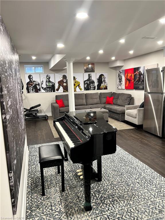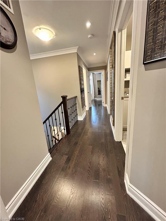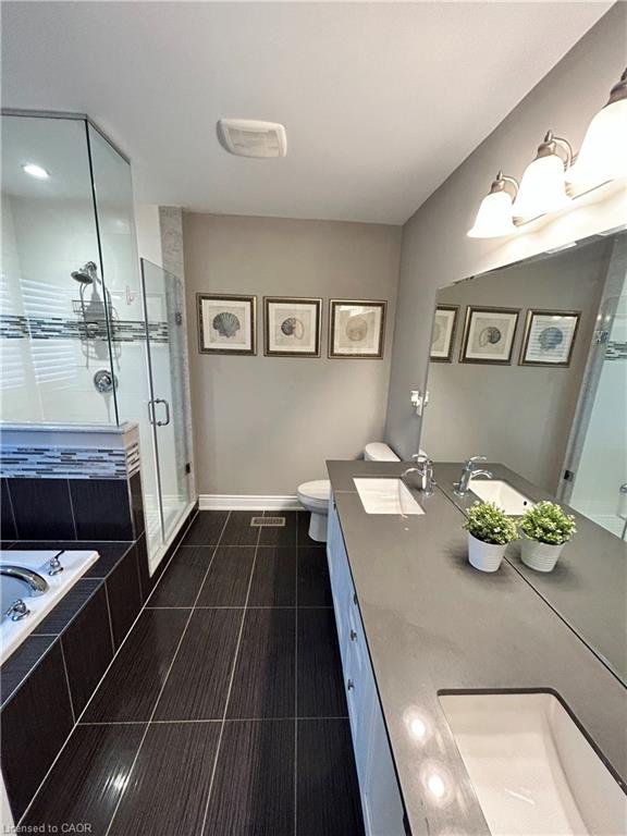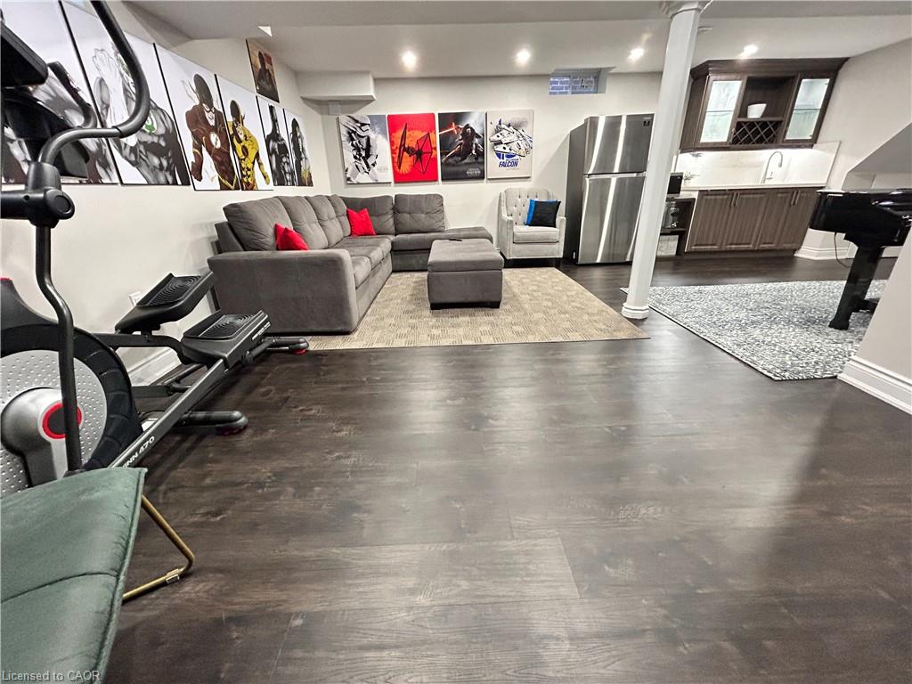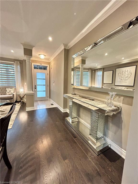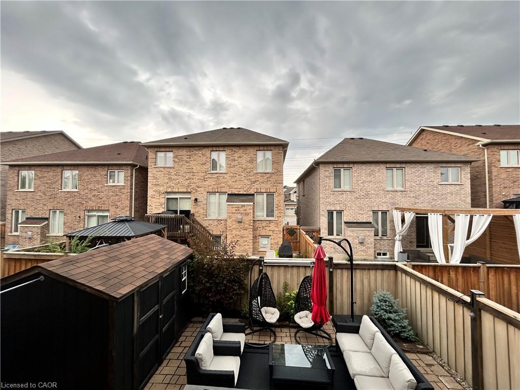 Nestled between the James Snow Parkway and Trudeau Drive, this tastefully upgraded link-detached home is ideally located close to schools, parks, shopping, groceries, and major highways—perfect for a growing family. Offering 4 bedrooms and 3.5 bathrooms, the home features a finished open-concept basement with a spacious great room, wet bar, office/den, pot lights, and a 3-piece bath. The extended chef’s kitchen showcases stainless steel appliances, Caesarstone countertops, a large eat-in island, custom soft-close cabinetry, tiled backsplash, and a walkout to a deck overlooking a paver-stone backyard with an 8′ x 10′ garden shed. The main floor includes a family room with gas fireplace and a separate living and dining area, enhanced by modern lighting, upgraded handrails with wrought iron pickets, crown mouldings, high baseboards, California shutters, and zebra blinds. Upper-level laundry offers upgraded appliances and linen storage. Hardwood floors throughout, with matching laminate in the basement. Exterior pot lights and fence lighting on timers. Parking for three cars and EV plug-in in the attached garage.