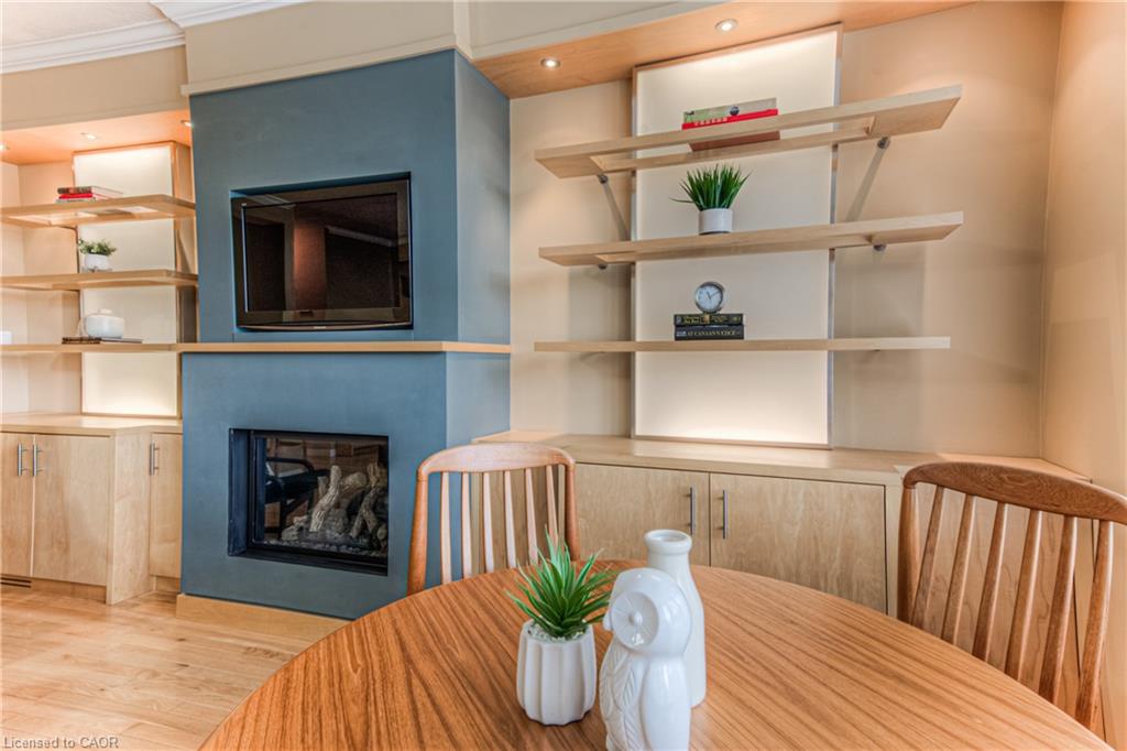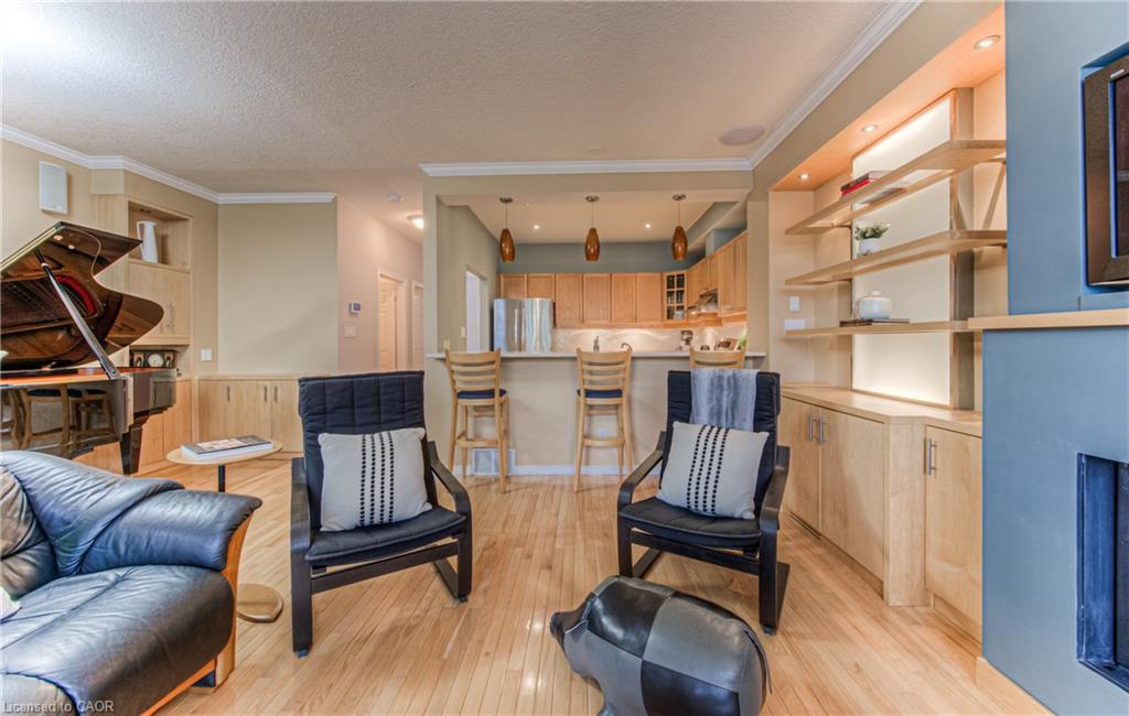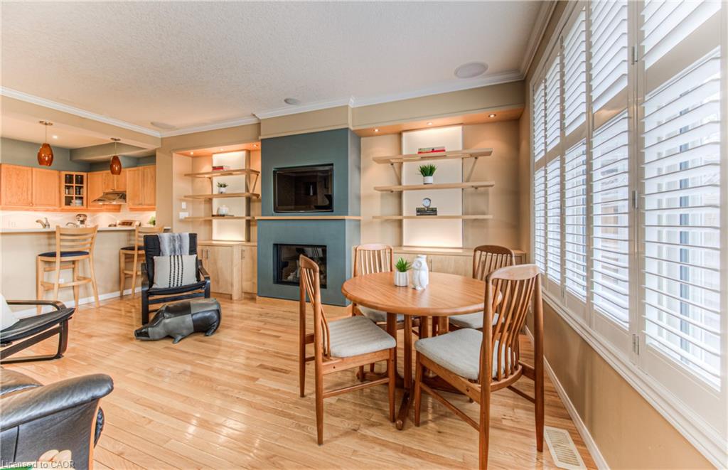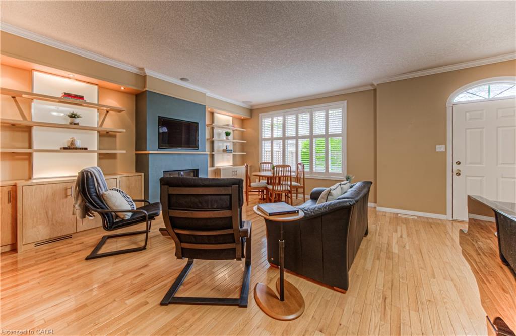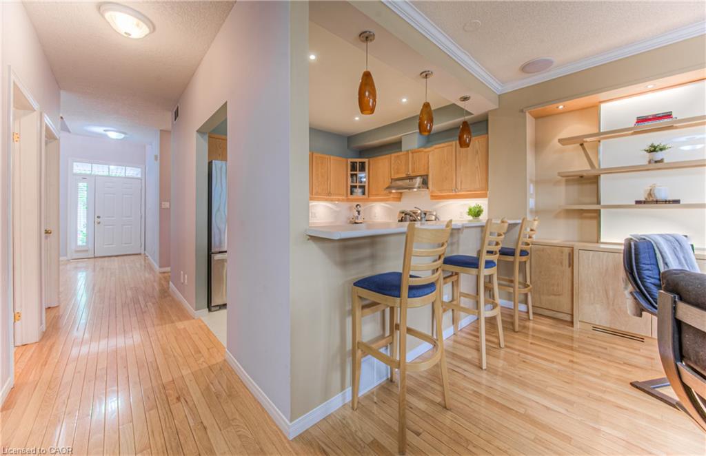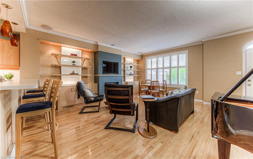Prime Uptown Waterloo Location! Just one block from King Street, this beautifully maintained townhome places you steps from the best restaurants, shops, and cultural hotspots Uptown has to offer. Enjoy close proximity to the Perimeter Institute, CIGI, and Waterloo Park. Step inside to a spacious foyer with soaring ceilings that welcome you into a bright and open living space. The great room features custom built-in shelving and cabinetry surrounding a cozy gas fireplace, with large windows and a patio door that fill the room with natural light and offer refreshing cross breezes. The kitchen is well-equipped with ample cabinetry, generous counter space, and a breakfast bar—perfect for casual dining or entertaining. A convenient laundry room and 2-piece bath complete the main floor. Upstairs, you’ll find two bedrooms and two full bathrooms. The expansive primary suite includes large windows with views of Uptown, a walk-in closet, and a 4-piece ensuite with a separate tub and shower. The second bedroom is ideal for guests or a home office. The finished basement provides additional versatile living space—just add your choice of flooring to complete it. It includes a third bedroom, a hobby room, a workout or rec area, and another 4-piece bathroom. Outdoor living is easy with a charming covered front porch and a private back patio garden—perfect for your morning coffee or a bistro set. Parking for two vehicles (one in the garage, one in the driveway), plus quick access to Light Rail Transit make this a truly exceptional Uptown home.