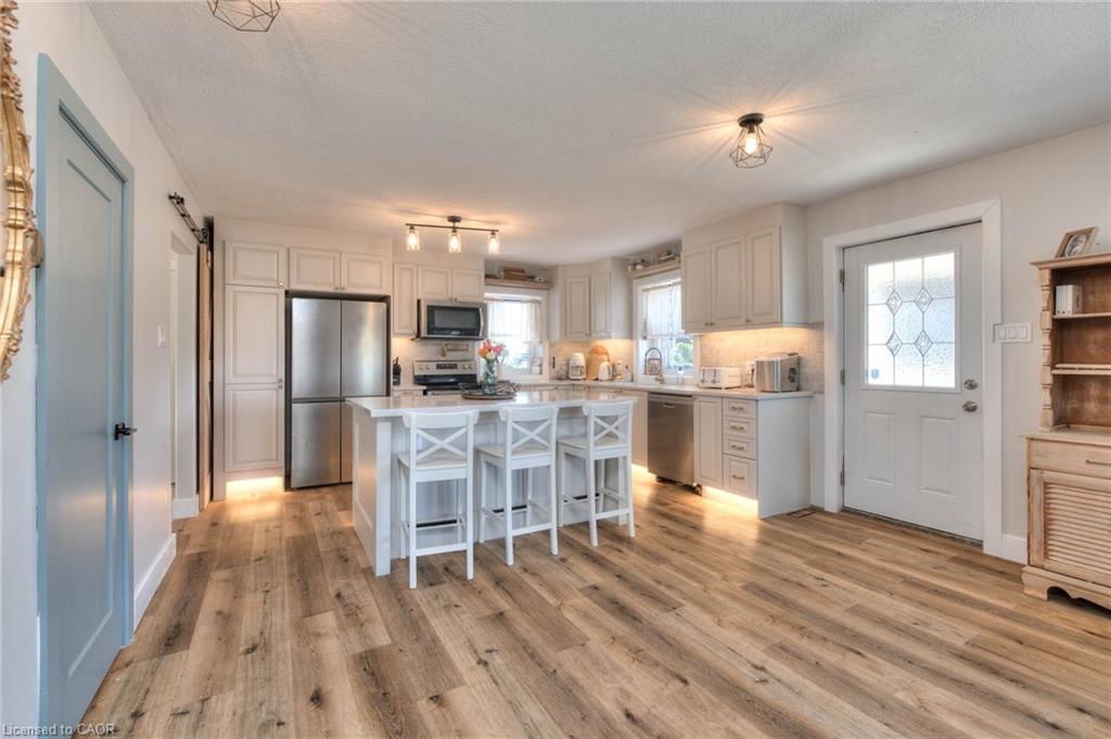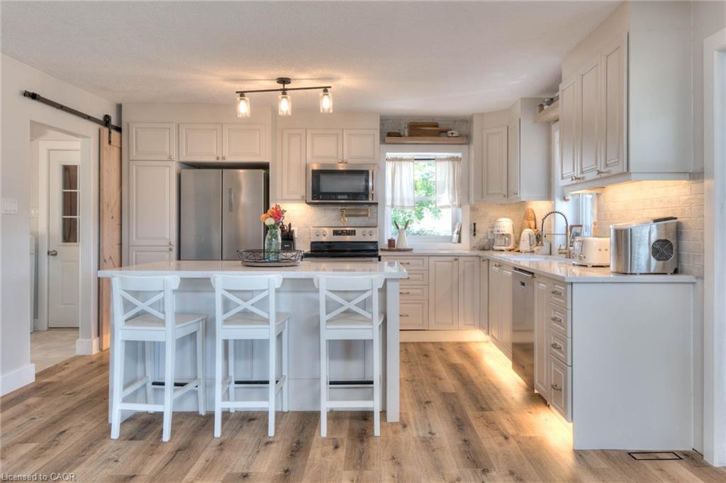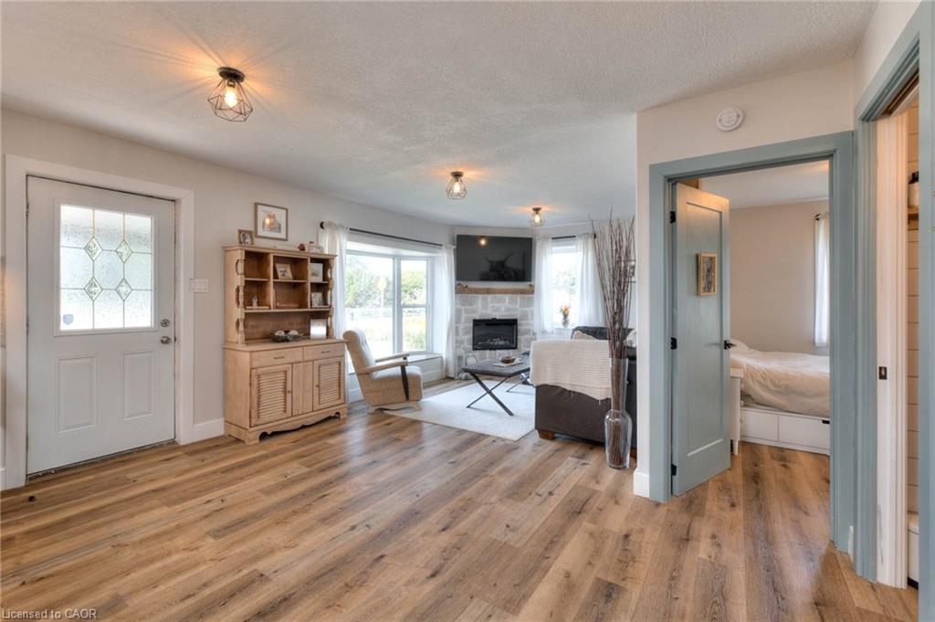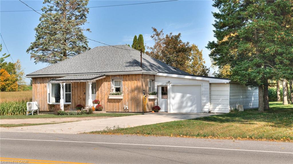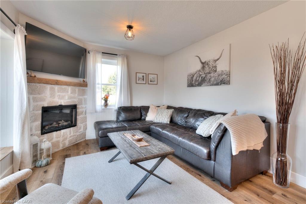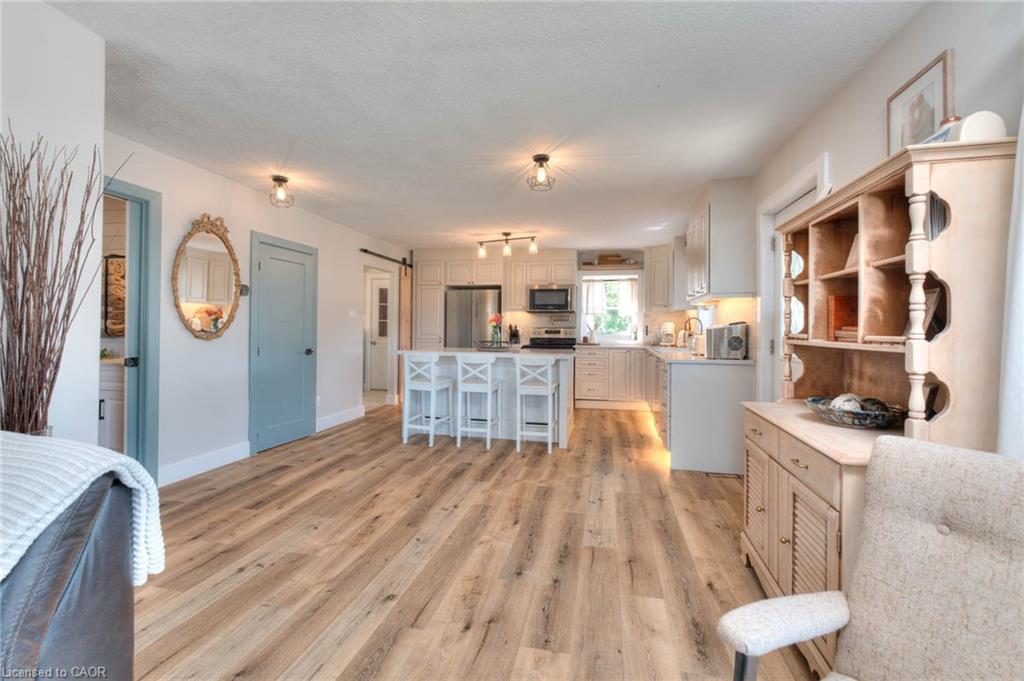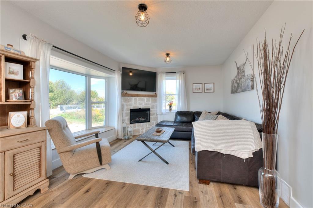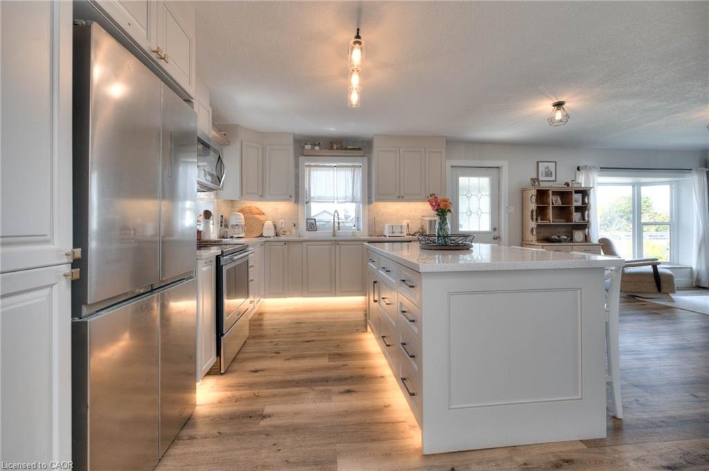 Enjoy the best of country living with modern comfort in this beautifully renovated home on a deep lot backing onto open fields. Mature trees frame the property, while expansive rural views create a peaceful backdrop just minutes from Elmira. The open-concept kitchen and living area centers the home; large enough to accommodate a dining table. Luxury vinyl plank floors run throughout, anchoring a renovated kitchen with stainless appliances, granite countertops, valance/toe-kick lighting, pot filler, and a large island. The adjoining living room features oversized windows and a stone fireplace with a Napoleon insert. A spacious primary bedroom has double closets and a stylish 3-piece bath with shiplap accents and a glass walk-in shower. A versatile bonus room finished with shiplap, large windows, and recessed lighting offers a playroom, nursery, or office with beautiful views. Convenient main-floor laundry/mud room makes everyday living a breeze. The second level is a warm, wood-clad retreat with endless possibilities. With pine ceilings, and a half bath, the loft works beautifully as a guest suite, studio, or bedroom. Downstairs extends your living space with a modern rec room, additional bedroom, and a second 3-piece bath. Updated finishes and recessed lighting create a fresh, comfortable atmosphere. Utility and storage areas complete the lower level. An extended covered rear patio offers shade and shelter for dining or relaxing while the sun sets over neighbouring fields. The attached garage and paved driveway provide ample parking and storage options. Recent updates include: septic tank (2025); main floor bathroom, backyard graded & seeded (2023); concrete driveway, roof, furnace and heat pump (2022); UV filtration system, newer windows, and spray foam insulation throughout. This move-in ready property is ideal for anyone looking to enjoy small-town peaceful living with style and comfort, but with the urban amenities of nearby Elmira only a short drive away.