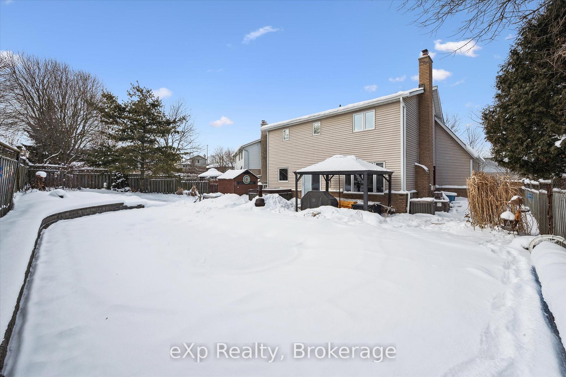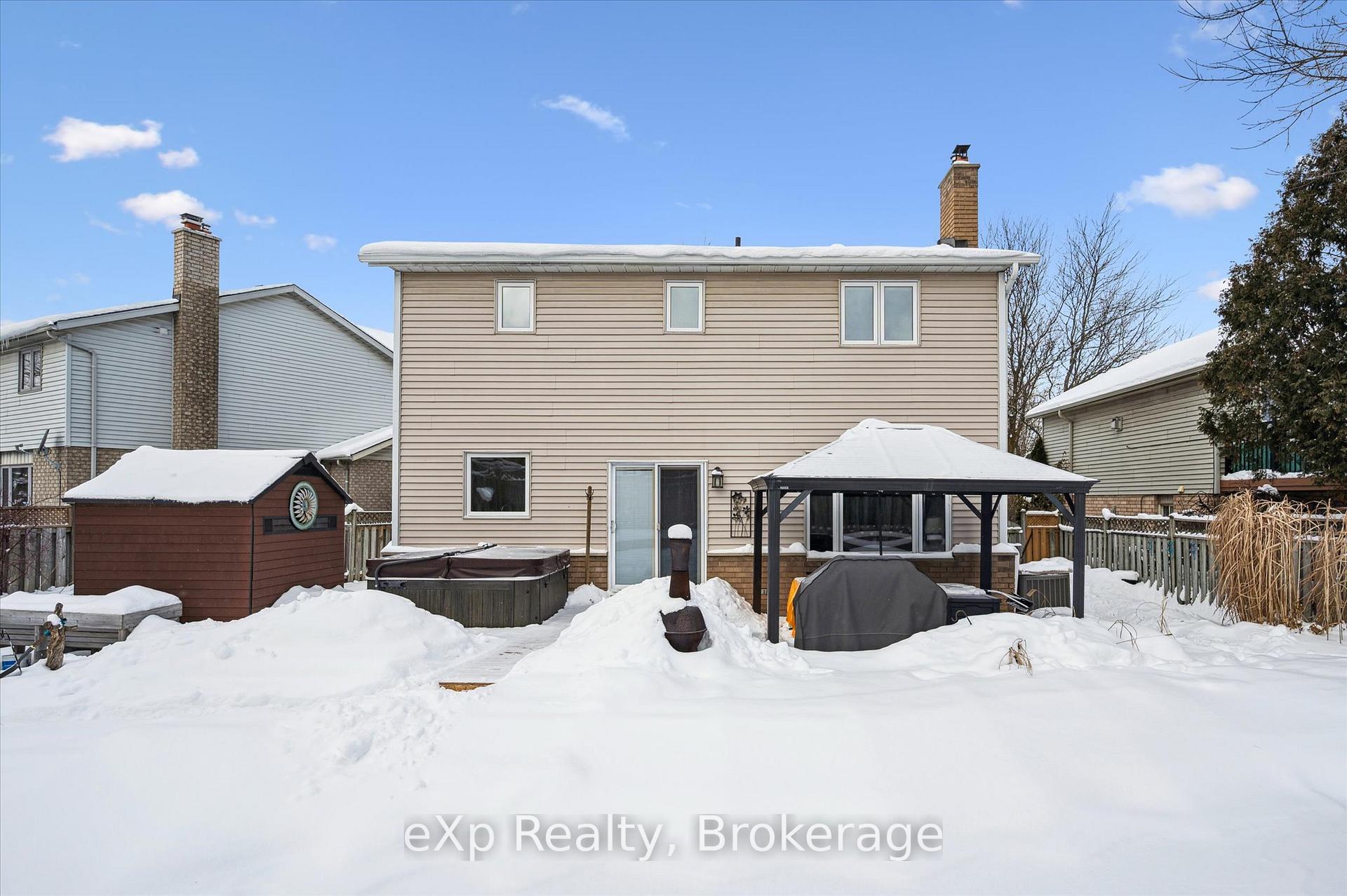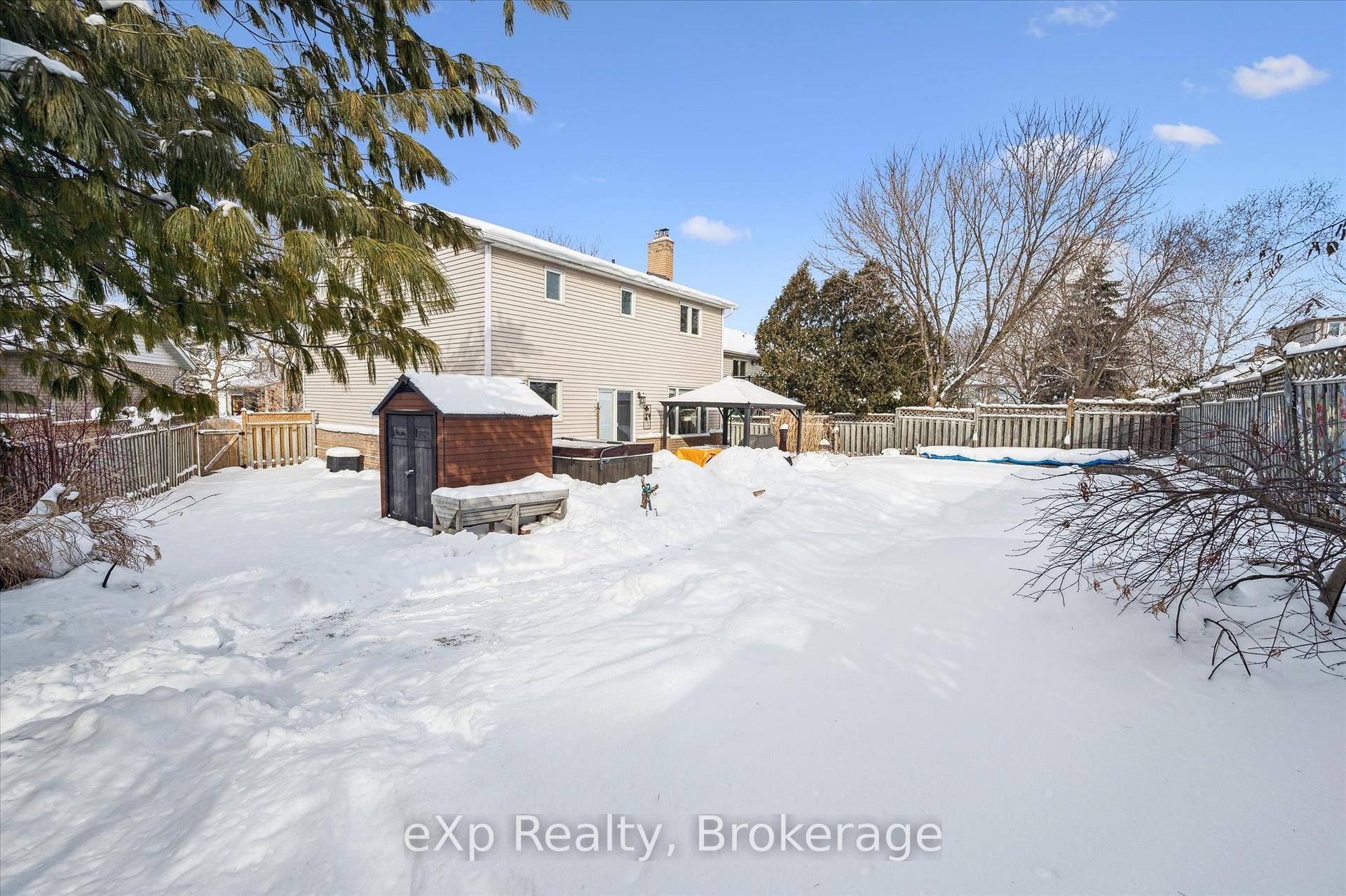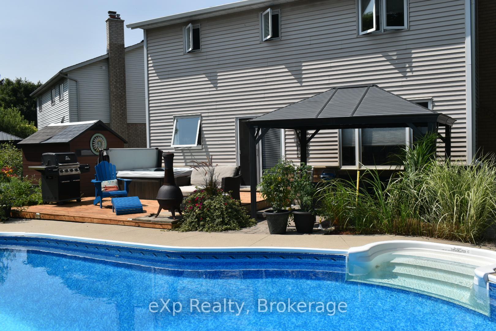 Located on a quiet crescent, this four-bedroom home with an inground pool is in search of its next family! Centrally located adjacent to Old University with easy highway access, yet surrounded by beautiful parks and walking trails along the river that lead right to downtown Guelph. Built by Thomasfield Homes, the front has great curb-appeal with its double car garage and stamped asphalt driveway. The backyard is pie shaped and has a 32×17 ft inground pool with concrete and interlock surround, a hot tub, plus ample grass for the kids or pets to play. The main floor has an updated kitchen and appliances including gas stove (2017), formal living room and dining room with hardwood flooring, a main level family room with gas fireplace, 2-piece bathroom plus a very convenient mudroom from the garage that also has hookups ready for main level laundry should you desire. Upstairs has four bedrooms and two bathrooms that were both updated in 2020. If you need more space, the basement is also finished with a large family room. Other notable updates: Roof and eaves (2024), most windows, flooring and carpet (2017), pool equipment and liner (2014), hot tub, patio door, gas fireplace (2013), furnace and AC (2009). You won’t find many four-bedroom homes with inground pools in this price point, schedule a private viewing today!