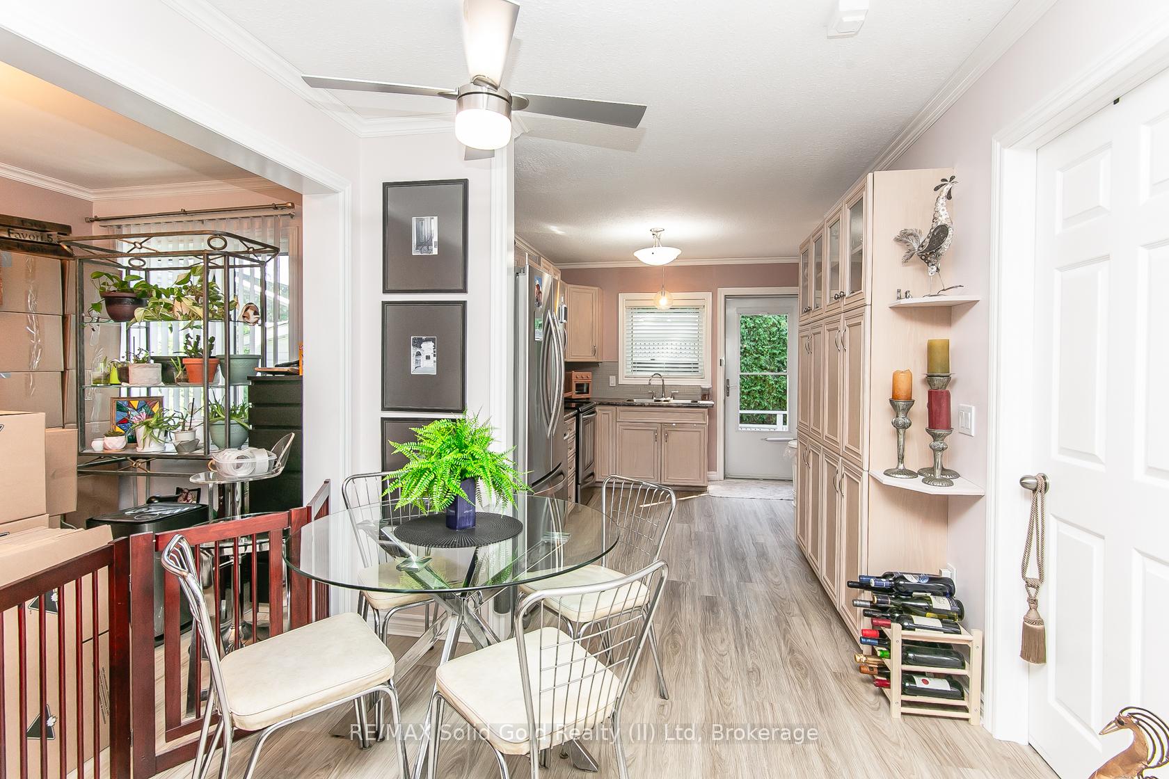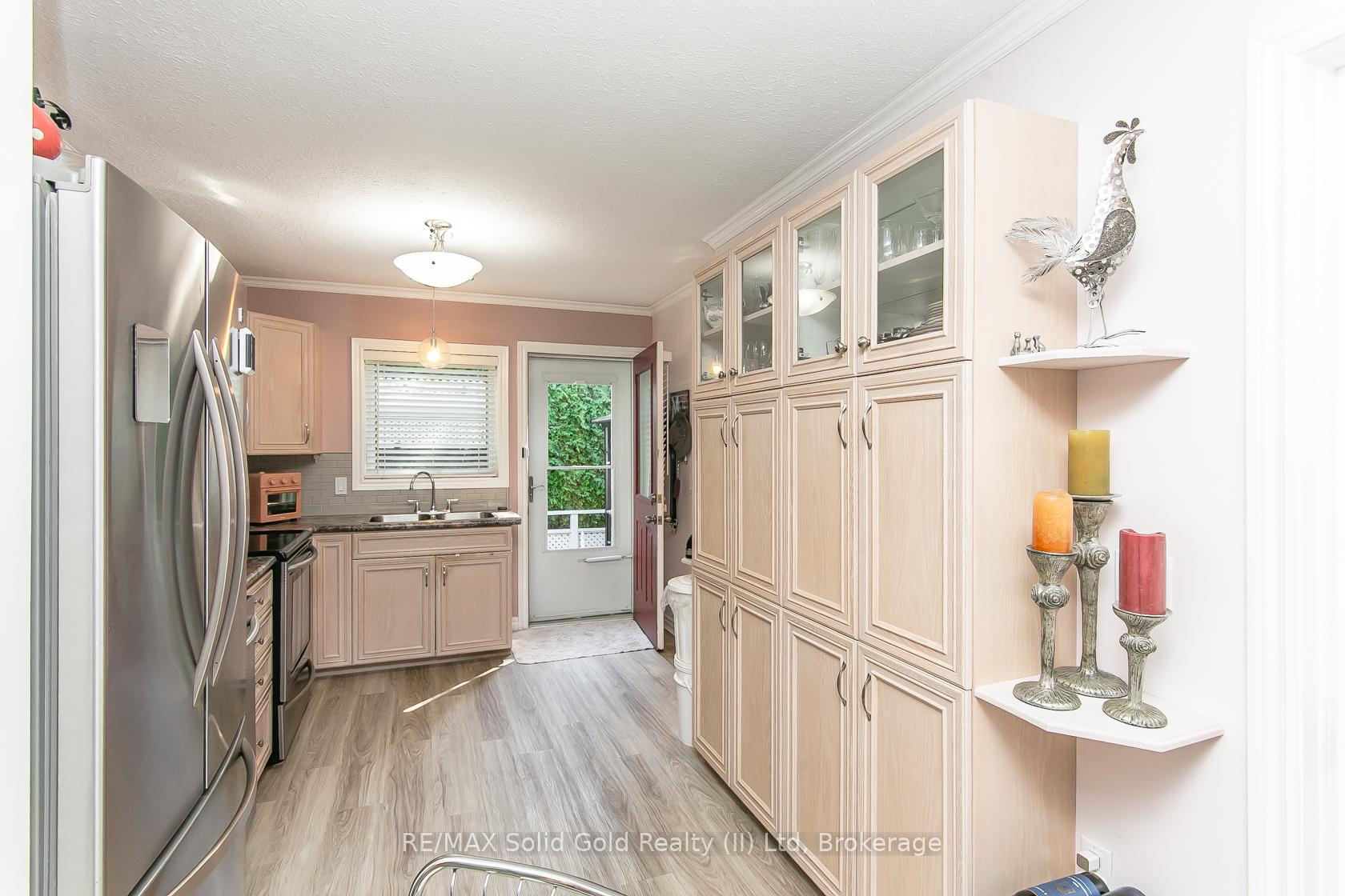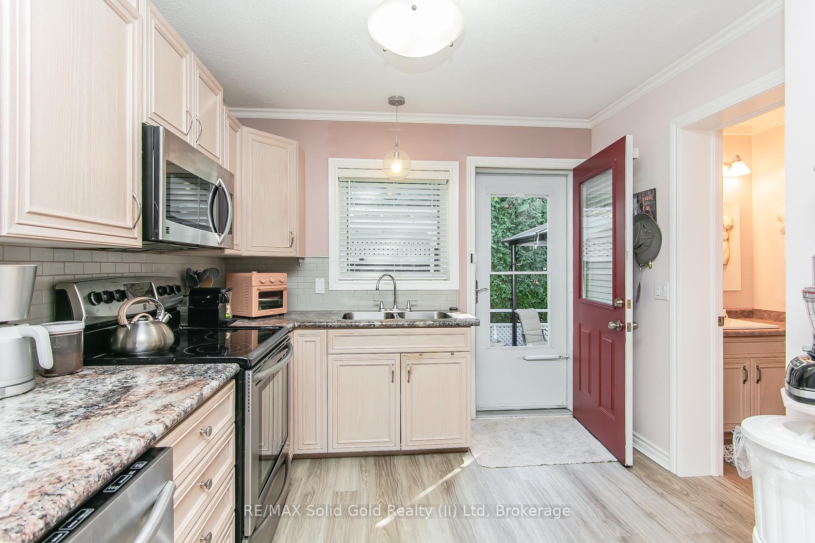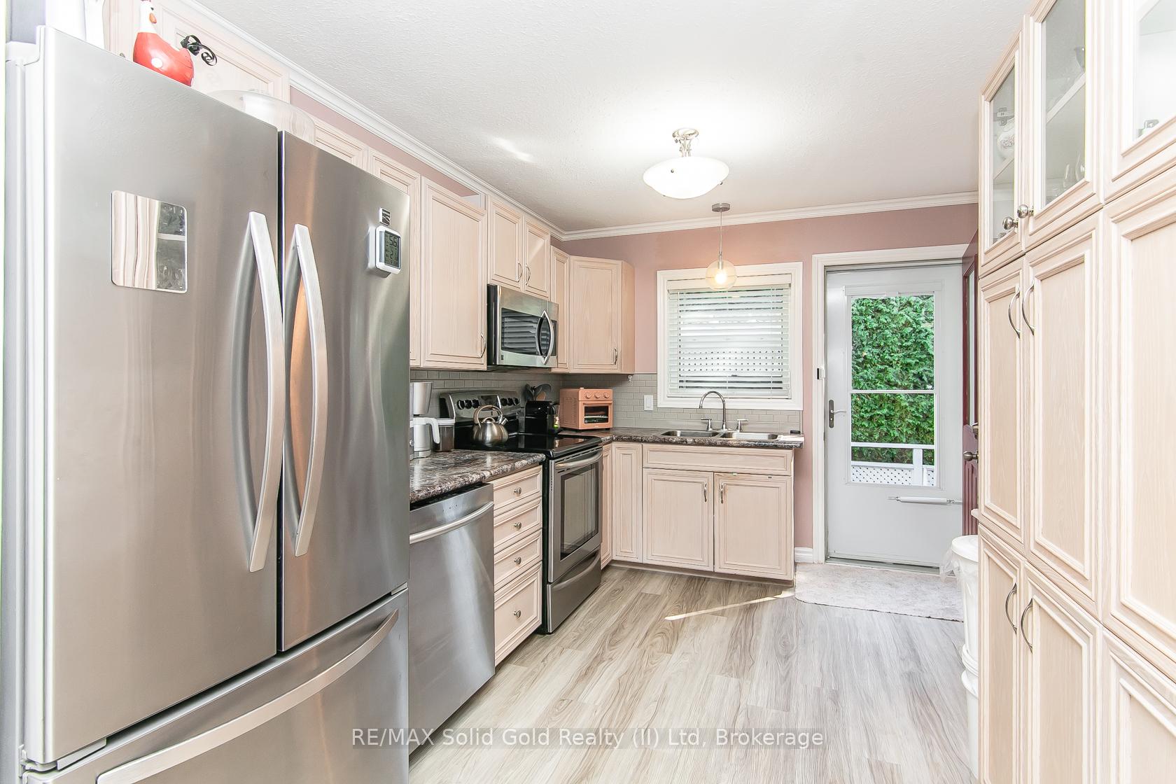 Welcome to this exceptional home nestled in the highly desirable gated community of MiniLakes with the added security of never being left without power. This home has a full backup GENERAC generator meaning that you will never be left in the dark. This home offers a perfect blend of comfort, style, and low-maintenance living, making it the ideal retreat for downsizers, empty nesters, or anyone seeking a tranquil lifestyle away from the hustle and bustle of city life. 4 Elm Street is a beautifully crafted home built by Quality Homes, known for their precision and attention to detail. Enter this beauty by way of a newly installed front deck/porch with glass railing. Step inside to be greeted by a light and airy living room featuring newer luxury vinyl plank flooring throughout, charming crown molding, and large windows that fill the space with natural light. The dining room space is perfect for family gatherings and can easily be converted into an additional bedroom if desired. The stunning kitchen boasts stainless steel appliances, backsplash, ample counter space, and pantry cupboards for all your storage needs. The main bath has been tastefully updated in the past two years by BathFitter. Step outside to your expansive deck where you can relax and enjoy views of the mature trees, plus there’s and a shed and storage hut for all extra things. Residents of MiniLakes enjoy a vibrant community lifestyle with access to spring-fed lakes, scenic canals, a heated pool, community gardens, and walking trails. Engage in various activities such as fishing, swimming, bocce, darts, and card nights, all while being just minutes away from Guelphs amenities and a quick drive to the 401. If youre ready to leave behind the confines of city living and embrace a peaceful, outdoor-oriented lifestyle, this home at MiniLakes offers an unparalleled opportunity to enjoy nature, connection, and recreation in a friendly, welcoming environment!
