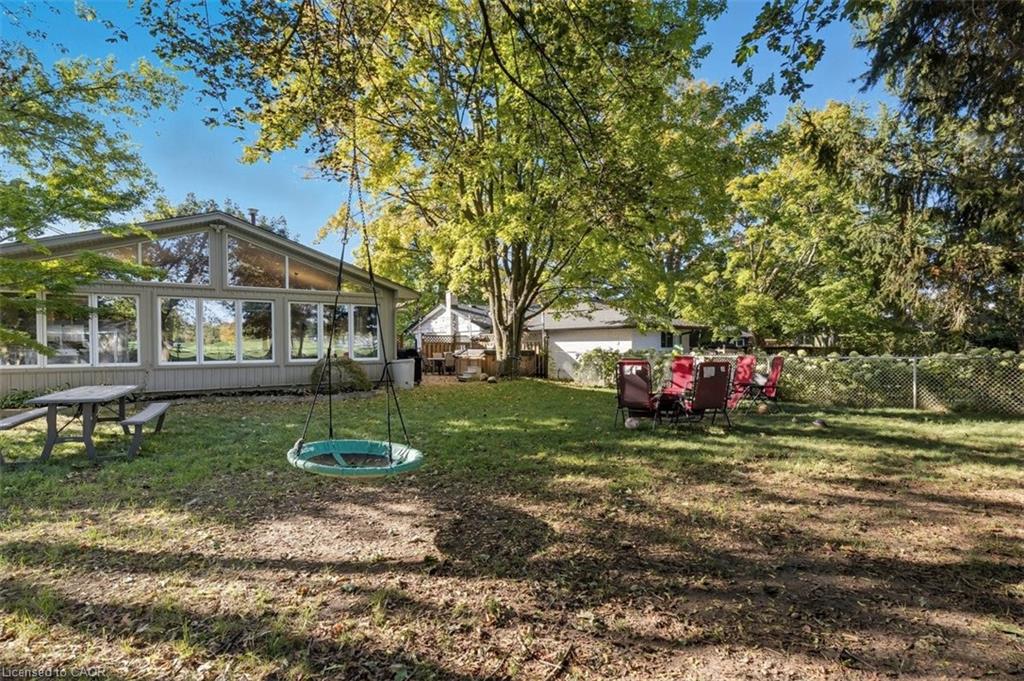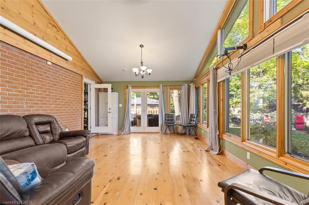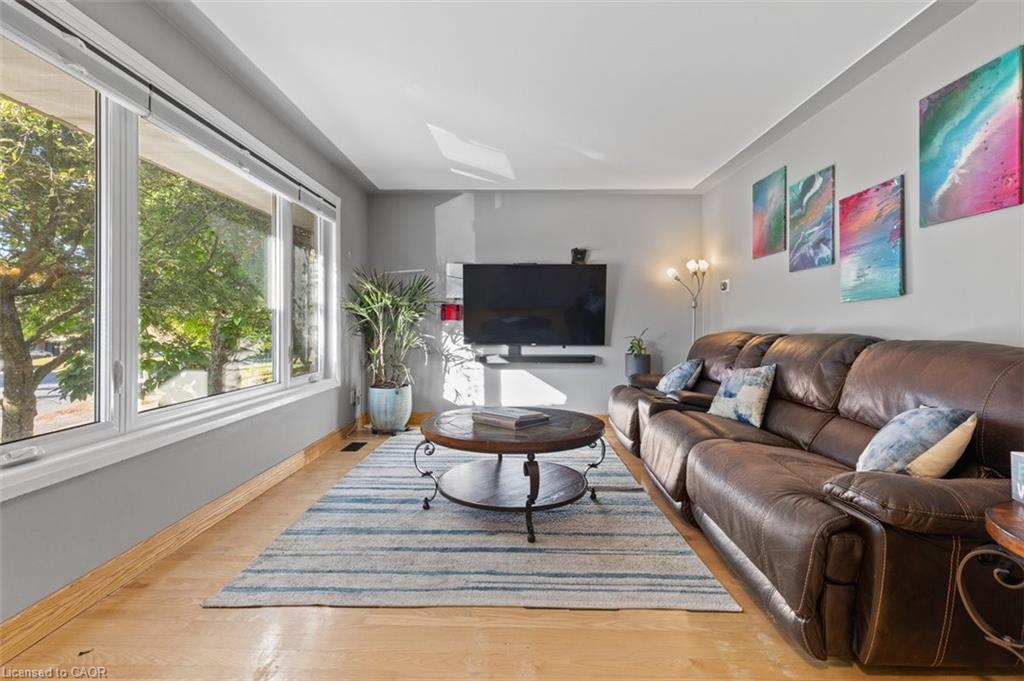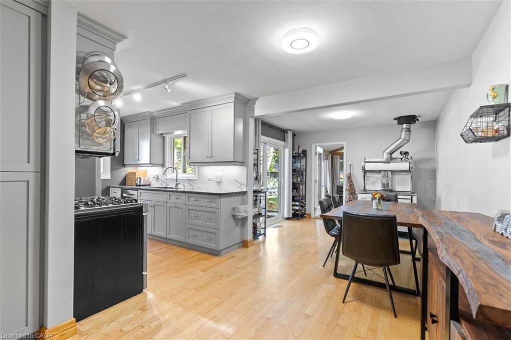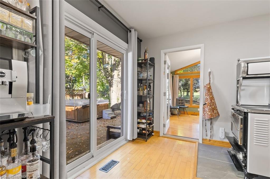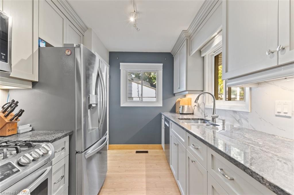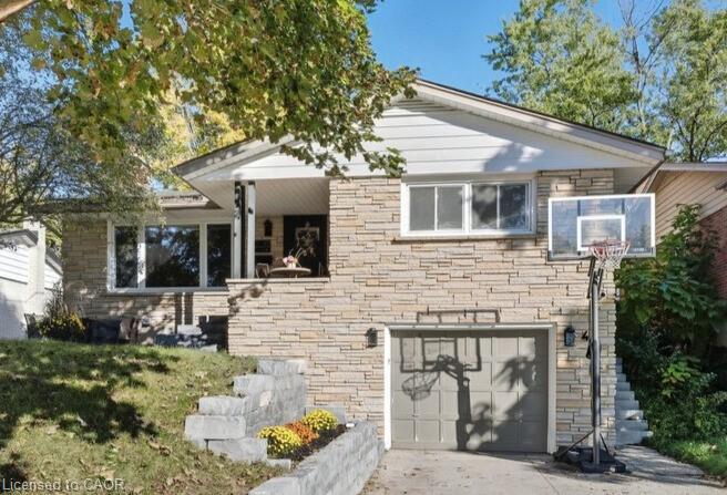 With over $150,000 in recent upgrades, this brick raised bungalow in Kitchener’s sought-after Stanley Park, offers 2,500 sq.ft. of finished living space. From the moment you arrive, the double-wide concrete driveway, stone retaining wall, and welcoming front steps set the tone for what’s inside. Step through the front door and you’re greeted by hardwood flooring that flows seamlessly from the living room into the kitchen and dining room. The kitchen is a chef’s dream with newer stainless steel appliances, granite countertops, and a gas stove, combining modern convenience with timeless style. The impressive 27′ x 14′ four-season sunroom steals the show — surrounded by windows that flood the space with natural light and featuring a wood-burning stove, it offers year-round views of the expansive backyard that backs directly onto Franklin Park. A backyard hot tub adds to this perfect retreat.