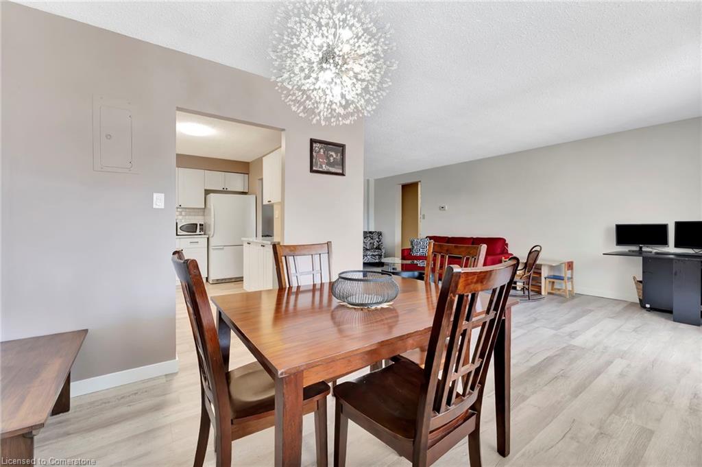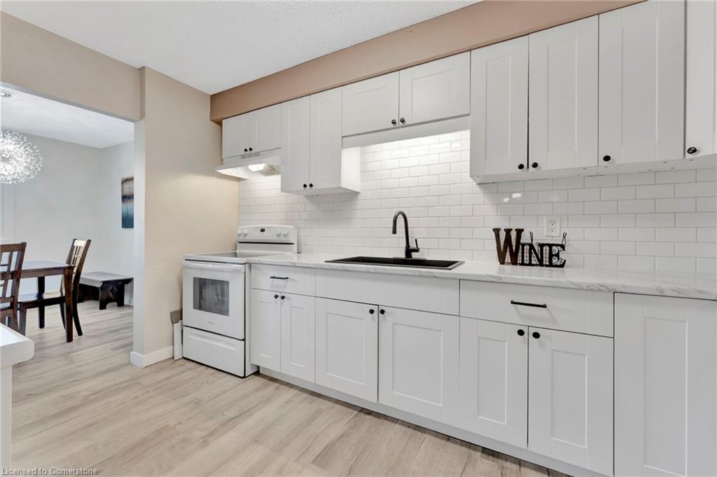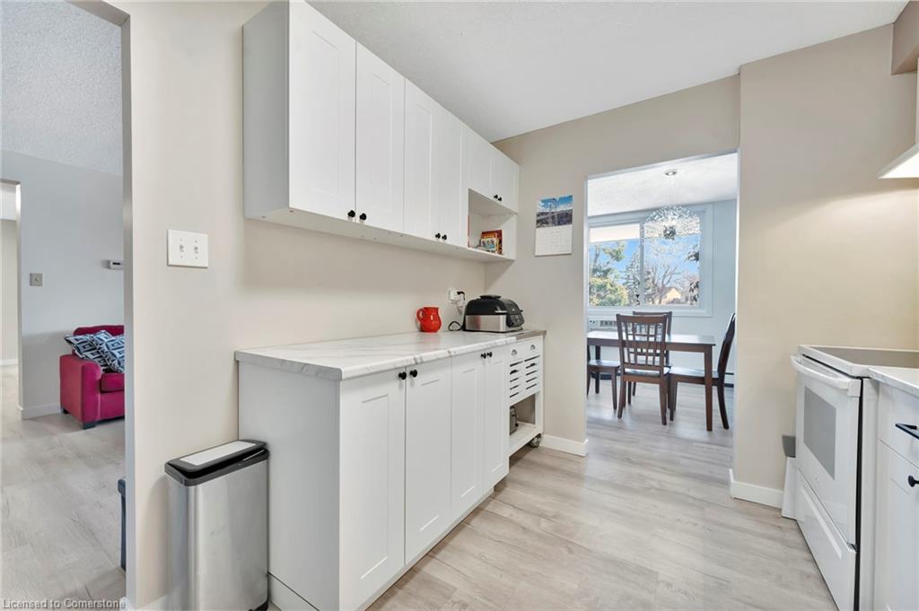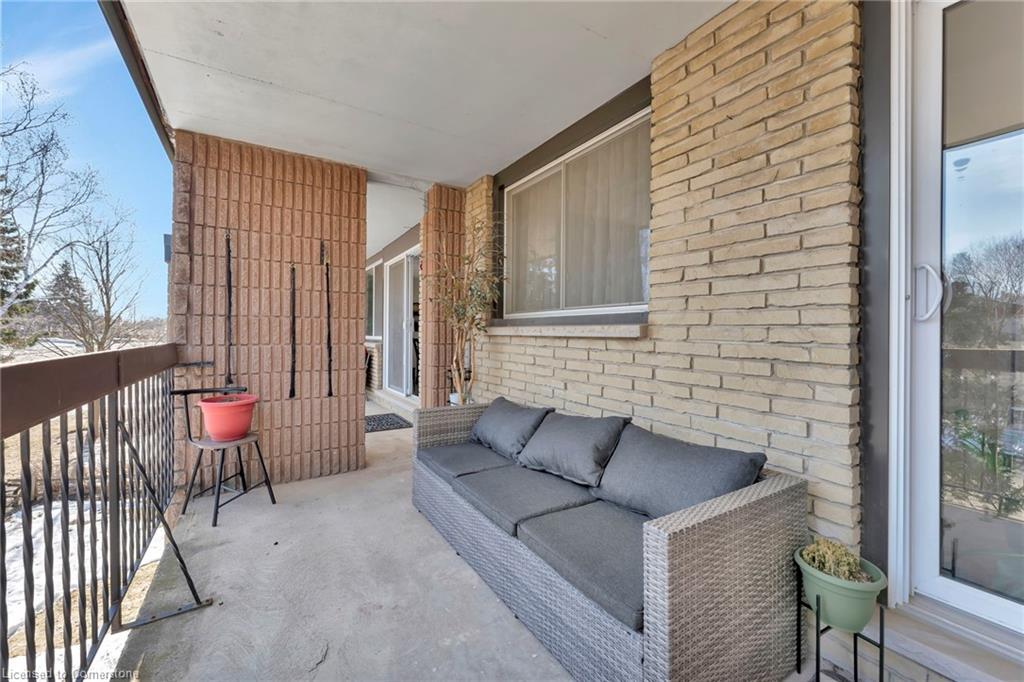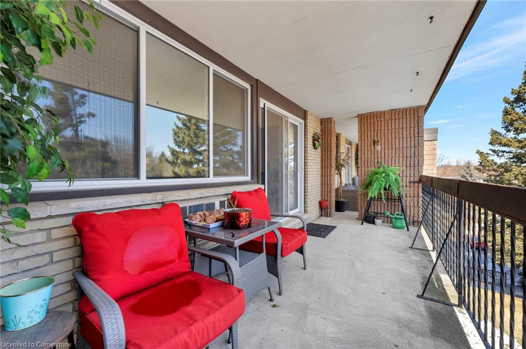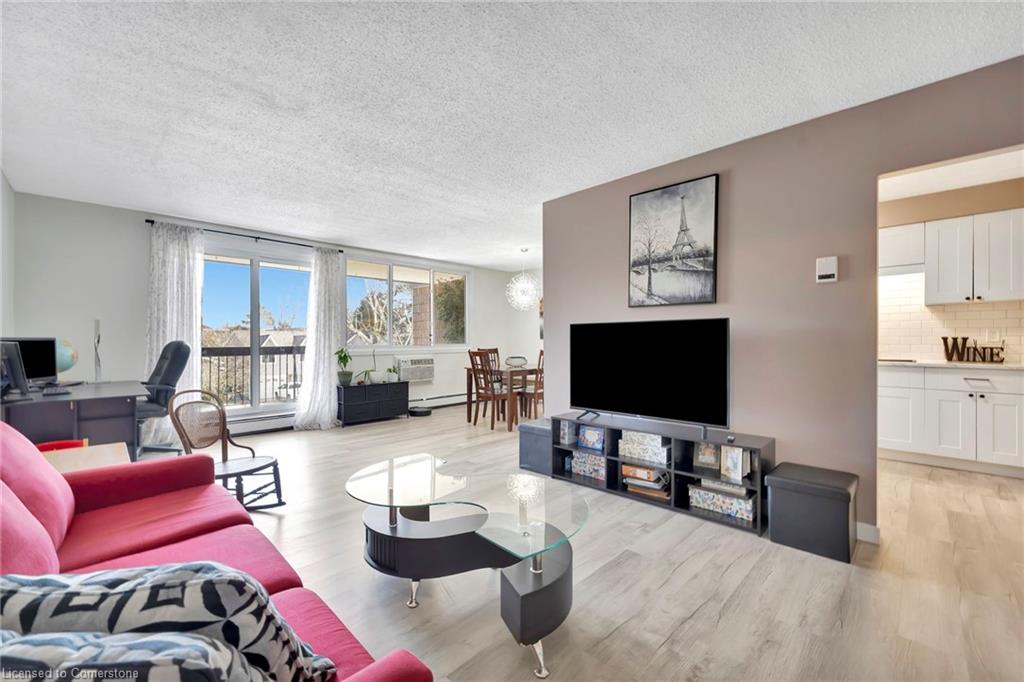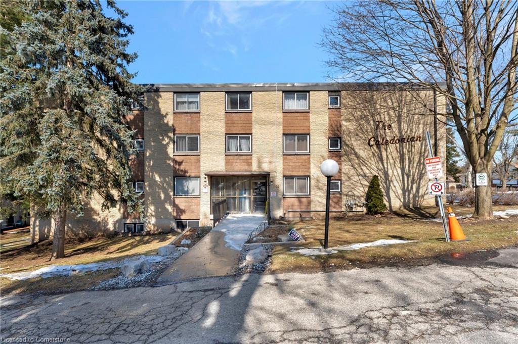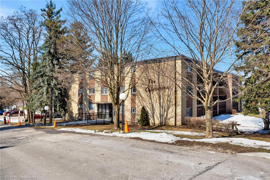 Beautifully Renovated 2-Bedroom Condo in a Prime Location! Nestled on a quiet crescent near Riverside Park, this stunning unit is just minutes from Hwy 401 and offers a dead-end street setting for added privacy. Recent upgrades make this home truly move-in ready! Featuring a modern and stylish white kitchen with brand new contemporary countertops, a granite sink, modern faucet, new built-in dishwasher and subway tile backsplash. The open-concept, carpet free layout boasts luxury vinyl plank flooring throughout. A spacious living room with room for an office opens to an end-to-end balcony overlooking the treetops—perfect for morning coffee. The separate dining room is enhanced by a stylish sputnik light fixture. The updated 5- piece bath includes a double-sink vanity. Both bedrooms are generously sized, with the primary bedroom offering direct balcony access. Additional upgrades include new light fixtures throughout and A/C for summer comfort. The Caledonian offers convenient laundry on every floor, plus amenities such as a party room, gym, bike storage, and workshop. Includes parking and storage locker. Secure entry on both sides of the building. This location is close to the Grand River, trails, shopping, and dining. Rarely available—book your showing today