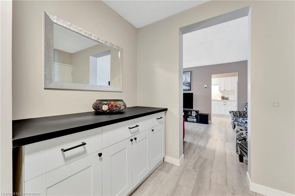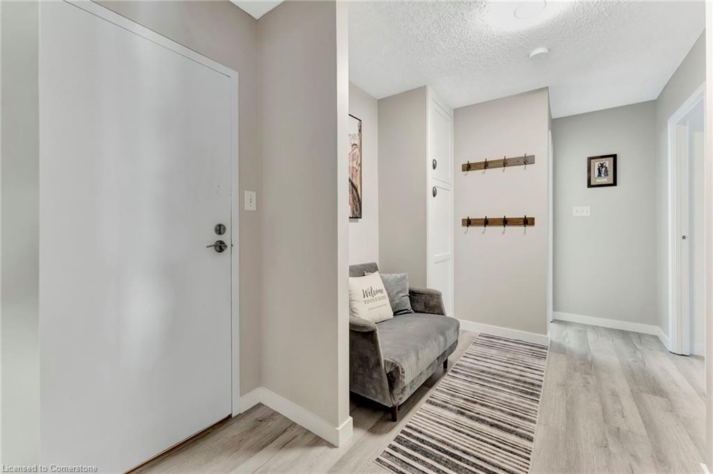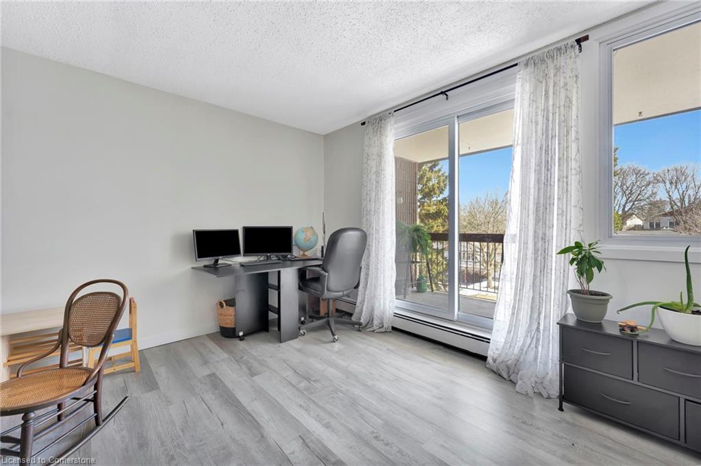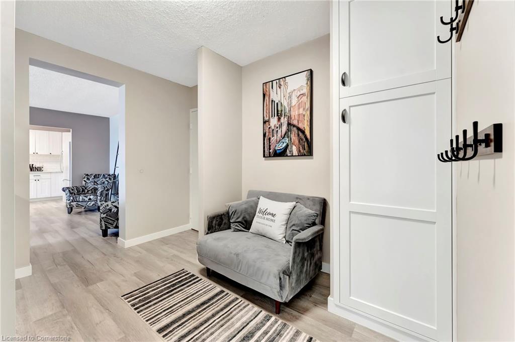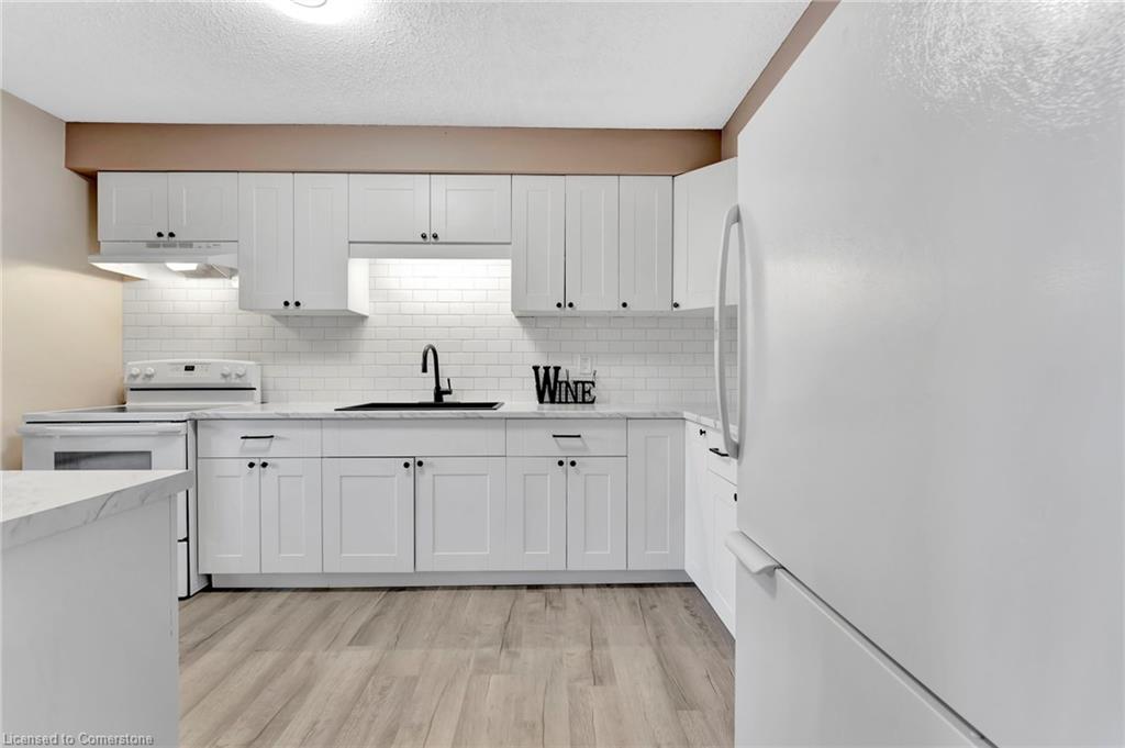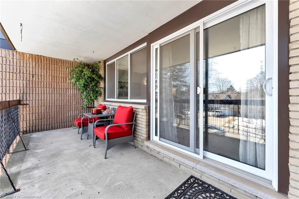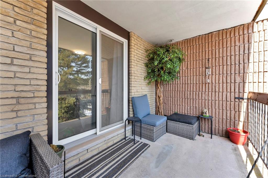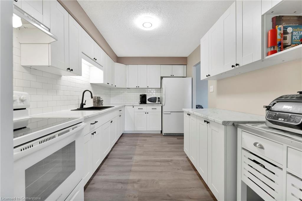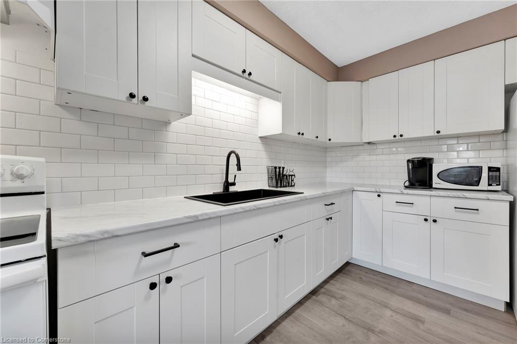 Beautifully Renovated 2-Bedroom Condo in a Prime Location! Nestled on a quiet crescent near Riverside Park, this stunning unit is just minutes from Hwy 401 and offers a dead-end street setting for added privacy. Recent upgrades make this home truly move-in ready! Featuring a modern and stylish white kitchen with brand new contemporary countertops, a granite sink, modern faucet, new built-in dishwasher and subway tile backsplash. The open-concept, carpet free layout boasts luxury vinyl plank flooring throughout. A spacious living room with room for an office opens to an end-to-end balcony overlooking the treetops—perfect for morning coffee. The separate dining room is enhanced by a stylish sputnik light fixture. The updated 5- piece bath includes a double-sink vanity. Both bedrooms are generously sized, with the primary bedroom offering direct balcony access. Additional upgrades include new light fixtures throughout and A/C for summer comfort. The Caledonian offers convenient laundry on every floor, plus amenities such as a party room, gym, bike storage, and workshop. Includes parking and storage locker. Secure entry on both sides of the building. This location is close to the Grand River, trails, shopping, and dining. Rarely available—book your showing today