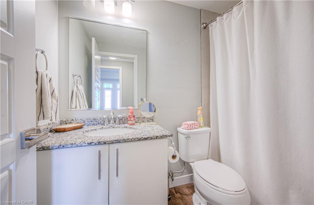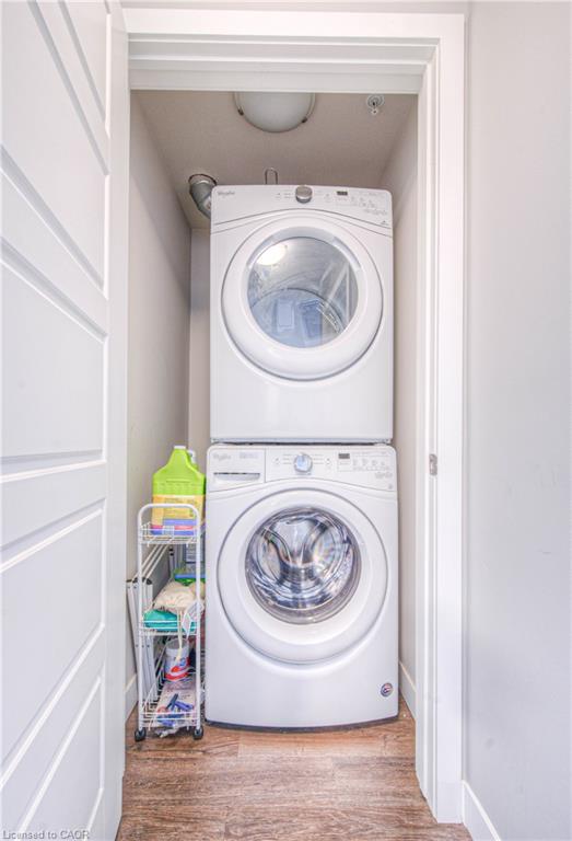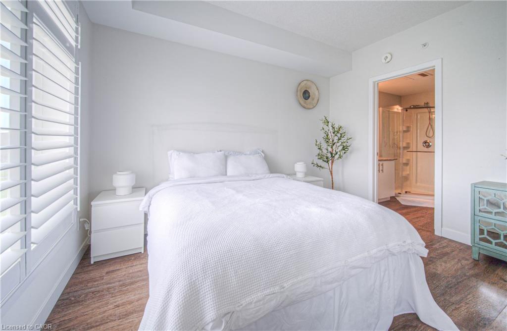 This stunning 2-bedroom, 2-bathroom condo has just hit the market. Perfectly perched on the premium 4th floor, this bright, carpet-free suite boasts luxury flooring throughout and offers views of the park and the charming Williamsburg Town Centre. You’ll fall in love with the modern kitchen, featuring soft-close cabinets, California shutters, granite countertops, a massive island perfect for gathering, and stainless steel appliances. Both bathrooms are finished with granite counters and stylish oval undermount sinks. Thoughtful upgrades continue with upgraded doors, front-loading laundry set, and a spacious balcony. Designed for both comfort and privacy, the two bedrooms are ideally located on opposite sides of the living area. Plus, enjoy the convenience of an oversized underground parking space and a private locker for extra storage. Located close to everything you need — banks, schools, fitness centres, parks, and the highway-this condo truly has it all.