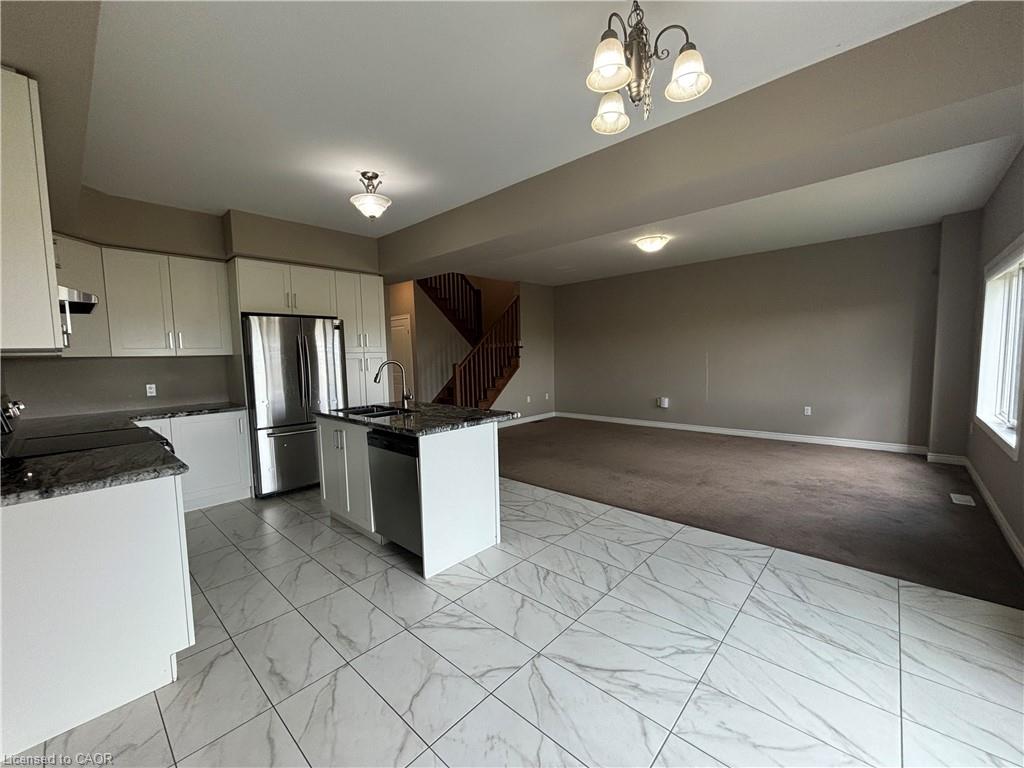 Step inside to find a versatile main-floor den, perfect for a home office or cozy reading nook. The kitchen has modern white cabinets with stone countertops, kitchen island with seating space, and stainless steel appliances throughout. The open-concept layout is ideal for entertaining, flowing seamlessly into the dining and living areas. An elegant oak staircase adds a touch of timeless charm to the interior.