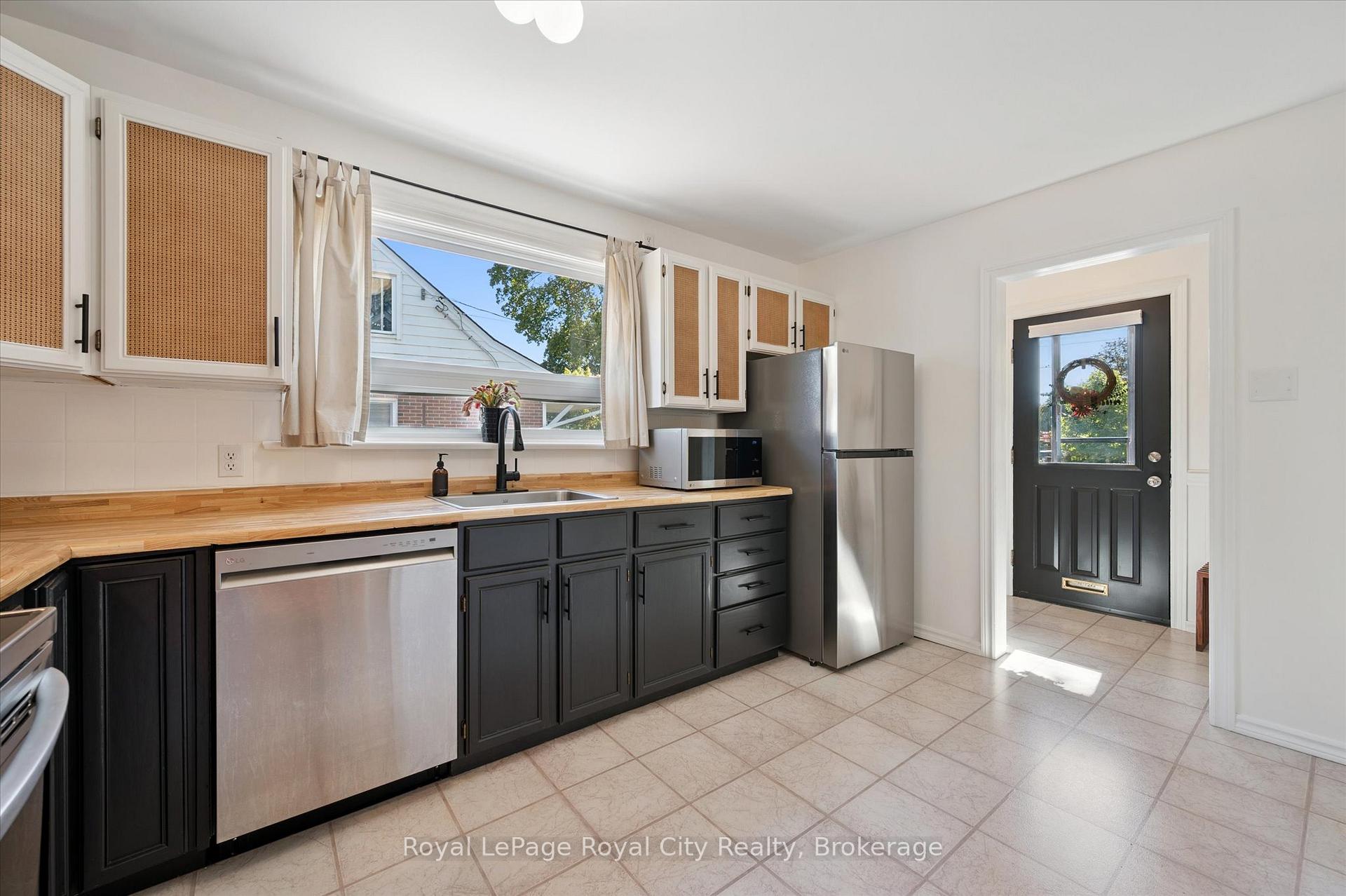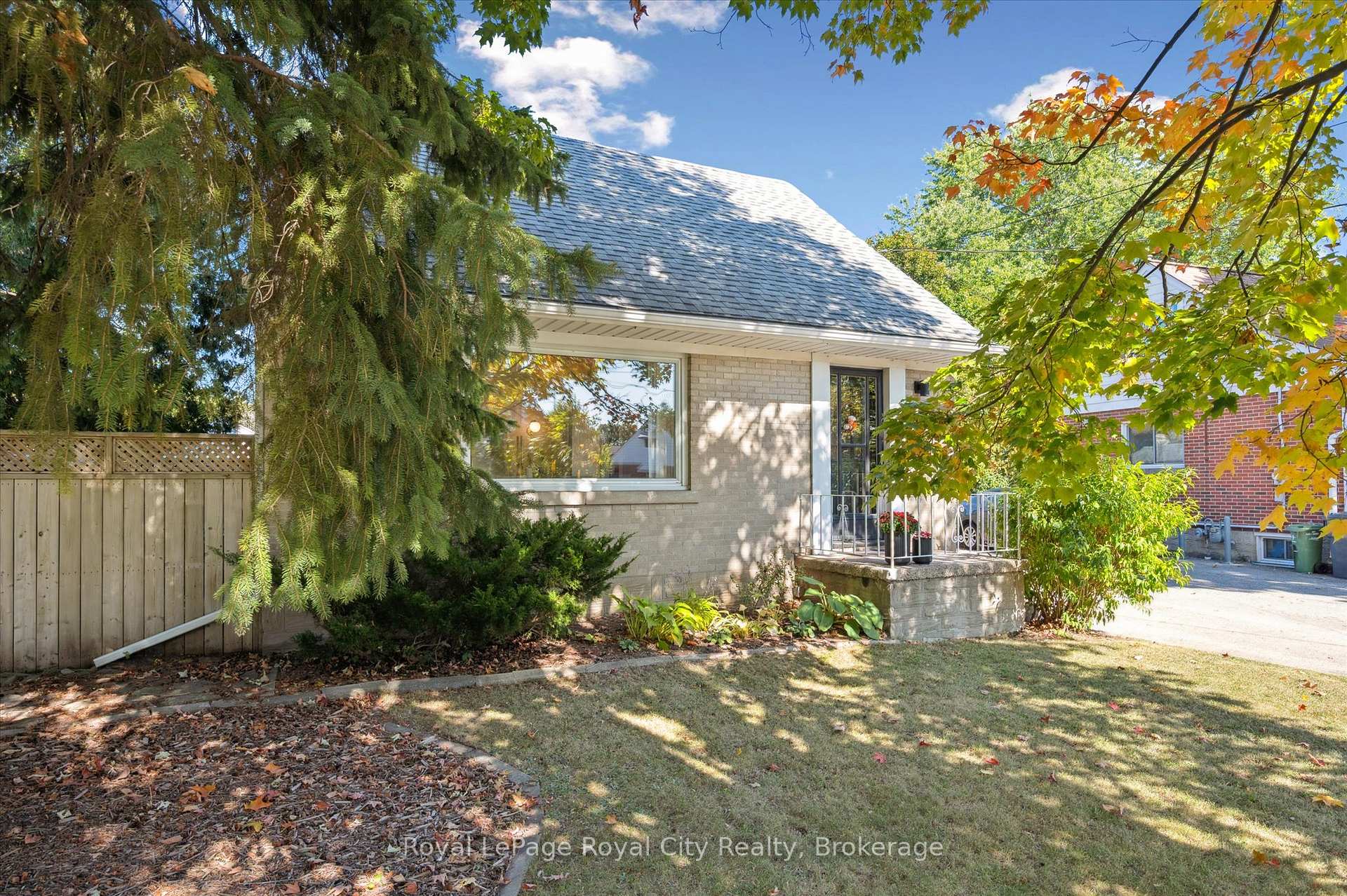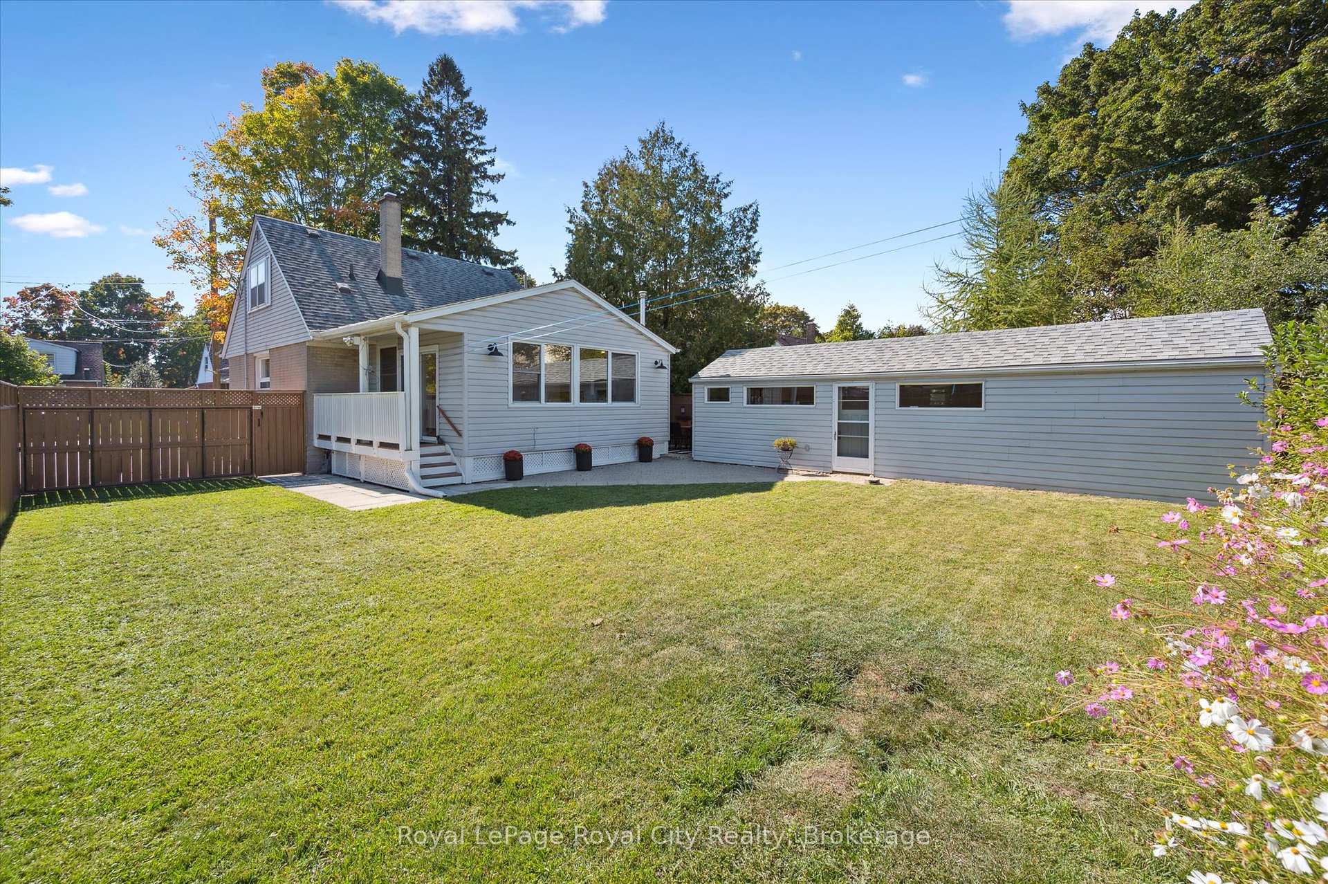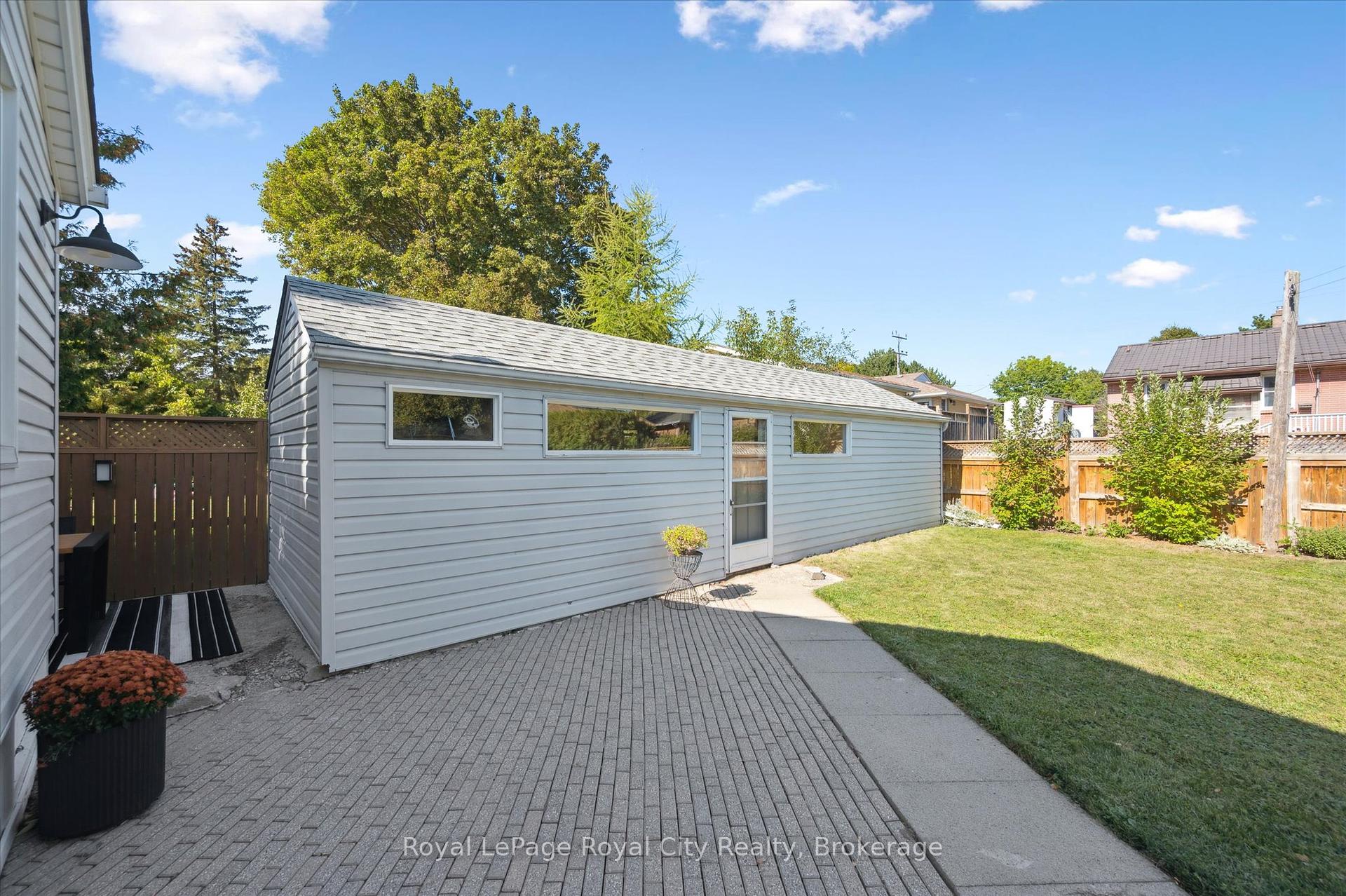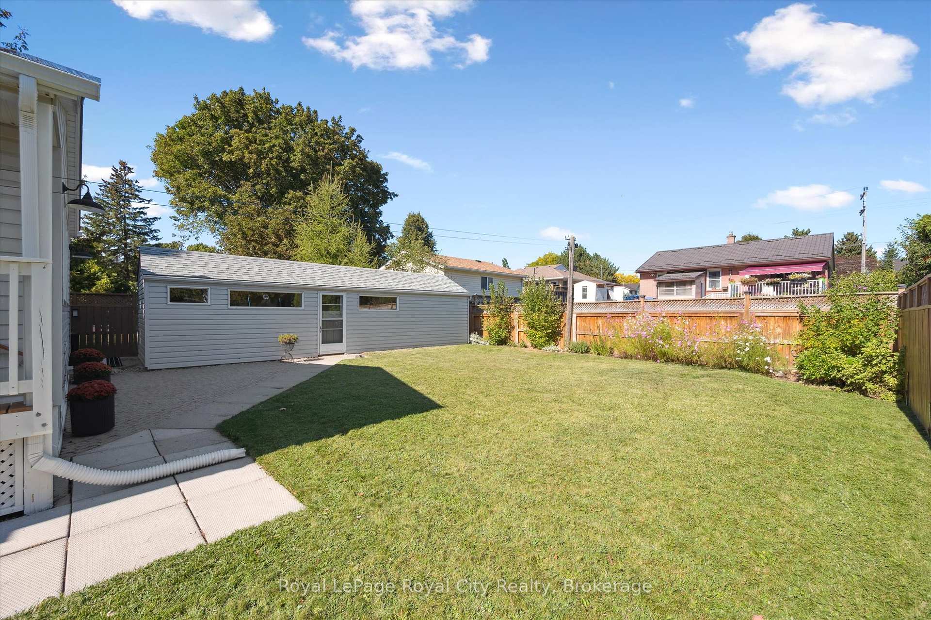 This charming 3-Bedroom, detached 1.5-storey home is located in the desirable St. George Park area of Guelph. The home has been meticulously cared for, w/ tasteful updates & design choices throughout. The spacious kitchen features new stainless steel appliances & matching sink & faucet. A window above the sink allows natural light to fill the space and the cutout between the kitchen & dining/living area keeps you connected with family & guests while preparing meals. This room also has a large front window that frames a picturesque view of the lawn & mature trees. There is a main-floor BDRM (the perfect home office) & just down the hall is an updated 4-piece BATH. The great room addition at the back of the home provides a cozy, sun-filled retreat w/ wraparound windows, pot lights & a corner gas fireplace. Sliding glass doors lead to a covered deck, which opens to a spacious, fully fenced backyard & patio area. There is even a detached workshop (10 ft x 28 ft) equipped w/ cabinets, shelving, lighting, & electrical, offering space for yard equipment, tools, & storage. It could also make an excellent studio. On the second floor, the primary BDRM has ample space for your bed & additional furniture, as well as a closet and large window. There is another well-sized BDRM on this floor with a closet, large window and room for a bed and some furniture. At the top of the stairs, an adorable built-in linen closet provides extra storage. The finished rec room in the basement is perfect for relaxation & entertaining, w/ pot lights, carpeting, built-in shelving, & a built-in bar w/ storage. The laundry area includes a sink, shelving, & extra storage, plus a cold room at the back. The long tandem driveway accommodates 3 cars. Close to great schools, parks, recreation centre, public transit & lots of amenities. Recent Updates: laminate flooring, AC(2025), fridge/stove(2025), dishwasher(2022), water softener(2021), roof ridge cap repair(2024) Don’t miss this fantastic opportunity!