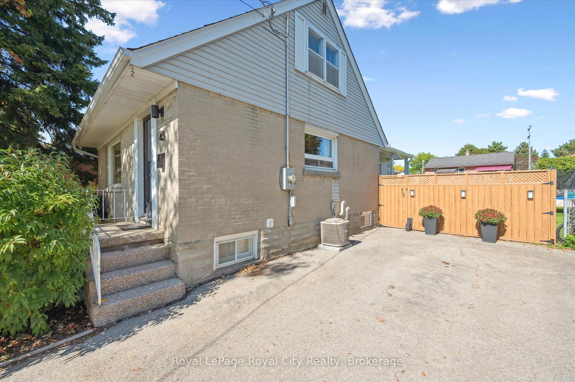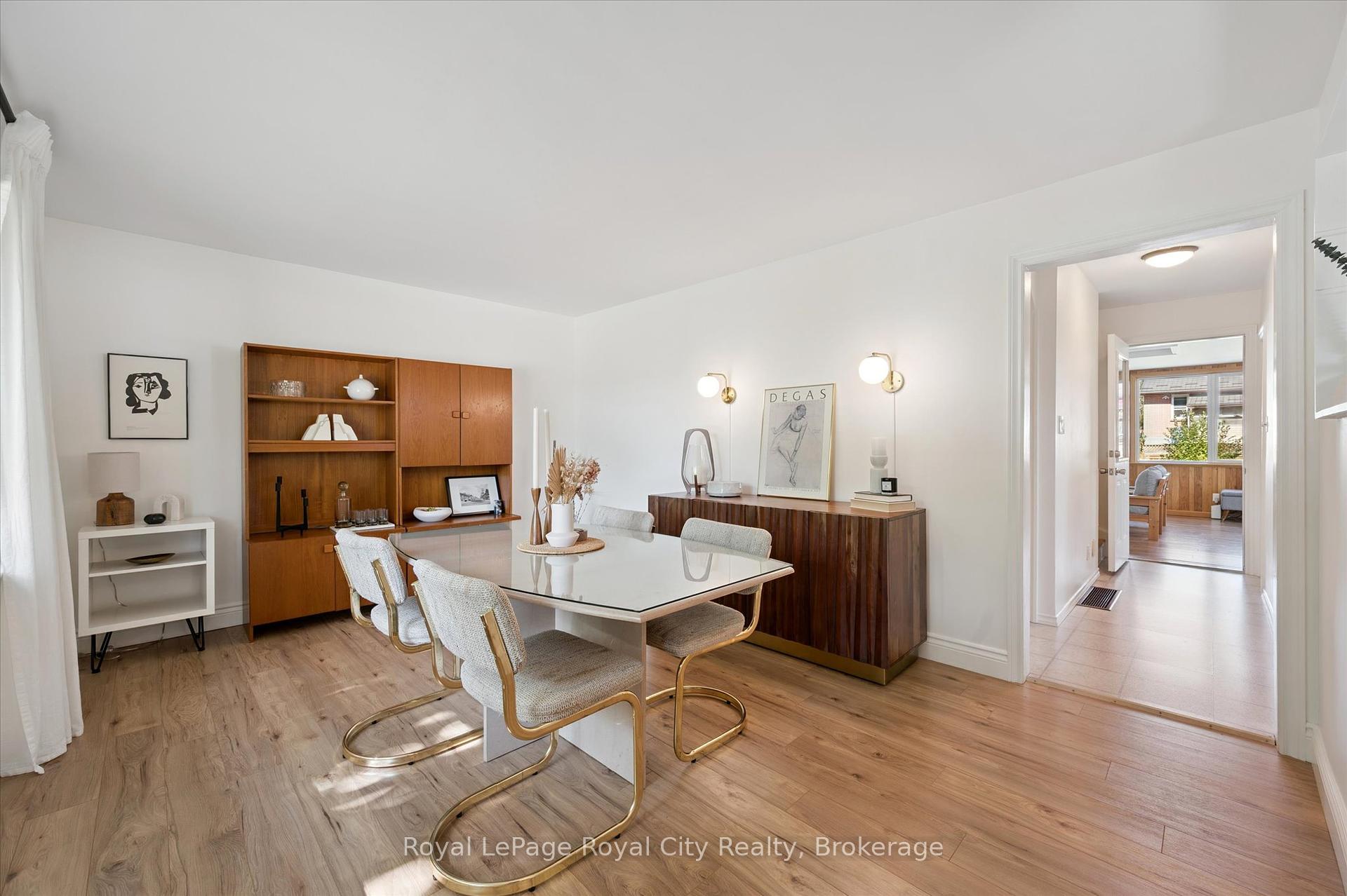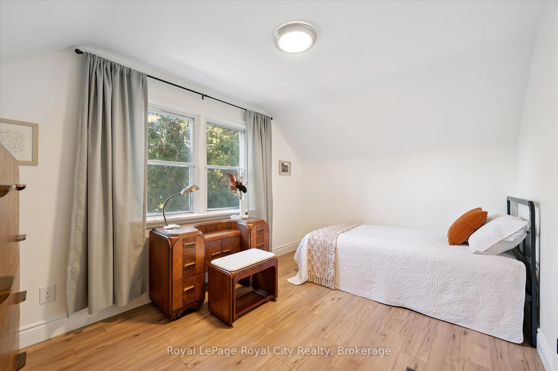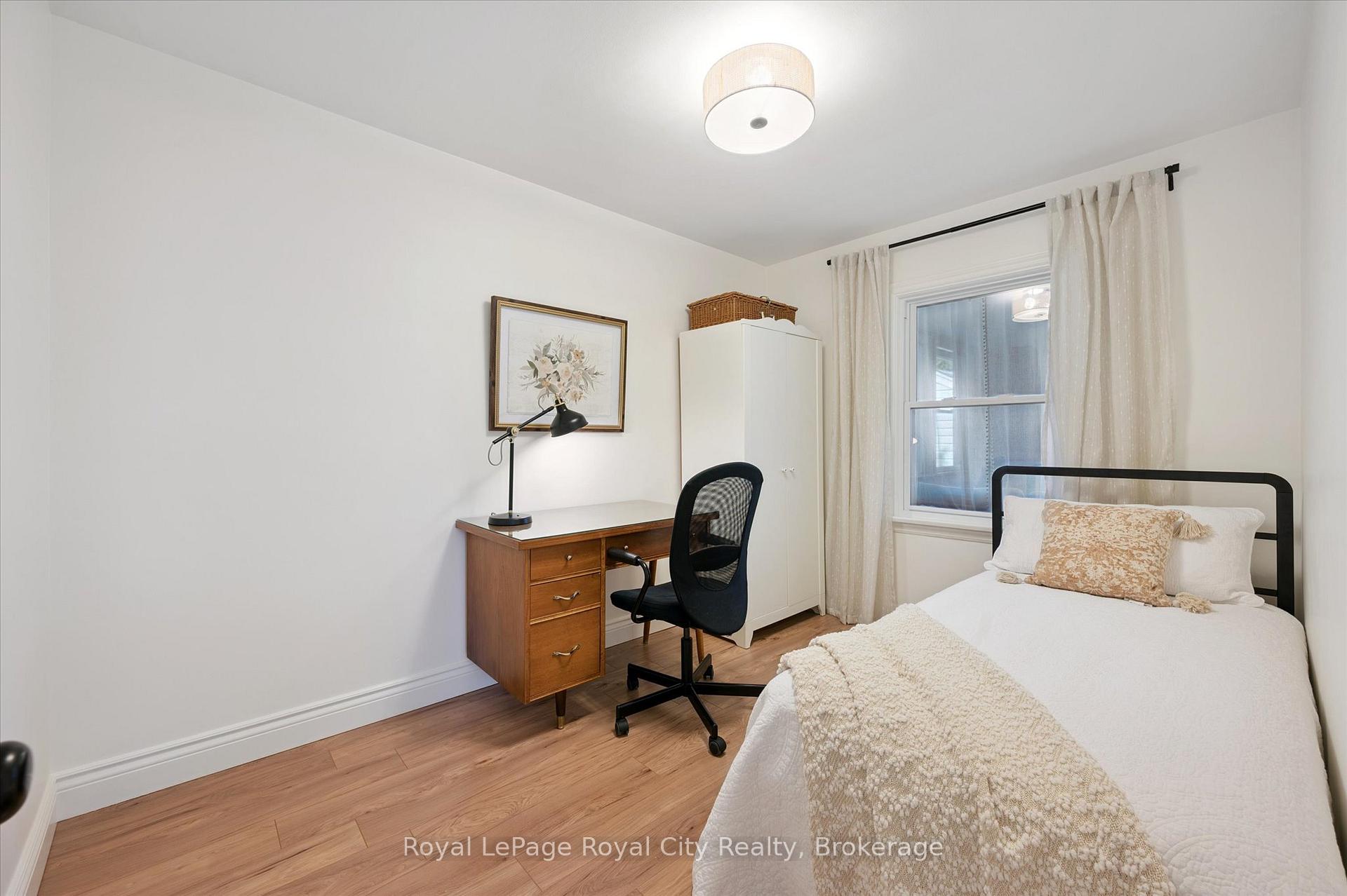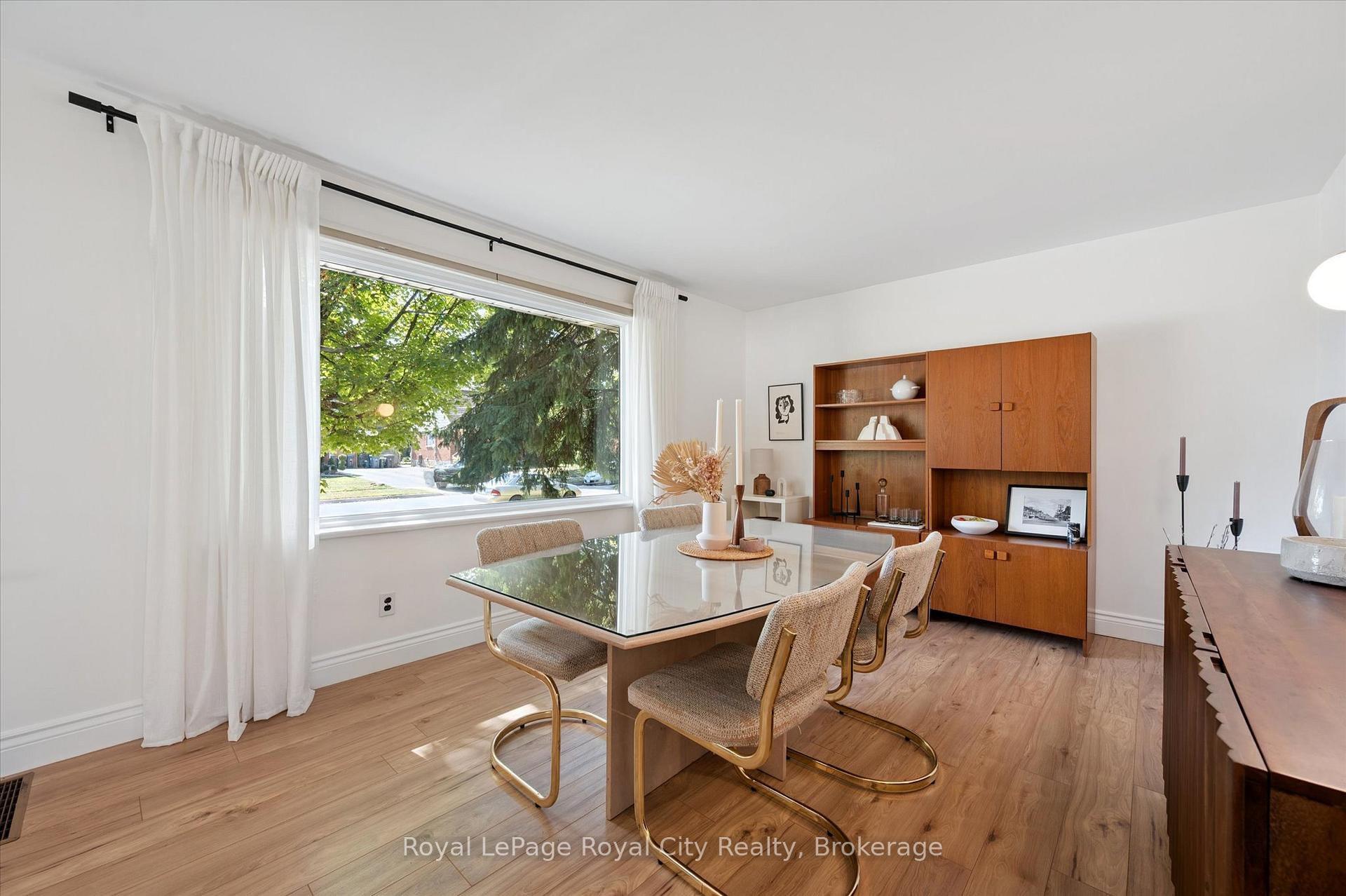 This charming 3-Bedroom, detached 1.5-storey home is located in the desirable St. George Park area of Guelph. The home has been meticulously cared for, w/ tasteful updates & design choices throughout. The spacious kitchen features new stainless steel appliances & matching sink & faucet. A window above the sink allows natural light to fill the space and the cutout between the kitchen & dining/living area keeps you connected with family & guests while preparing meals. This room also has a large front window that frames a picturesque view of the lawn & mature trees. There is a main-floor BDRM (the perfect home office) & just down the hall is an updated 4-piece BATH. The great room addition at the back of the home provides a cozy, sun-filled retreat w/ wraparound windows, pot lights & a corner gas fireplace. Sliding glass doors lead to a covered deck, which opens to a spacious, fully fenced backyard & patio area. There is even a detached workshop (10 ft x 28 ft) equipped w/ cabinets, shelving, lighting, & electrical, offering space for yard equipment, tools, & storage. It could also make an excellent studio. On the second floor, the primary BDRM has ample space for your bed & additional furniture, as well as a closet and large window. There is another well-sized BDRM on this floor with a closet, large window and room for a bed and some furniture. At the top of the stairs, an adorable built-in linen closet provides extra storage. The finished rec room in the basement is perfect for relaxation & entertaining, w/ pot lights, carpeting, built-in shelving, & a built-in bar w/ storage. The laundry area includes a sink, shelving, & extra storage, plus a cold room at the back. The long tandem driveway accommodates 3 cars. Close to great schools, parks, recreation centre, public transit & lots of amenities. Recent Updates: laminate flooring, AC(2025), fridge/stove(2025), dishwasher(2022), water softener(2021), roof ridge cap repair(2024) Don’t miss this fantastic opportunity!