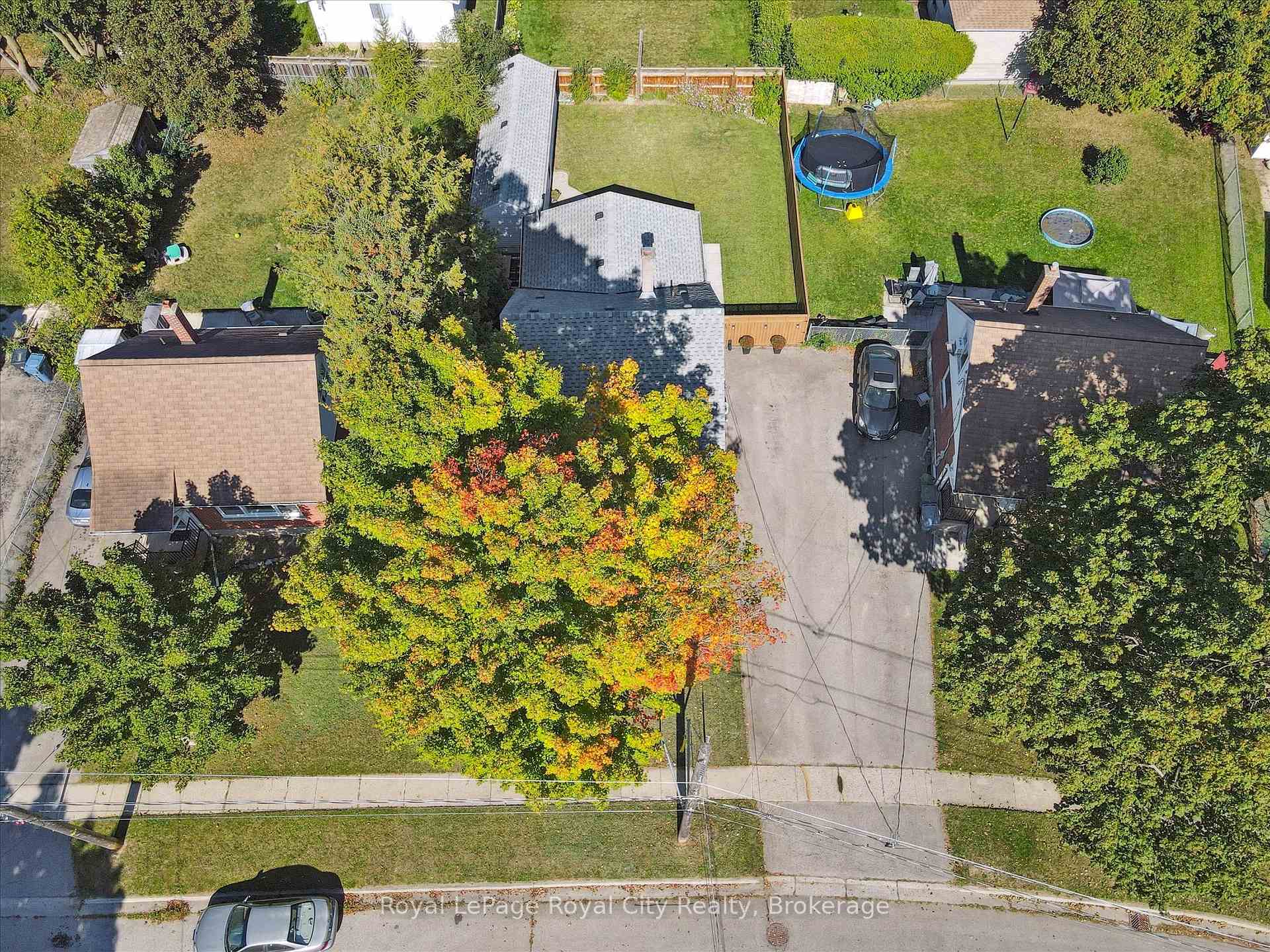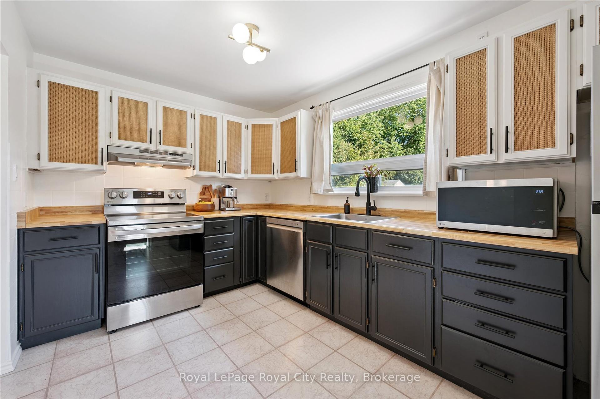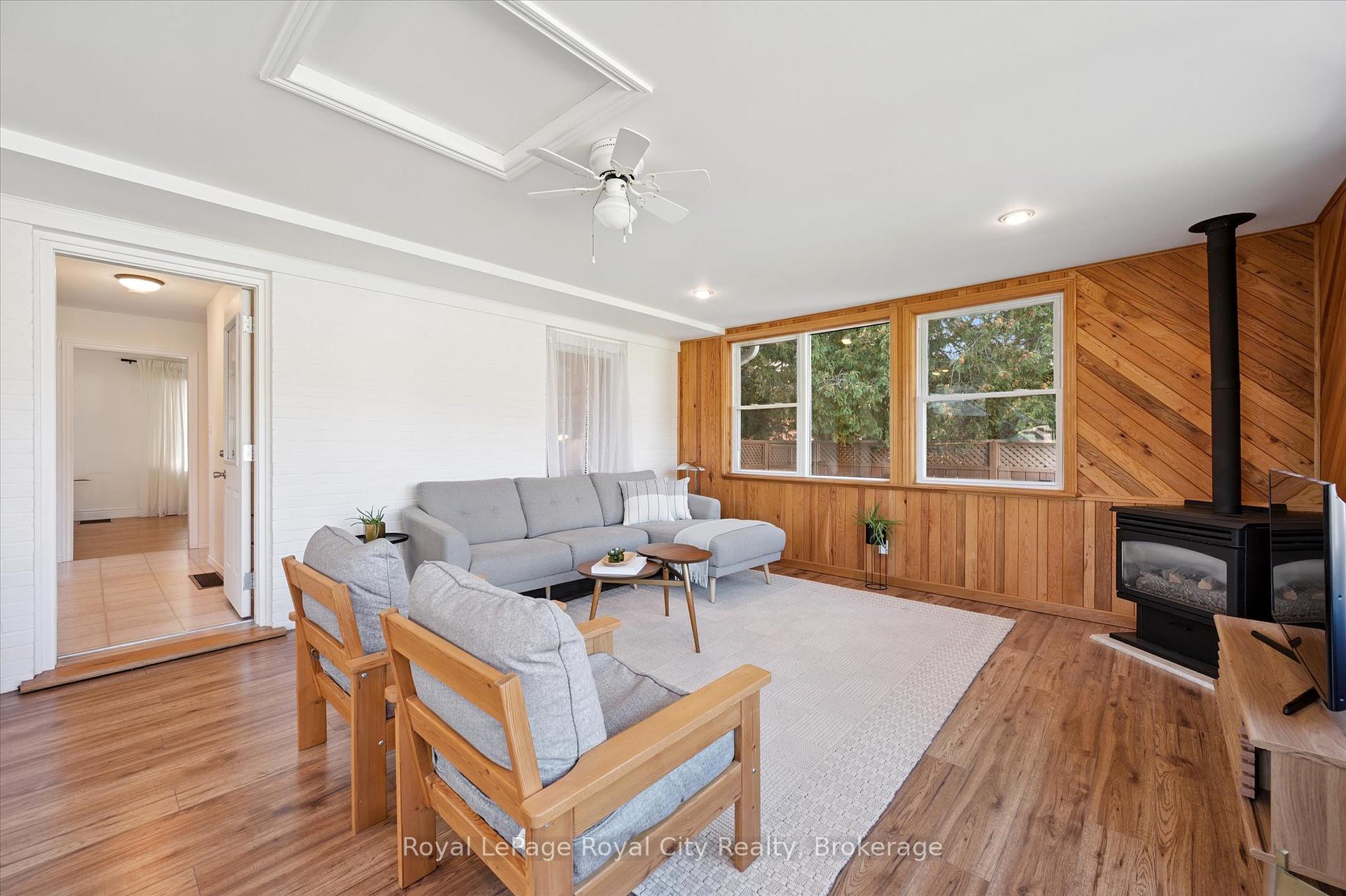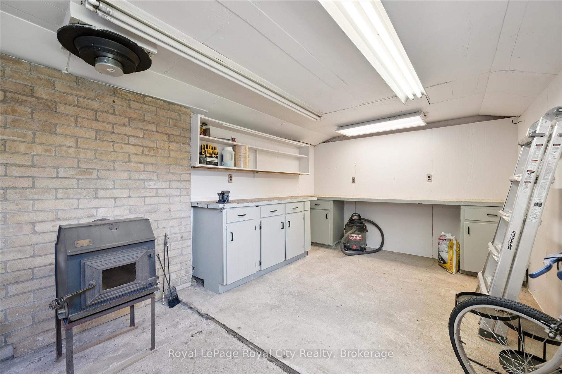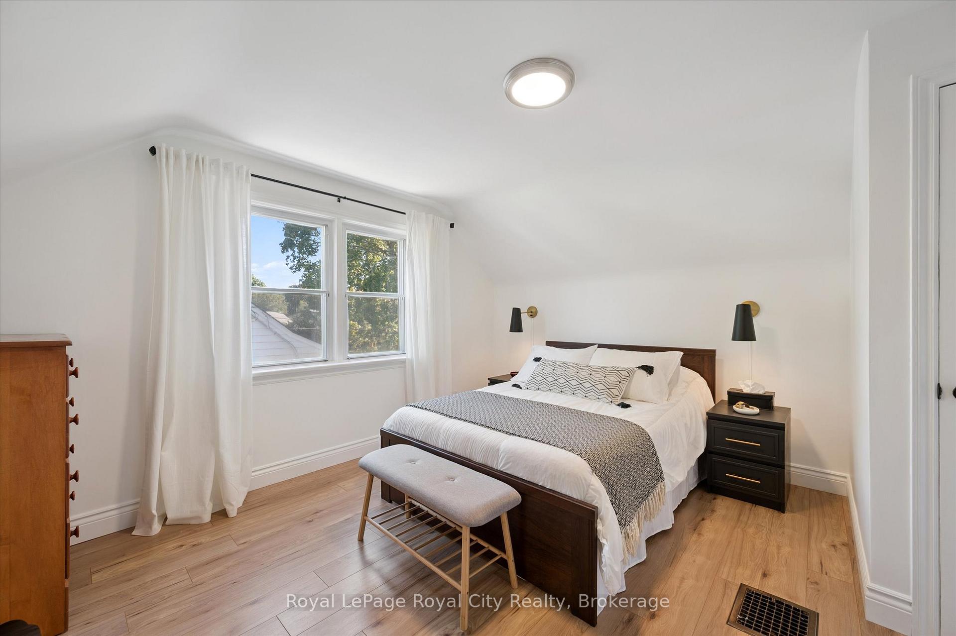 This charming 3-Bedroom, detached 1.5-storey home is located in the desirable St. George Park area of Guelph. The home has been meticulously cared for, w/ tasteful updates & design choices throughout. The spacious kitchen features new stainless steel appliances & matching sink & faucet. A window above the sink allows natural light to fill the space and the cutout between the kitchen & dining/living area keeps you connected with family & guests while preparing meals. This room also has a large front window that frames a picturesque view of the lawn & mature trees. There is a main-floor BDRM (the perfect home office) & just down the hall is an updated 4-piece BATH. The great room addition at the back of the home provides a cozy, sun-filled retreat w/ wraparound windows, pot lights & a corner gas fireplace. Sliding glass doors lead to a covered deck, which opens to a spacious, fully fenced backyard & patio area. There is even a detached workshop (10 ft x 28 ft) equipped w/ cabinets, shelving, lighting, & electrical, offering space for yard equipment, tools, & storage. It could also make an excellent studio. On the second floor, the primary BDRM has ample space for your bed & additional furniture, as well as a closet and large window. There is another well-sized BDRM on this floor with a closet, large window and room for a bed and some furniture. At the top of the stairs, an adorable built-in linen closet provides extra storage. The finished rec room in the basement is perfect for relaxation & entertaining, w/ pot lights, carpeting, built-in shelving, & a built-in bar w/ storage. The laundry area includes a sink, shelving, & extra storage, plus a cold room at the back. The long tandem driveway accommodates 3 cars. Close to great schools, parks, recreation centre, public transit & lots of amenities. Recent Updates: laminate flooring, AC(2025), fridge/stove(2025), dishwasher(2022), water softener(2021), roof ridge cap repair(2024) Don’t miss this fantastic opportunity!
