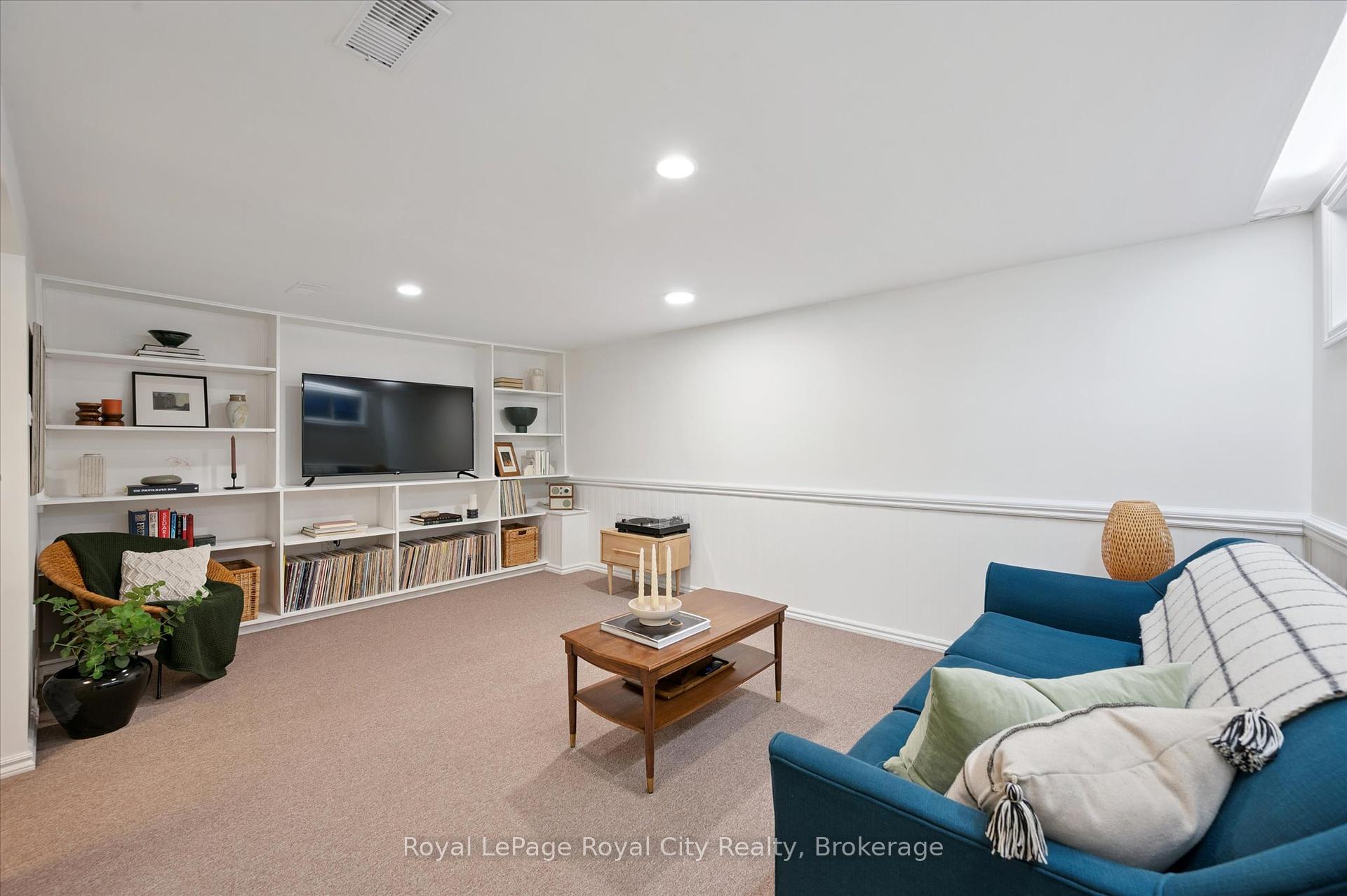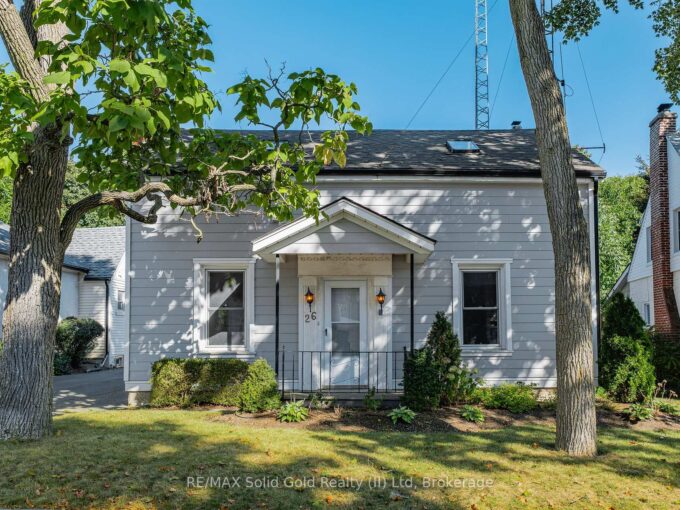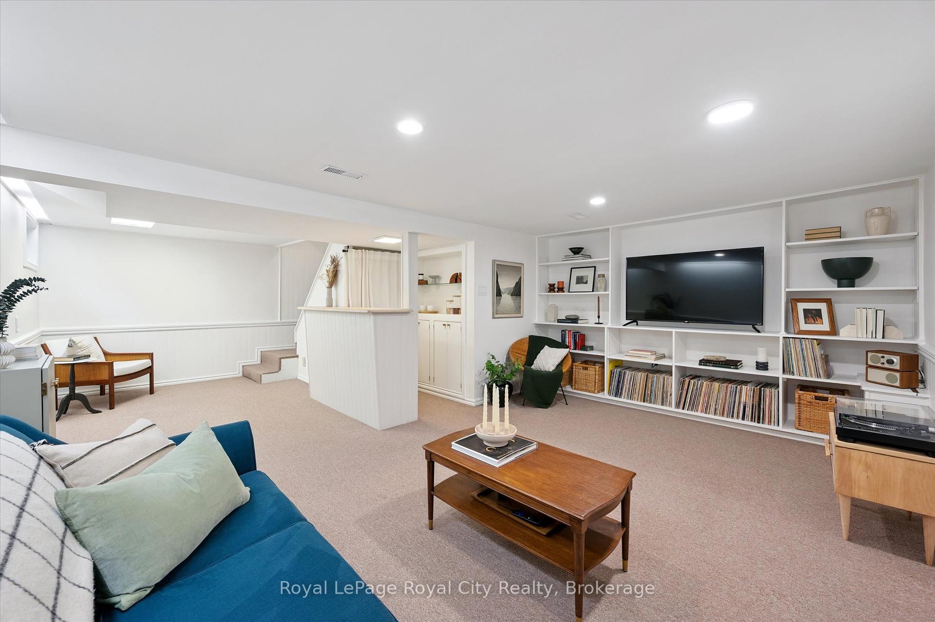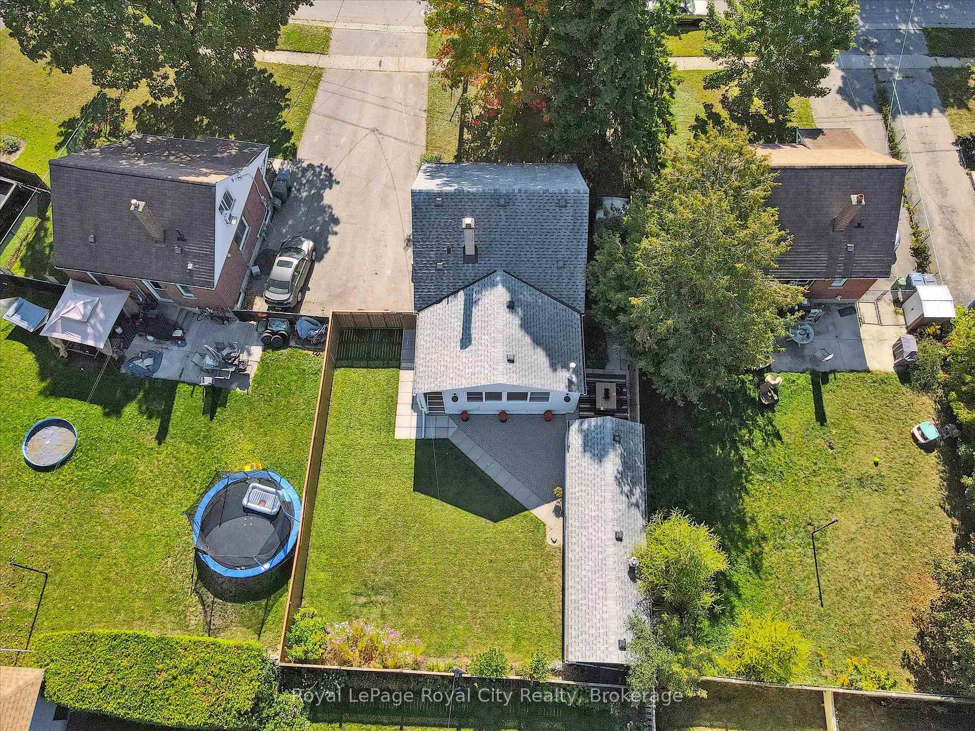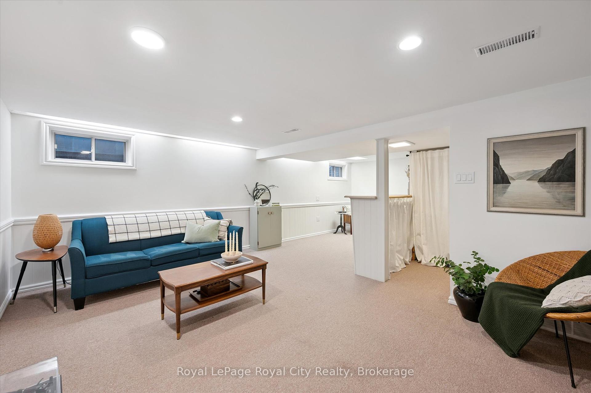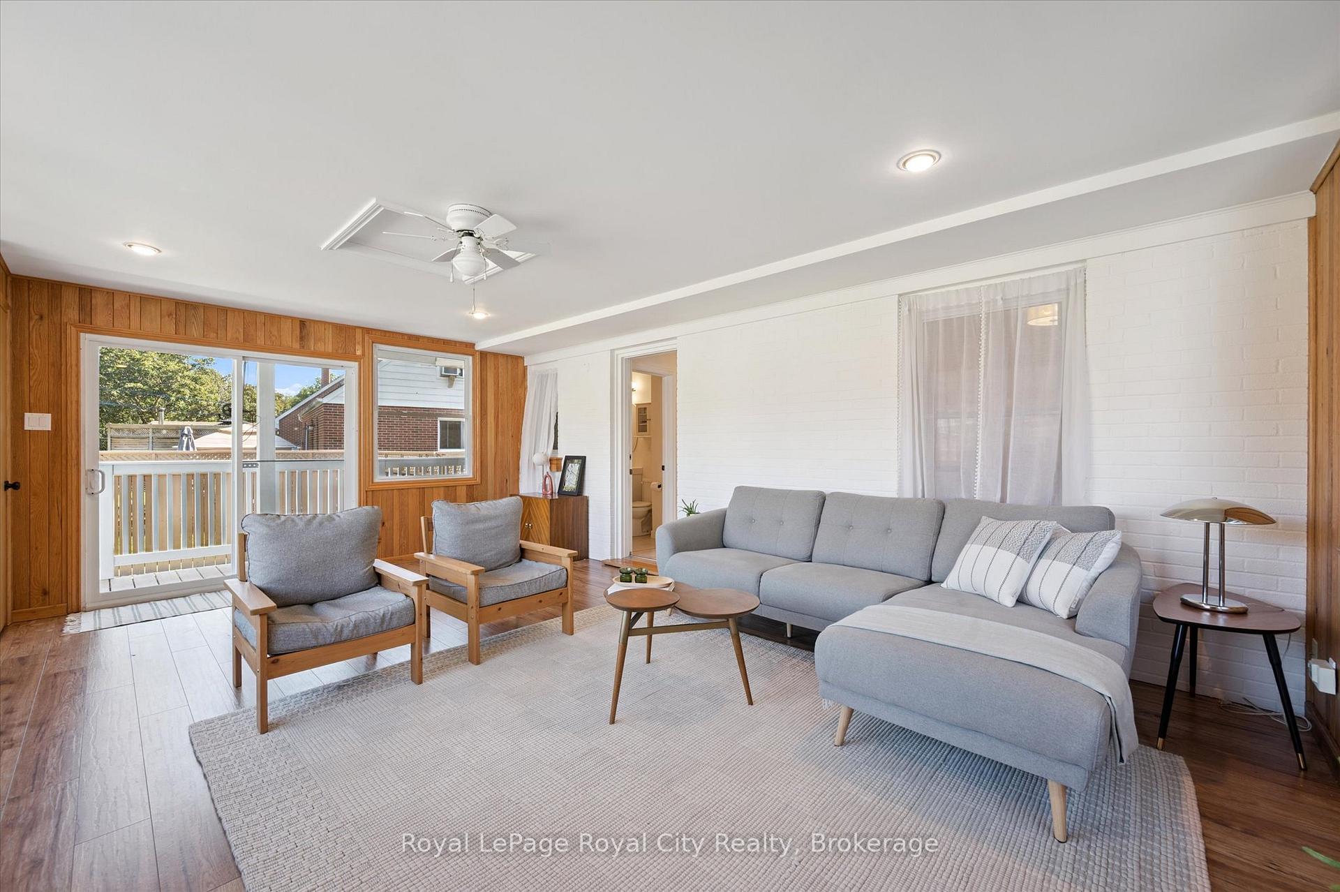 This charming 3-Bedroom, detached 1.5-storey home is located in the desirable St. George Park area of Guelph. The home has been meticulously cared for, w/ tasteful updates & design choices throughout. The spacious kitchen features new stainless steel appliances & matching sink & faucet. A window above the sink allows natural light to fill the space and the cutout between the kitchen & dining/living area keeps you connected with family & guests while preparing meals. This room also has a large front window that frames a picturesque view of the lawn & mature trees. There is a main-floor BDRM (the perfect home office) & just down the hall is an updated 4-piece BATH. The great room addition at the back of the home provides a cozy, sun-filled retreat w/ wraparound windows, pot lights & a corner gas fireplace. Sliding glass doors lead to a covered deck, which opens to a spacious, fully fenced backyard & patio area. There is even a detached workshop (10 ft x 28 ft) equipped w/ cabinets, shelving, lighting, & electrical, offering space for yard equipment, tools, & storage. It could also make an excellent studio. On the second floor, the primary BDRM has ample space for your bed & additional furniture, as well as a closet and large window. There is another well-sized BDRM on this floor with a closet, large window and room for a bed and some furniture. At the top of the stairs, an adorable built-in linen closet provides extra storage. The finished rec room in the basement is perfect for relaxation & entertaining, w/ pot lights, carpeting, built-in shelving, & a built-in bar w/ storage. The laundry area includes a sink, shelving, & extra storage, plus a cold room at the back. The long tandem driveway accommodates 3 cars. Close to great schools, parks, recreation centre, public transit & lots of amenities. Recent Updates: laminate flooring, AC(2025), fridge/stove(2025), dishwasher(2022), water softener(2021), roof ridge cap repair(2024) Don’t miss this fantastic opportunity!