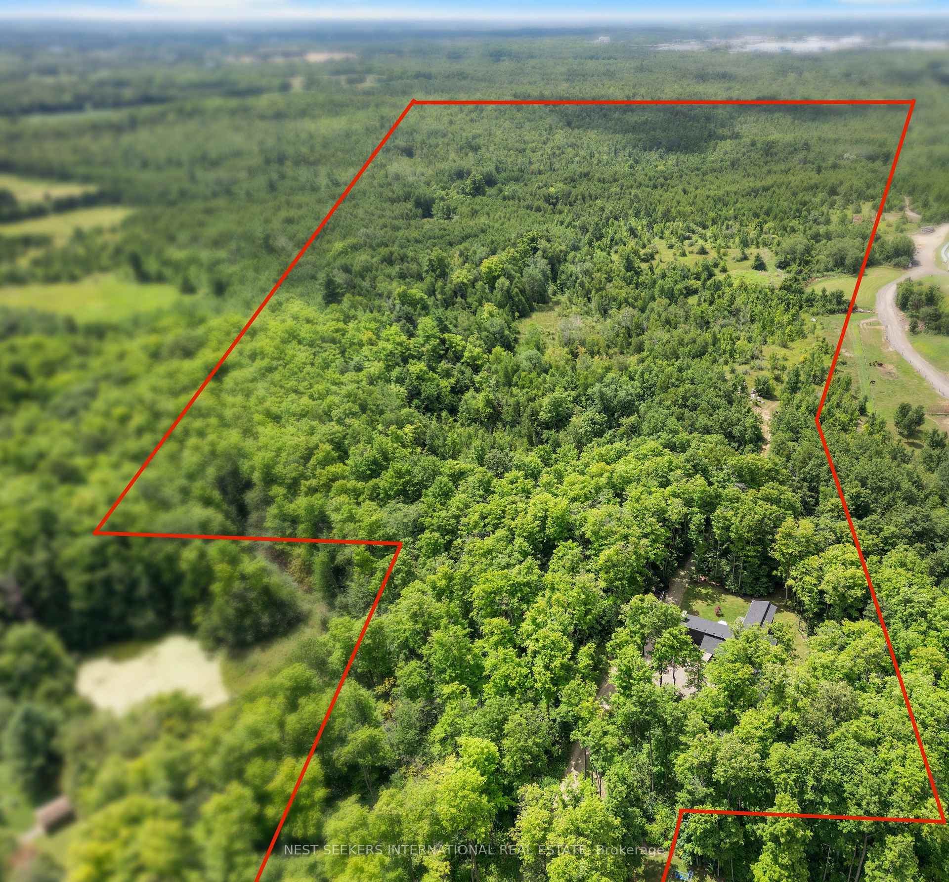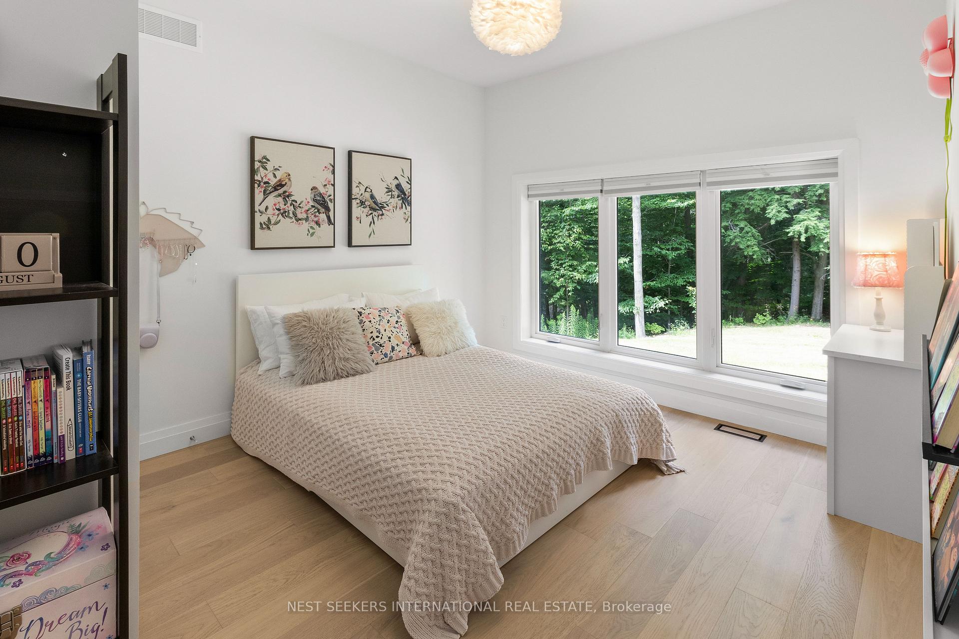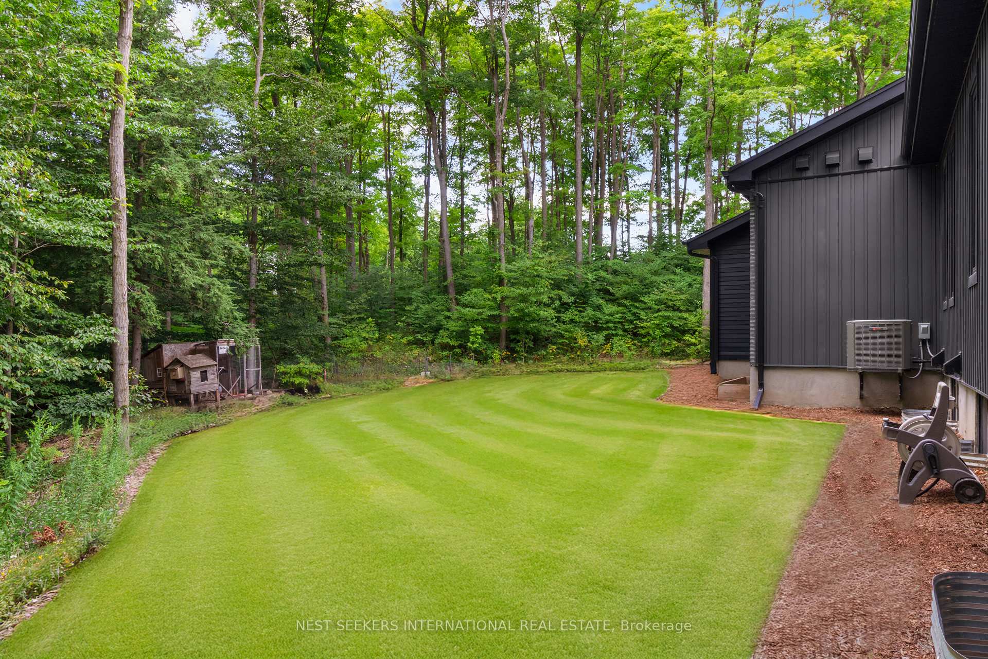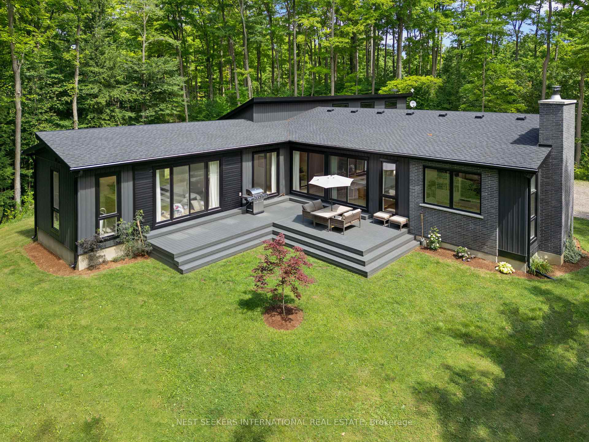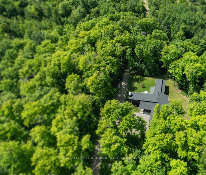 45 acres. Pure privacy. Scandinavian-inspired elegance. Just 10 minutes from Guelph, Milton & the 401 lies a custom 2021-built bungalow with nearly 3,000 SF of finished living space, in-law and income potential, and Tarion warranty protection accessed by a private laneway. Step inside and you are greeted by a proper foyer, mudroom with built-in bench and storage, then soaring 14 ft. vaulted ceilings and floor-to-ceiling windows that flood the home with woodland views. A sunken living room anchored by a wood-burning fireplace meets engineered oak floors and custom maple cabinetry, while the chefs kitchen shines with built-in appliances, quartz slab backsplashes, a paneled fridge, oversized island with extensive storage, and separate work-desk station. The primary ensuite is a retreat with double sinks, volcanic limestone tub, curbless dual shower, and a private water closet. Two more bedrooms share a spa-like 6-piece bath & a flex-space and powder room complete this floor. Downstairs, find in-law or guest suite capability with sound-proofing, bedroom, bath, office, and roughed-in kitchen plumbing plus 800 sq. ft. unfinished for your vision. Outdoors, the lifestyle is unmatched: fresh water from your own private well, kilometres of private trails, chicken coop, vegetable garden, fire-pit, and multiple entertaining spaces including a composite deck and covered aggregate porch – PLUS a bunkie with its own firepit and outhouse a short ATV ride away. Agriculturally zoned with Managed Forestry Program benefits, you enjoy remarkably low taxes. An oversized garage stores vehicles and recreational toys alike, while a full air exchange and UV water and filtration system elevate comfort. Be a part of the family-focused hamlet of Aberfoyle that has an excellent school, library, sports park and plenty of yearly events to gather the community. The kind of place where the world disappears the second you arrive, space for a pool & endless potential to create the ultimate paradise.