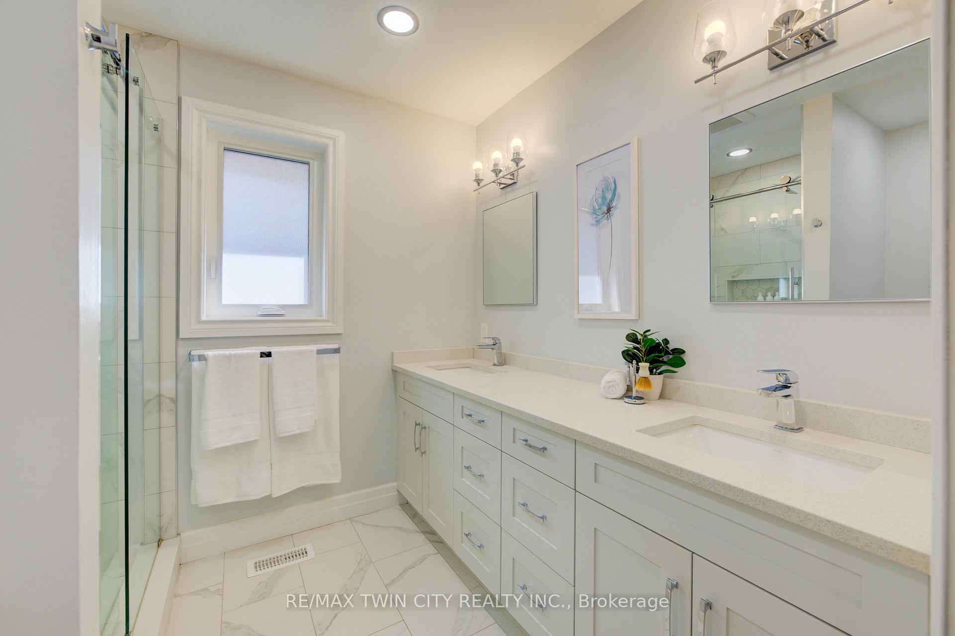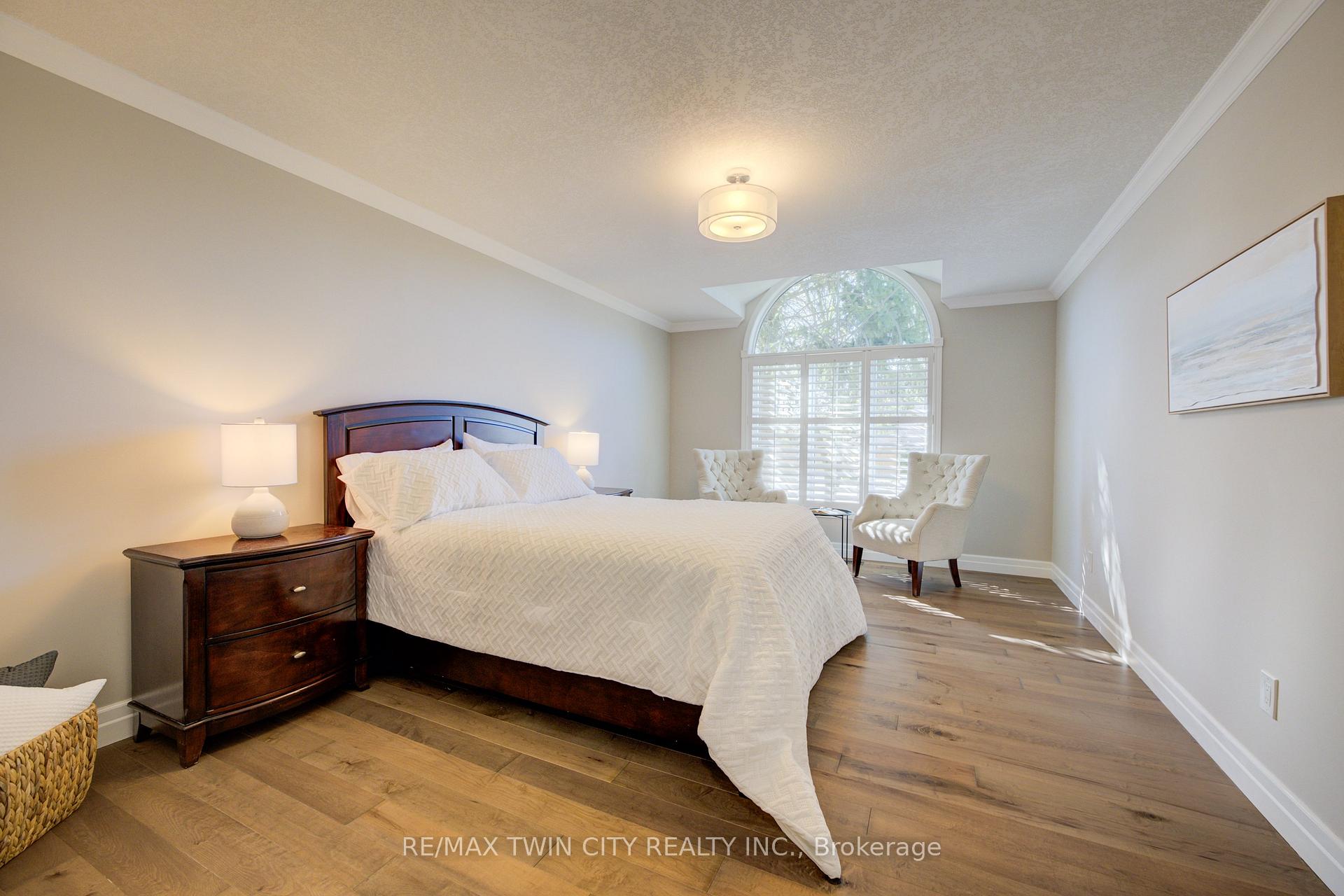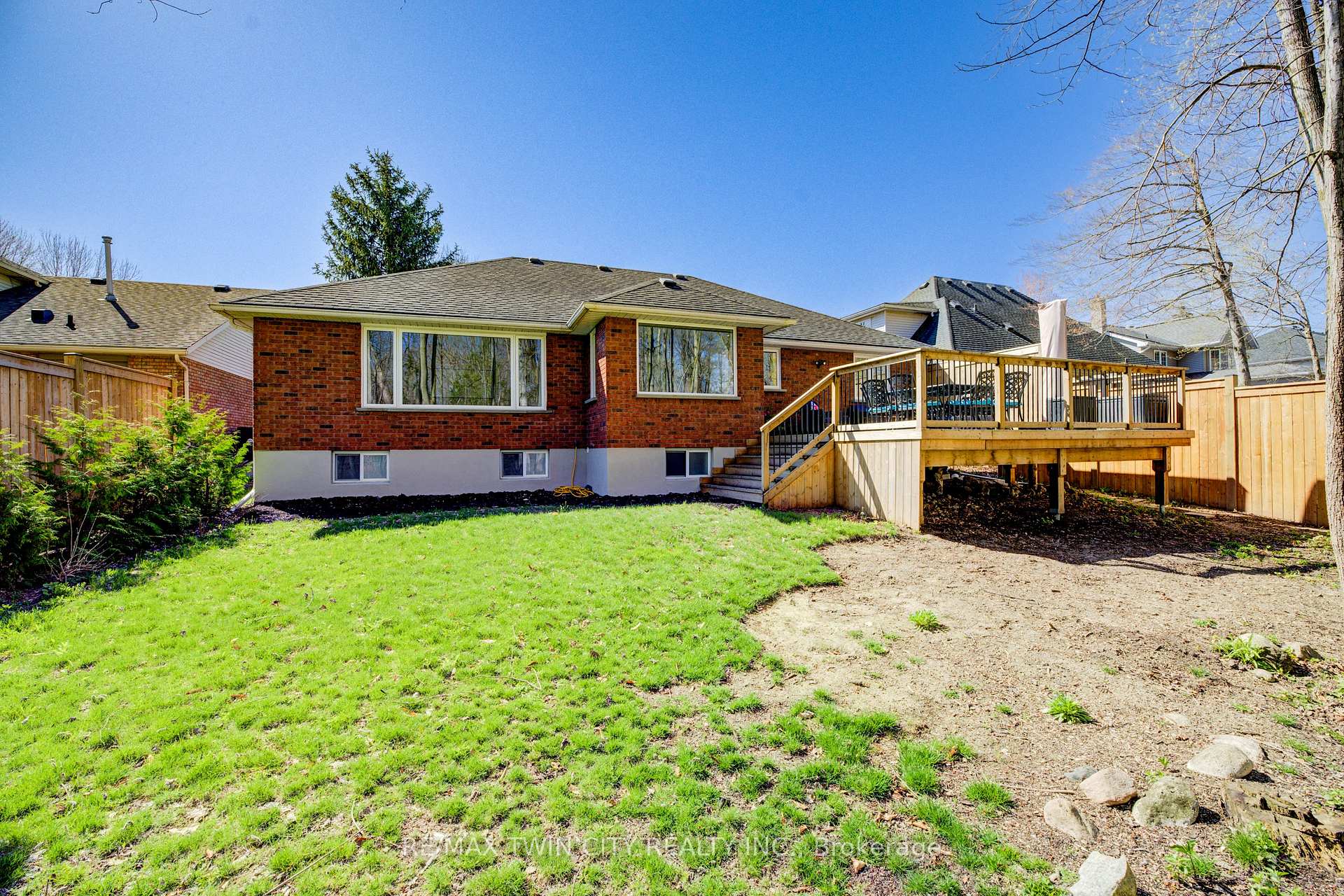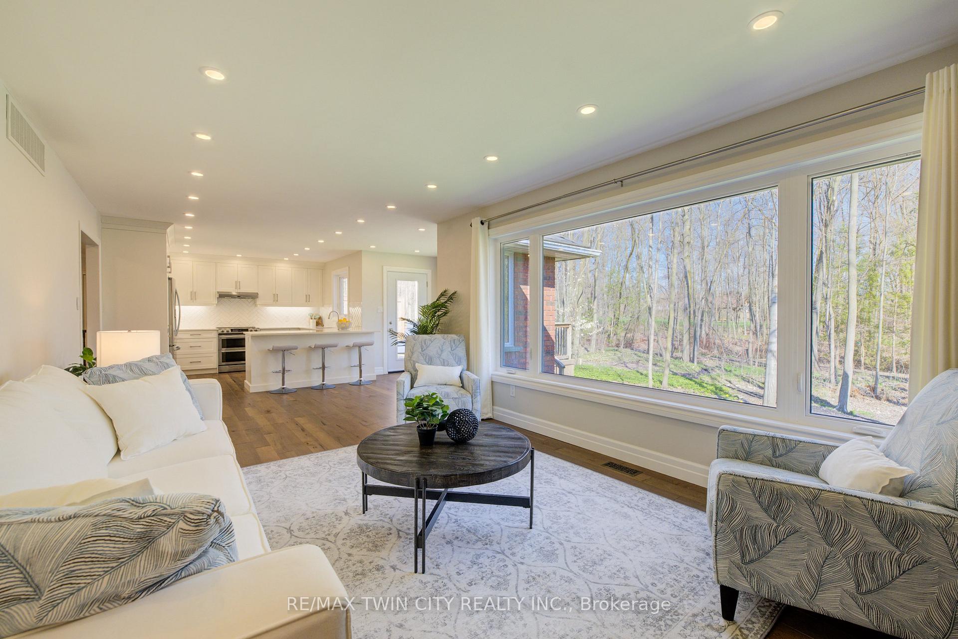 Rare Opportunity Bungalow With Over 3,000 Sq Ft of Living Space in the Desirable North Lakeshore neighbourhood that Backs onto Gorgeous Greenspace. Beautiful Hardwood throughout the Main Floor. Updated Spacious Kitchen includes Quartz Counters, Stainless Steel Appliances and a Large Pantry Cupboard. Living Room Features a Stunning Gas Fireplace and Beautiful Views. From the Eat-In Area You can Access a Large Deck Where You can Enjoy Nature in Your Own Backyard! The Dining Room is Separate. Large Main Bedroom has a Lovely Arch Window, Walk-in Closet and Updated 4 pc Ensuite with Double Sinks and Walk-In Shower. Main Floor also has Powder Room, 2 Large Bedrooms and a 4 pc Bath. Lower level is Newly Carpeted with a Big Bedroom and Updated 3 pc Bathroom. Huge Family Room is Full of Possibilities. Laundry Room has Handy 2nd Staircase to the 2 Car Garage. Walk or Bike on the trail behind Your House to St. Jacobs Market. This is Cottage Living in the City!!