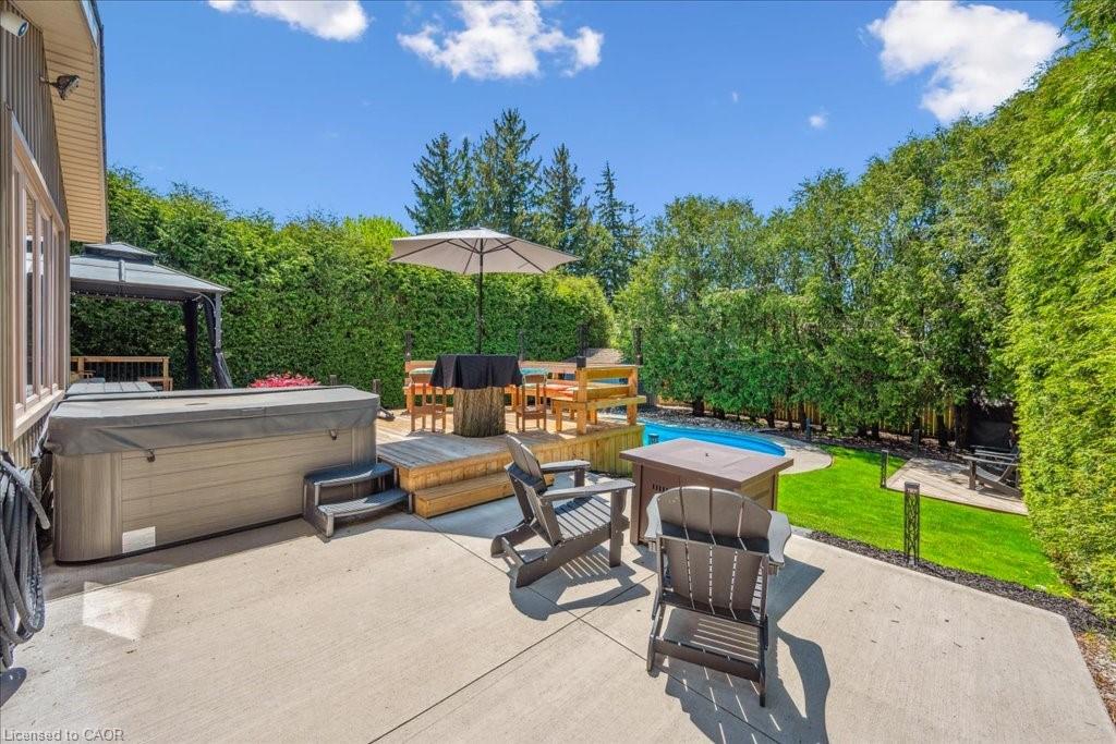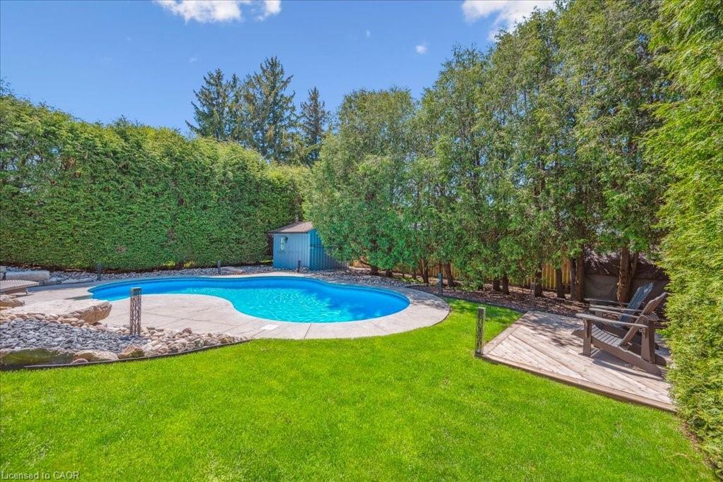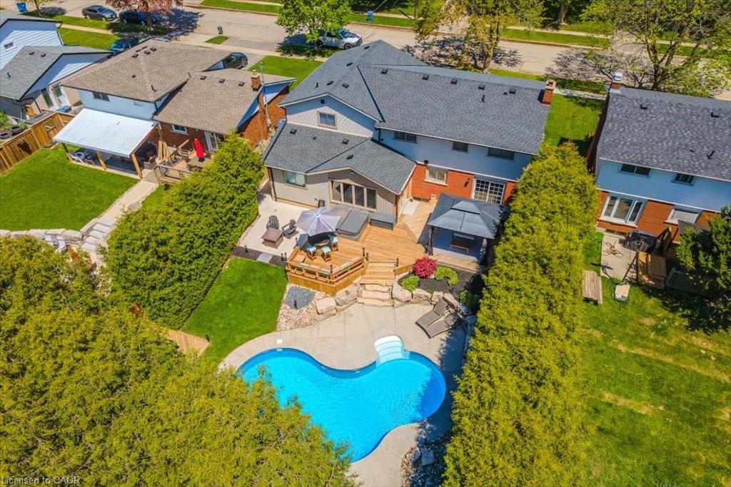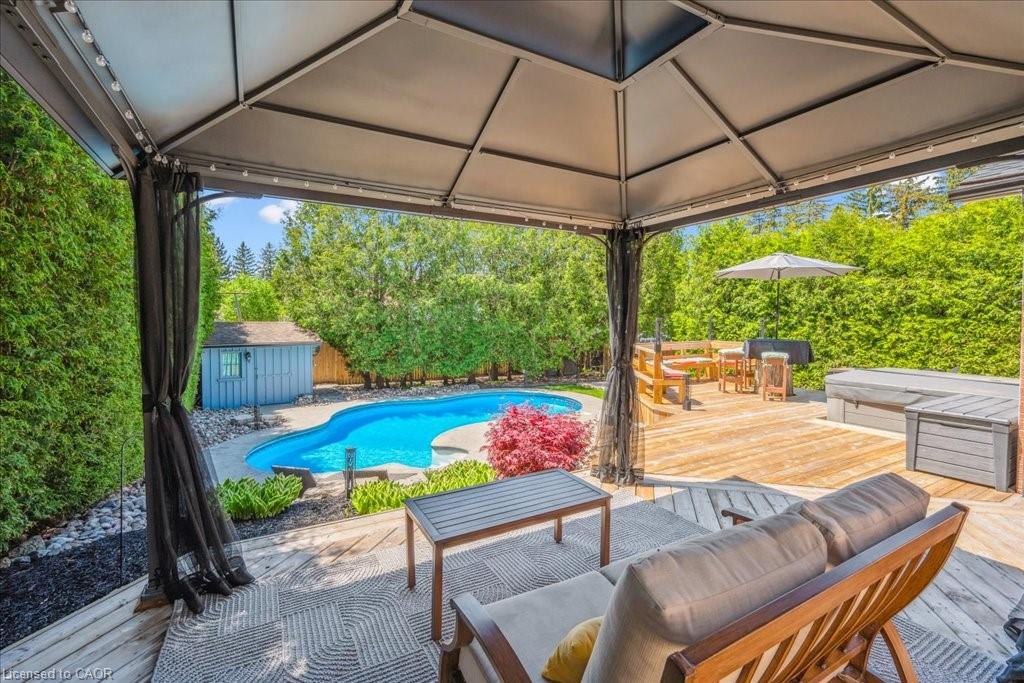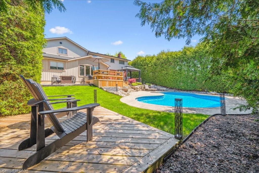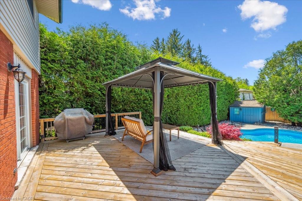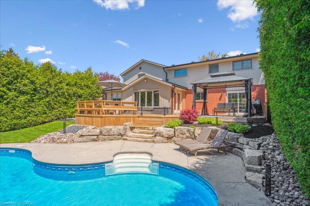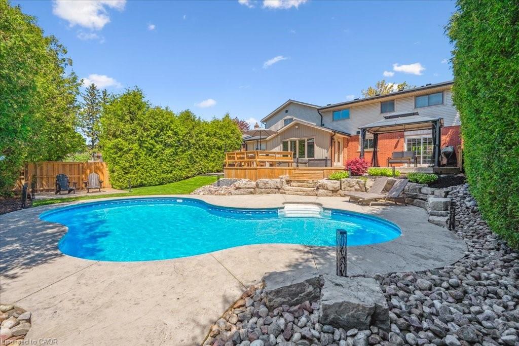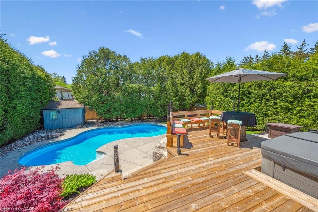 Welcome to Your Private Paradise in East Guelph! Tucked away in a beautiful, mature, and quiet neighbourhood, this exceptional 4+1 bedroom, 3-bathroom home offers over 2,500 sq ft of well-designed living space – inside and out. The backyard oasis is truly something special. Surrounded by tall trees for complete privacy, it features a heated in-ground saltwater pool, hot tub, a fully lit deck, elegant stone patio, fire pit lounge with privacy fencing, and a pool house/storage shed. Whether you’re hosting or relaxing solo, this space delivers. Inside, the heart of the home is a custom Barzotti kitchen, paired with new premium stainless steel appliances – a standout combination of craftsmanship and functionality. The main floor also offers a formal living and dining room, a cozy family room with backyard views, two walkouts, and LED lighting throughout. Upstairs, you’ll find four generous bedrooms and a bright upper-level laundry room. The primary suite features a spa-like ensuite with an air tub, walk-in closets, and custom cabinetry. The finished basement includes a gas fire place, large rec room, and a dedicated craft room, plus ample storage. The double garage is wired for a workshop with multiple 250V outlets perfect for serious projects and EV chargers. Additional highlights include: Barzotti cabinetry and granite counters. Newer pool liner. Newer roof. Carpet free – except for stairs. New window treatments. New entry doors and insulated garage door. Finished garage interior with new epoxy flooring. Upgraded attic insulation. Closet built-ins. Owned previously by a well-known home inspector and electrician. Plus much more! Easy access to Guelph Lake, sports facilities, parks, trails, schools, and all major amenities. This home has been thoughtfully upgraded with quality you can feel and trust! Book your private showing today. This isn’t just a home – its a lifestyle.