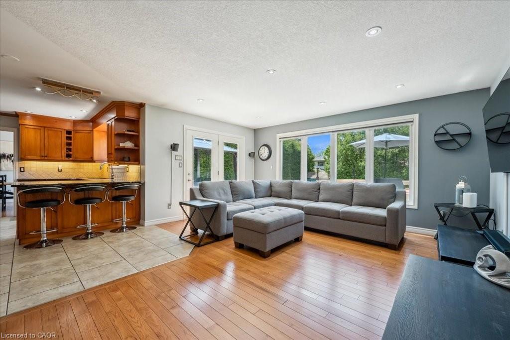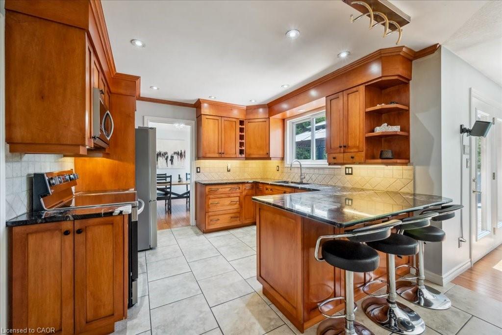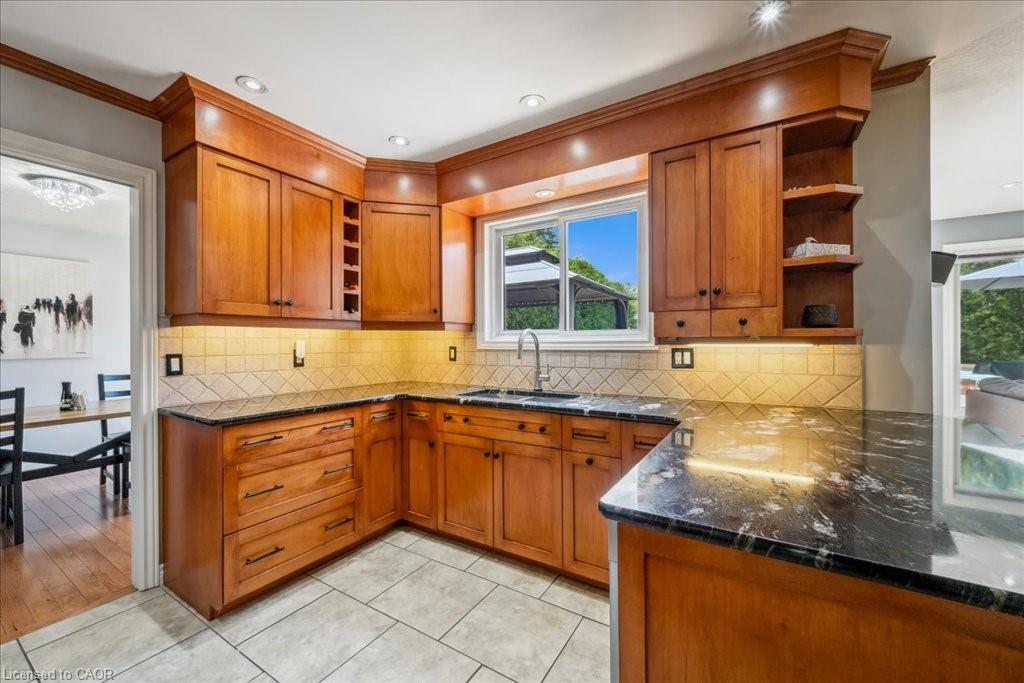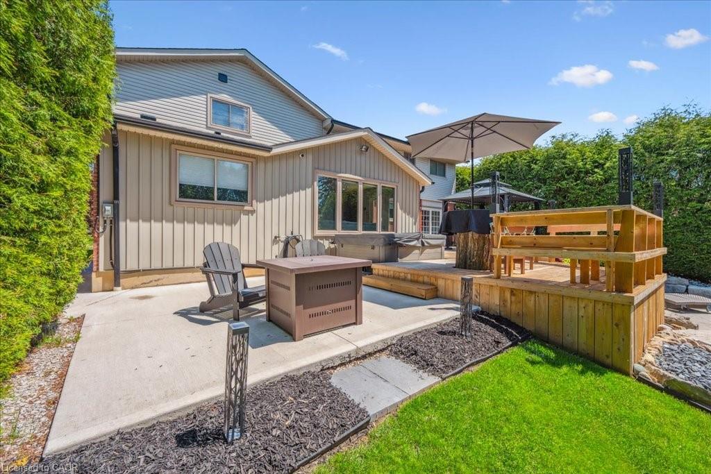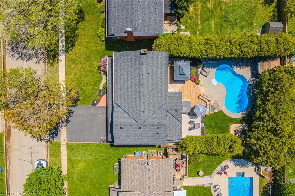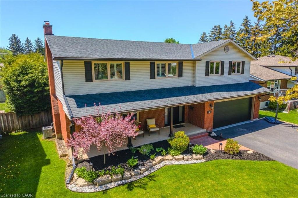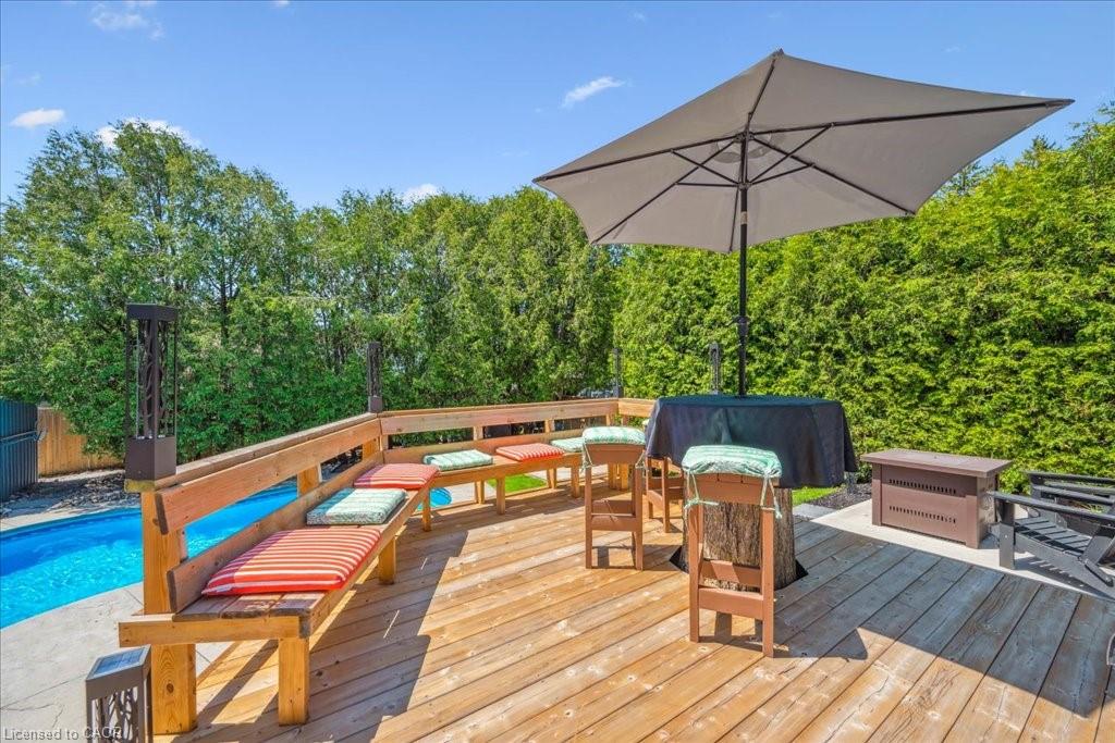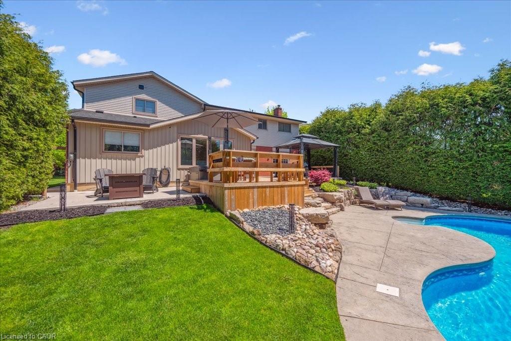 Welcome to Your Private Paradise in East Guelph! Tucked away in a beautiful, mature, and quiet neighbourhood, this exceptional 4+1 bedroom, 3-bathroom home offers over 2,500 sq ft of well-designed living space – inside and out. The backyard oasis is truly something special. Surrounded by tall trees for complete privacy, it features a heated in-ground saltwater pool, hot tub, a fully lit deck, elegant stone patio, fire pit lounge with privacy fencing, and a pool house/storage shed. Whether you’re hosting or relaxing solo, this space delivers. Inside, the heart of the home is a custom Barzotti kitchen, paired with new premium stainless steel appliances – a standout combination of craftsmanship and functionality. The main floor also offers a formal living and dining room, a cozy family room with backyard views, two walkouts, and LED lighting throughout. Upstairs, you’ll find four generous bedrooms and a bright upper-level laundry room. The primary suite features a spa-like ensuite with an air tub, walk-in closets, and custom cabinetry. The finished basement includes a gas fire place, large rec room, and a dedicated craft room, plus ample storage. The double garage is wired for a workshop with multiple 250V outlets perfect for serious projects and EV chargers. Additional highlights include: Barzotti cabinetry and granite counters. Newer pool liner. Newer roof. Carpet free – except for stairs. New window treatments. New entry doors and insulated garage door. Finished garage interior with new epoxy flooring. Upgraded attic insulation. Closet built-ins. Owned previously by a well-known home inspector and electrician. Plus much more! Easy access to Guelph Lake, sports facilities, parks, trails, schools, and all major amenities. This home has been thoughtfully upgraded with quality you can feel and trust! Book your private showing today. This isn’t just a home – its a lifestyle.