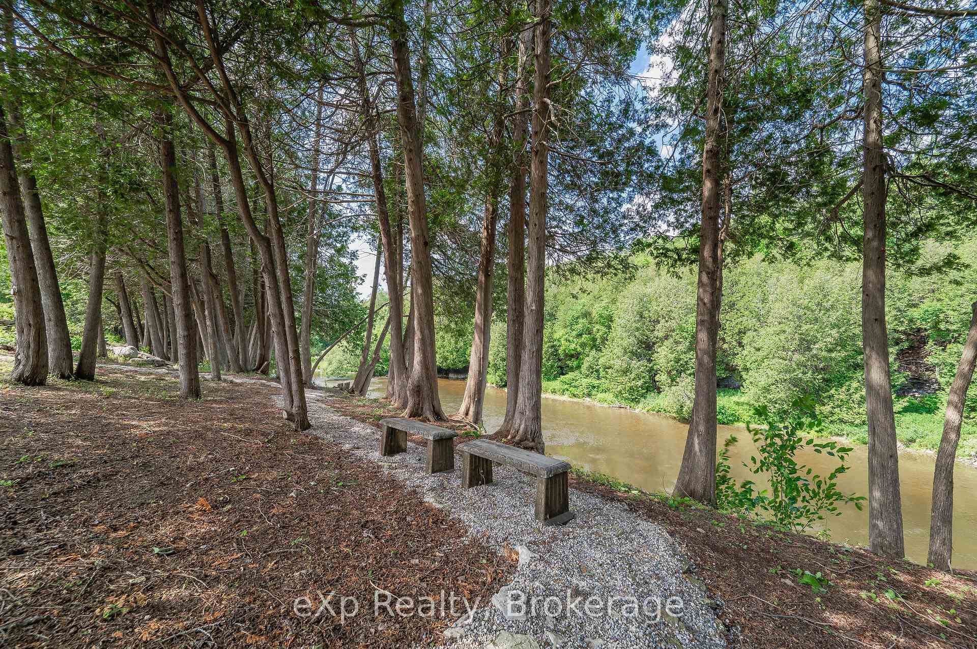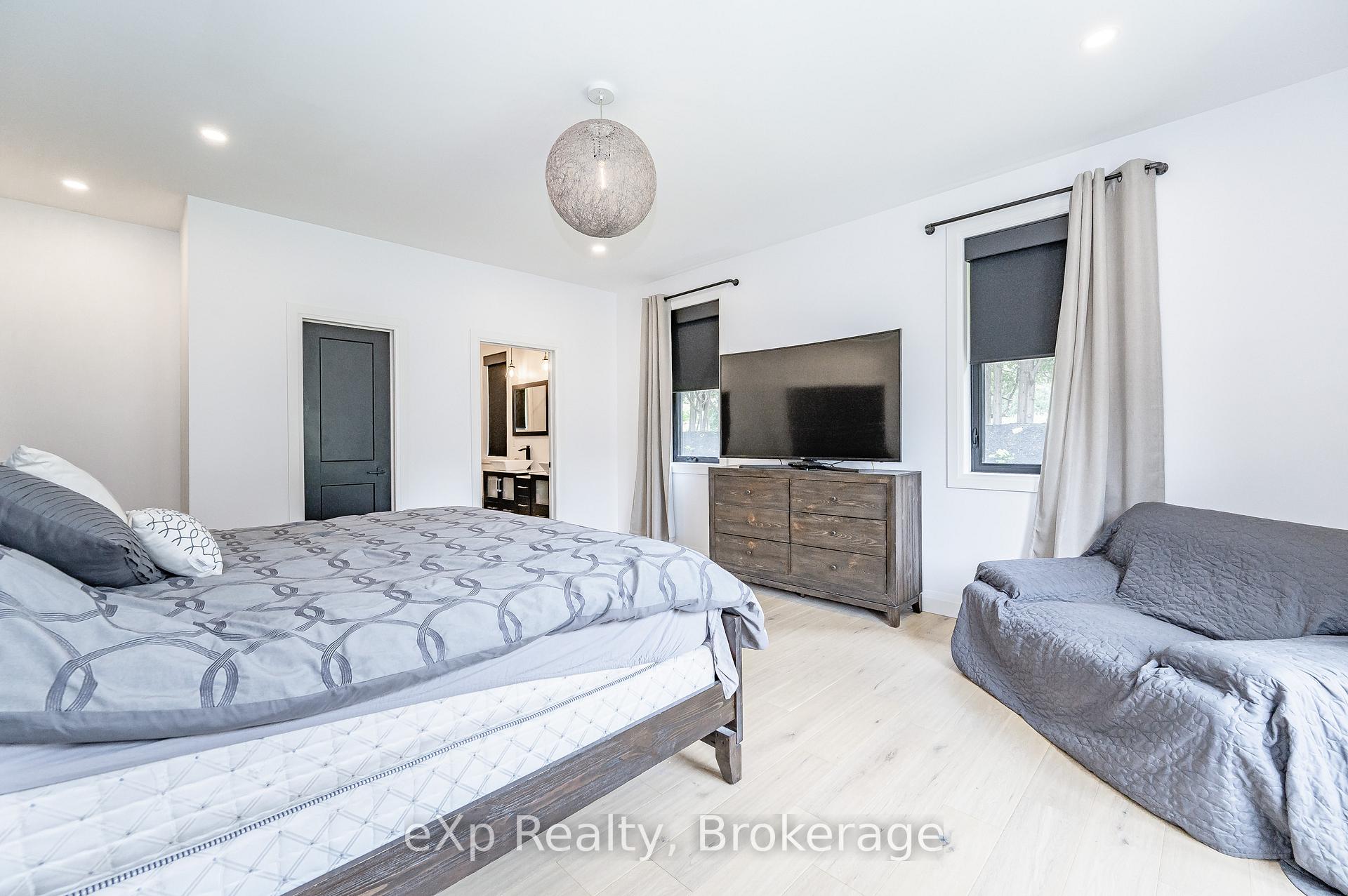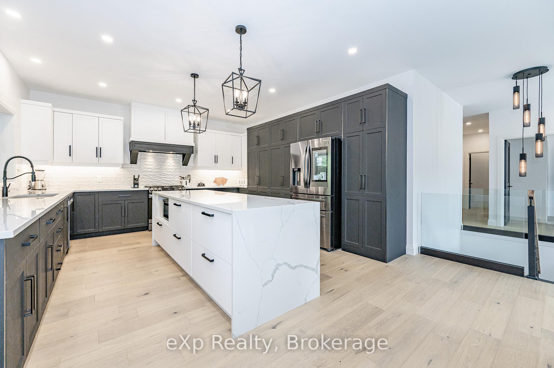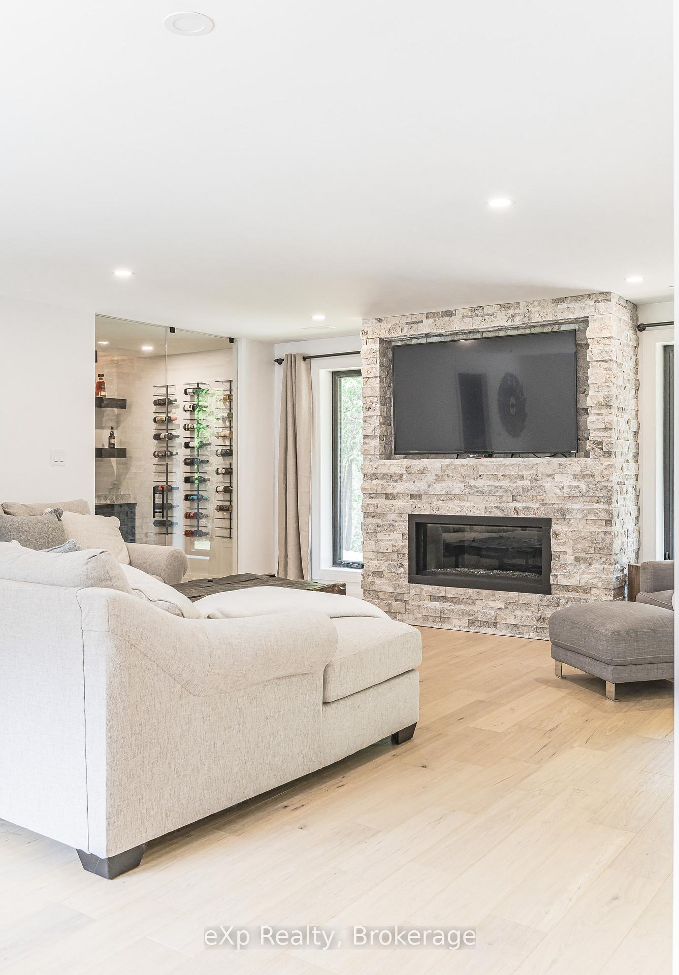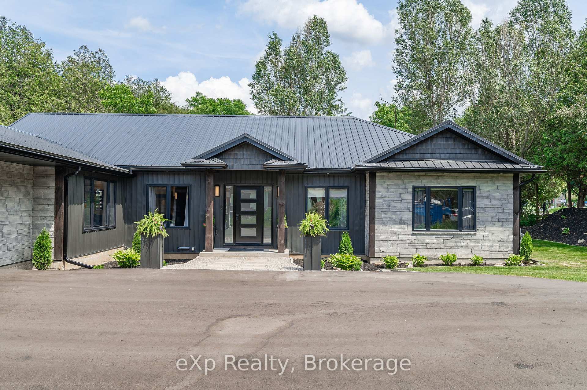 Set along the Grand River on one of Elora’s most desirable roads, this exceptional bungalow offers refined design, meticulous care, and peaceful riverside living. With over 3,850 square feet of finished space, this 5-bedroom home showcases quality craftsmanship and thoughtful upgrades throughout. The manicured property features a private, tree-lined backdrop with captivating river views, a wide asphalt driveway, and an oversized 3-car garage with epoxy flooring and separated third bay. Inside, the open-concept design is bright and elegant with engineered hardwood, large windows, and a beautifully appointed kitchen featuring high-end appliances, granite counters, a 9-foot waterfall island, and a hidden walk-in pantry with a second fridge and coffee bar. The dining and family rooms flow seamlessly beside a glass-enclosed wine cellar. The main level includes a mudroom with walk-in storage, a 3-piece bath, laundry room, and three spacious bedrooms. The primary suite offers a walk-in closet and a luxurious ensuite with heated floors, curbless shower, and freestanding tub. The finished lower level features heated floors, 9-foot ceilings, two bedrooms, a recreation area, and a 3-piece bath. Outdoor living includes a covered porch, composite deck, gas BBQ hookup, bocce court, fire pit, and stunning river views. Additional highlights include a new well with continuous pressure system, water softener with iron filter, on-demand boiler, CAT5 wiring, and full spray-foam insulation.