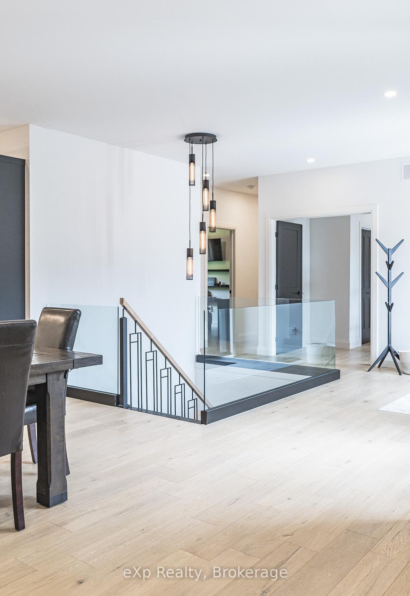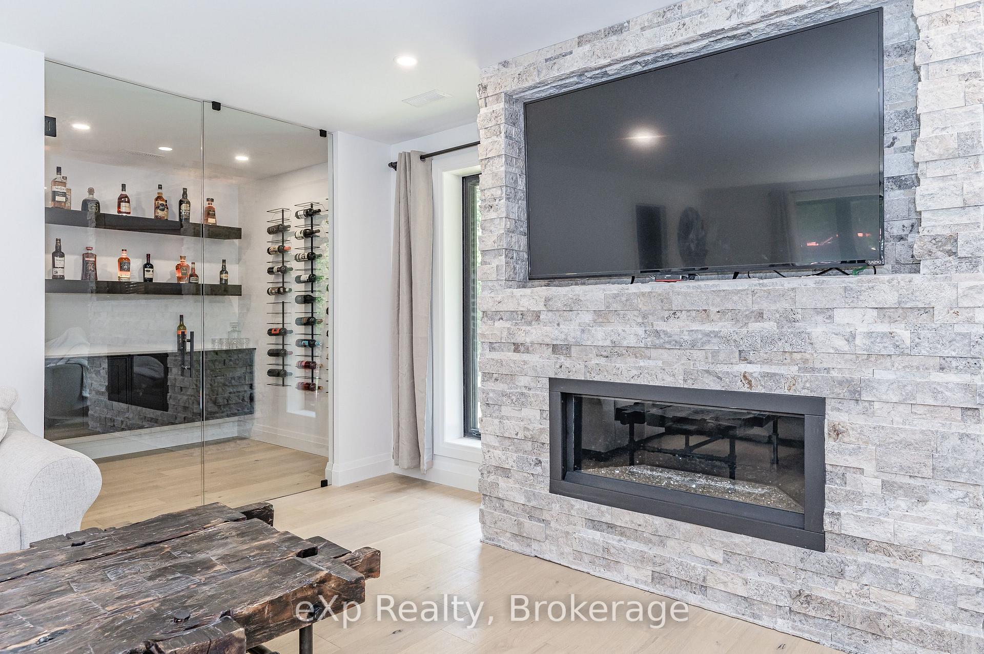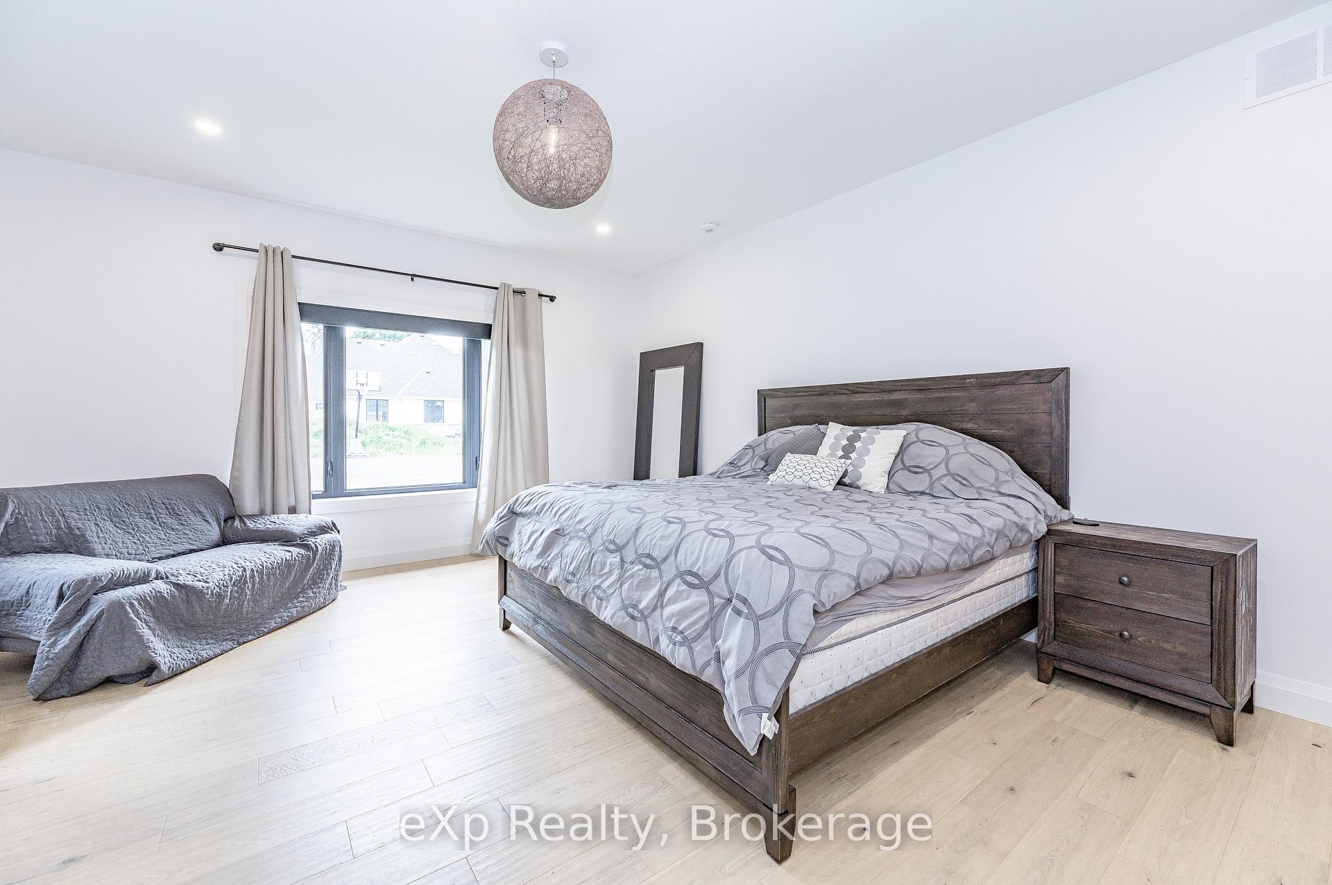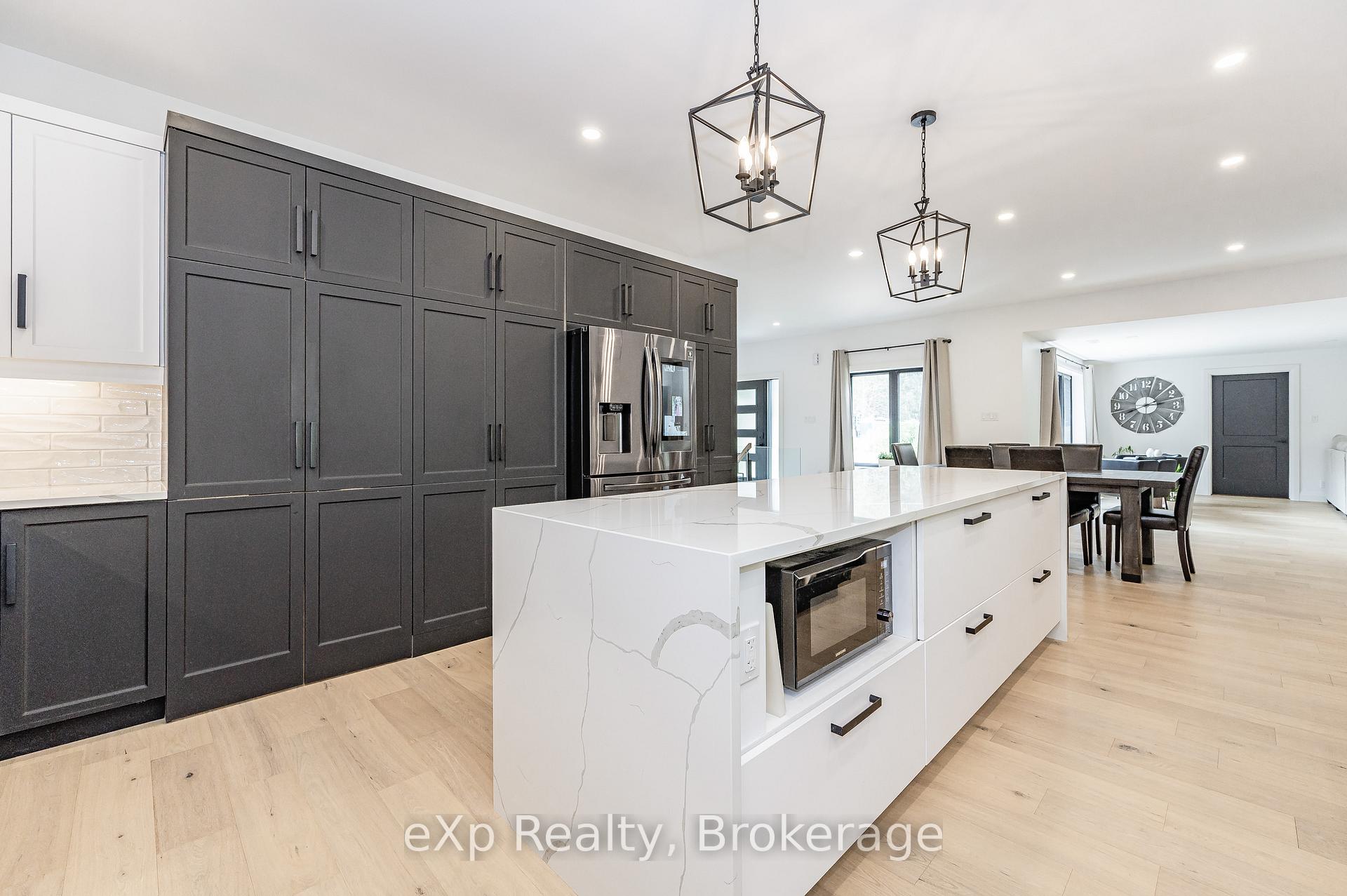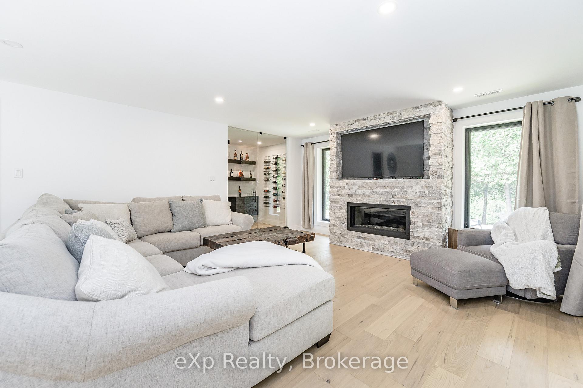 Set along the Grand River on one of Elora’s most desirable roads, this exceptional bungalow offers refined design, meticulous care, and peaceful riverside living. With over 3,850 square feet of finished space, this 5-bedroom home showcases quality craftsmanship and thoughtful upgrades throughout. The manicured property features a private, tree-lined backdrop with captivating river views, a wide asphalt driveway, and an oversized 3-car garage with epoxy flooring and separated third bay. Inside, the open-concept design is bright and elegant with engineered hardwood, large windows, and a beautifully appointed kitchen featuring high-end appliances, granite counters, a 9-foot waterfall island, and a hidden walk-in pantry with a second fridge and coffee bar. The dining and family rooms flow seamlessly beside a glass-enclosed wine cellar. The main level includes a mudroom with walk-in storage, a 3-piece bath, laundry room, and three spacious bedrooms. The primary suite offers a walk-in closet and a luxurious ensuite with heated floors, curbless shower, and freestanding tub. The finished lower level features heated floors, 9-foot ceilings, two bedrooms, a recreation area, and a 3-piece bath. Outdoor living includes a covered porch, composite deck, gas BBQ hookup, bocce court, fire pit, and stunning river views. Additional highlights include a new well with continuous pressure system, water softener with iron filter, on-demand boiler, CAT5 wiring, and full spray-foam insulation.