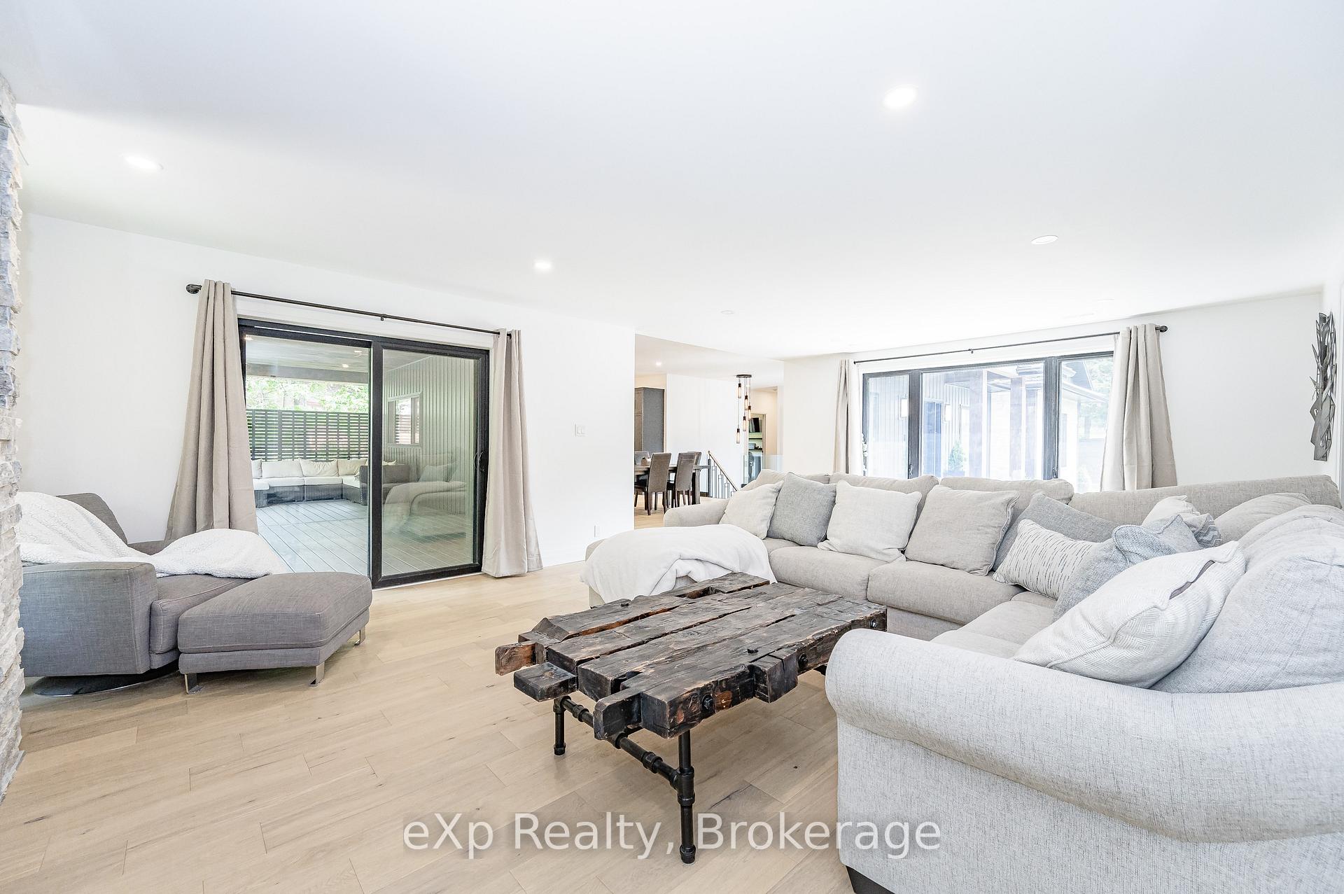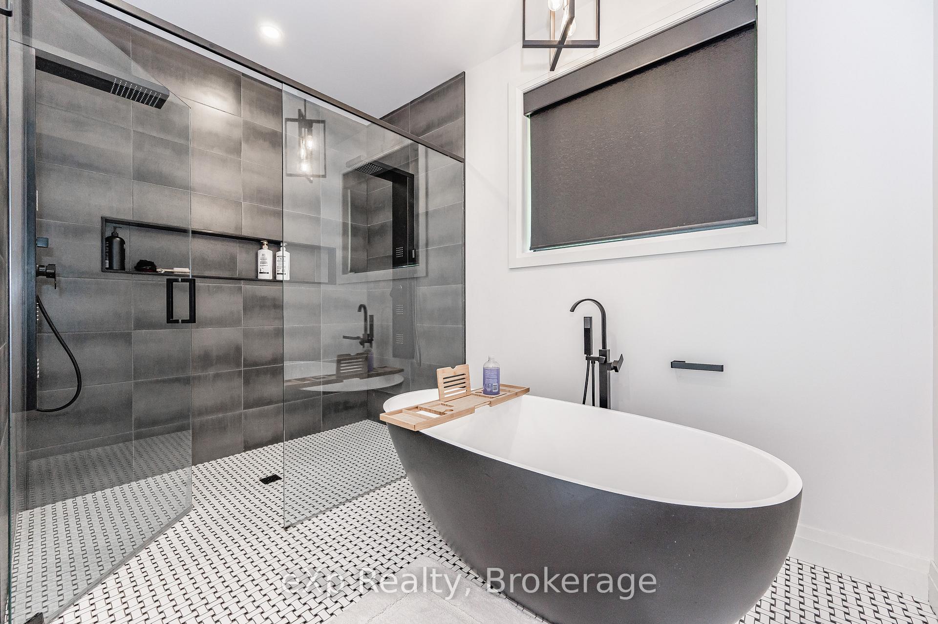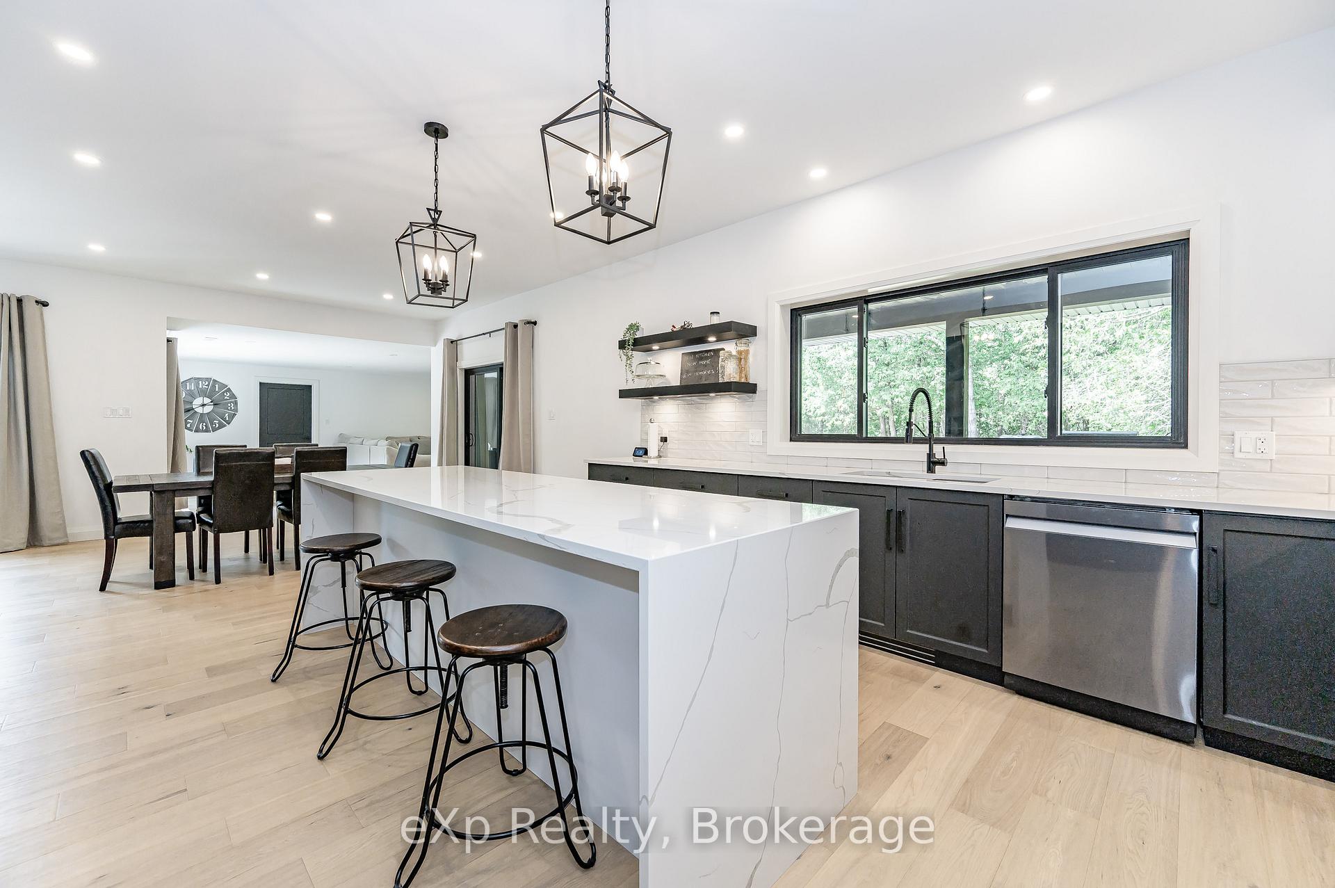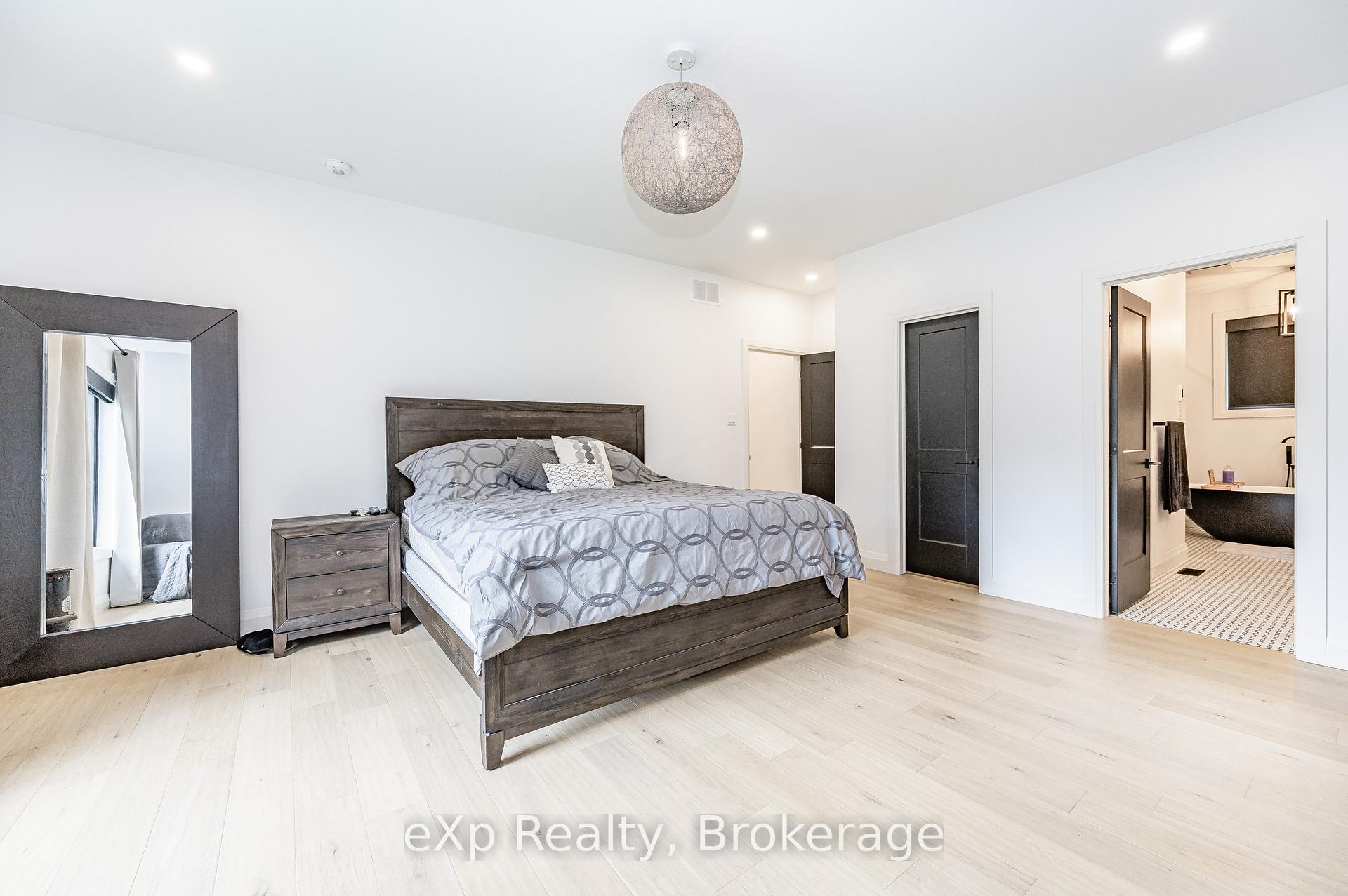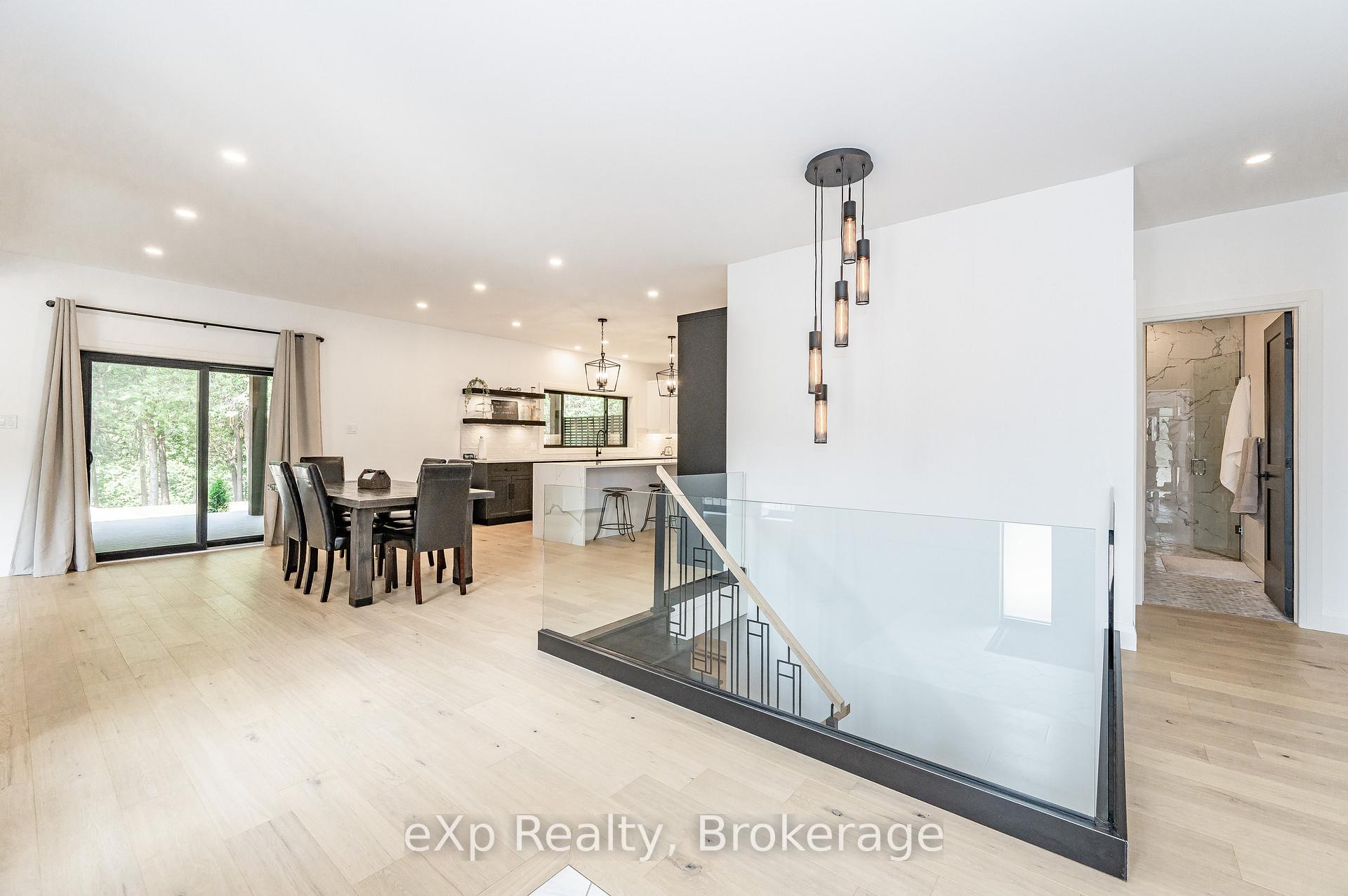 Set along the Grand River on one of Elora’s most desirable roads, this exceptional bungalow offers refined design, meticulous care, and peaceful riverside living. With over 3,850 square feet of finished space, this 5-bedroom home showcases quality craftsmanship and thoughtful upgrades throughout. The manicured property features a private, tree-lined backdrop with captivating river views, a wide asphalt driveway, and an oversized 3-car garage with epoxy flooring and separated third bay. Inside, the open-concept design is bright and elegant with engineered hardwood, large windows, and a beautifully appointed kitchen featuring high-end appliances, granite counters, a 9-foot waterfall island, and a hidden walk-in pantry with a second fridge and coffee bar. The dining and family rooms flow seamlessly beside a glass-enclosed wine cellar. The main level includes a mudroom with walk-in storage, a 3-piece bath, laundry room, and three spacious bedrooms. The primary suite offers a walk-in closet and a luxurious ensuite with heated floors, curbless shower, and freestanding tub. The finished lower level features heated floors, 9-foot ceilings, two bedrooms, a recreation area, and a 3-piece bath. Outdoor living includes a covered porch, composite deck, gas BBQ hookup, bocce court, fire pit, and stunning river views. Additional highlights include a new well with continuous pressure system, water softener with iron filter, on-demand boiler, CAT5 wiring, and full spray-foam insulation.
