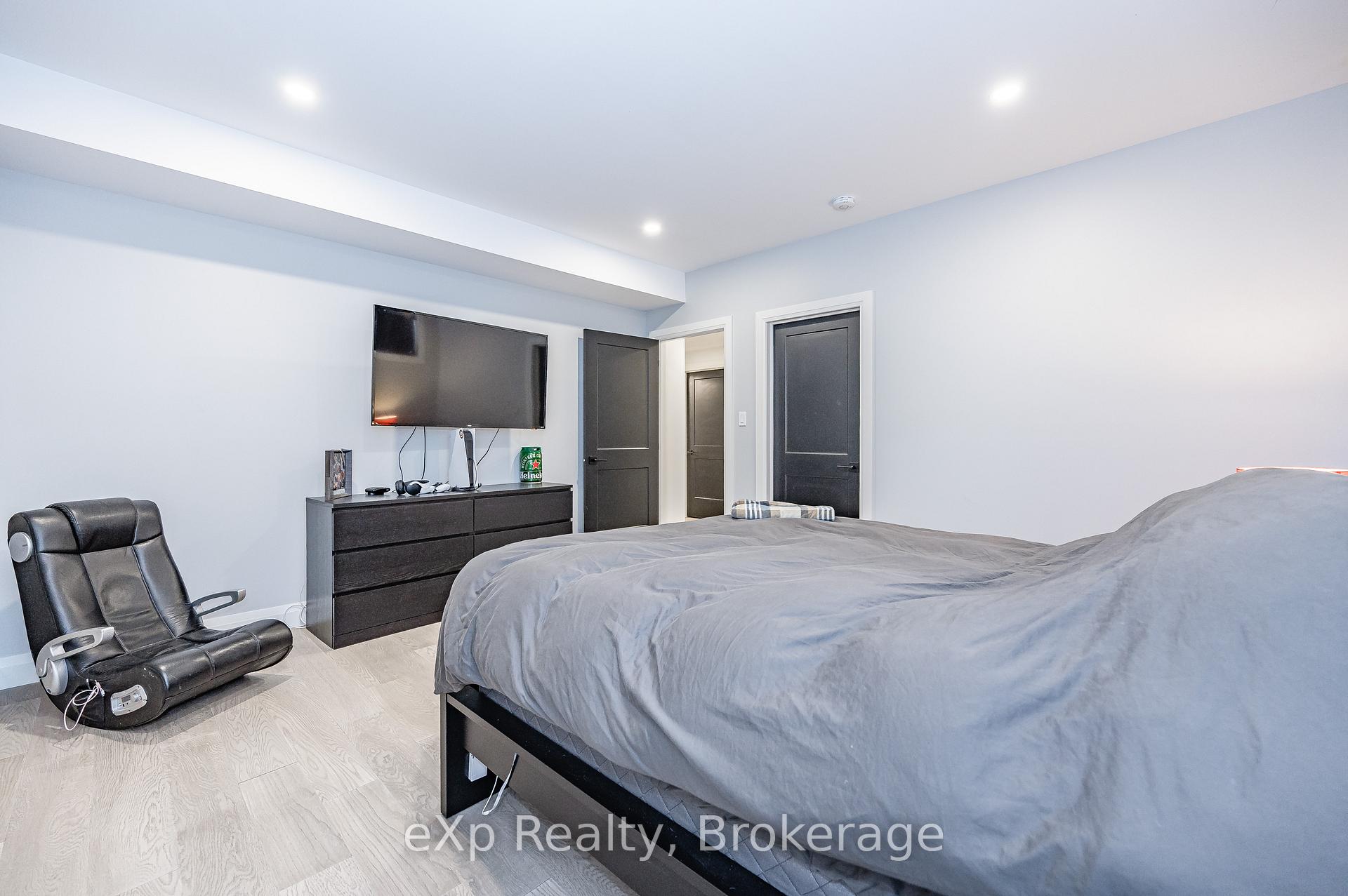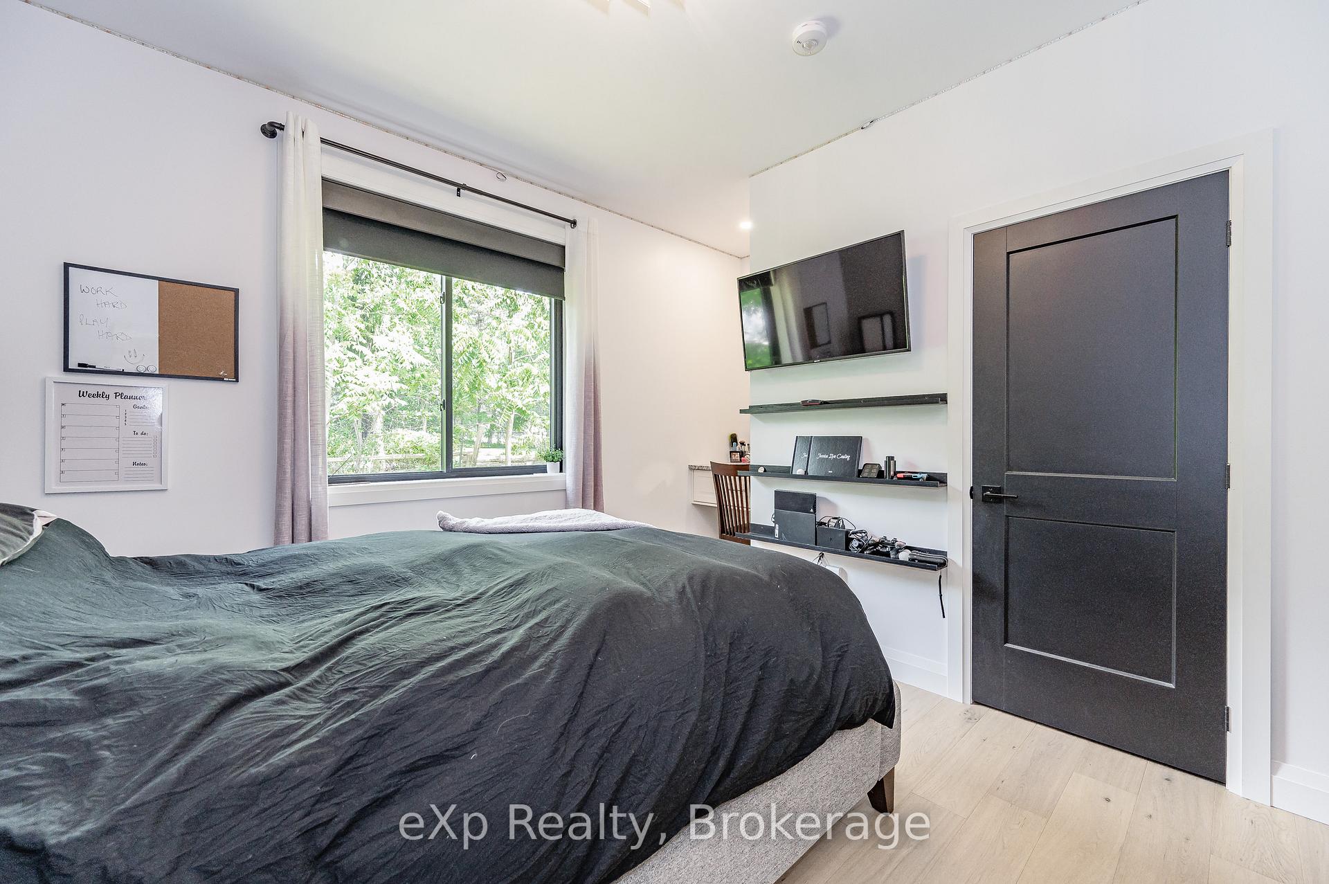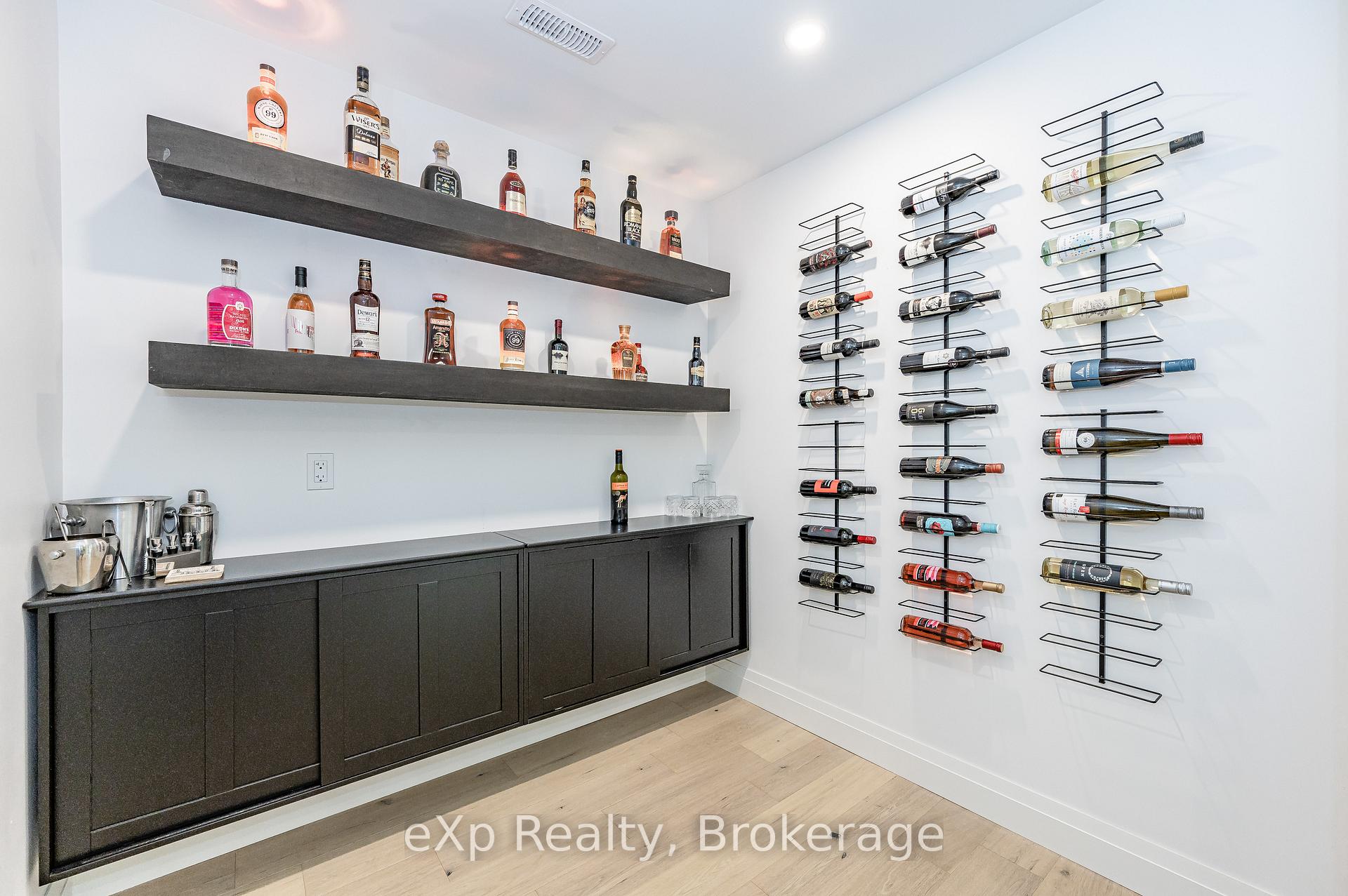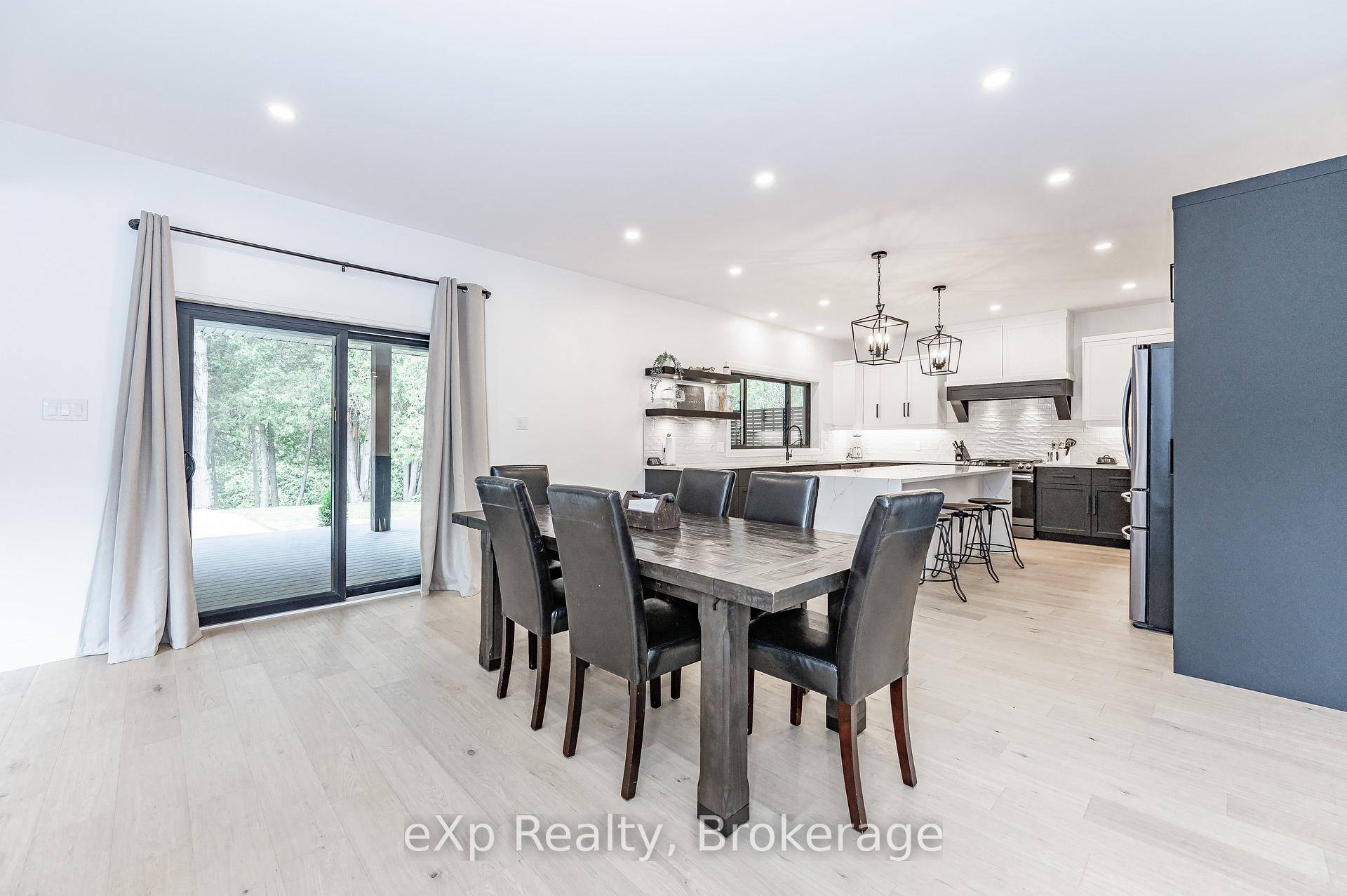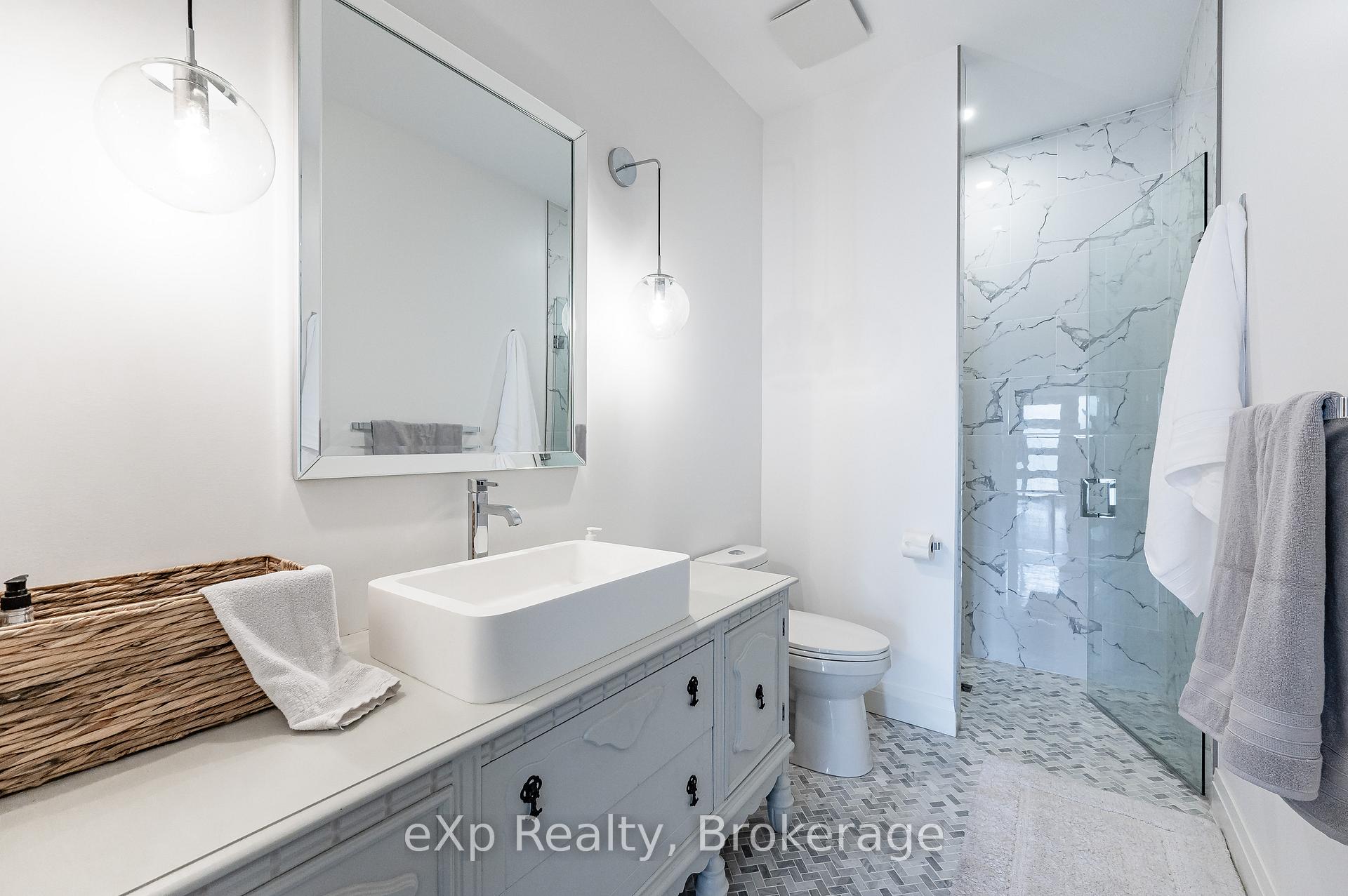 Set along the Grand River on one of Elora’s most desirable roads, this exceptional bungalow offers refined design, meticulous care, and peaceful riverside living. With over 3,850 square feet of finished space, this 5-bedroom home showcases quality craftsmanship and thoughtful upgrades throughout. The manicured property features a private, tree-lined backdrop with captivating river views, a wide asphalt driveway, and an oversized 3-car garage with epoxy flooring and separated third bay. Inside, the open-concept design is bright and elegant with engineered hardwood, large windows, and a beautifully appointed kitchen featuring high-end appliances, granite counters, a 9-foot waterfall island, and a hidden walk-in pantry with a second fridge and coffee bar. The dining and family rooms flow seamlessly beside a glass-enclosed wine cellar. The main level includes a mudroom with walk-in storage, a 3-piece bath, laundry room, and three spacious bedrooms. The primary suite offers a walk-in closet and a luxurious ensuite with heated floors, curbless shower, and freestanding tub. The finished lower level features heated floors, 9-foot ceilings, two bedrooms, a recreation area, and a 3-piece bath. Outdoor living includes a covered porch, composite deck, gas BBQ hookup, bocce court, fire pit, and stunning river views. Additional highlights include a new well with continuous pressure system, water softener with iron filter, on-demand boiler, CAT5 wiring, and full spray-foam insulation.