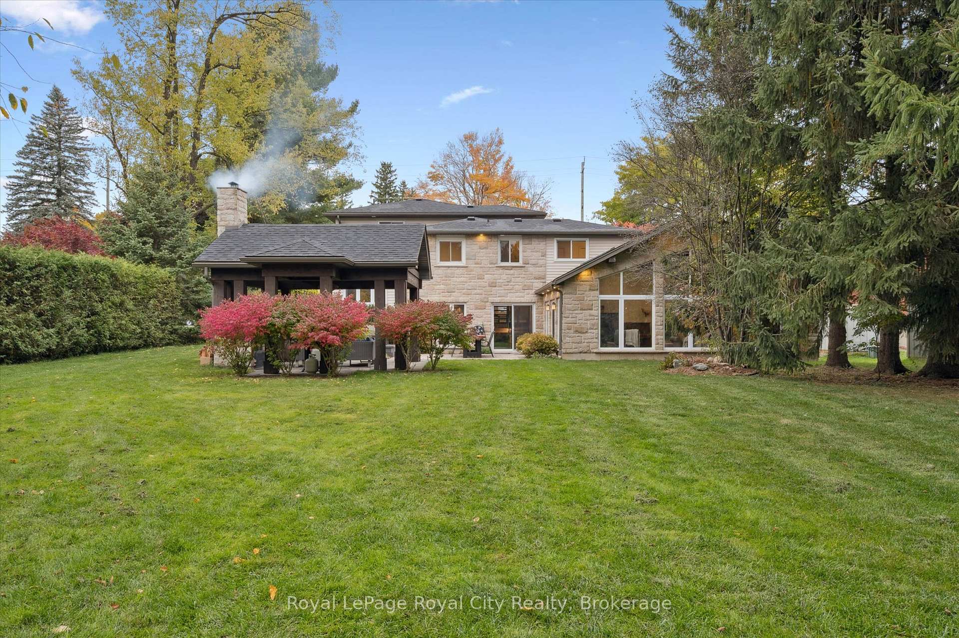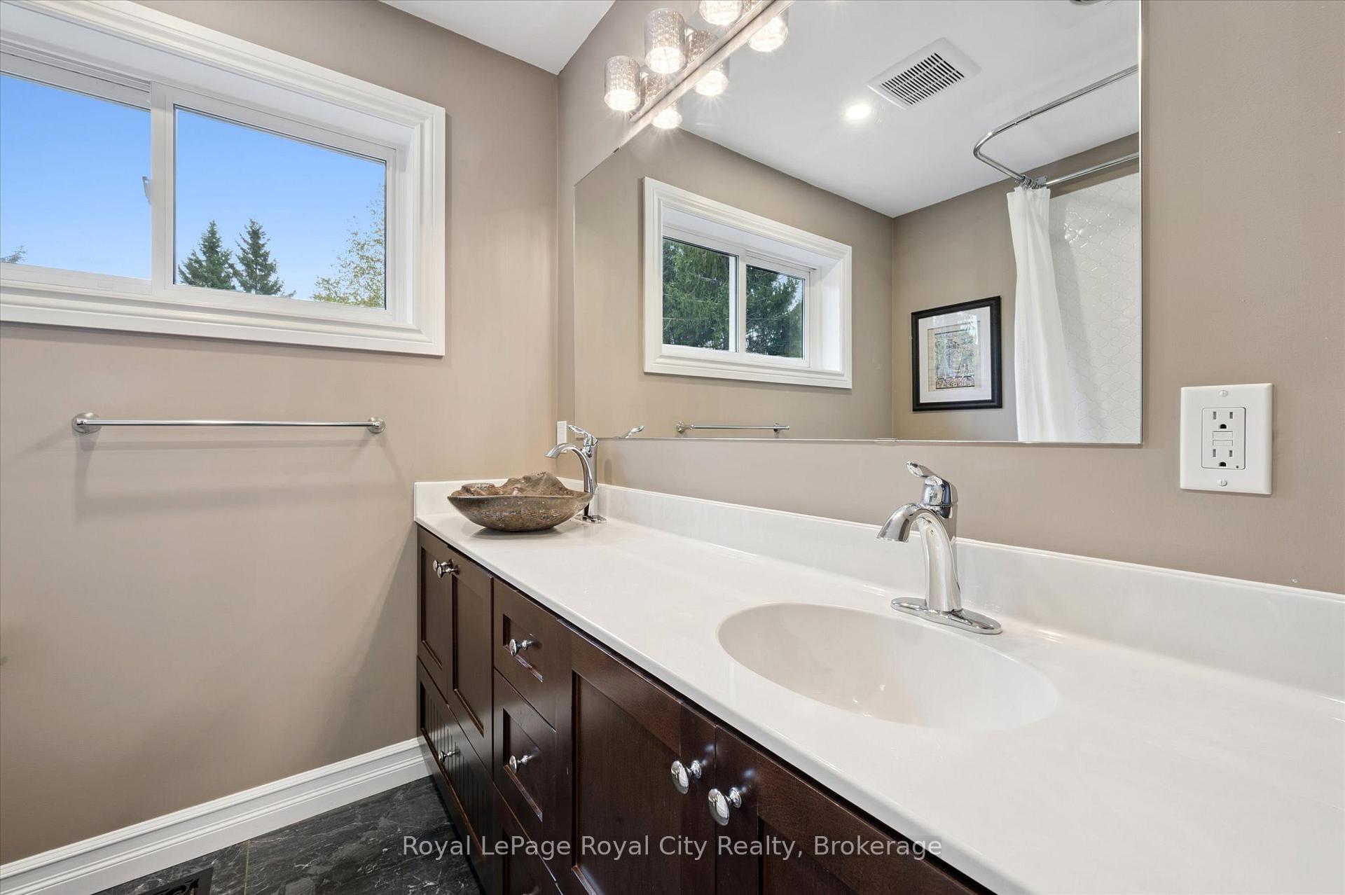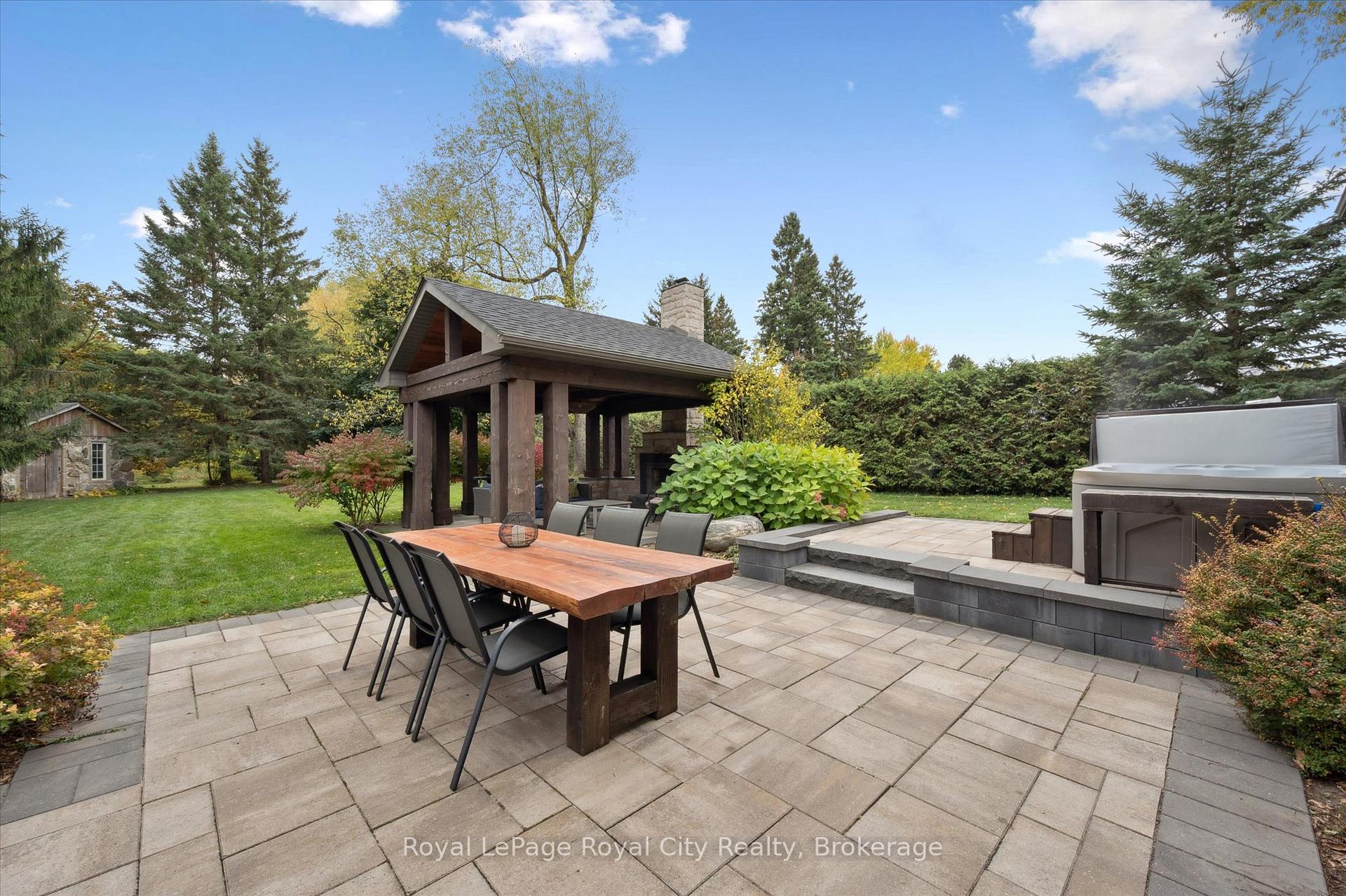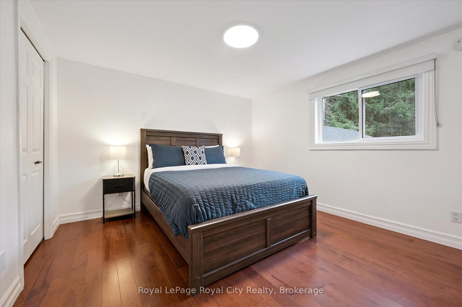 Tucked away on over an acre of peaceful, tree-lined property, this thoughtfully designed multi-level home offers a rare blend of space, style, and soul. From its inviting front porch to the rustic entertaining space out back, every inch of this 5-bedroom, 3-bathroom property invites connection with family, friends, and the natural beauty that surrounds it. Upon entrance, you will quickly fall in love with the open-concept design, enhanced by gleaming hardwood flooring. The chef-inspired kitchen showcases sleek Corian countertops, custom cabinetry, and a functional island that flows perfectly into the combined living/dining room, creating an elegant space for entertaining. A sizable main floor bedroom is ideal for guests or a home office, while a well-equipped mudroom supports busy family living. Descend to the show-stopping lower-level family room, anchored by an attractive fireplace, and flaunting vaulted ceilings, engineered hardwood, skylights, and floor-to-ceiling windows capturing breathtaking backyard views. The adjoining games/rec area is designed for fun and function, complete with heated floors, backyard access, and a modern 3pc bathroom. Upstairs, the 2nd level provides 2 generous bedrooms and a loft space, perfect for a reading nook or study, alongside an updated 4pc bathroom. The private, 3rd level offers a primary suite with a walk-in closet and a 5pc ensuite, as well as a 5th spacious bedroom. The finished basement extends a versatile living or recreational space, complemented by a dedicated laundry room and storage/utility room. Step outside and prepare to be captivated: a 2-tier stone patio frames alfresco dining and a rejuvenating hot tub area, while the rustic post-and-beam gazebo with a striking stone fireplace promises memorable evenings under the stars. Surrounded by mature trees and lush green space, this property evokes the feel of a private resort retreat- just minutes from essential amenities and ready to welcome your next chapter.