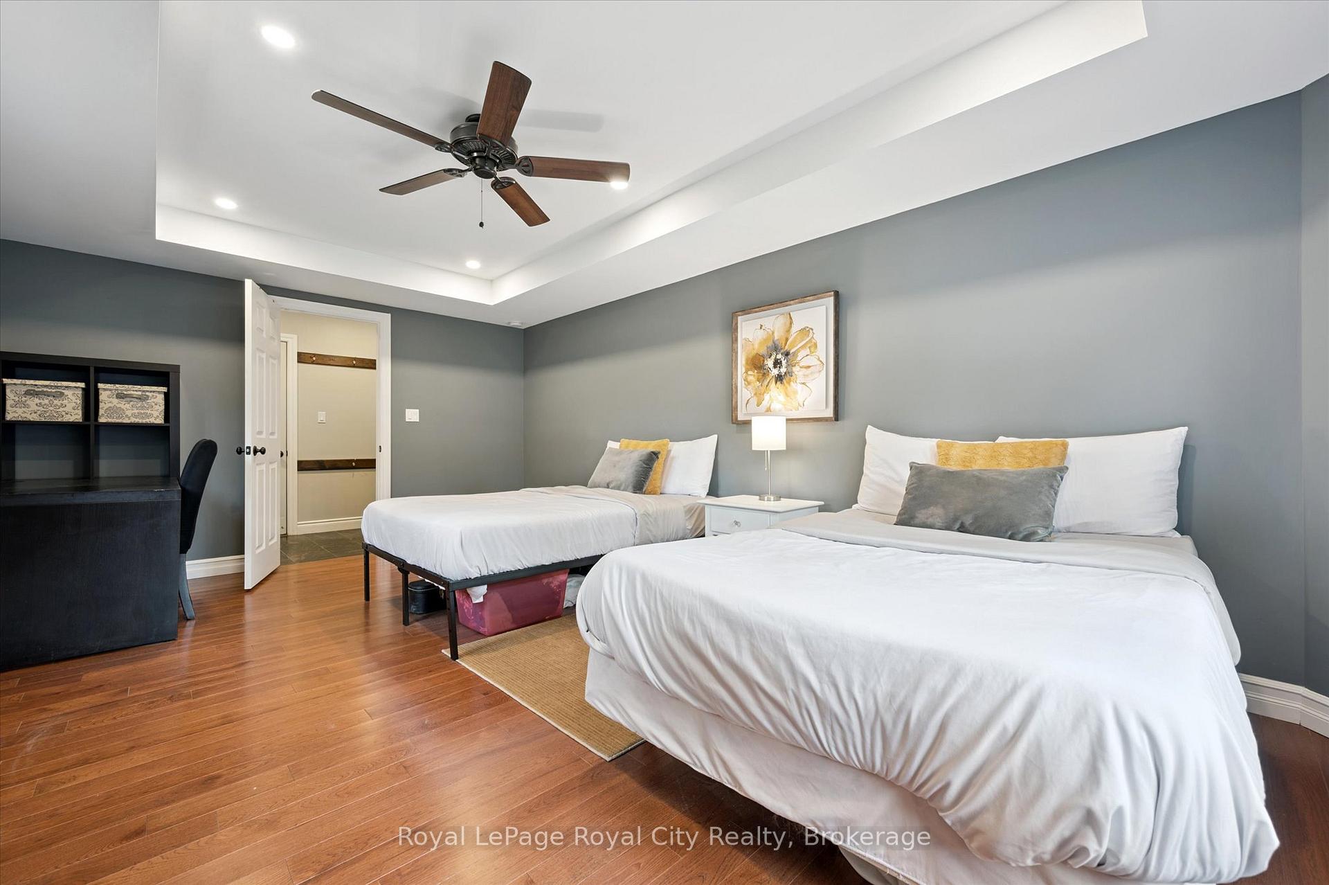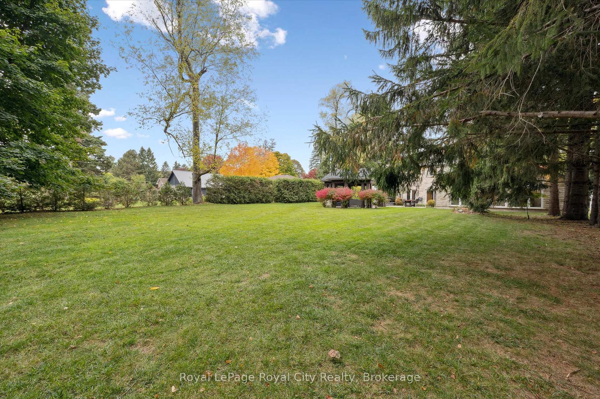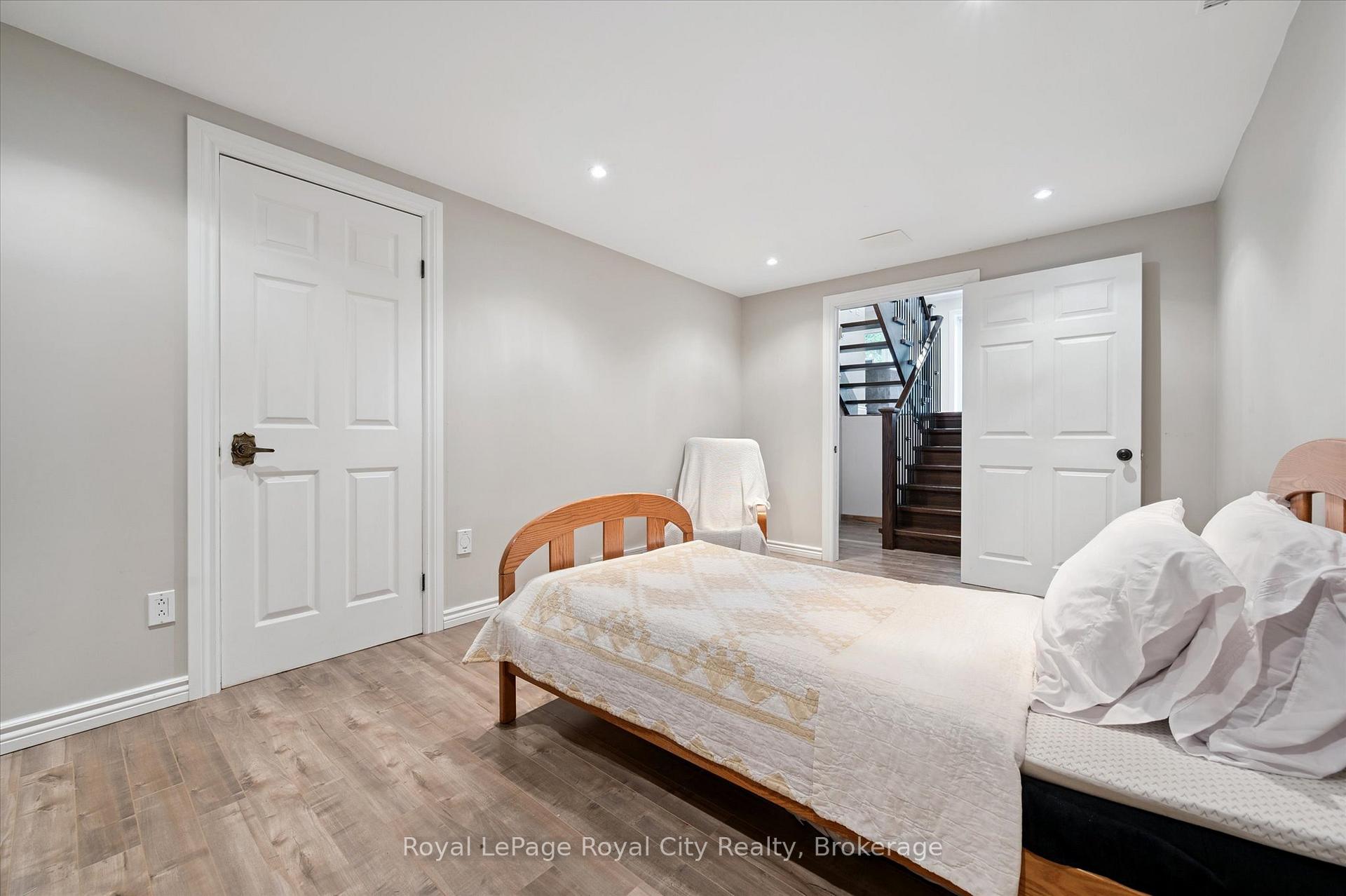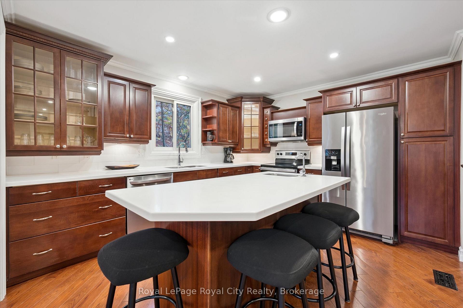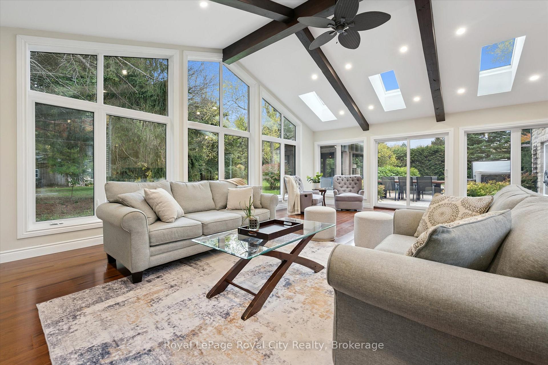 Tucked away on over an acre of peaceful, tree-lined property, this thoughtfully designed multi-level home offers a rare blend of space, style, and soul. From its inviting front porch to the rustic entertaining space out back, every inch of this 5-bedroom, 3-bathroom property invites connection with family, friends, and the natural beauty that surrounds it. Upon entrance, you will quickly fall in love with the open-concept design, enhanced by gleaming hardwood flooring. The chef-inspired kitchen showcases sleek Corian countertops, custom cabinetry, and a functional island that flows perfectly into the combined living/dining room, creating an elegant space for entertaining. A sizable main floor bedroom is ideal for guests or a home office, while a well-equipped mudroom supports busy family living. Descend to the show-stopping lower-level family room, anchored by an attractive fireplace, and flaunting vaulted ceilings, engineered hardwood, skylights, and floor-to-ceiling windows capturing breathtaking backyard views. The adjoining games/rec area is designed for fun and function, complete with heated floors, backyard access, and a modern 3pc bathroom. Upstairs, the 2nd level provides 2 generous bedrooms and a loft space, perfect for a reading nook or study, alongside an updated 4pc bathroom. The private, 3rd level offers a primary suite with a walk-in closet and a 5pc ensuite, as well as a 5th spacious bedroom. The finished basement extends a versatile living or recreational space, complemented by a dedicated laundry room and storage/utility room. Step outside and prepare to be captivated: a 2-tier stone patio frames alfresco dining and a rejuvenating hot tub area, while the rustic post-and-beam gazebo with a striking stone fireplace promises memorable evenings under the stars. Surrounded by mature trees and lush green space, this property evokes the feel of a private resort retreat- just minutes from essential amenities and ready to welcome your next chapter.