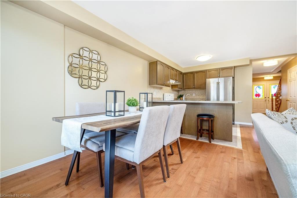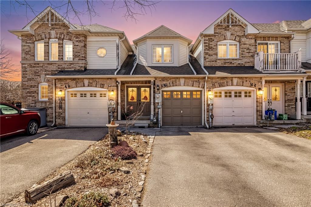 Welcome to this beautifully maintained freehold townhouse offering comfort, functionality, and thoughtful updates throughout. The landscaped front yard, stone walkway, and covered front porch create a warm and inviting first impression, complete with a private driveway with parking for two and an attached garage with overhead and hanging storage. Step inside to a bright and welcoming main level featuring solid 3/4 inch hardwood flooring through the hallway, living room, and breakfast area. The open concept layout is ideal for both everyday living and entertaining, with large windows and a double sliding glass door walkout that fills the space with natural light and provides seamless access to the backyard. The kitchen is both functional and inviting, offering warm brown cabinetry with curved panel detailing, a tile backsplash with multiple outlets, stainless steel appliances, and a breakfast bar with comfortable seating. Upstairs, the spacious primary bedroom offers a peaceful retreat with two windows overlooking the backyard, a chandelier, and two double closets for ample storage. The semi-ensuite 3 piece bathroom features a tub and shower combination, built-in vanity, and convenient access from both the bedroom and hallway. A second bedroom with front yard views, broadloom flooring, and a double closet completes this level. The unfinished basement presents excellent potential, with framing and electrical already completed, offering a great opportunity to create additional living space, a recreation area, or a home office. The private backyard is a true highlight, featuring a brand new spruce deck (2025), new fencing (2025), and beautifully landscaped gardens filled with mature perennials including hydrangeas, lilies, and magnolias, creating a peaceful outdoor setting to enjoy. A wonderful opportunity to own a move-in ready home in a family friendly neighbourhood with space to grow and make it your own.