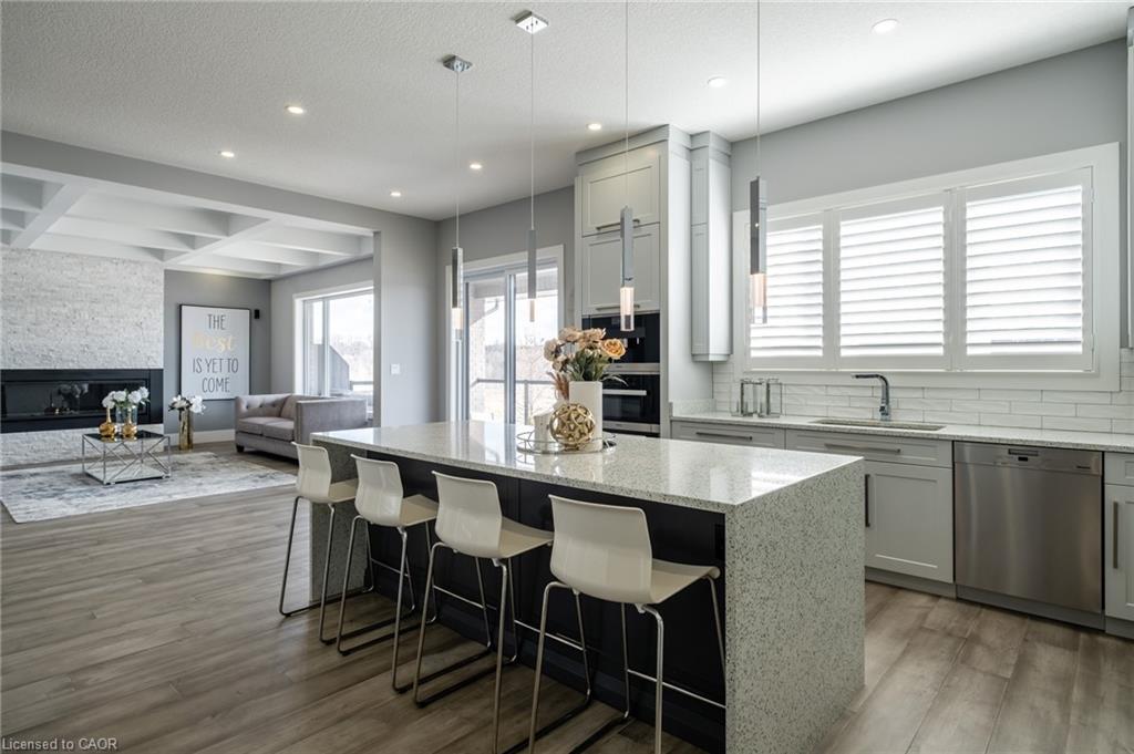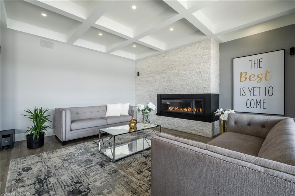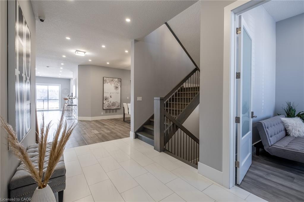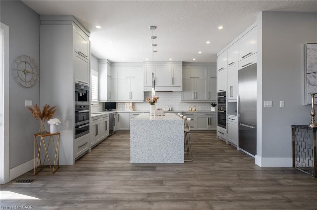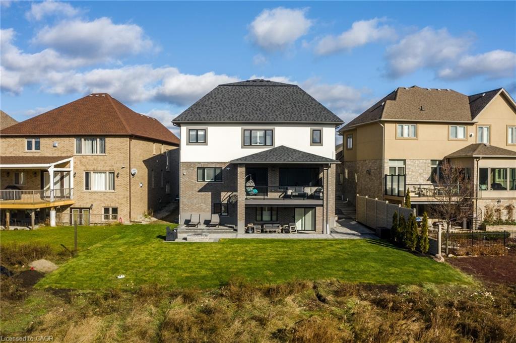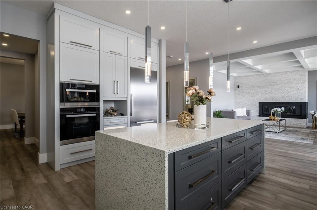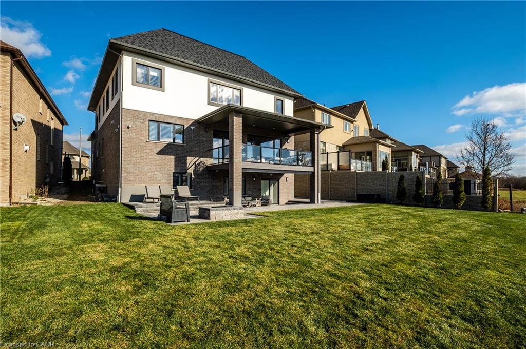 Modern Luxury nestled along the banks of the Grand River. Beautifully appointed 4+3 bedroom, 5.5 bathroom home sits on a rare greenspace walkout lot backing onto a protected naturalized area. Open concept living, smart controlled home including elaborate surveillance system, built in sound, exterior lighting, irrigation, garage, front door and more. Enjoy entertaining in your oversized kitchen where you will create amazing meals and memories. Storage won’t be an issue with cabinetry running floor to ceiling featuring built in high end Miele appliances & waterfall countertop centre island. A butler pantry & walk in pantry separates the kitchen from the dining room. The family room takes full advantage of the unobstructed beautiful greenspace view. A linear gas fireplace & waffle ceiling create ambiance & style. The covered composite deck with glass rails provides additional premium outdoor entertaining space. A stunning maple staircase with stainless steel spindles leads to the spacious second level which features 4 large bedrooms, 3 beautiful bathrooms, practical second floor laundry, & additional loft space. Primary bedroom is located at the back of the home to also take advantage of the stunning views; also featuring beautiful tray ceiling, his & her walk-in closets and luxury 5 pc ensuite with free standing tub and multi-jet glass shower with automated temperature control. The walkout fully finished basement makes it ideal for an extended family; large windows and high quality finishing is also consistent throughout the basement. Three bedrooms, 2 – 3pc bathrooms, second laundry, recreation room with projection system and surround sound, and a wet bar that can easily serve as a kitchenette. An additional ground level patio space makes for a second separate outdoor entertaining area complete with firepit.