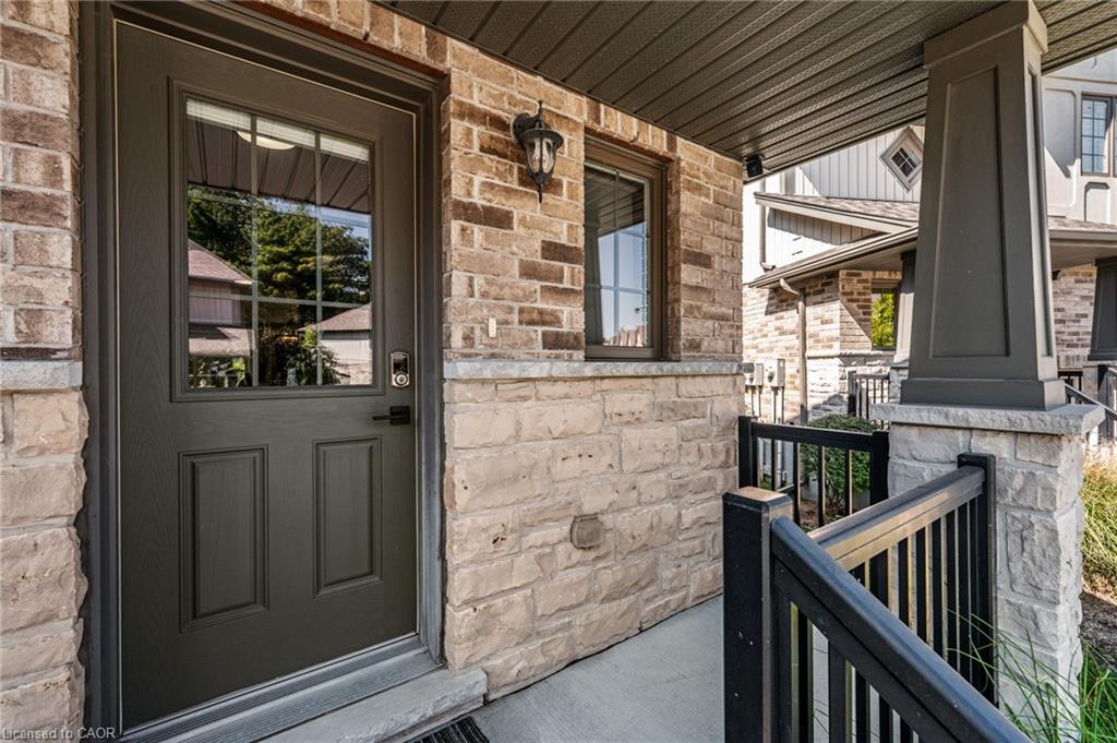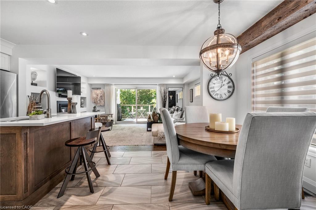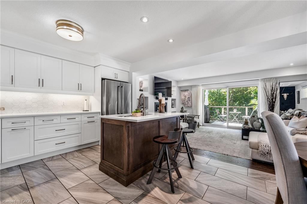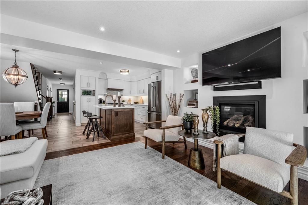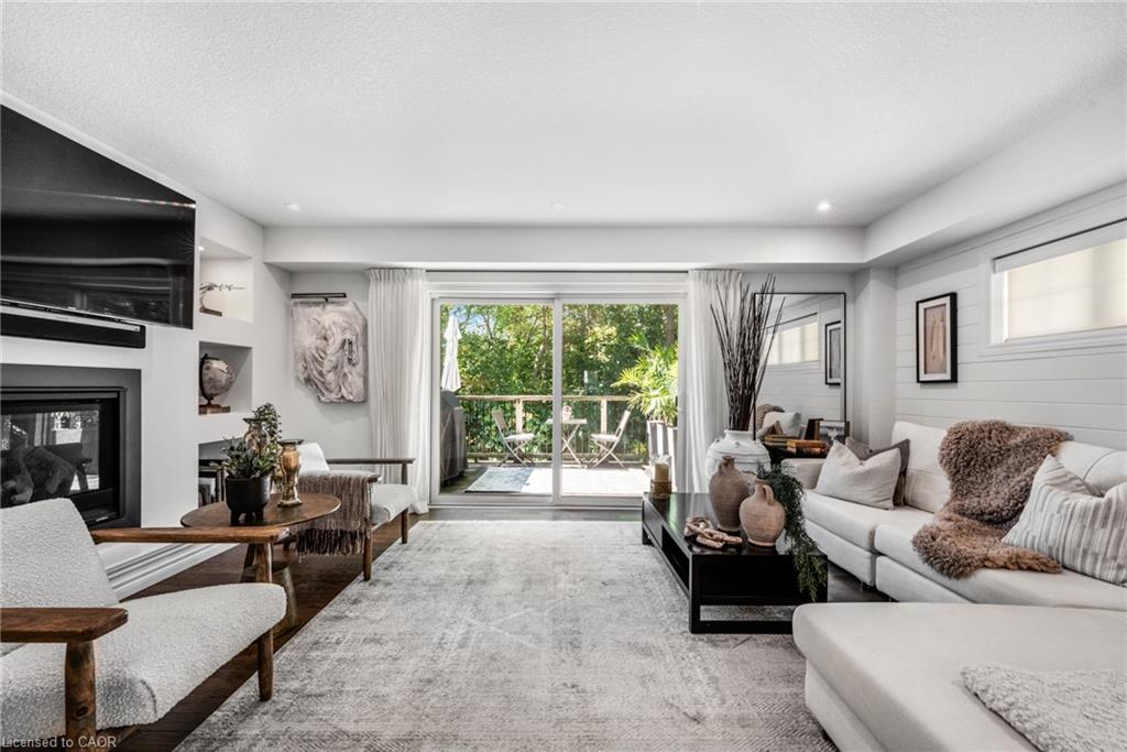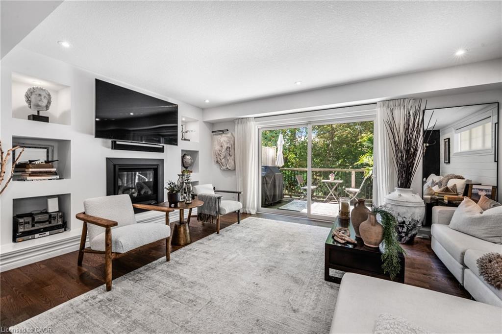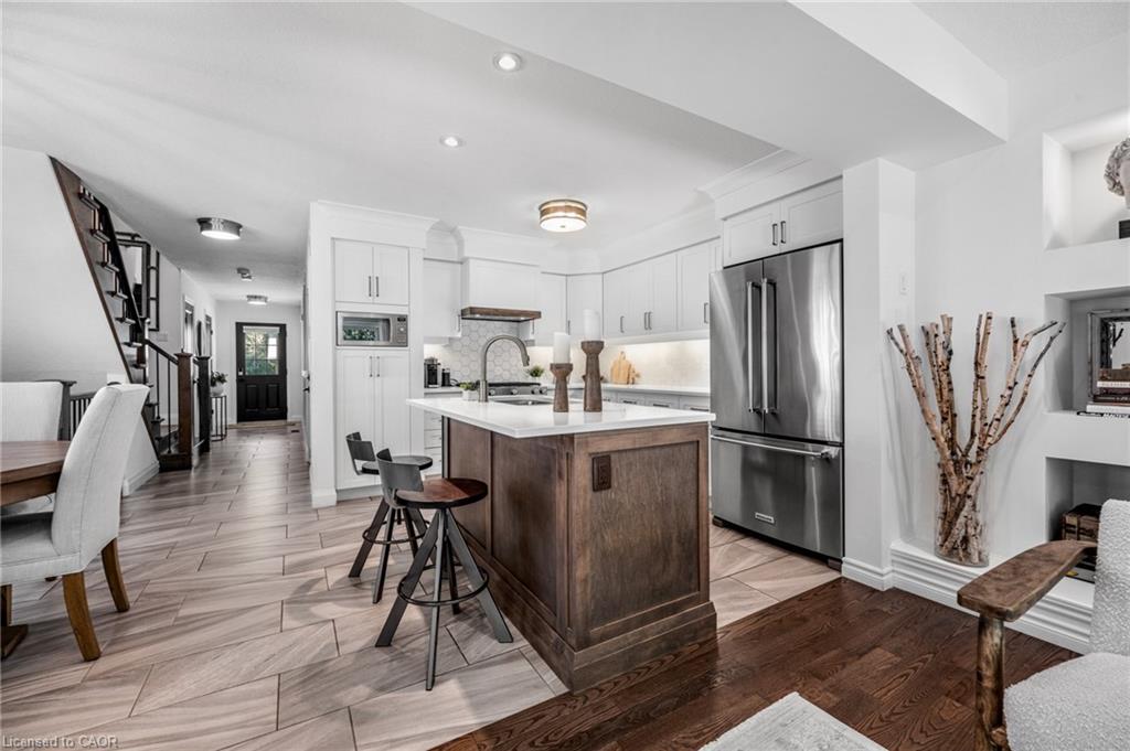SAGINAW WOODS EXECUTIVE TOWNHOME! Tucked into a family-friendly neighbourhood celebrated for its excellent schools, walking paths, bike lanes, and quick 401 access. Step inside and you’ll immediately feel the attention to detail. The entryway sets the tone with custom wainscoting and upgraded tile, leading you into an open main floor designed for connection. The kitchen is a showpiece, featuring lacquer cabinets with soft-close doors, quartz countertops, a maple wood island, a barn beam, an upgraded vent hood, a built-in microwave, and crown molding. Every element feels considered, down to the hardware & backsplash. The family room is warm and inviting, anchored by a gas fireplace with a feature wall and custom drapery. Extra-large sliding doors let in natural light and open to a deck overlooking a wall of mature trees — the perfect spot for morning coffee or a summer BBQ, complete with a gas line. Upstairs, hardwood stairs with black iron spindles lead to a cozy landing that doubles as a reading nook. The primary suite is a true retreat with custom wall moulding, blackout drapes, and a fully outfitted walk-in closet behind a custom steel door. The ensuite offers a floating maple vanity with quartz top and upgraded tile. 2 additional bedrooms feature hardwood floors and designer touches — from a faux-brick feature wall to statement wallpaper — plus a full guest bath with lacquer vanity and quartz counters. The lower level, finished in 2021, feels like a boutique lounge with a custom tiled entertainment wall, soundbar, live-edge wood shelves with puck lighting, wood slat feature wall, & electric fireplace. A spa-like 3pc bath with a curbless shower and floating vanity completes this stunning space. Immaculately finished, thoughtfully upgraded, pristine and move-in ready.