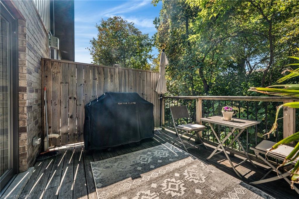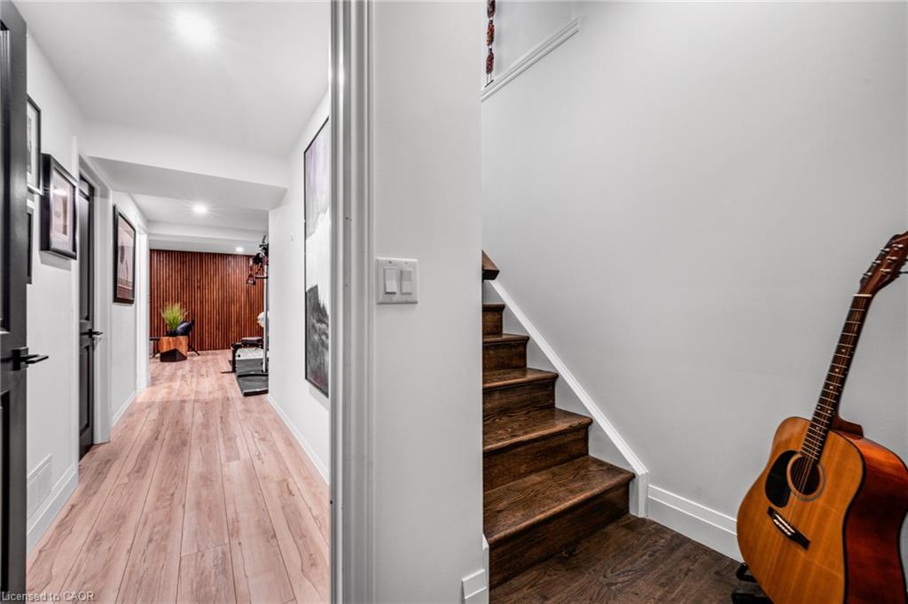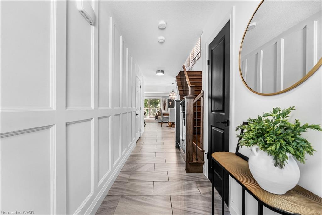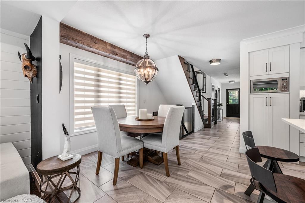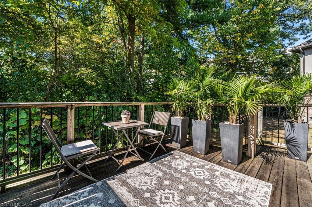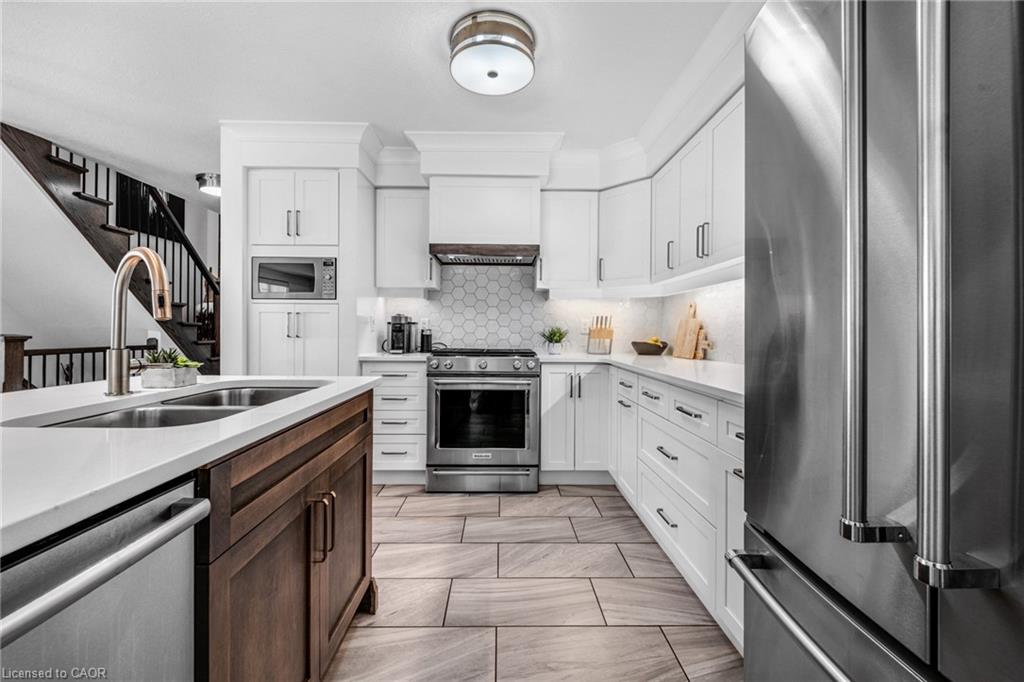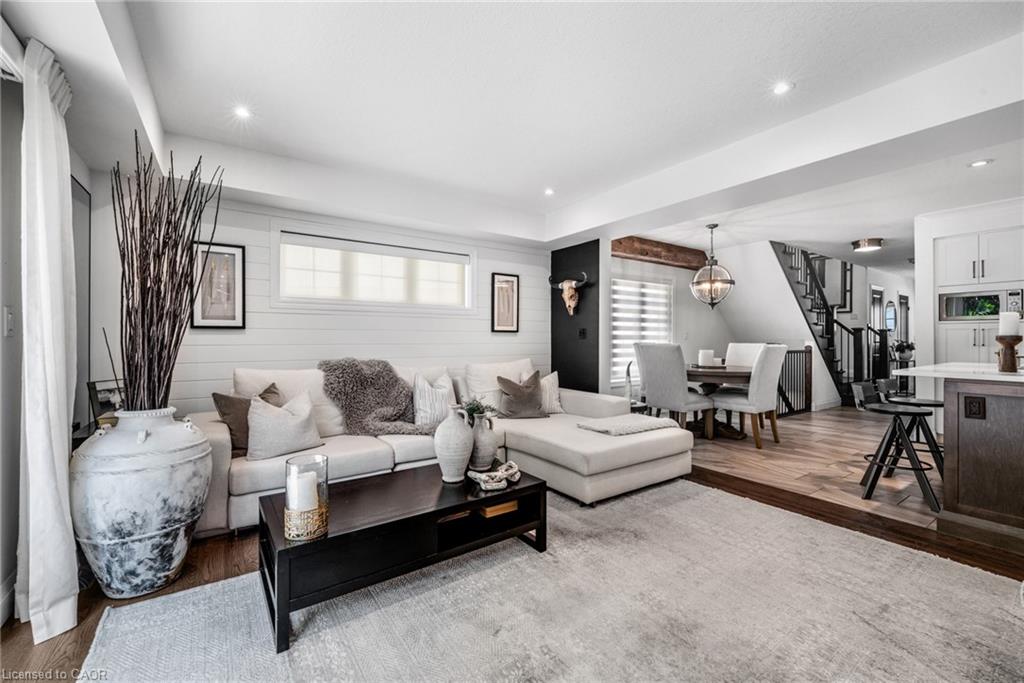 SAGINAW WOODS EXECUTIVE TOWNHOME! Tucked into a family-friendly neighbourhood celebrated for its excellent schools, walking paths, bike lanes, and quick 401 access. Step inside and you’ll immediately feel the attention to detail. The entryway sets the tone with custom wainscoting and upgraded tile, leading you into an open main floor designed for connection. The kitchen is a showpiece, featuring lacquer cabinets with soft-close doors, quartz countertops, a maple wood island, a barn beam, an upgraded vent hood, a built-in microwave, and crown molding. Every element feels considered, down to the hardware & backsplash. The family room is warm and inviting, anchored by a gas fireplace with a feature wall and custom drapery. Extra-large sliding doors let in natural light and open to a deck overlooking a wall of mature trees — the perfect spot for morning coffee or a summer BBQ, complete with a gas line. Upstairs, hardwood stairs with black iron spindles lead to a cozy landing that doubles as a reading nook. The primary suite is a true retreat with custom wall moulding, blackout drapes, and a fully outfitted walk-in closet behind a custom steel door. The ensuite offers a floating maple vanity with quartz top and upgraded tile. 2 additional bedrooms feature hardwood floors and designer touches — from a faux-brick feature wall to statement wallpaper — plus a full guest bath with lacquer vanity and quartz counters. The lower level, finished in 2021, feels like a boutique lounge with a custom tiled entertainment wall, soundbar, live-edge wood shelves with puck lighting, wood slat feature wall, & electric fireplace. A spa-like 3pc bath with a curbless shower and floating vanity completes this stunning space. Immaculately finished, thoughtfully upgraded, pristine and move-in ready.