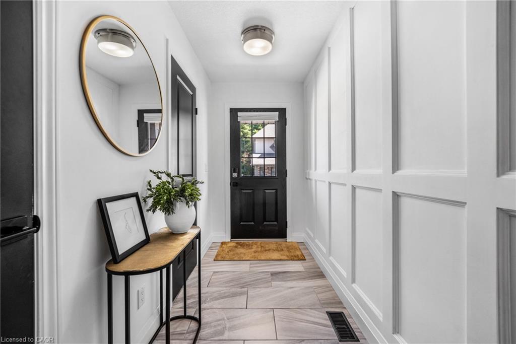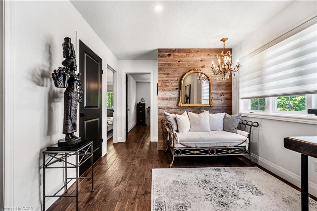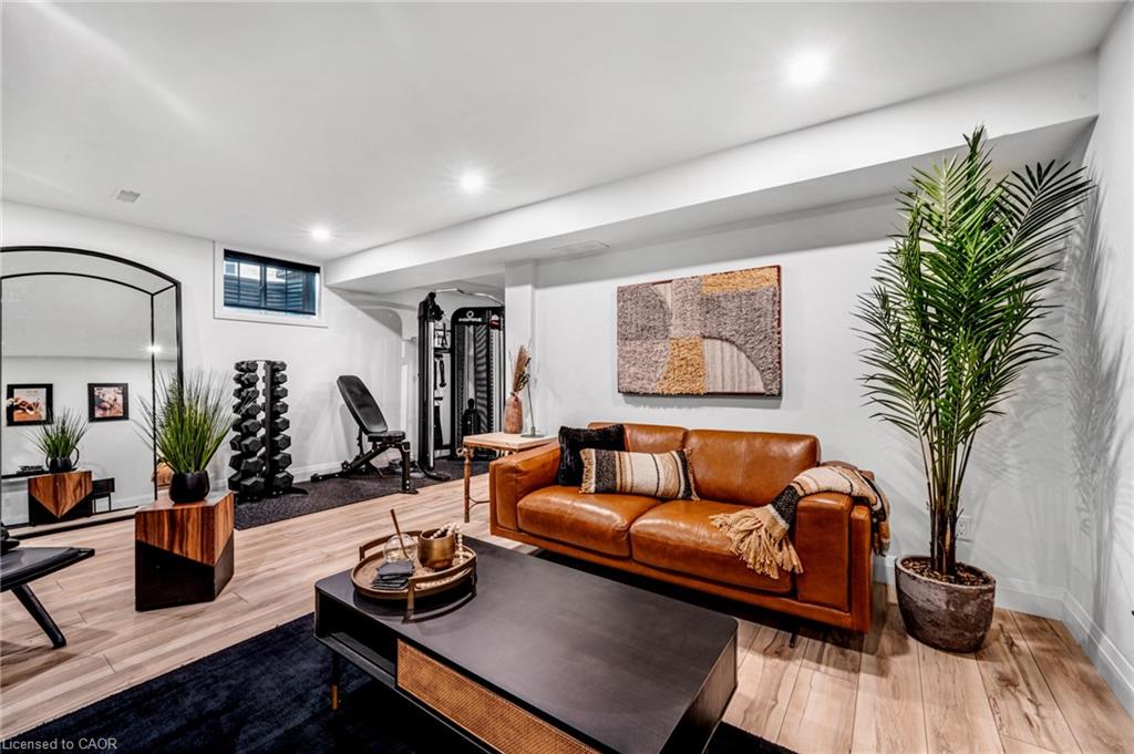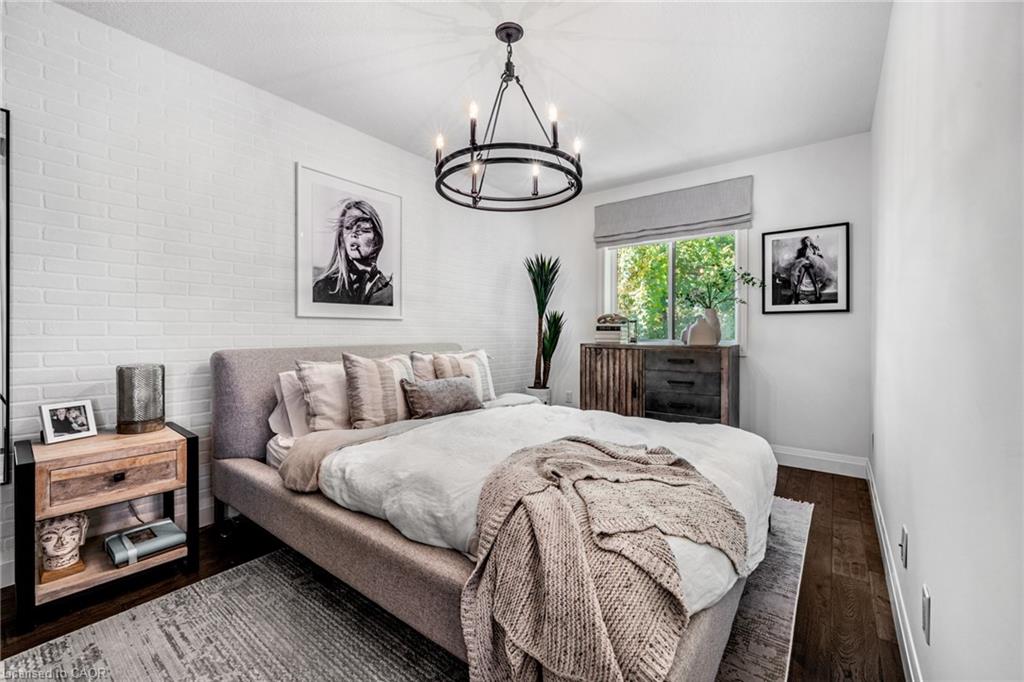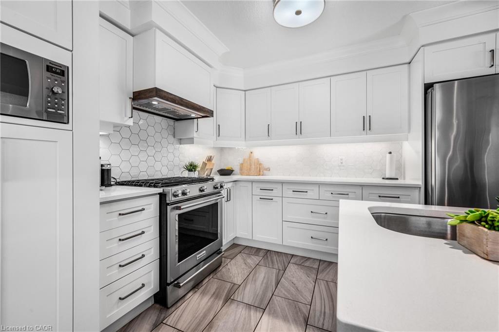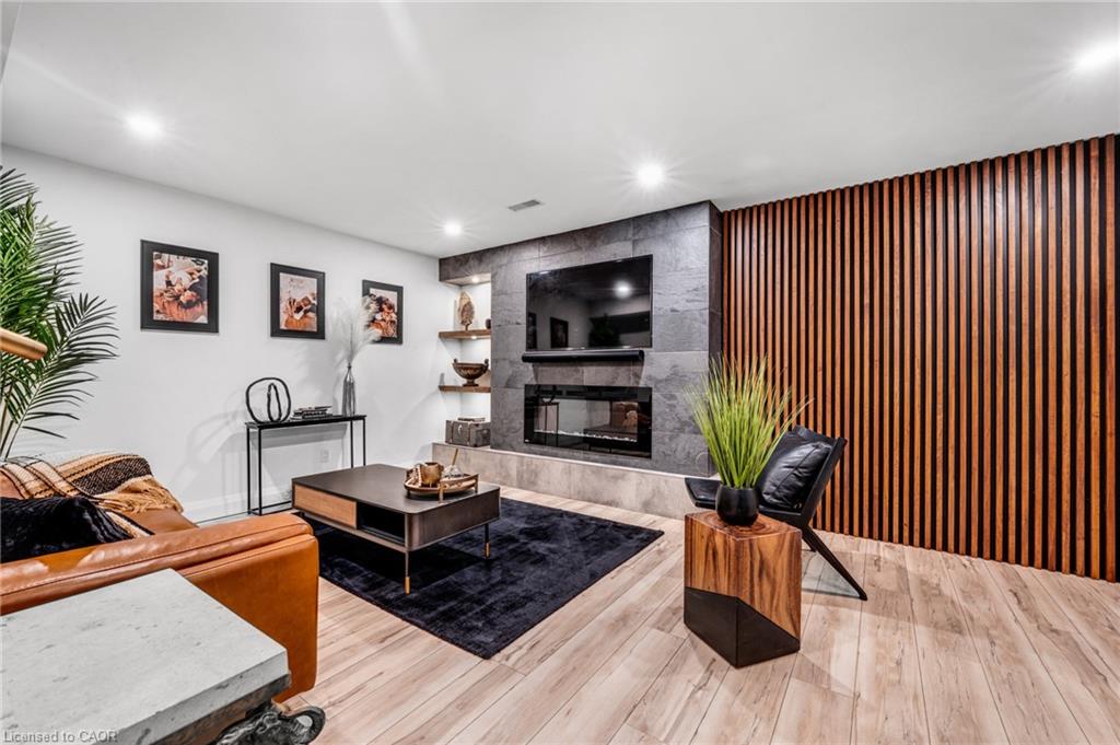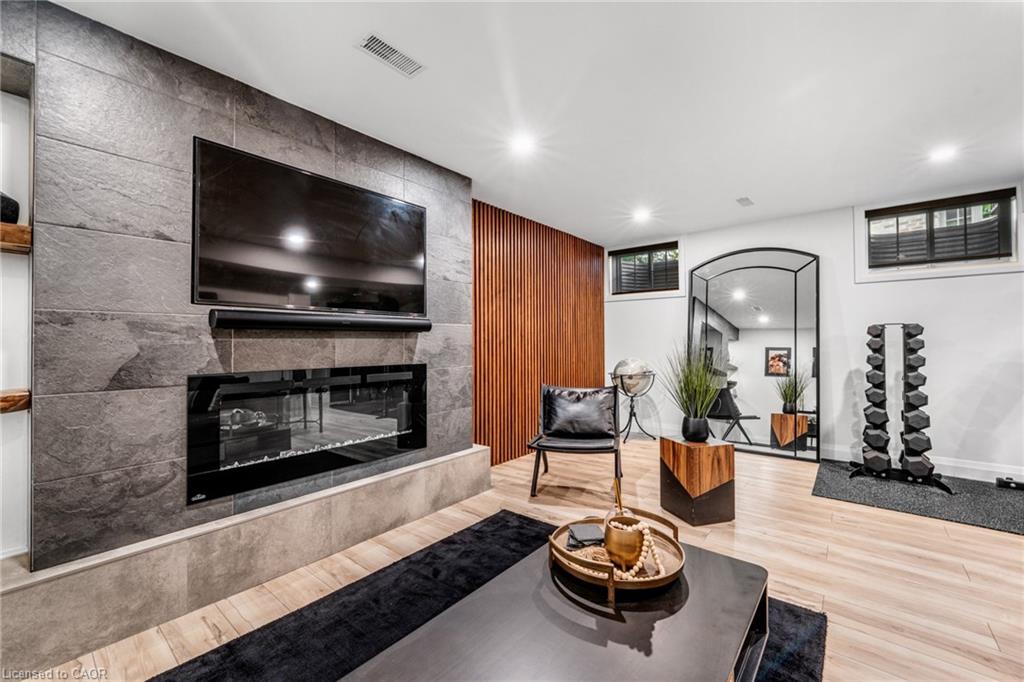SAGINAW WOODS EXECUTIVE TOWNHOME! Tucked into a family-friendly neighbourhood celebrated for its excellent schools, walking paths, bike lanes, and quick 401 access. Step inside and you’ll immediately feel the attention to detail. The entryway sets the tone with custom wainscoting and upgraded tile, leading you into an open main floor designed for connection. The kitchen is a showpiece, featuring lacquer cabinets with soft-close doors, quartz countertops, a maple wood island, a barn beam, an upgraded vent hood, a built-in microwave, and crown molding. Every element feels considered, down to the hardware & backsplash. The family room is warm and inviting, anchored by a gas fireplace with a feature wall and custom drapery. Extra-large sliding doors let in natural light and open to a deck overlooking a wall of mature trees — the perfect spot for morning coffee or a summer BBQ, complete with a gas line. Upstairs, hardwood stairs with black iron spindles lead to a cozy landing that doubles as a reading nook. The primary suite is a true retreat with custom wall moulding, blackout drapes, and a fully outfitted walk-in closet behind a custom steel door. The ensuite offers a floating maple vanity with quartz top and upgraded tile. 2 additional bedrooms feature hardwood floors and designer touches — from a faux-brick feature wall to statement wallpaper — plus a full guest bath with lacquer vanity and quartz counters. The lower level, finished in 2021, feels like a boutique lounge with a custom tiled entertainment wall, soundbar, live-edge wood shelves with puck lighting, wood slat feature wall, & electric fireplace. A spa-like 3pc bath with a curbless shower and floating vanity completes this stunning space. Immaculately finished, thoughtfully upgraded, pristine and move-in ready.