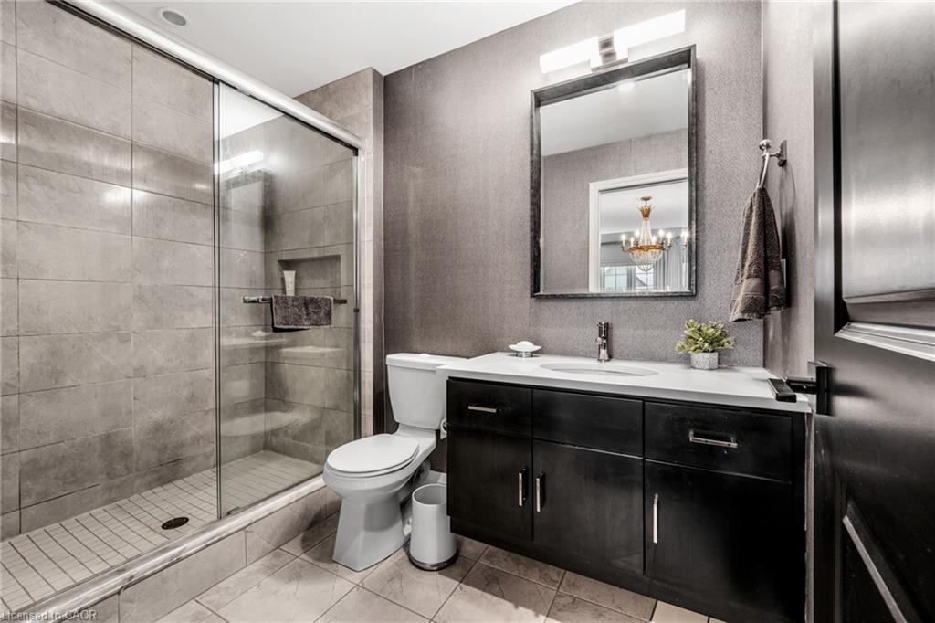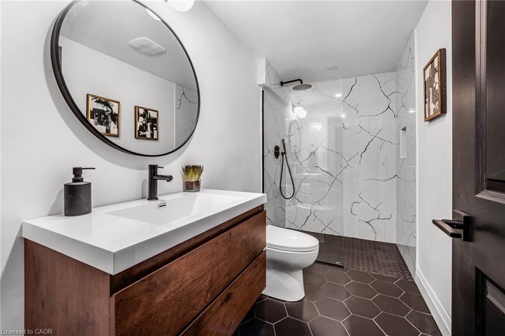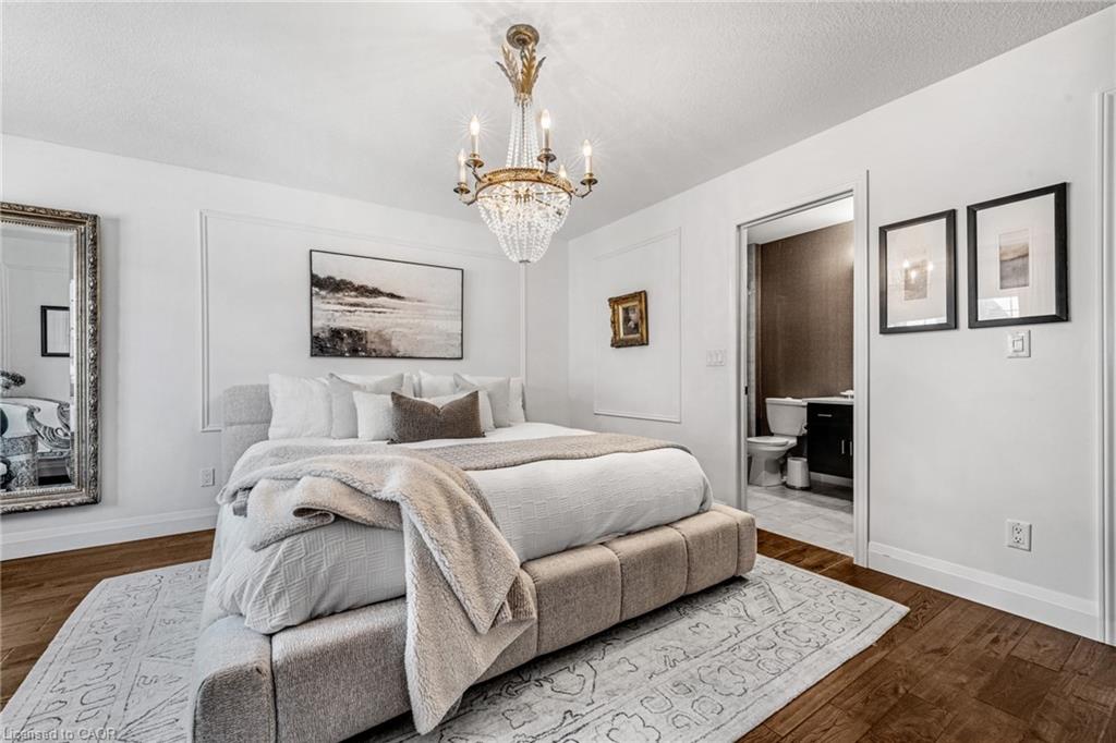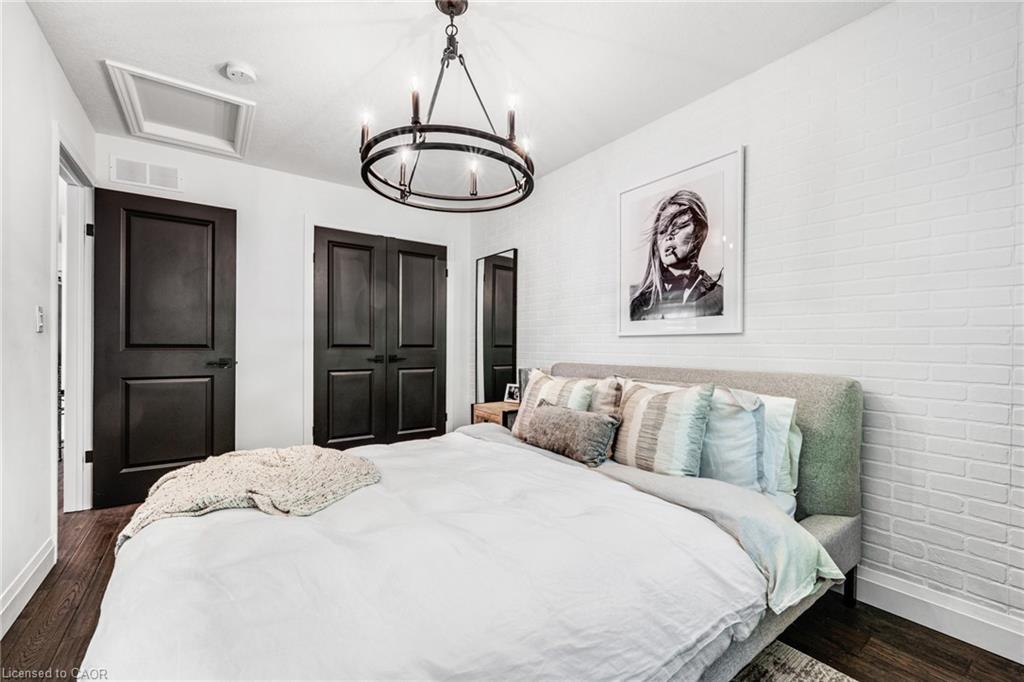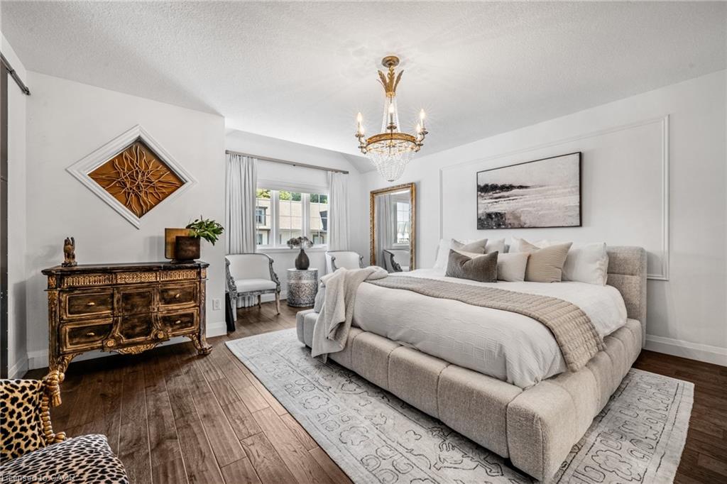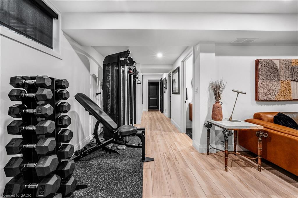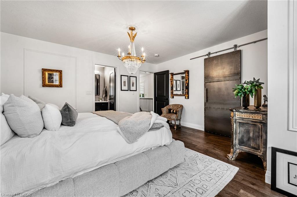SAGINAW WOODS EXECUTIVE TOWNHOME! Tucked into a family-friendly neighbourhood celebrated for its excellent schools, walking paths, bike lanes, and quick 401 access. Step inside and you’ll immediately feel the attention to detail. The entryway sets the tone with custom wainscoting and upgraded tile, leading you into an open main floor designed for connection. The kitchen is a showpiece, featuring lacquer cabinets with soft-close doors, quartz countertops, a maple wood island, a barn beam, an upgraded vent hood, a built-in microwave, and crown molding. Every element feels considered, down to the hardware & backsplash. The family room is warm and inviting, anchored by a gas fireplace with a feature wall and custom drapery. Extra-large sliding doors let in natural light and open to a deck overlooking a wall of mature trees — the perfect spot for morning coffee or a summer BBQ, complete with a gas line. Upstairs, hardwood stairs with black iron spindles lead to a cozy landing that doubles as a reading nook. The primary suite is a true retreat with custom wall moulding, blackout drapes, and a fully outfitted walk-in closet behind a custom steel door. The ensuite offers a floating maple vanity with quartz top and upgraded tile. 2 additional bedrooms feature hardwood floors and designer touches — from a faux-brick feature wall to statement wallpaper — plus a full guest bath with lacquer vanity and quartz counters. The lower level, finished in 2021, feels like a boutique lounge with a custom tiled entertainment wall, soundbar, live-edge wood shelves with puck lighting, wood slat feature wall, & electric fireplace. A spa-like 3pc bath with a curbless shower and floating vanity completes this stunning space. Immaculately finished, thoughtfully upgraded, pristine and move-in ready.