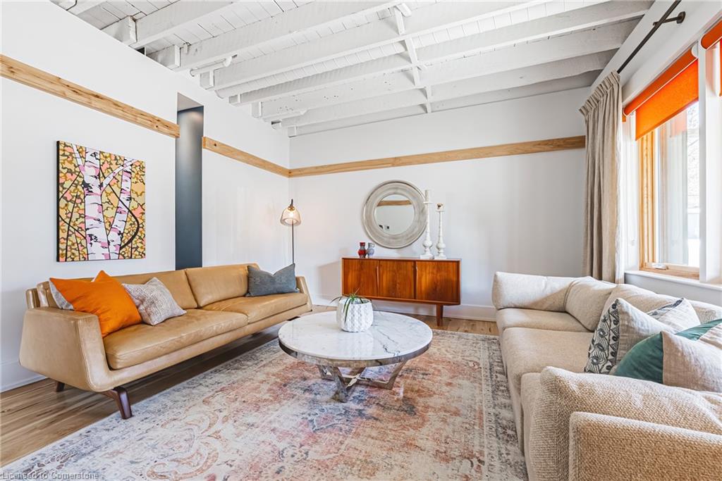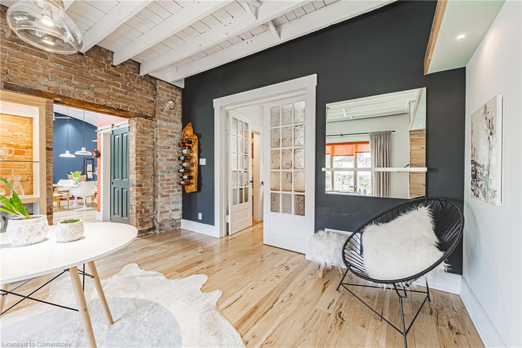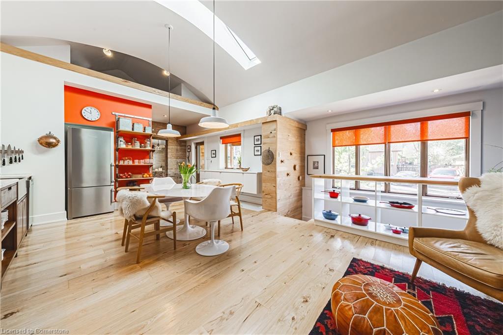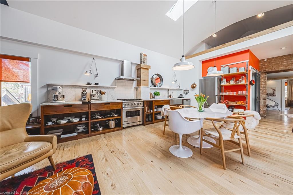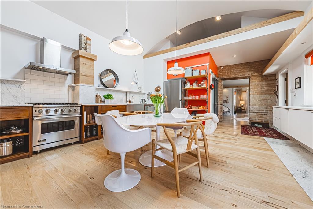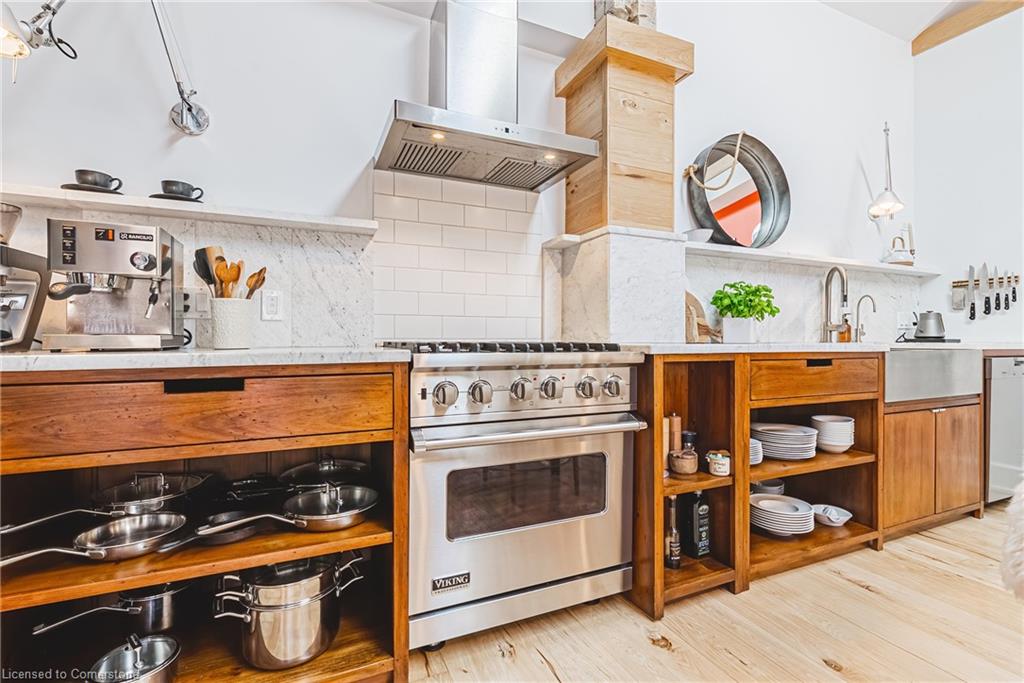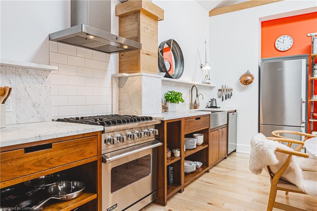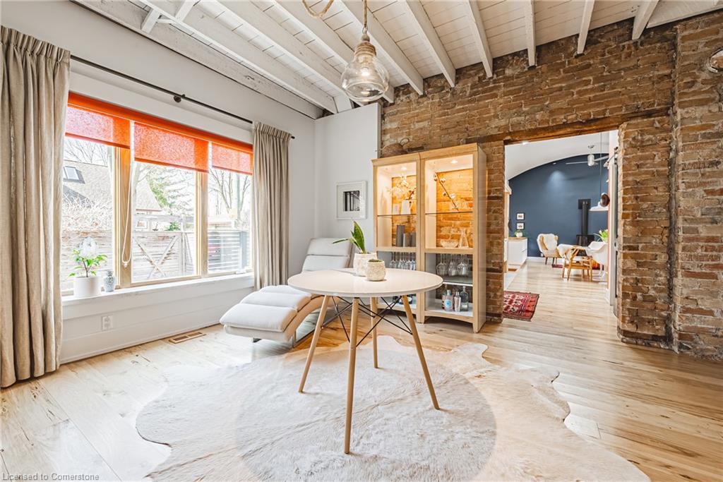 Architectural Gem in Uptown Waterloo – A rare opportunity to own a one-of-a-kind home in the heart of Waterloos Mary Allen neighbourhood. Built in 1886, this property blends historic character with a modern Scandinavian-inspired design across 2,000 sq ft of carefully renovated living space. Exposed original beams and brick, a dramatic curved arched ceiling in the expansive great room, and loft cut-outs in the bedrooms provide aerial views of the living spaces below and the sky above. Hickory flooring and Carrara marble flow throughout the home, complementing its refined design. The heart of this home is the custom, European-inspired kitchen featuring a bespoke unfitted layout and high-end stainless steel appliances (Viking gas range, Liebherr fridge, Miele dishwasher), designed for both style and functionality. Natural light fills the space, enhancing its open, airy feel. The propertys fully landscaped gardens have been recognized for their design and year-round appeal. Thoughtfully planned outdoor spaces offer areas for dining, gathering, and enjoying the changing seasons, seamlessly extending the homes living space into nature. Located in a highly walkable neighbourhood, with a strong sense of community, most errands can be accomplished on foot. This is truly a unique home that stands out not just for its history but for its modern enhancements and unique character. Dont miss the chance to own this exceptional home everyone wants but only you can have.