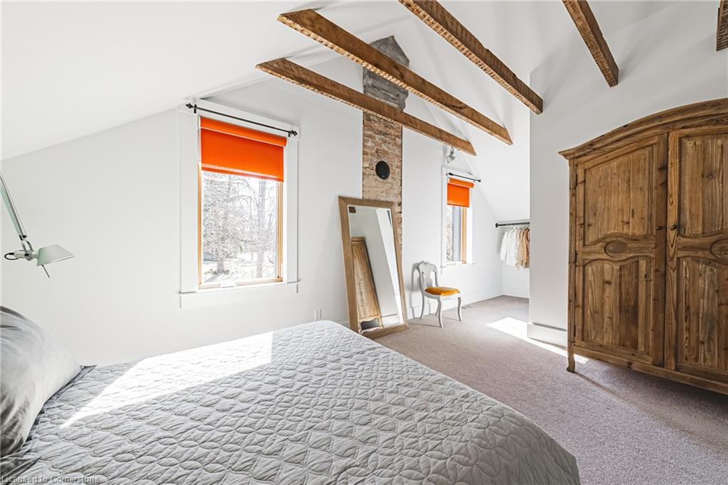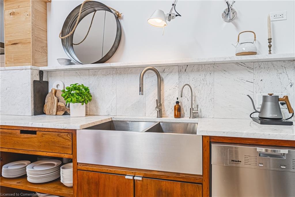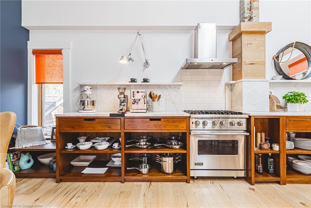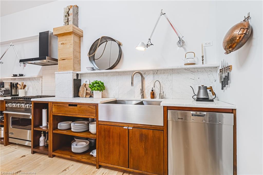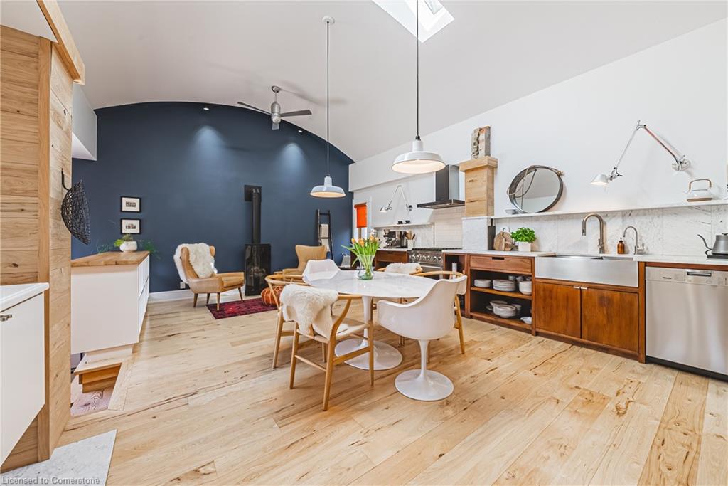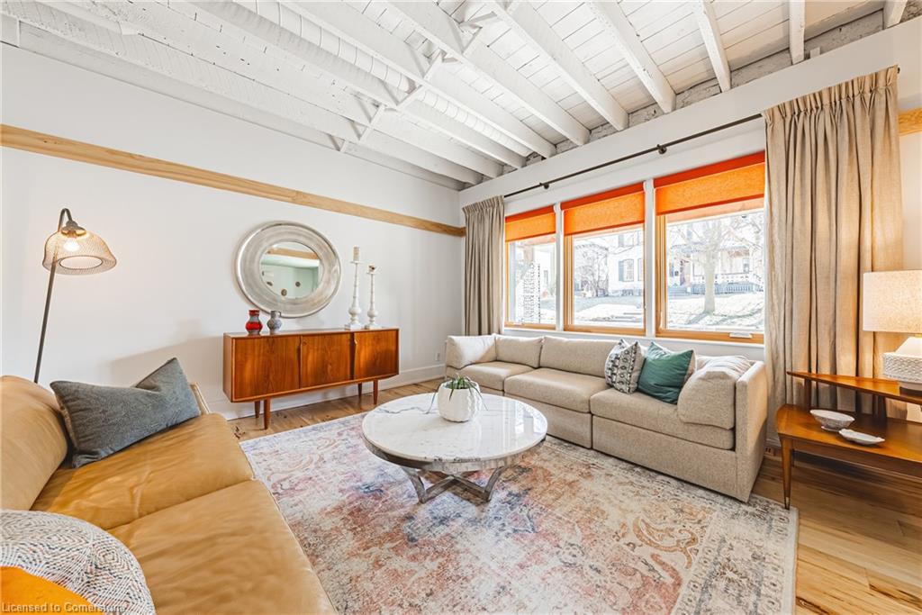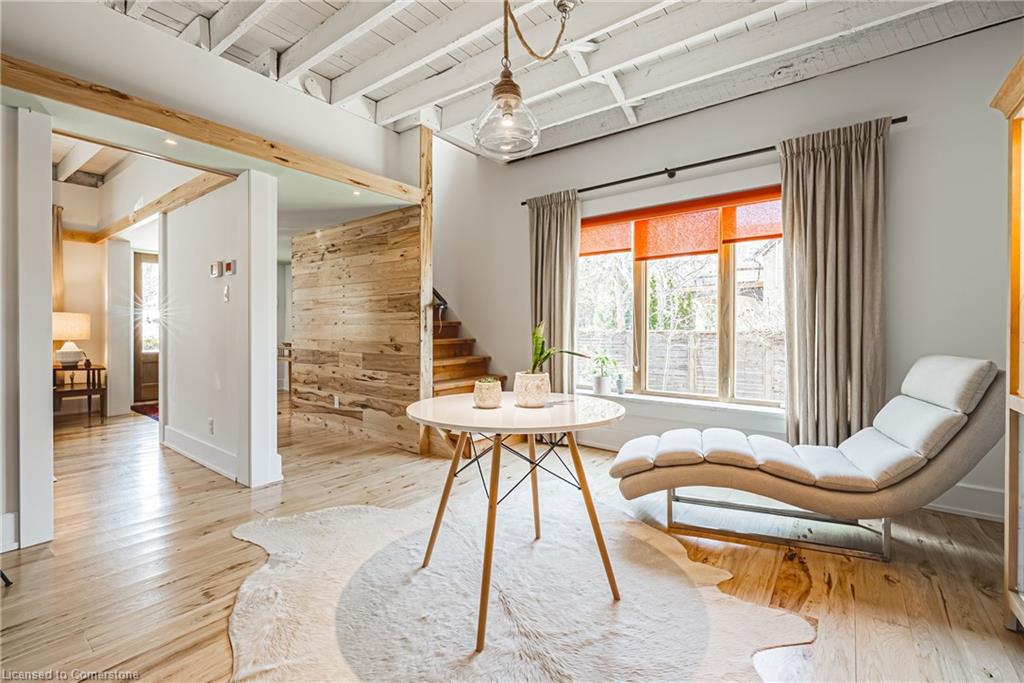 Architectural Gem in Uptown Waterloo – A rare opportunity to own a one-of-a-kind home in the heart of Waterloos Mary Allen neighbourhood. Built in 1886, this property blends historic character with a modern Scandinavian-inspired design across 2,000 sq ft of carefully renovated living space. Exposed original beams and brick, a dramatic curved arched ceiling in the expansive great room, and loft cut-outs in the bedrooms provide aerial views of the living spaces below and the sky above. Hickory flooring and Carrara marble flow throughout the home, complementing its refined design. The heart of this home is the custom, European-inspired kitchen featuring a bespoke unfitted layout and high-end stainless steel appliances (Viking gas range, Liebherr fridge, Miele dishwasher), designed for both style and functionality. Natural light fills the space, enhancing its open, airy feel. The propertys fully landscaped gardens have been recognized for their design and year-round appeal. Thoughtfully planned outdoor spaces offer areas for dining, gathering, and enjoying the changing seasons, seamlessly extending the homes living space into nature. Located in a highly walkable neighbourhood, with a strong sense of community, most errands can be accomplished on foot. This is truly a unique home that stands out not just for its history but for its modern enhancements and unique character. Dont miss the chance to own this exceptional home everyone wants but only you can have.