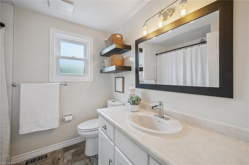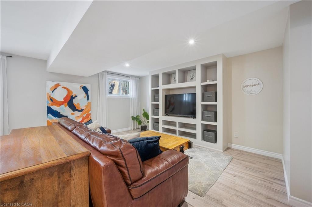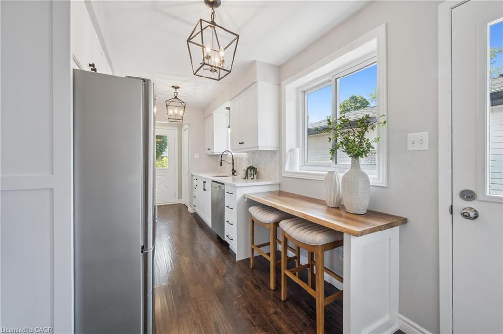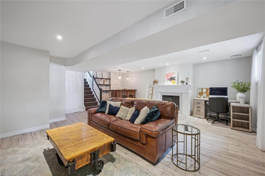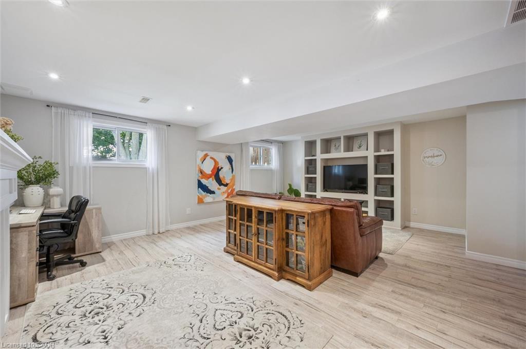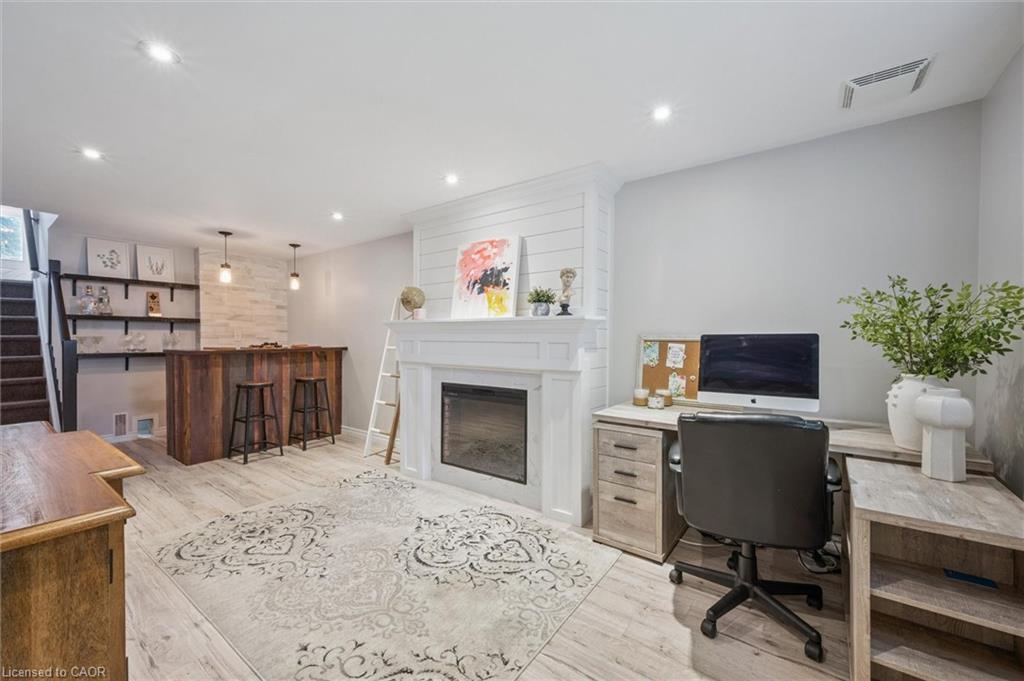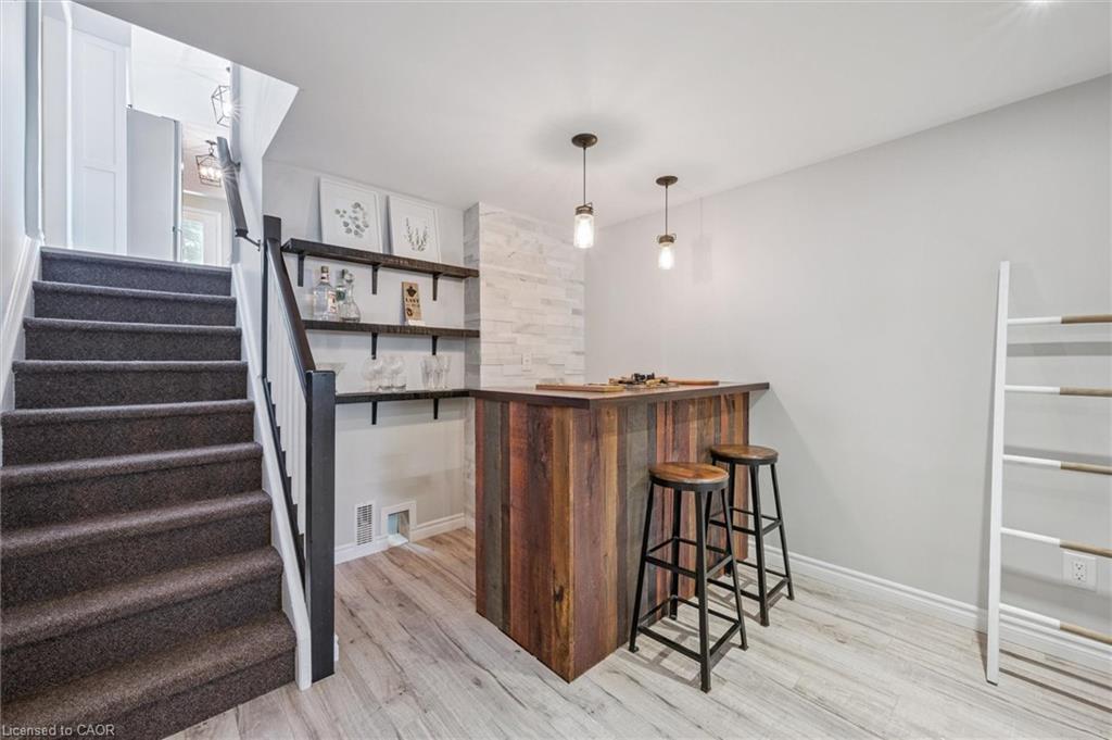 Upstairs, you’ll find three spacious bedrooms and a 4-piece main bath. The stunningly renovated lower level is perfect for entertaining, complete with a generous recreation room, a built-in bar with bar fridge, laminate flooring, an electric fireplace, and custom built-in shelving. A stylish 3-piece bath completes this level.