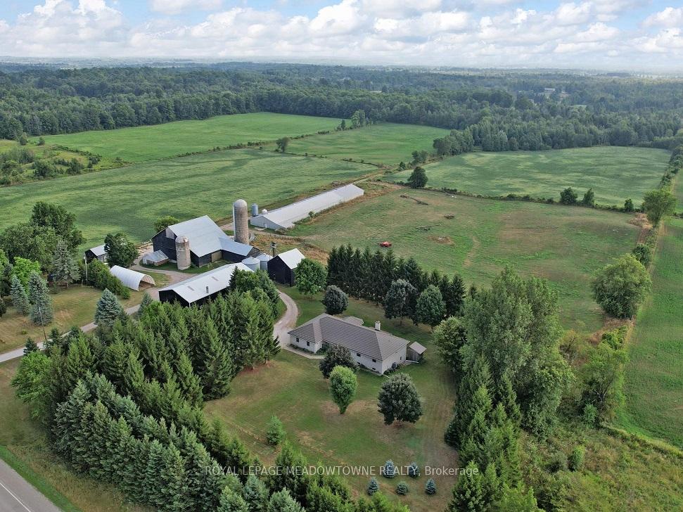After five generations in the same family, this property is now ready for the next family to carry on the tradition and build their own legacy. Set on 98.89 acres, this 2001 custom-built brick and stone bungalow with a walk-out basement offers 4,600 SF of living space and is perfectly suited for family living, a home-based business or a country retreat. The main floor features a bright, eat-in kitchen with a large centre island and walk-out to a deck. A formal dining room with pocket doors, an open-concept great room, and a spacious principal bedroom with ensuite and walk-in closet create a comfortable and inviting living area for everyday enjoyment. The part-finished lower level provides exceptional versatility with a 2nd kitchen, a 3-pc bath, a 2nd laundry area, and a private entrance from the oversized two-car garage. It is ideal for extended family, guest accommodations, or work-from-home needs. Recent updates include a propane furnace and central air (24) and a durable metal roof (14). The land provides endless lifestyle, recreational and income opportunities. 40 acres of open fields and 25 acres currently in hay offer space for hobby farming, equestrian use, personal riding trails, outdoor recreation, or renting for crop income. There is a mature forest for tapping maple syrup or use the trails for walking and ATVs. The 48′ x 288′ former broiler barn with heaters & cold storage, 3,900+ sq ft bank barn w/stables & loft, a 40′ x 80′ drive shed w/heated and insulated workshop, other outbuildings provide flexibility for storage, workshops, hobbies, home-based operations and rental income. There maybe a possible severance potential in the southeast corner (to be verified with the Town of Erin). OFA credits reduce property taxes. Two drilled water wells. Acton’s GO Station, stores, shops, schools and everyday services are just mins away. The property in the Town of Erin with an Acton municipal address and closer to Acton, Georgetown, Guelph, Milton, Rockwood.