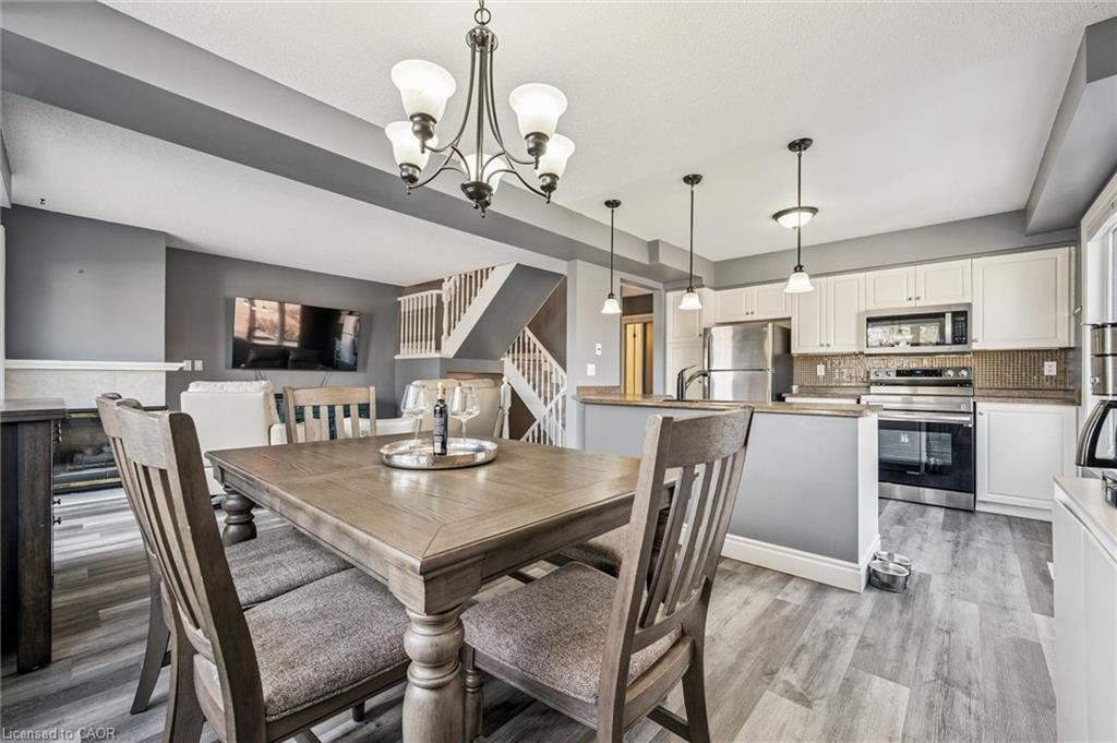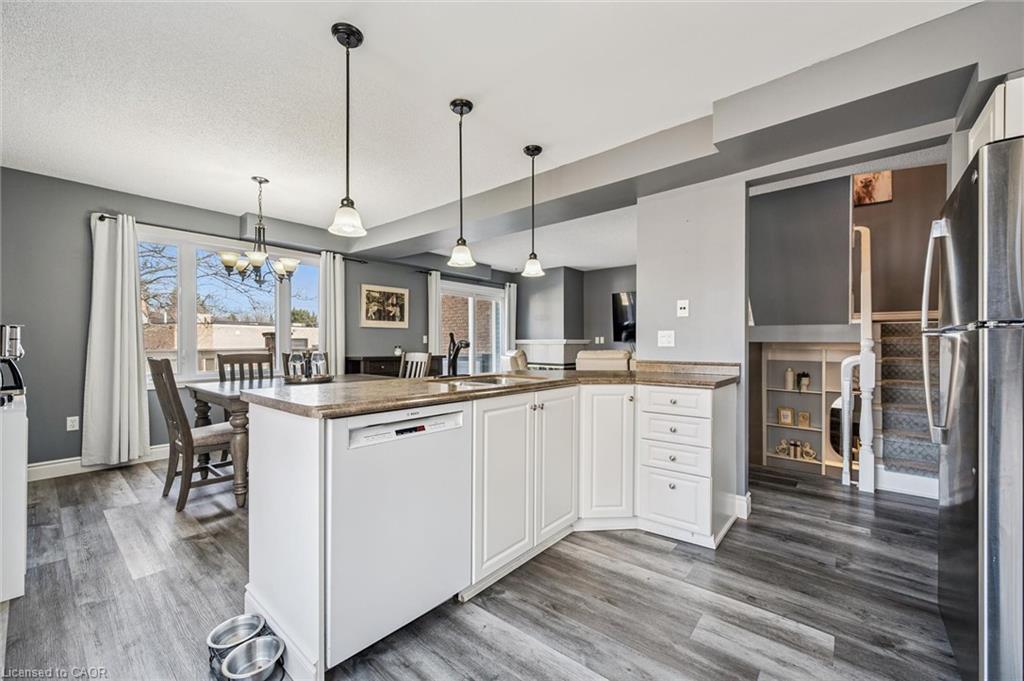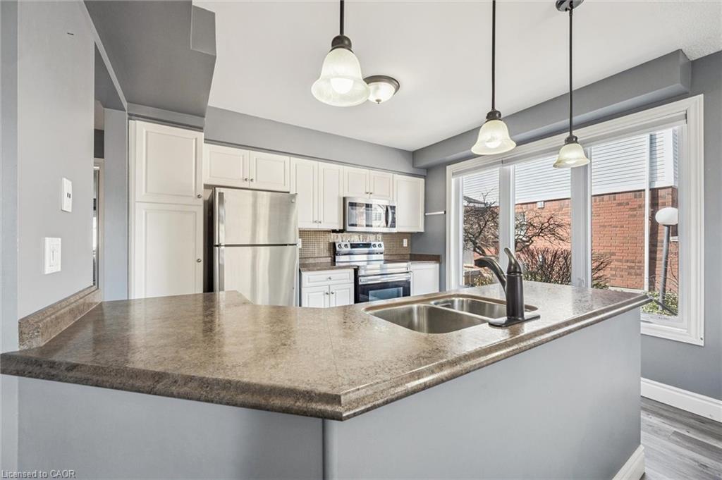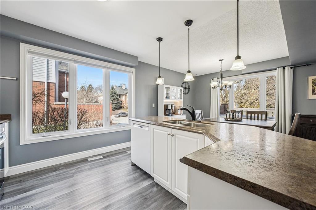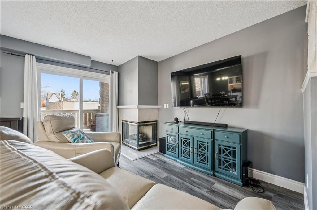 Little maintenance. 3 bedrooms. More living. 1487sf. of total livable space. Rare three bedroom opportunity at Parc Place. Tired of snow shovels & lawn mowing? This home offers a simpler way to live. Welcome to Parc Place, a sought-after community where the exterior work is handled for you. Snow removal, lawn care & building maintenance are covered by the condominium, freeing up your time to enjoy life instead of maintaining a home. Spend summer afternoons at the private pool and sauna, challenge friends to a match on the tennis or pickleball courts, or simply relax on your own outdoor retreat. The oversized 266sf terrace feels more like a private courtyard than a typical condo patio, with plenty of space for lounging, dining & summer evenings with friends, a rare amount of outdoor space for a condo townhome. Inside, this bright townhouse benefits from large windows that fill the home with natural light. The main floor features a welcoming open layout where the kitchen, dining & living areas flow naturally together, ideal for everyday living & entertaining. The kitchen’s angled peninsula offers generous counter space & breakfast bar seating, keeping the cook connected to the conversation, while the living room with corner gas fireplace opens directly onto the terrace, creating seamless indoor-outdoor living. A major advantage here is the rare three bedroom layout, something many units in the complex simply do not offer, perfect for family, guests or a home office. The primary bedroom includes a walk-in closet & private ensuite, while two additional bedrooms & another full bathroom complete the level. The finished lower level adds flexible space for a family room, gym, or media area, along with laundry, storage & direct access to the garage. Set within a quiet, well-managed community known for its mature landscaping & resort-style amenities, the home is steps from Manhattan’s Bistro & minutes from the University of Guelph, parks & abundant shopping.