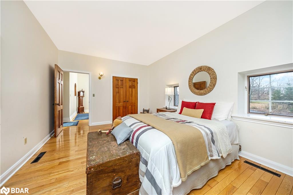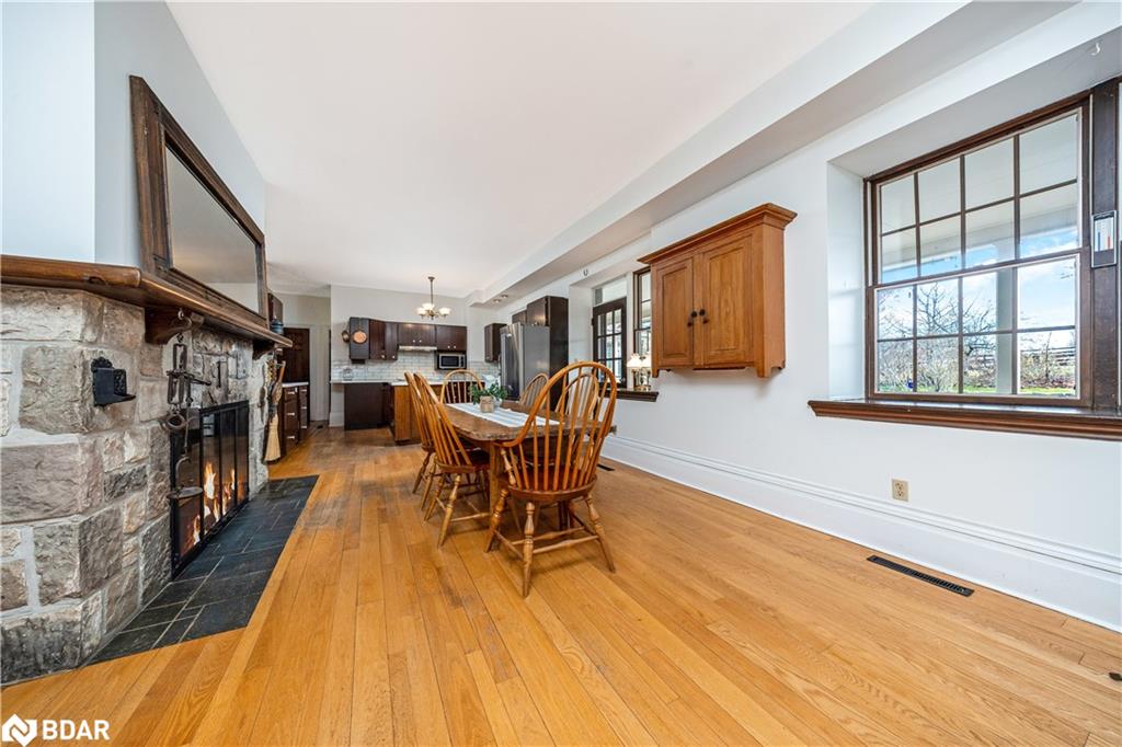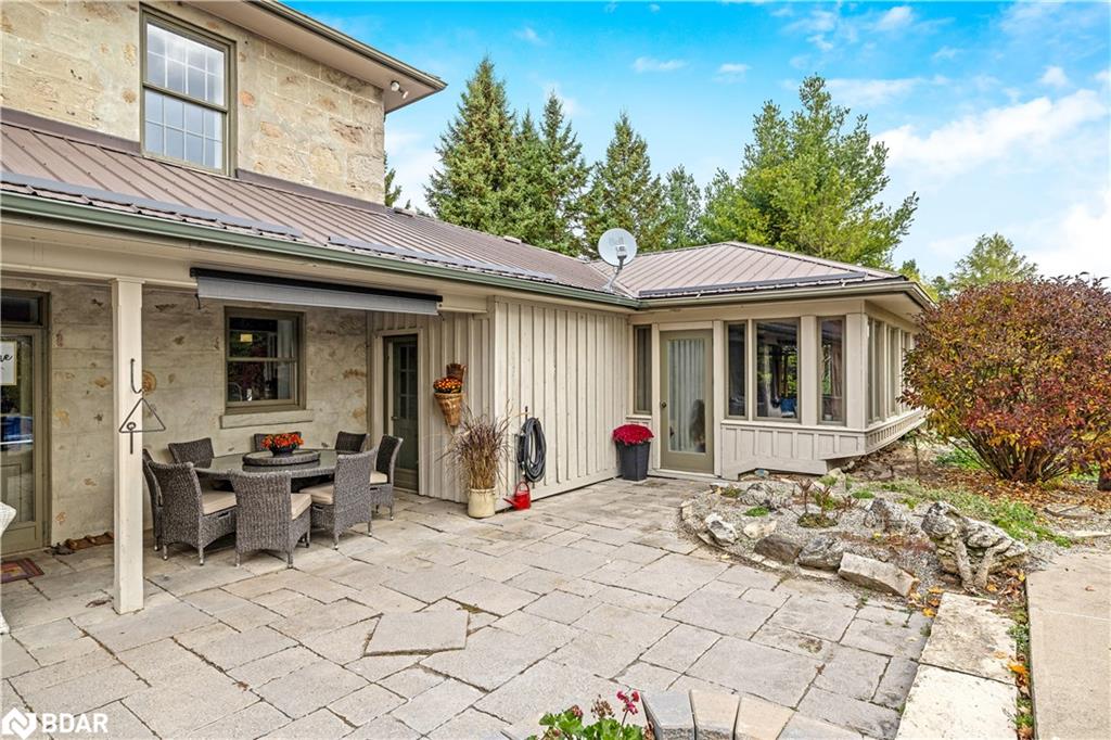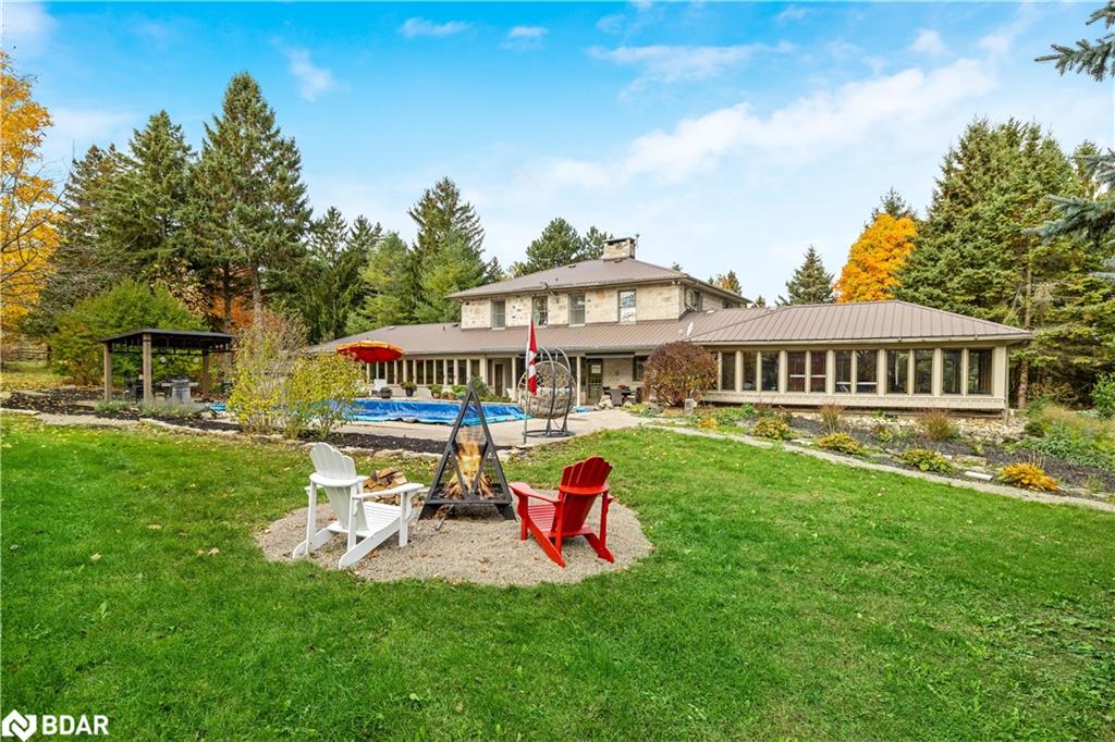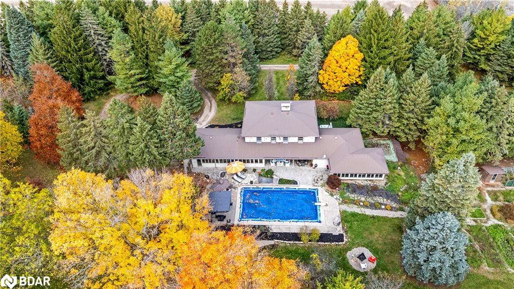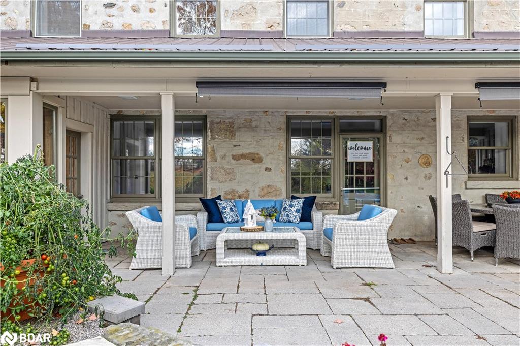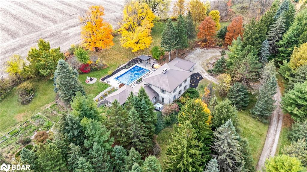 This circa 1875 fieldstone farmhouse has been thoughtfully redesigned by architect Grant A. Whatmough and is set on approximately 99 acres behind a gated entry. Maintaining classic charm and modern convenience, this property is ready for a new family to carry on the tradition. The main floor welcomes you with a double door entry leading into a spacious open concept kitchen and large living area highlighted by a stone fireplace and deep windowsills. The kitchen features Corian counters, stainless steel appliances, a center island, and walkout access to a covered stone patio and in ground pool. Enjoy cozy breakfasts by the wood burning fireplace or host larger gatherings in the formal dining room. A rare main floor primary suite offers hardwood floors and a walkout through double French doors to a sunroom with heated floors overlooking the perennial filled backyard and pool. The spa style ensuite includes heated tile floors, a double glass shower, and a soaker tub. Upstairs, you will find four bright and spacious bedrooms, each with closets and windows overlooking the private property. Along with the added ceiling height, this level features two updated baths, upper level laundry, and generous closet space. Outdoor living is highlighted by a 20 x 40 geothermal heated marbelite pool with diving board, a flagstone patio, and a covered entertainment area complete with a pizza oven and cooking space. A heritage post and beam barn with hayloft, a secondary garage or shed, and a silo enhance the property’s charm. Mechanically, the home offers dual geothermal systems for the house and pool, radiant in floor heating, two drilled wells, and an active lease on approximately 52 workable acres. Trails and a 21 acre woodlot provide endless opportunities for exploration. This one of a kind rural retreat is just minutes from town amenities and ready for its next family to enjoy.