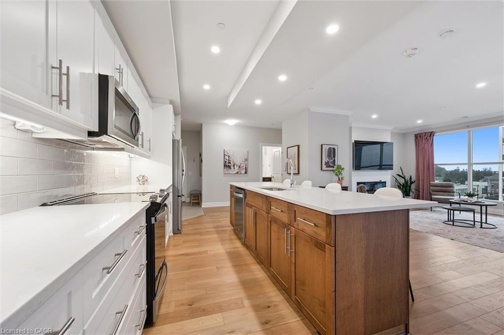 Situated in the prestigious Gordon Square Towers, Suite 505 is an exceptional executive 2 bedroom + den corner residence that is a show stopper! Designed for those who value elevated living, this luxurious condominium showcases floor-to-ceiling windows framing breathtaking views from every room, flooding the space with natural light and highlighting the soaring ceilings and rich engineered hardwood . The beautifully appointed kitchen flows effortlessly into the open-concept living area, creating a refined yet comfortable setting ideal for entertaining, working from home, or simply unwinding at the end of the day. The expansive primary suite offers a peaceful retreat with a gorgeous ensuite, while the versatile den provides flexibility as a home office, guest space, or media room. Perfectly suited for professionals, down sizers seeking turnkey luxury, or executive buyers craving low-maintenance living without compromise. Residents of 1800 Gordon enjoy an unmatched lifestyle with thoughtfully curated amenities including a fitness centre, golf simulator, and an impressive SkyLounge with billiards and a wet bar, plus a lovely guest suite, all designed to extend living beyond the suite itself. Set in South Guelph’s most sought-after, amenity-rich neighbourhood, this remarkable residence offers a rare blend of sophistication, convenience, and community – a truly elevated way of life.