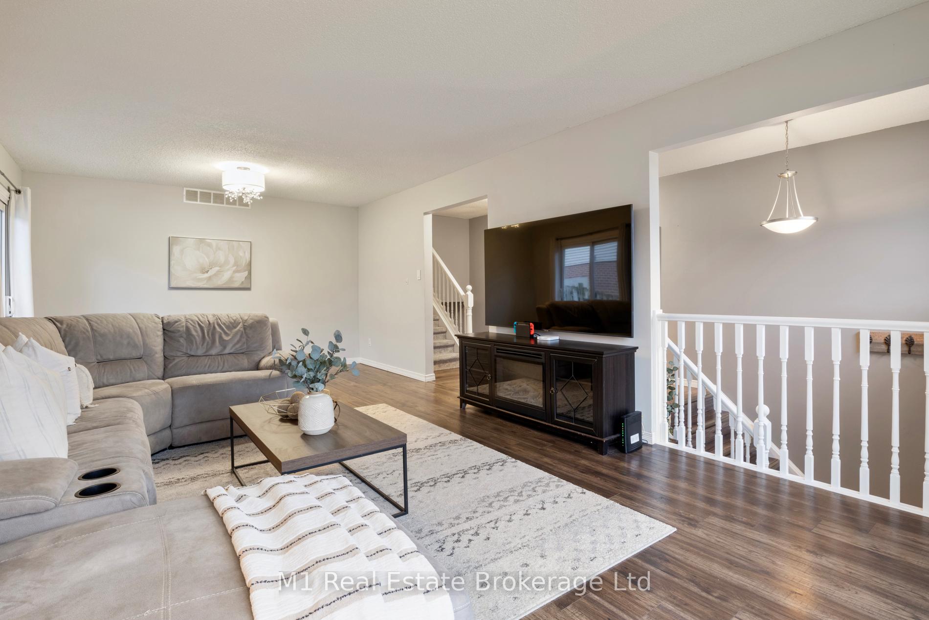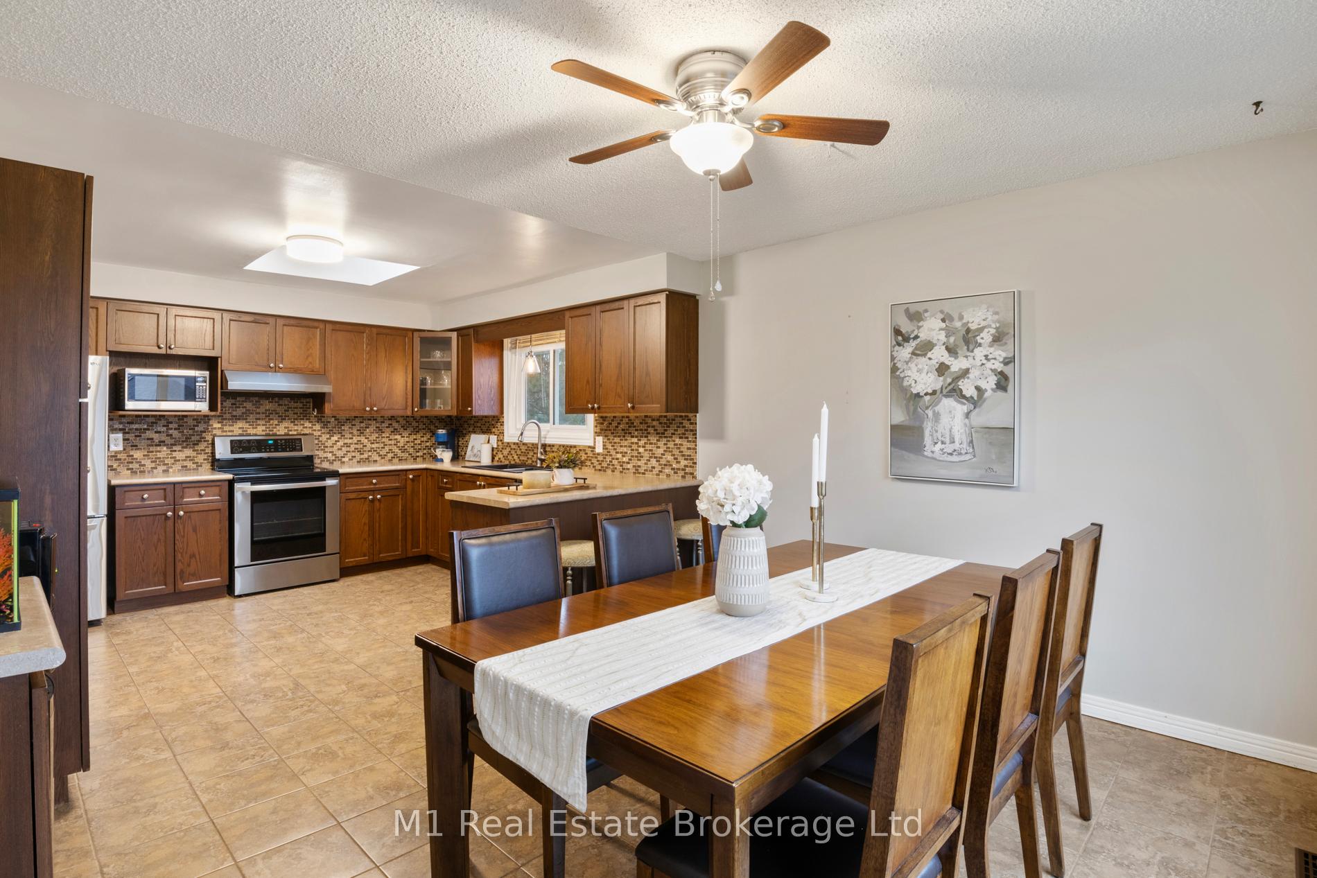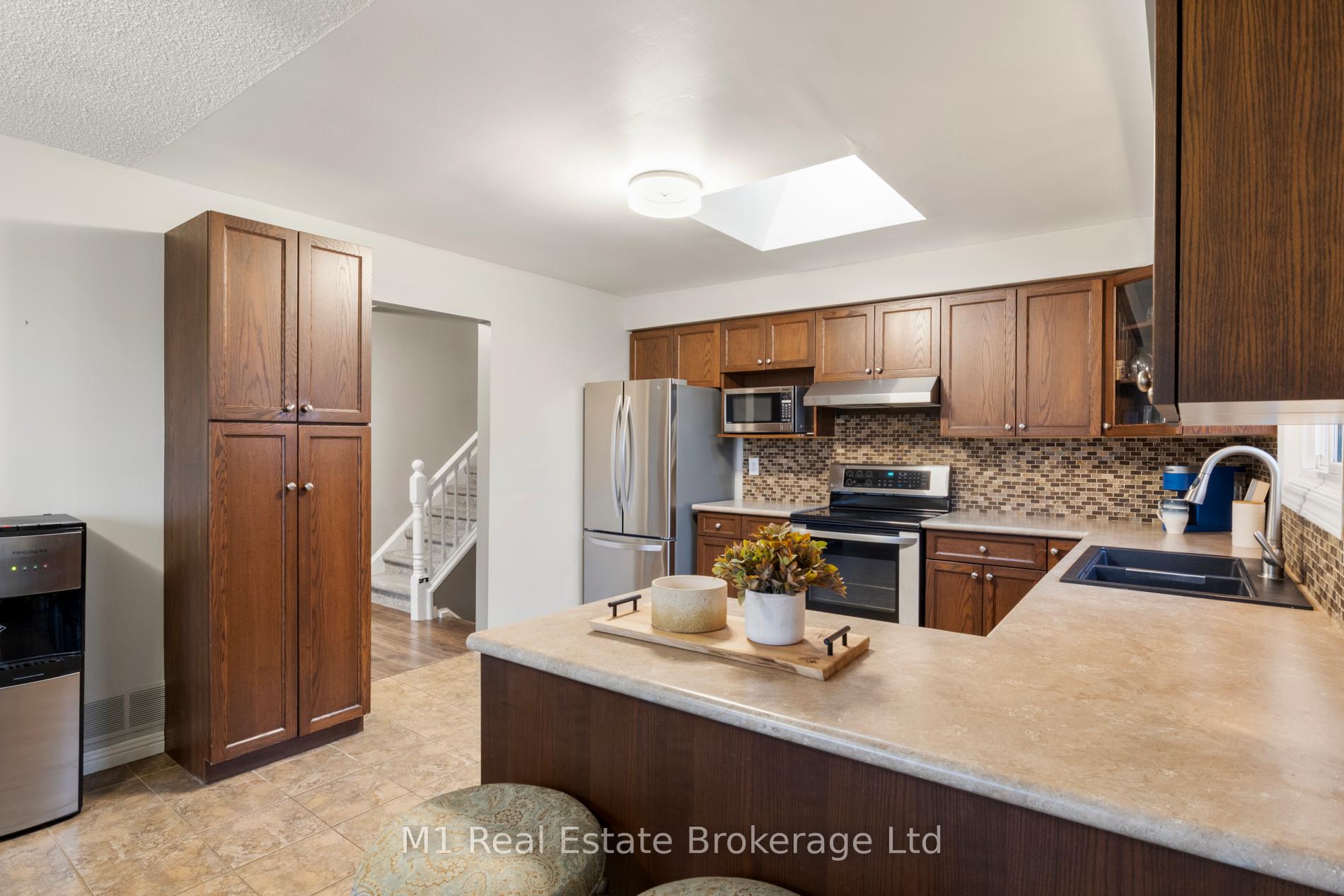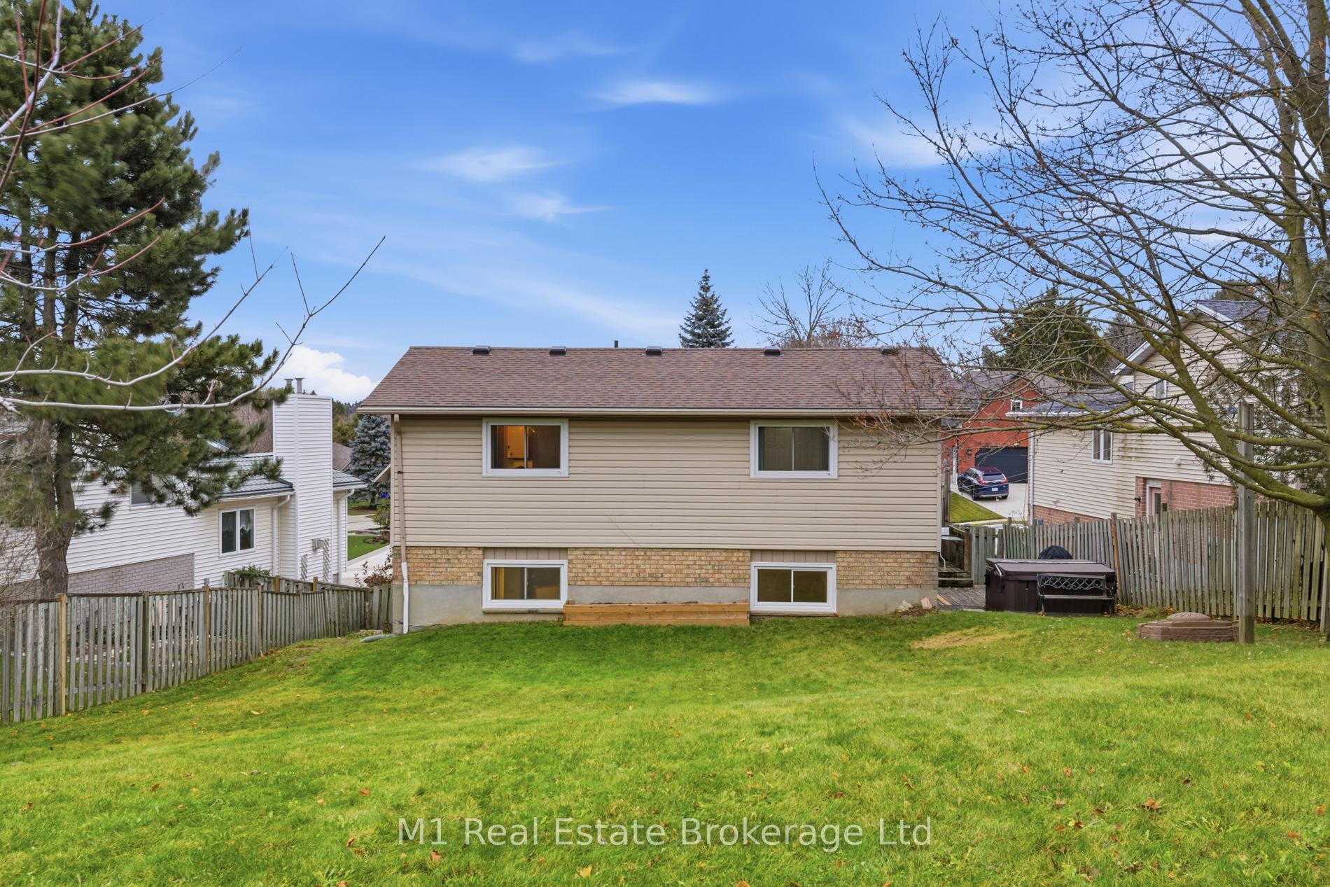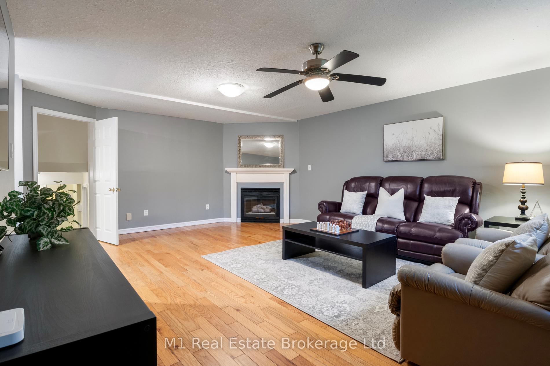 Spacious backsplit in a mature Fergus neighbourhood offering over 2,000 sq. ft. of finished living space and a great family-friendly layout across four levels. Three bedrooms upstairs plus a fourth on the lower level, along with three bathrooms including a 3-piece ensuite. Bright kitchen with 2020 appliances opens to the dining area with large windows and a skylight. The main living room walks out to the large backyard, while the lower-level family room features a gas fireplace and a separate entrance-ideal for extended family or in-law potential. Major updates include: furnace (2019), A/C (2020), carpet (2020), water softener (2020), roof (2026), ensuite (2021) andmain bath (2024). Convenient location close to downtown Fergus, the Grand River, trails, Sportsplex, schools, and an easy commute toward Guelph.