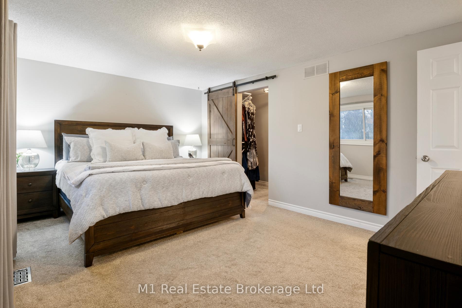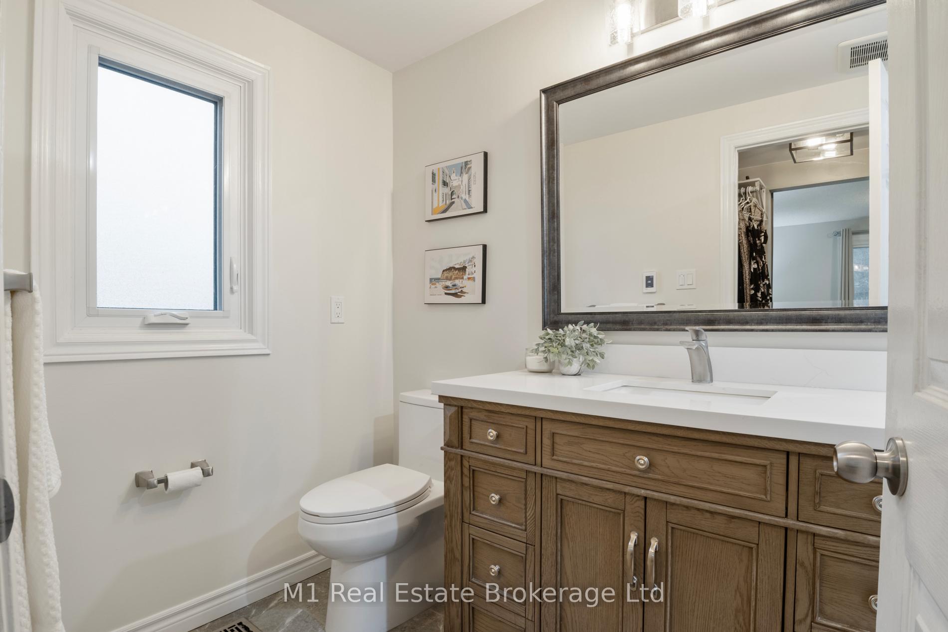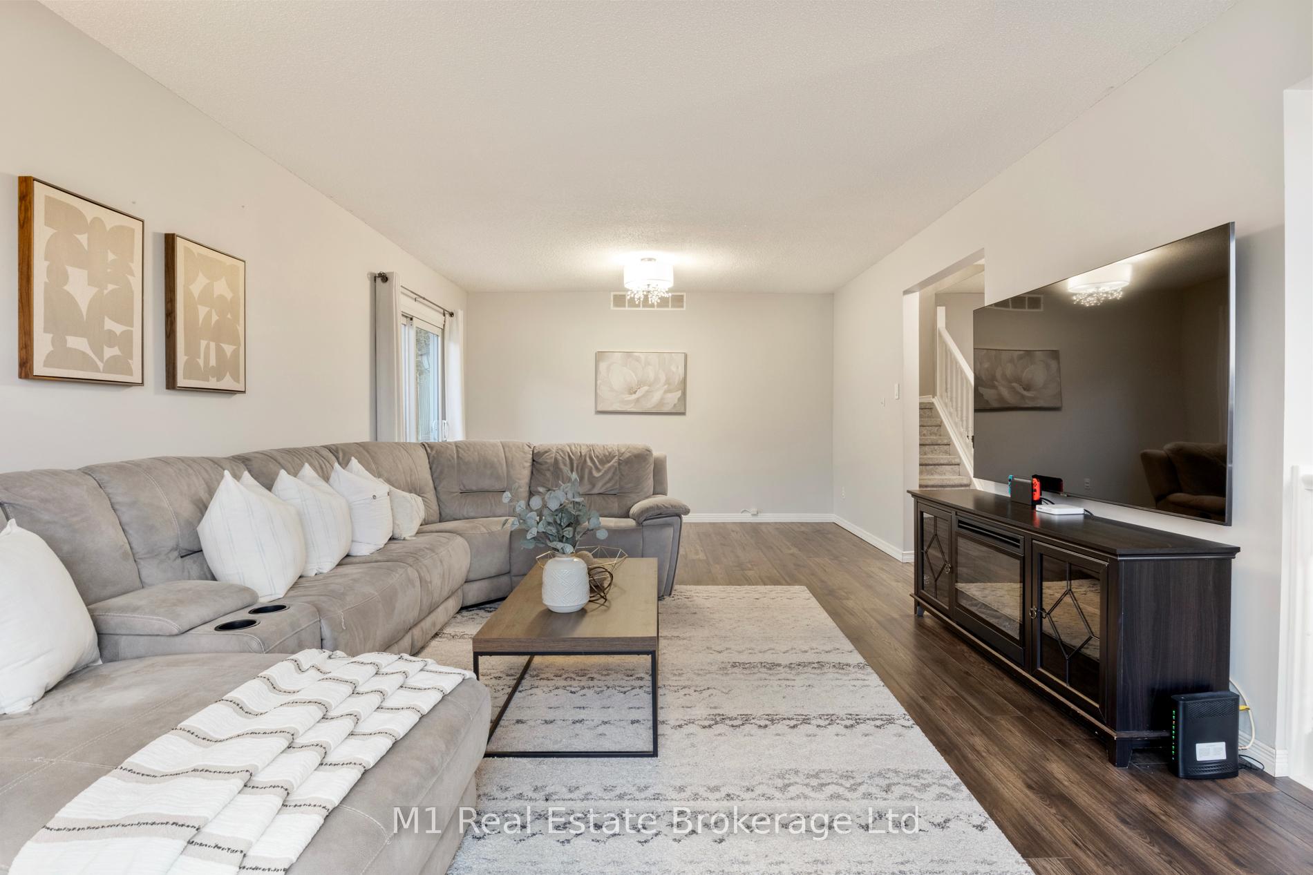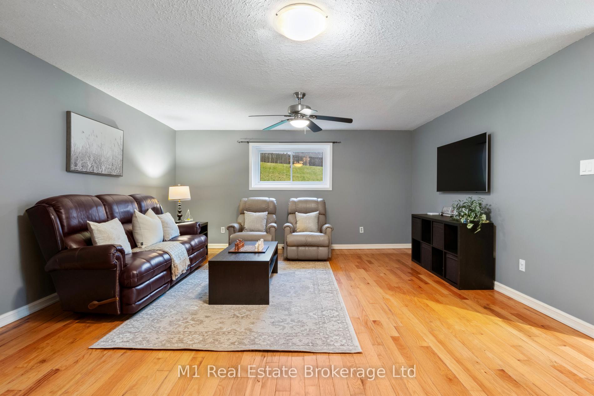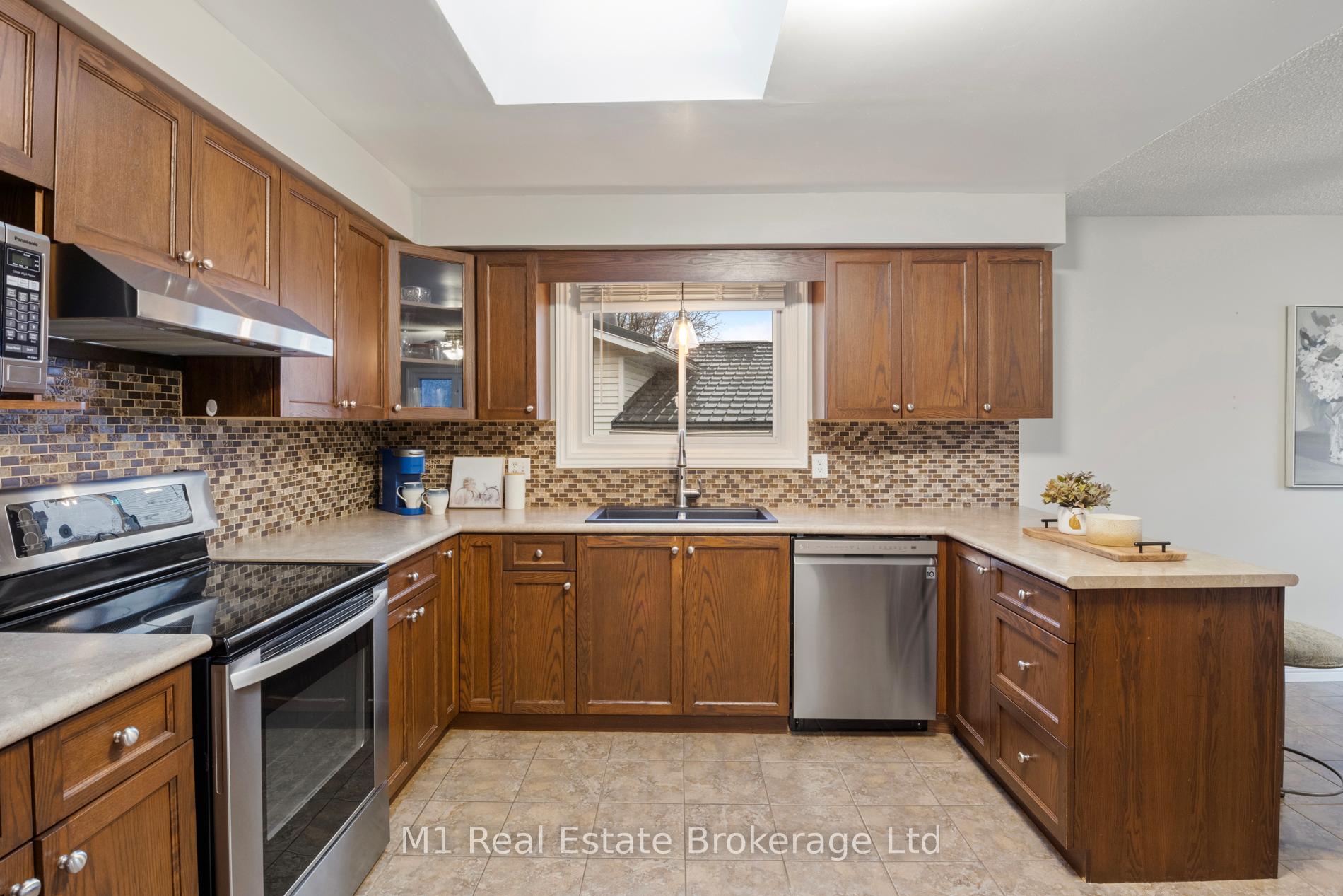 Spacious backsplit in a mature Fergus neighbourhood offering over 2,000 sq. ft. of finished living space and a great family-friendly layout across four levels. Three bedrooms upstairs plus a fourth on the lower level, along with three bathrooms including a 3-piece ensuite. Bright kitchen with 2020 appliances opens to the dining area with large windows and a skylight. The main living room walks out to the large backyard, while the lower-level family room features a gas fireplace and a separate entrance-ideal for extended family or in-law potential. Major updates include: furnace (2019), A/C (2020), carpet (2020), water softener (2020), roof (2026), ensuite (2021) andmain bath (2024). Convenient location close to downtown Fergus, the Grand River, trails, Sportsplex, schools, and an easy commute toward Guelph.