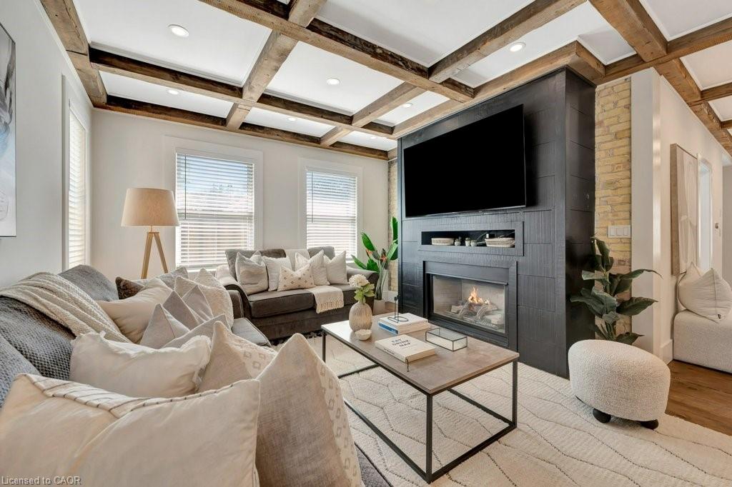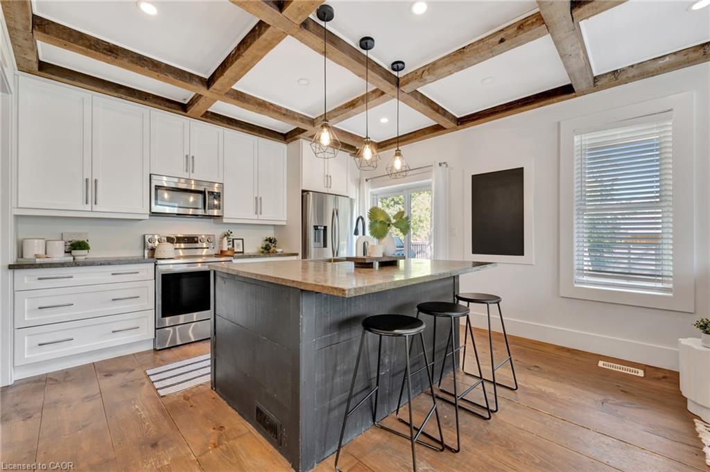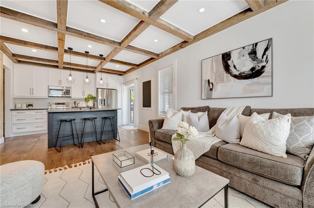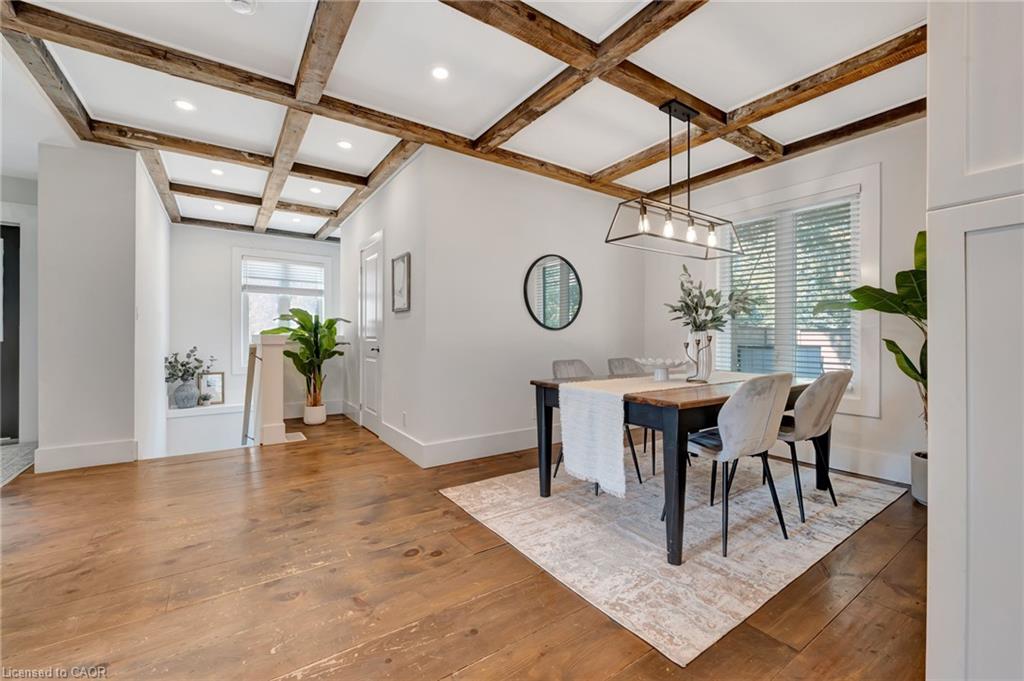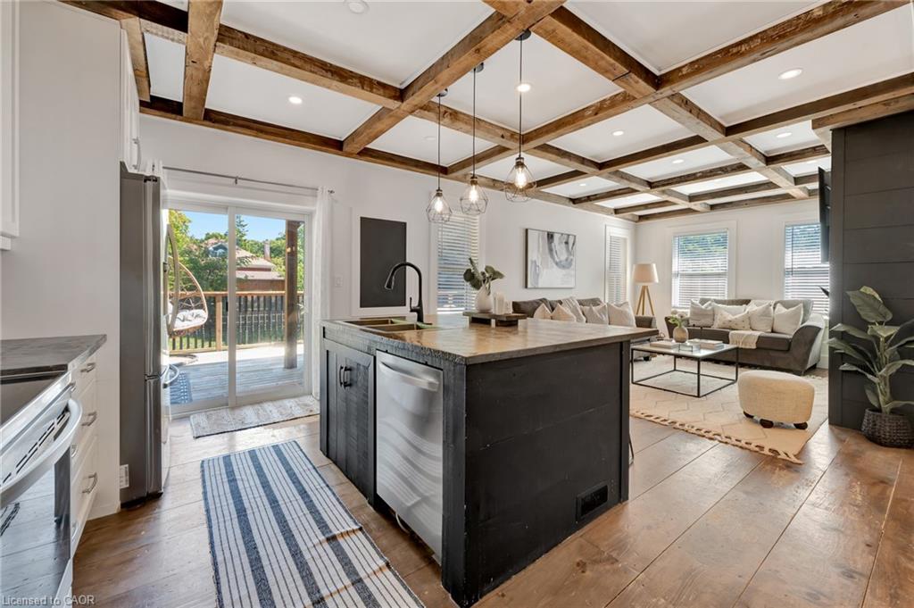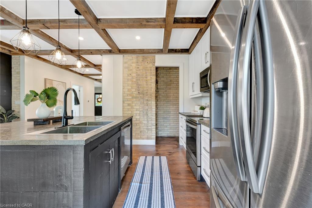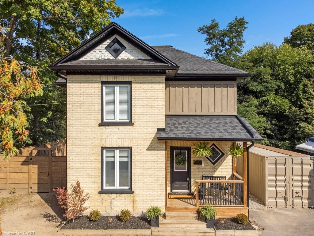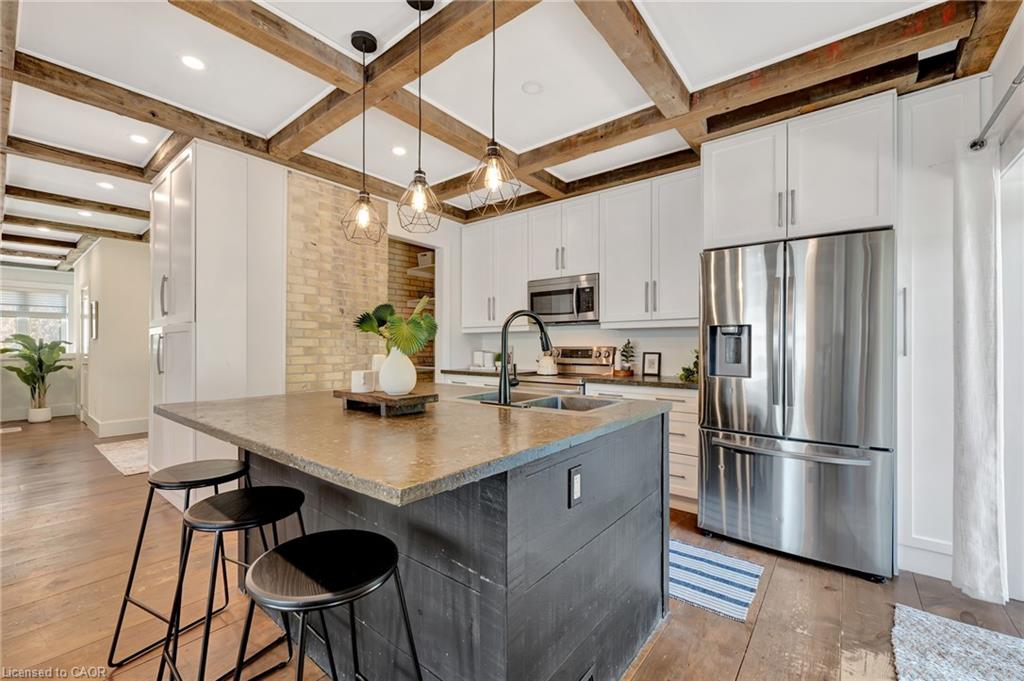 This yellow-brick century home in the Hespeler community is full of charm and character, with the benefit of a thoughtful addition completed in 2018. Inside, you’ll find details like exposed wood beams, wide plank floors, and a welcoming living room centered around a beautiful fireplace. The updated kitchen offers a large island with breakfast bar seating and connects to a separate dining room, perfect for family meals or entertaining.
