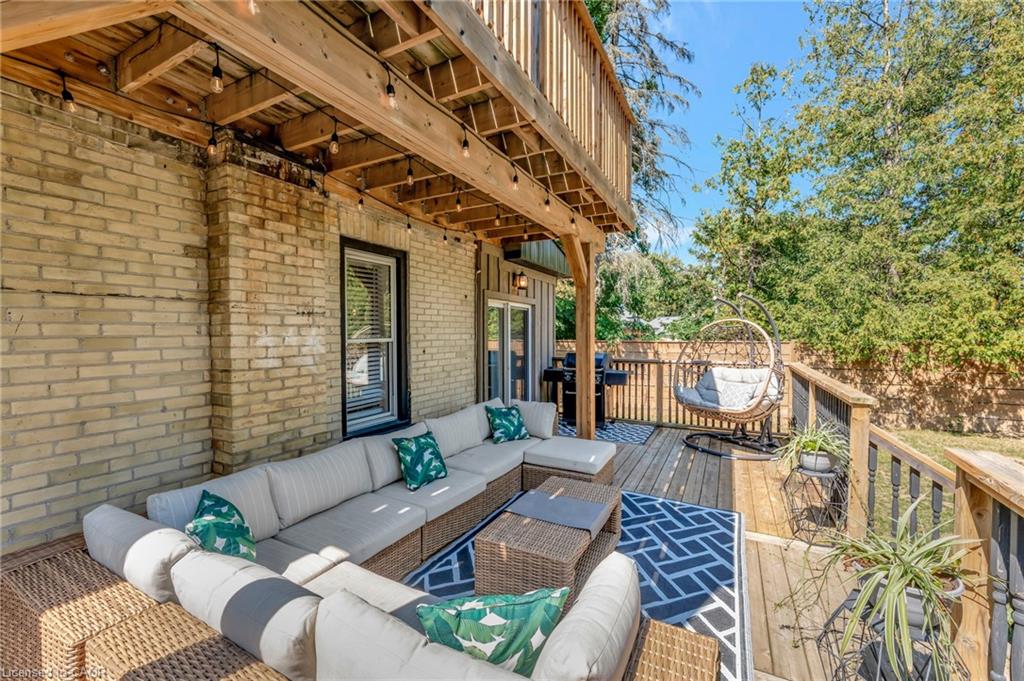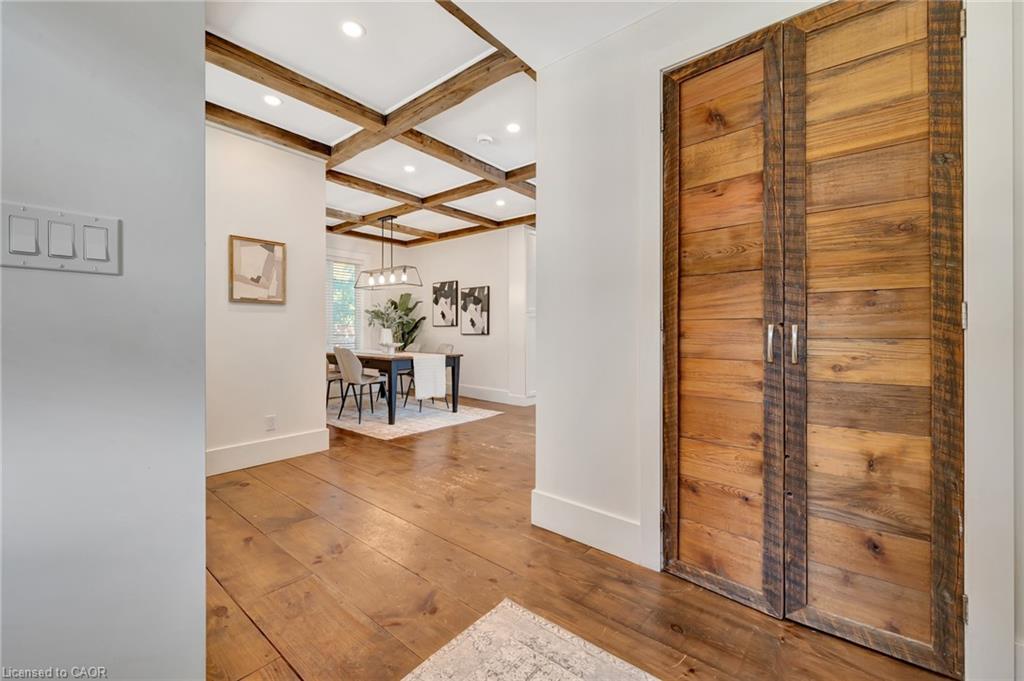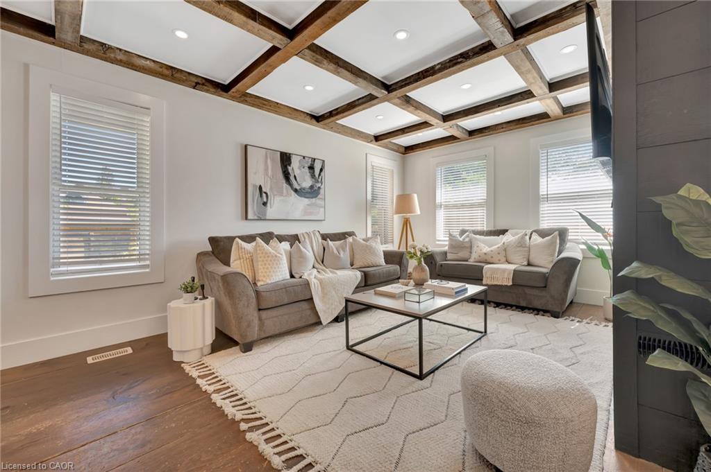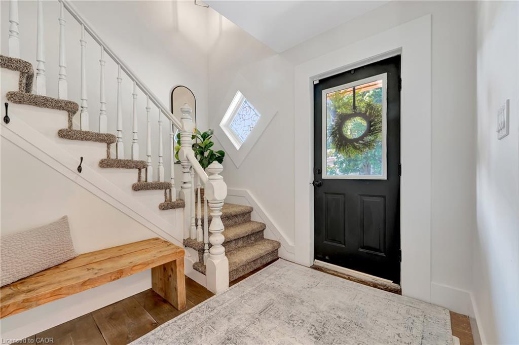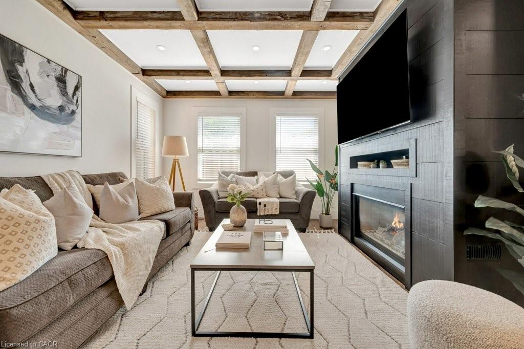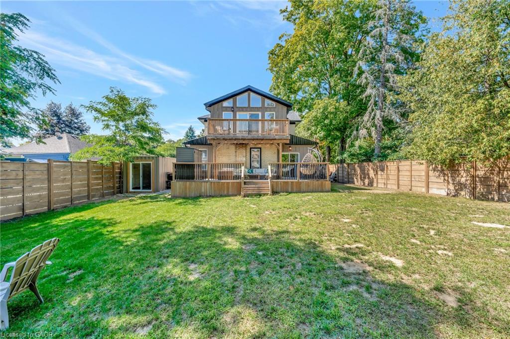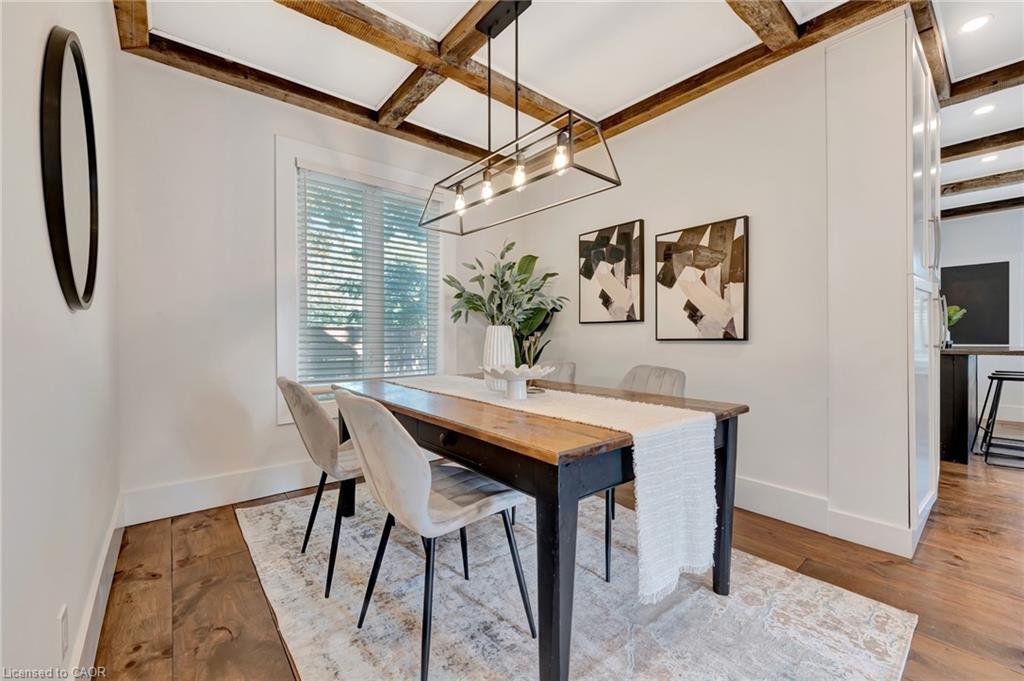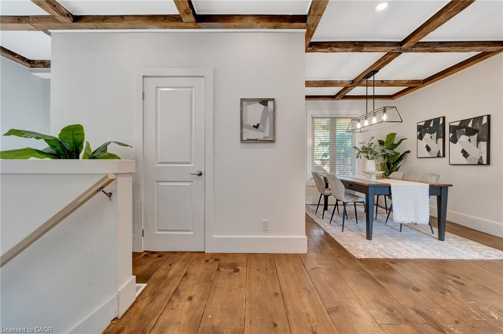 This yellow-brick century home in the Hespeler community is full of charm and character, with the benefit of a thoughtful addition completed in 2018. Inside, you’ll find details like exposed wood beams, wide plank floors, and a welcoming living room centered around a beautiful fireplace. The updated kitchen offers a large island with breakfast bar seating and connects to a separate dining room, perfect for family meals or entertaining.