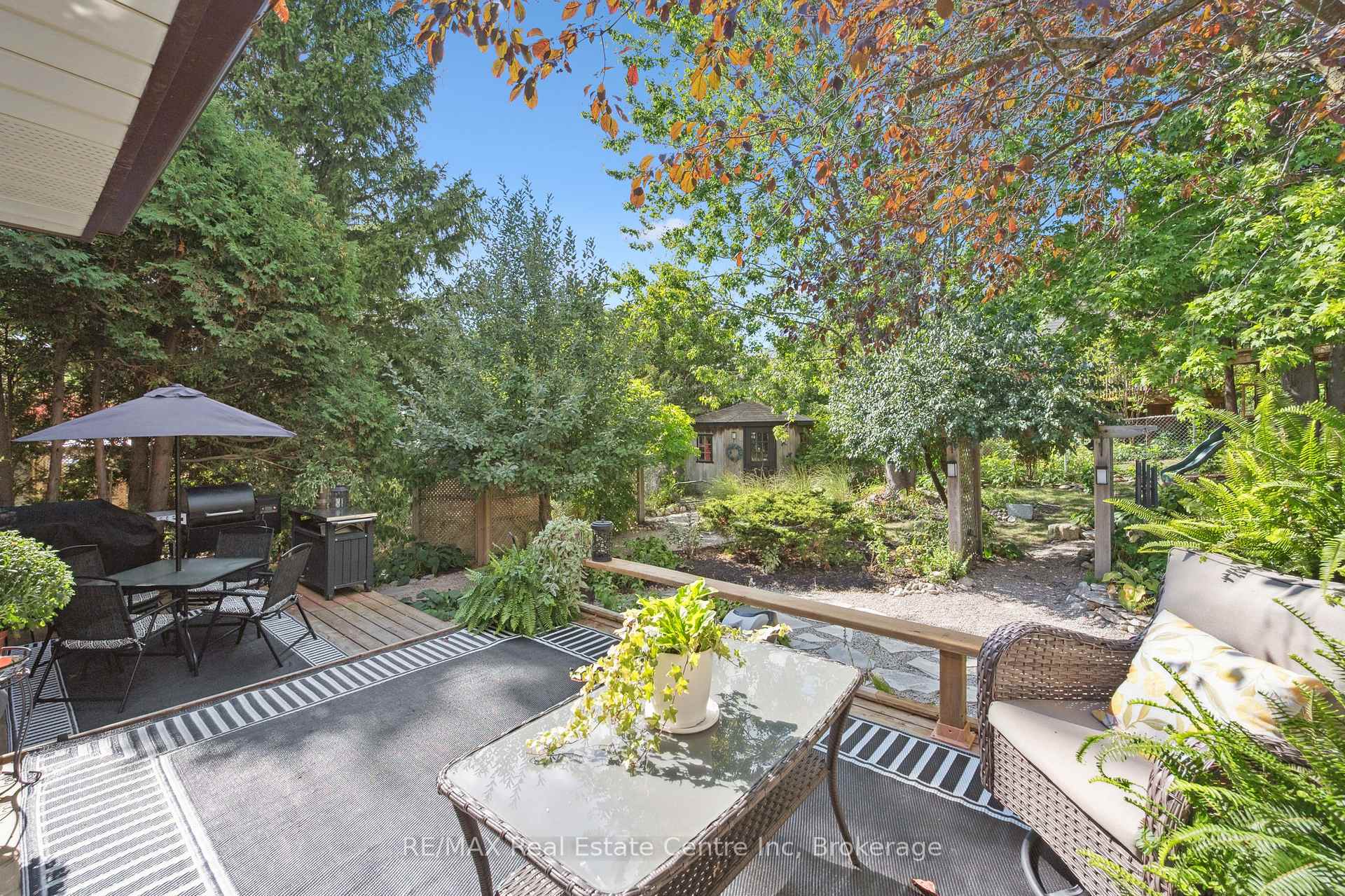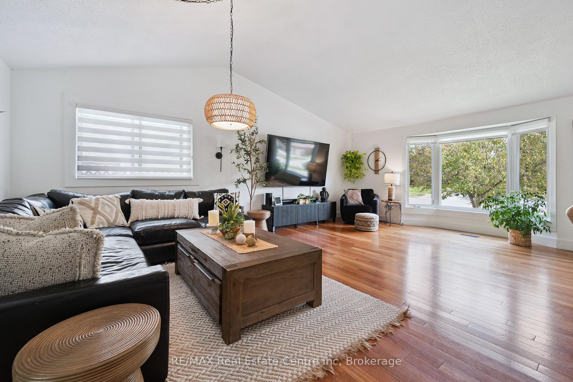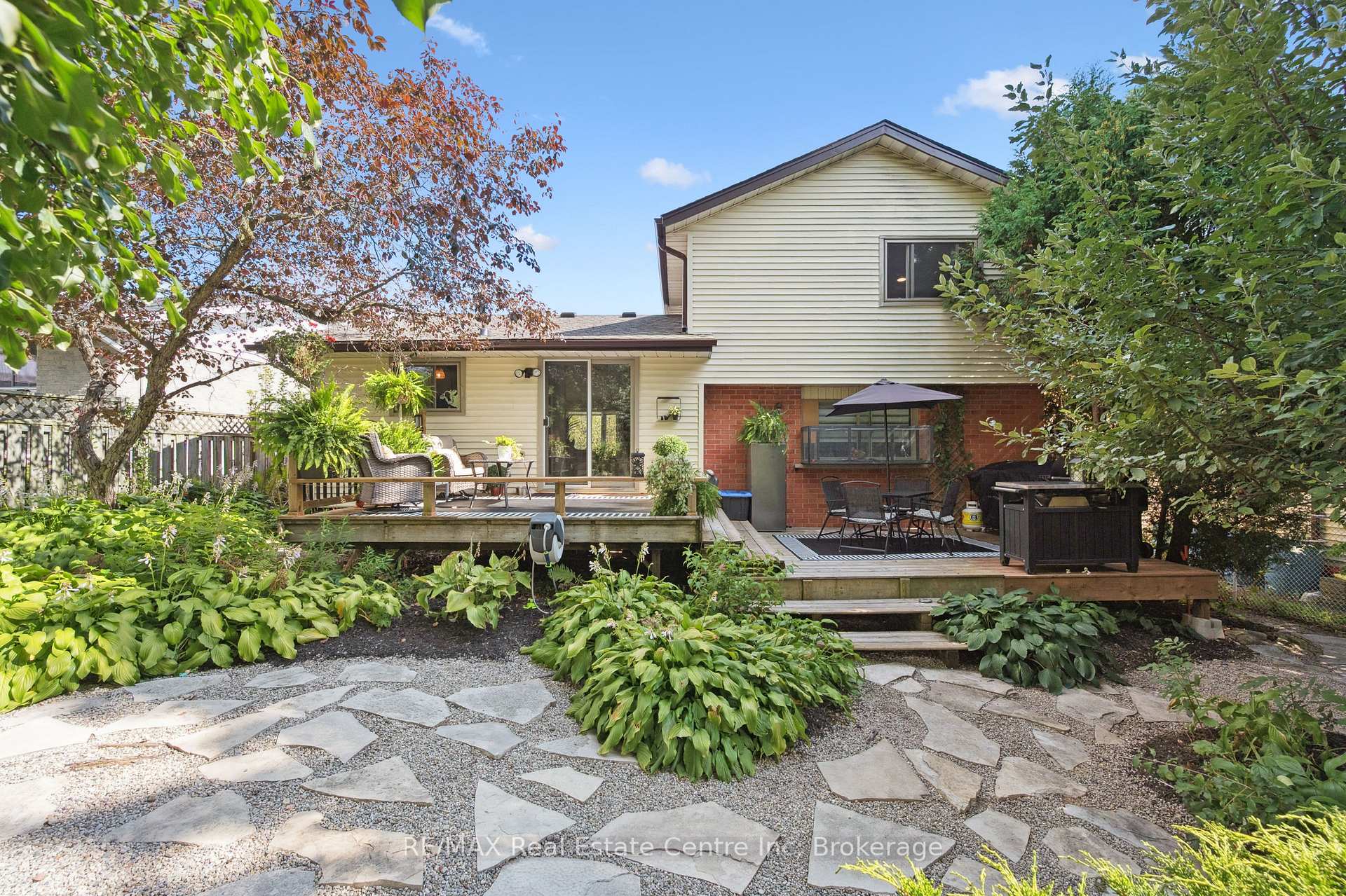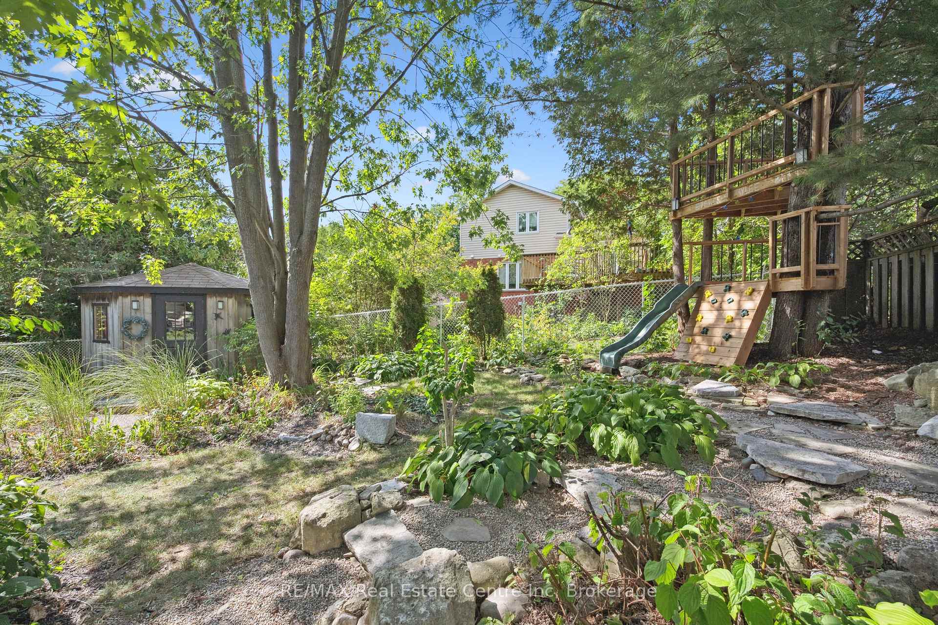 Welcome to 53 Rochelle Drive, a side split that blends thoughtful updates with a backyard retreat, which has been part of the Guelph Horticultural Society home tours and still could be, is a wonderful accolade. The curb appeal is warm and inviting, leading to a foyer with a convenient powder room. The open concept main level will impress with cathedral ceilings and gleaming hardwood floors, an ideal space for hosting and family gatherings. The bright kitchen has been modernized with new cabinetry, hardwood flooring, updated appliances, a live edge counter, and a bar fridge, which overlooks the dining area and with sliders to the back deck. It keeps everyone connected, whether entertaining inside or out. Upstairs, three bedrooms and a 4 piece skylit bath await, including a primary suite with a 3 piece ensuite and custom door. The lower level expands your living space with a large recreation room, craft room, workshop with laundry plumbing, a rough-in for an additional bath, and ample storage.. Outside, the two tier deck opens to a whimsical yard featuring perennial gardens, a vegetable plot, a spacious shed, and a brand new two level treehouse for the kids. All of this comes in a family friendly location just a short walk to Taylor Evans Public School. Everyday amenities, shopping, dining, and major commuter routes are close by, while nearby parks and trails provide endless recreation. From the welcoming curb appeal to the whimsical yard, every detail of 53 Rochelle Drive has been crafted with family living in mind. This is a home ready to be cherished for years to come…