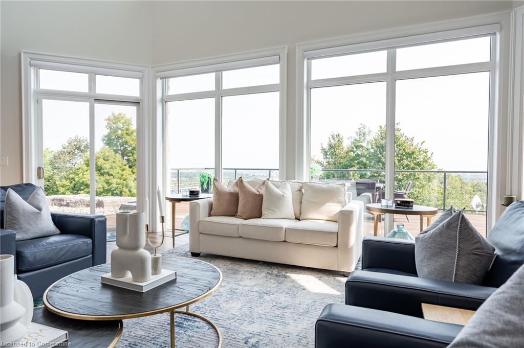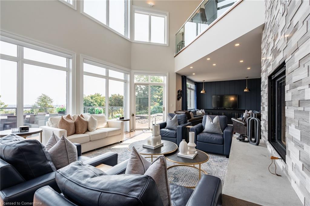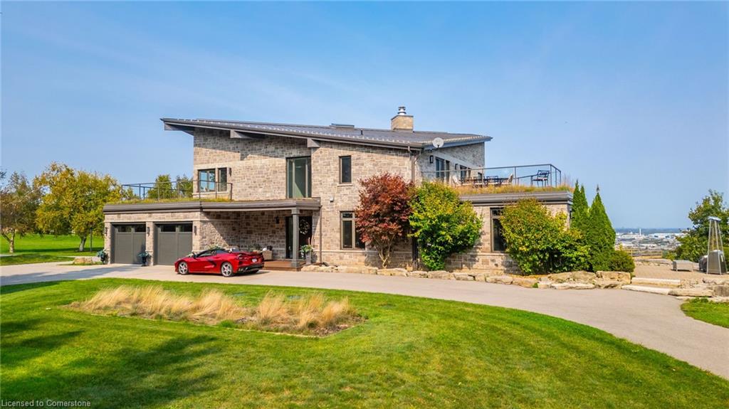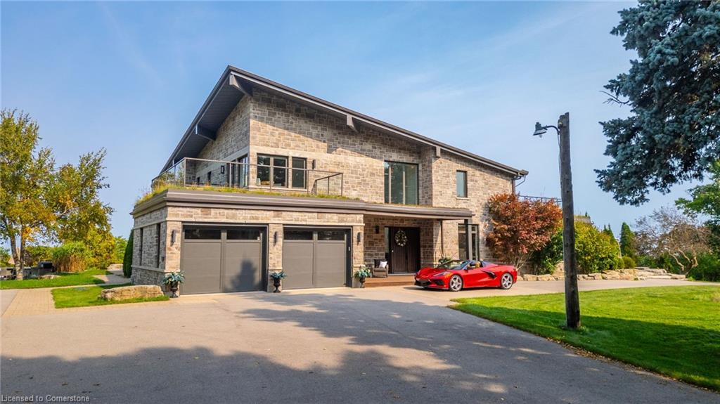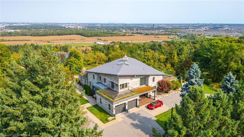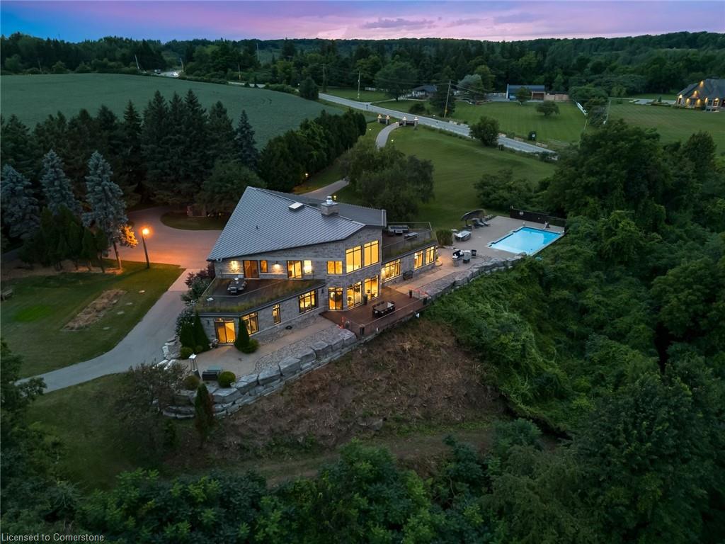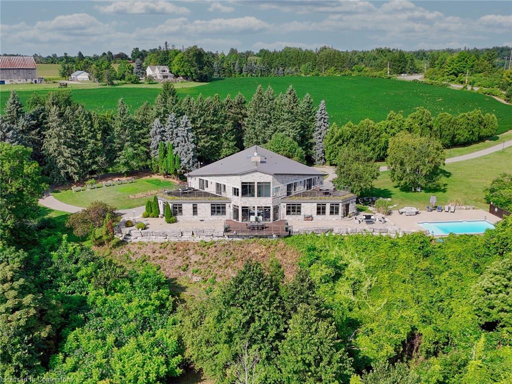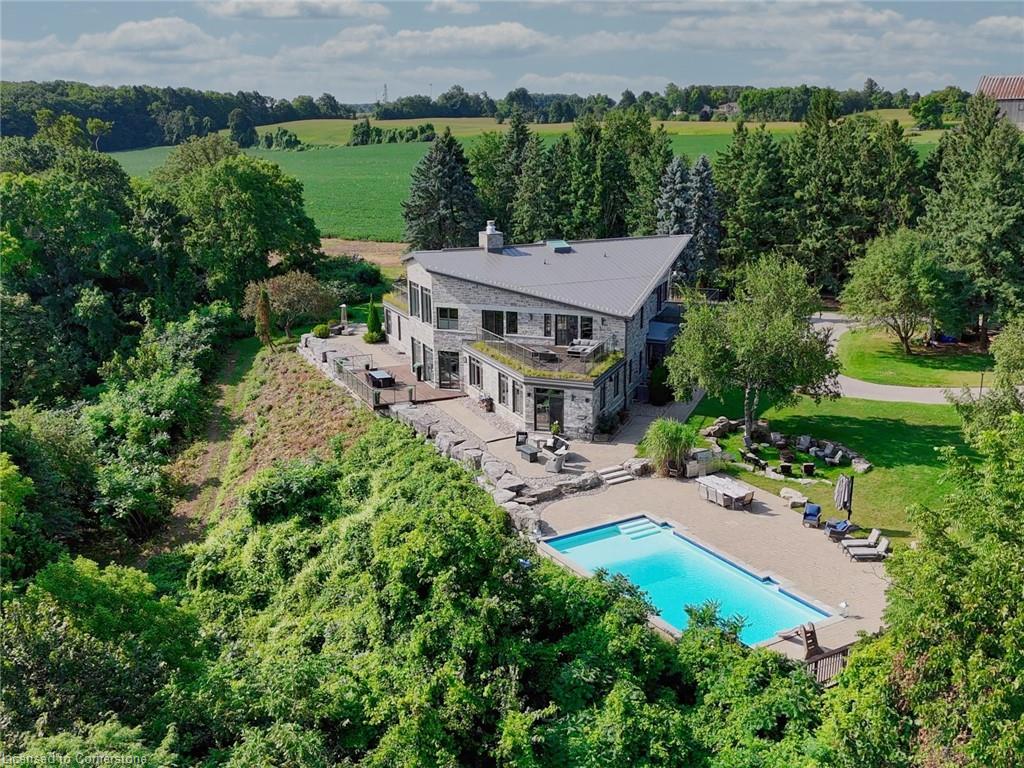 You don’t hear it at first. You feel it. The stillness. The quiet shift as you pass through the gates and life slows down. Set against the Niagara Escarpment on 13.5 acres of private forest, rolling lawns, and sunlit trails, this 6,042 sq ft modern estate is more than a home, it’s a place to exhale. A place where kids roam free, dogs lead the way, and every sunset feels like a show. Designed for real life and connection, the home blends clean-lined architecture with nature’s warmth. Soaring 24-ft ceilings and floor-to-ceiling glass flood the open interior with light and views that stretch for miles. Wide-plank floors, soft wood tones, and bold glass balance sophistication and serenity. Mornings begin barefoot on warm floors, coffee in hand, dog waiting at the door. The kitchen is sleek, spacious, built for gathering. Bake cookies at the island, host birthday dinners, or enjoy quiet Sunday mornings while kids play nearby. With five bedrooms and seven bathrooms, there’s space to spread out and come together. The main-floor suite is a sanctuary: spa-like, sunlit, tucked away. A separate guest, nanny, or in-law wing offers flexibility for multi-generational living or private hosting. Outside, ten walkouts invite you into nature: a pool framed by forest, winding trails to a stream, and Malibu-style decks with glass railings and a green roof edge. Perfect for summer BBQs, barefoot dances at dusk, or stargazing under quiet skies. Parking for guests, premium insulation for four-season comfort, and a 2.5-acre field, ready for a pony, hobby farm, or more space to roam. This isn’t just about square footage or finishes (though exceptional). It’s about what this place gives back: space to breathe. Room to grow. A slower rhythm filled with moments that matter. From sunrise coffees to starlit swims, this is a home your family will never outgrow. It’s home, in every sense of the word.