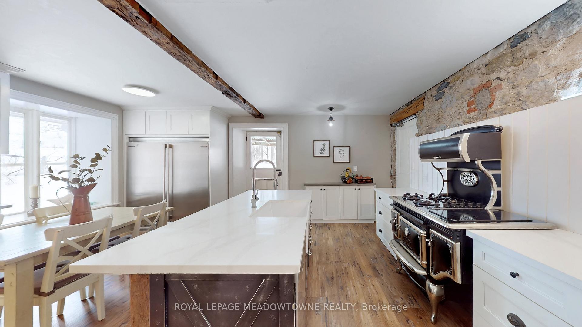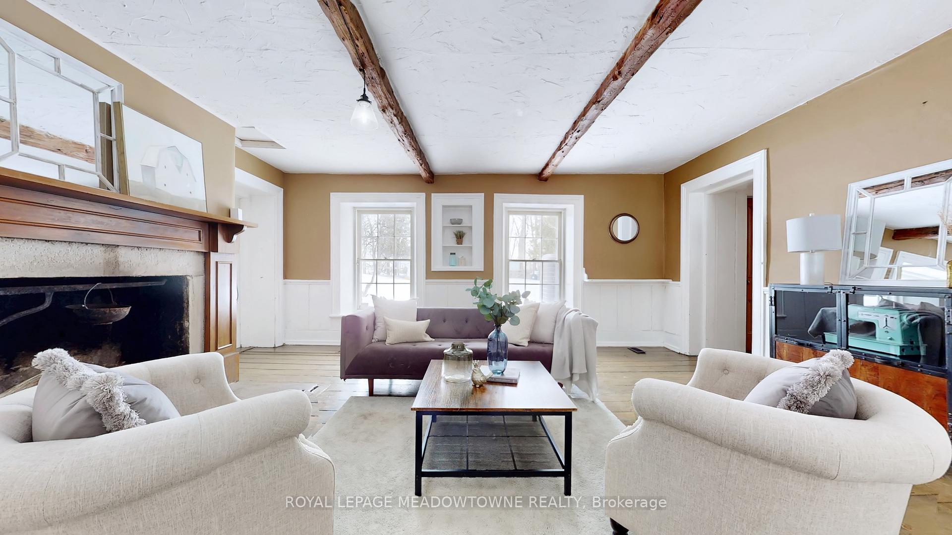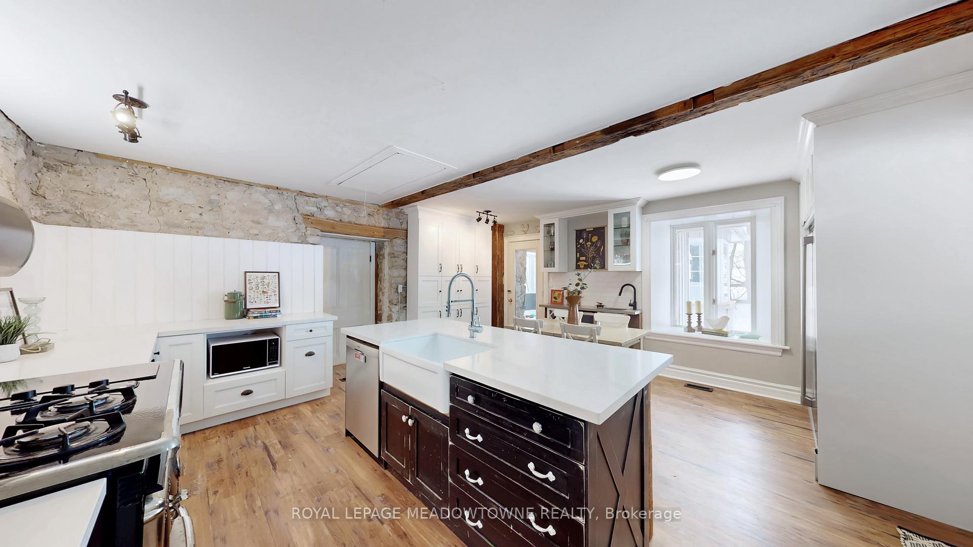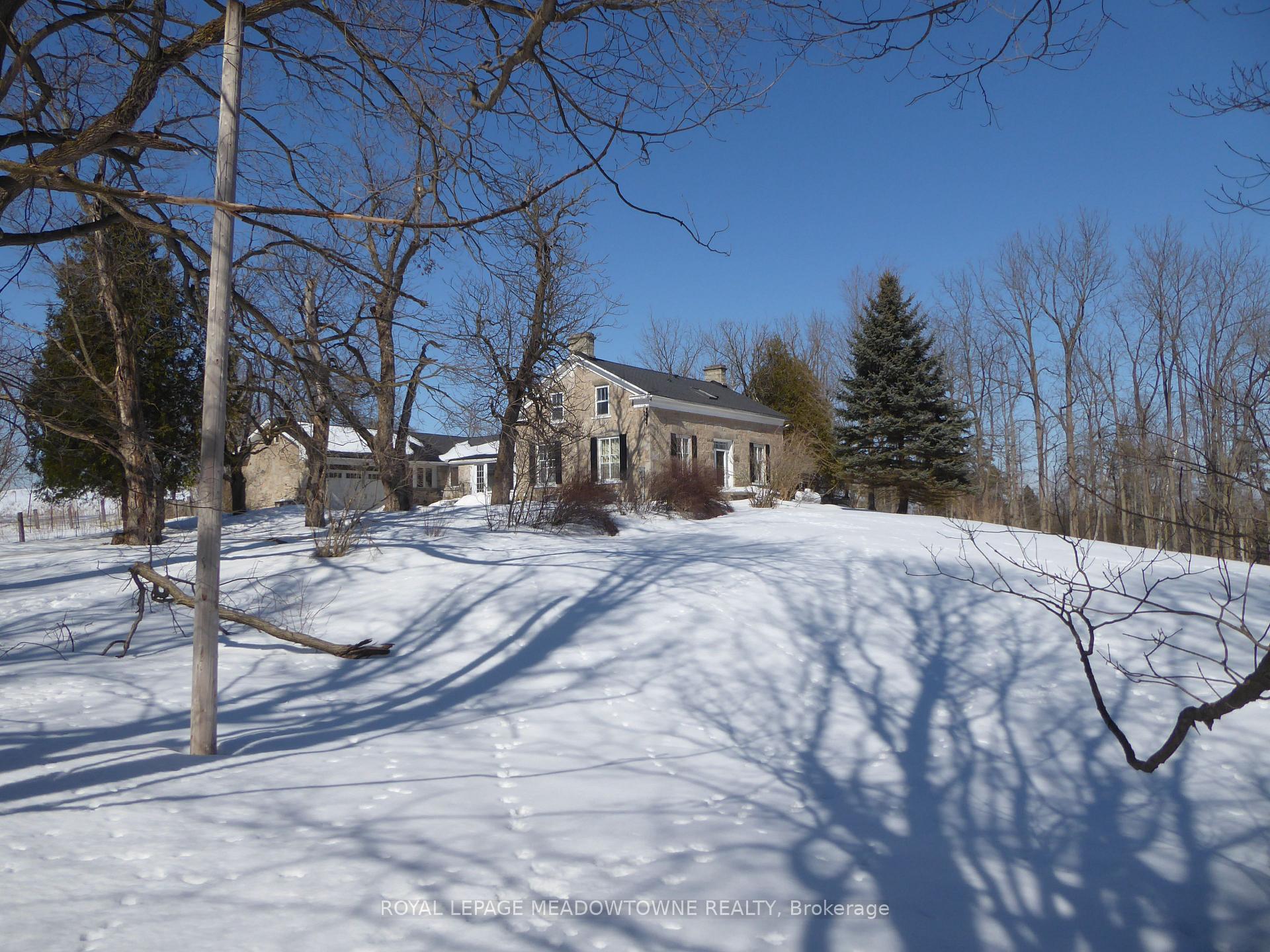 Step away from the ordinary in this welcoming 3,442+ sf, 4 bdrm, 4 bath century home ideal for families seeking space, privacy and a connection to nature. This treasured home blends timeless character on a private 10-acre setting for the ideal hobby farm. You will be transported back in time with a warm with soaring ceilings, open hearth wood-burning fireplaces, deep window sills, and original details. The unique and versatile floor plan can accommodate extended family needs. The recently renovated kitchen showcases a striking stone wall with timber beam accents, stone countertops, hardwood flooring, a vintage-style Elmira Stove, and a centre island with breakfast bar. Separate family, living, and dining rooms provide ample space for both everyday living and special occasions. The formal dining room currently serves as a main-floor primary bedroom, complete with a walk-in closet/office. The 2nd dining and currently used as a gym features oversized windows, a striking stone wall, and ample space for a harvest table, with a walkout to the garden. More conveniences include an enclosed sunroom, a mudroom with access to the 2 car garage, main-floor laundry, and a stately wood staircase to the bedrooms. Enjoy a pool area, views of a tranquil pond, a vegetable garden, storage & barn and gently rolling open fields that are perfect for exploring and pasture. An energy-efficient heat pump for heat and air conditioning (2019), R50 attic insulation, and updated asphalt shingles. Versatile outbuildings and an attached two-car garage offer ample space for cars, hobbies, toys, motorbike, outdoor gear and more. A generous driveway and laneway provide plenty of parking for cars, trucks and campers. All this is located just minutes from town amenities, schools, churches, Blue Springs Golf Club, and the GO Train station offering the perfect blend of country living and Town convenience.